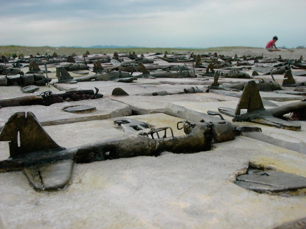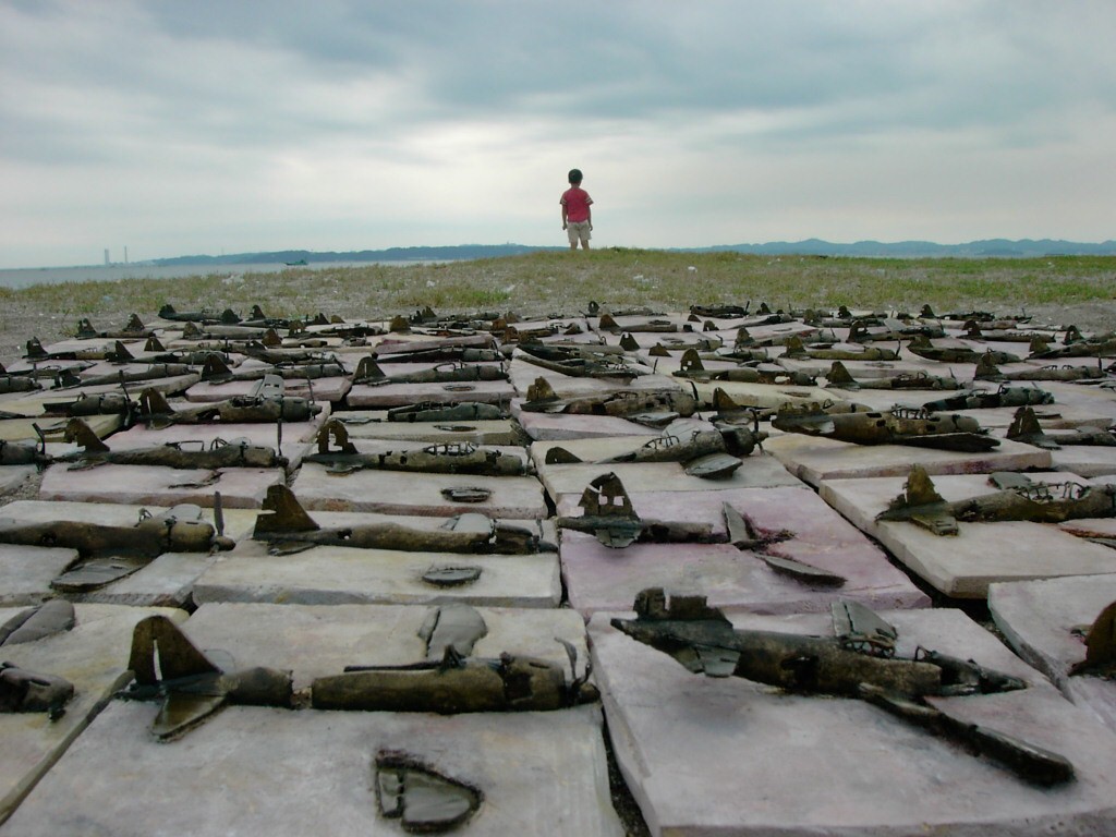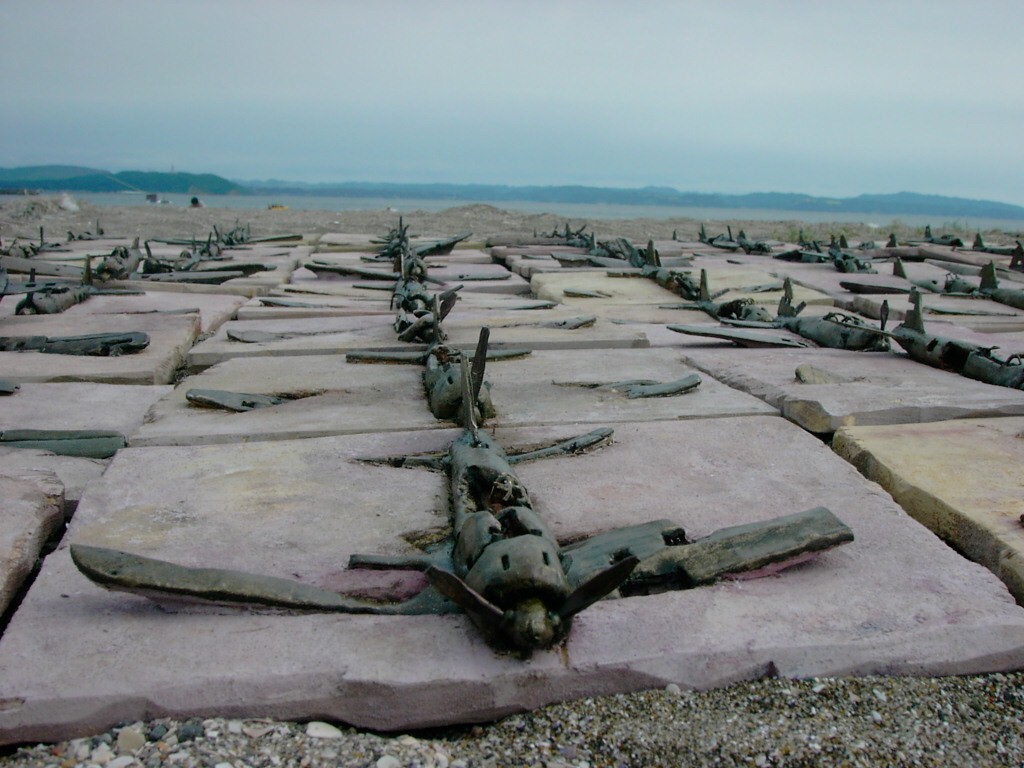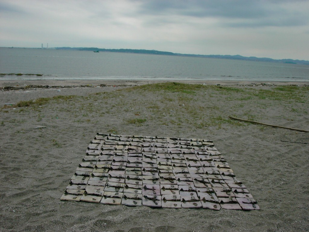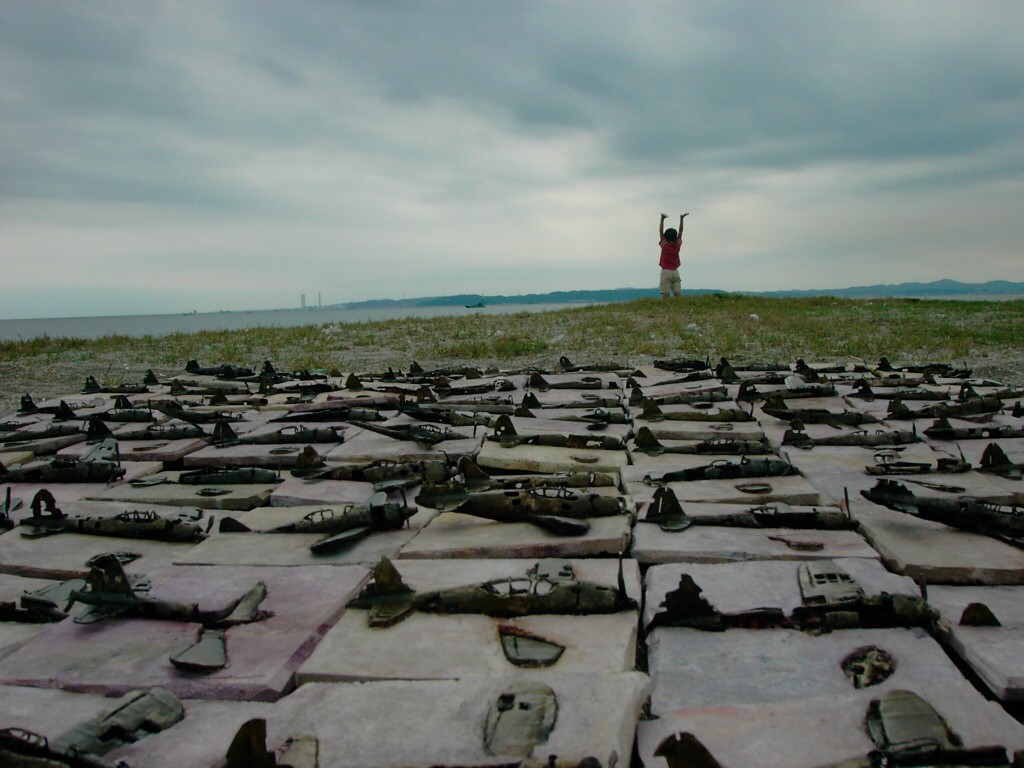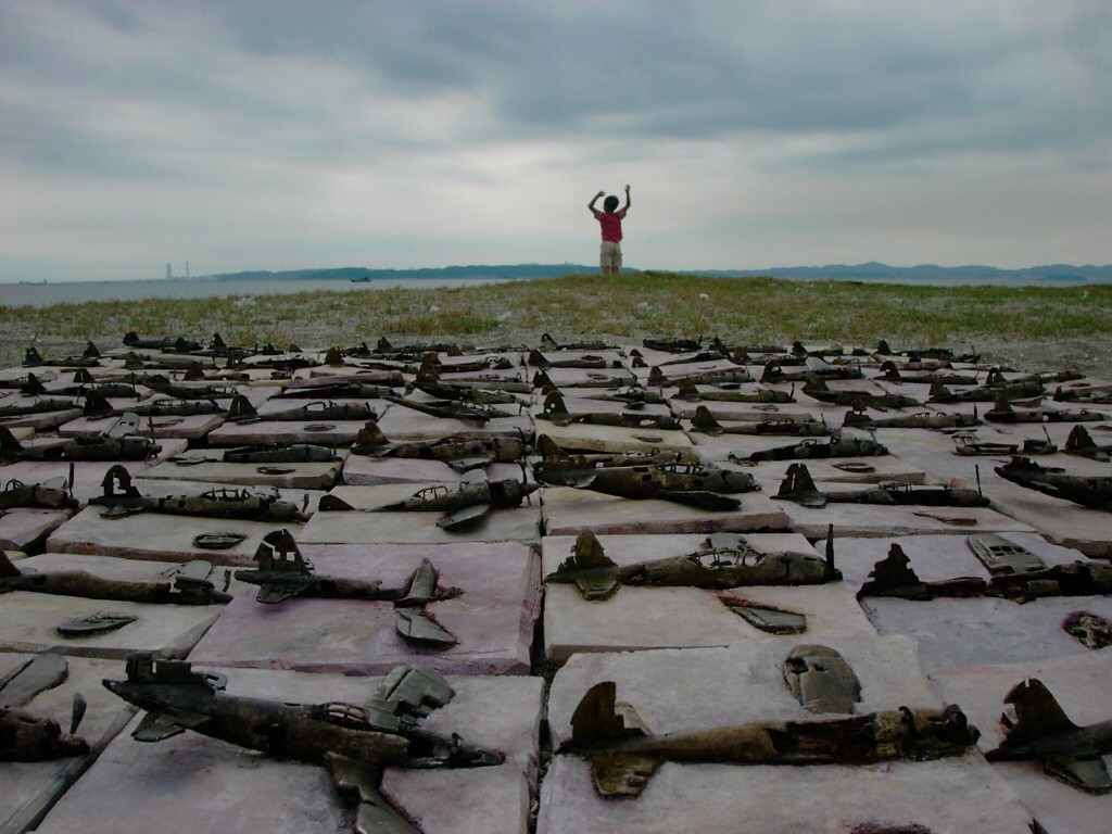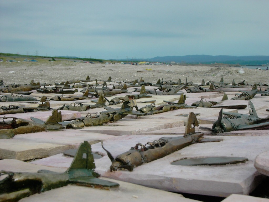 体内に流れる血脈と体外で流れる歴史との間で、悠々と流され、生活している私がいる。時々変化が欲しくなる。良くも悪くもニュースメディアの中で大きな面白い事件を欲求している。少し敏感になって、歴史の流れを考えたとき、その大きな事件の後先には様々な大義名分がつけられ、処理され、また処理されようとしていることに気づく。ある意味を持つ強く美しい言葉や文字は人を信用させ、行動させ、そして人の命までも破壊する力を持つ。「大量破壊兵器保有」というgood reasonによる米英のイラク攻撃、「国際貢献」というgood reasonによる イラクへの自衛隊(Japanese army)派遣、アメリカは「正義と自由と寛容」を大義に掲げ、肥大化し続けている。イラク攻撃は終わったが、バグダッドでは治安が悪化し、自己防衛のために一般市民が銃を持たざるを得なくなった。皮肉にもアメリカにより銃を持つ自由が与えられたのである。 一方、日本国民の歴史の中では、あの神風特攻隊員たちは「悠久の大義に生きる」という言葉で抽象化され、「人間としての連帯観の昇華が、自己犠牲の精神によって勇敢に発揮されたのである」というように括られ、隊員たちも「撃沈」、「轟沈」、「爆沈」、「撃滅」などの勇ましい文字に大義の殻を作り、その中に乗り込んでいった。そう私には思えるのである。不安と恐怖から逃れるために、己を鼓舞し、包んでくれる殻が必要だったように感じるのである。日本軍は絶対に降伏せずという強い意志を背景に、政府は一億総攻撃によって「名誉ある和平」という大義の大きな殻を用意していたのである。連合軍はこの壮絶な体当たり攻撃で恐怖のどん底に陥ったことは事実であり、この結果「これ以上の人間殺戮は避けねばならぬ。速やかに日本に戦争をやめさすべきだ」というgood reasonが固まり、ついに原子爆弾投下にふみきったといわれている。たとえ、他の思惑があったにせよ、トルーマン大統領に決断させた直接の原因はこの日本の若者達の自己犠牲の体当たりだったのである。もしこの特攻攻撃がなかったら連合軍の日本上陸は進められ、今の日本は存在しなかったであろう、ともいわれている。 戦争とは美しい大義名分の基でとんでもないことが行われることである。この作品を制作するにあたって考えたのはそんな大義名分に乗り込んだ少年兵達の抜け殻(=言葉の枯れ葉)をつくることであった。100機の抜け殻をつくった訳は、特攻とは「百死零生」の体当たり攻撃である。という四文字からである。