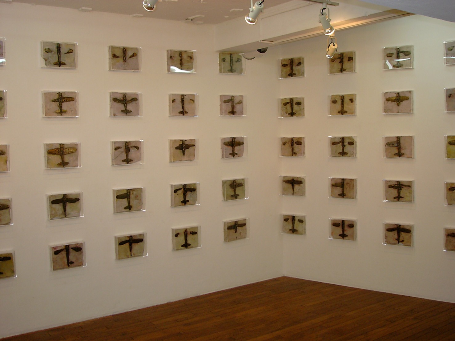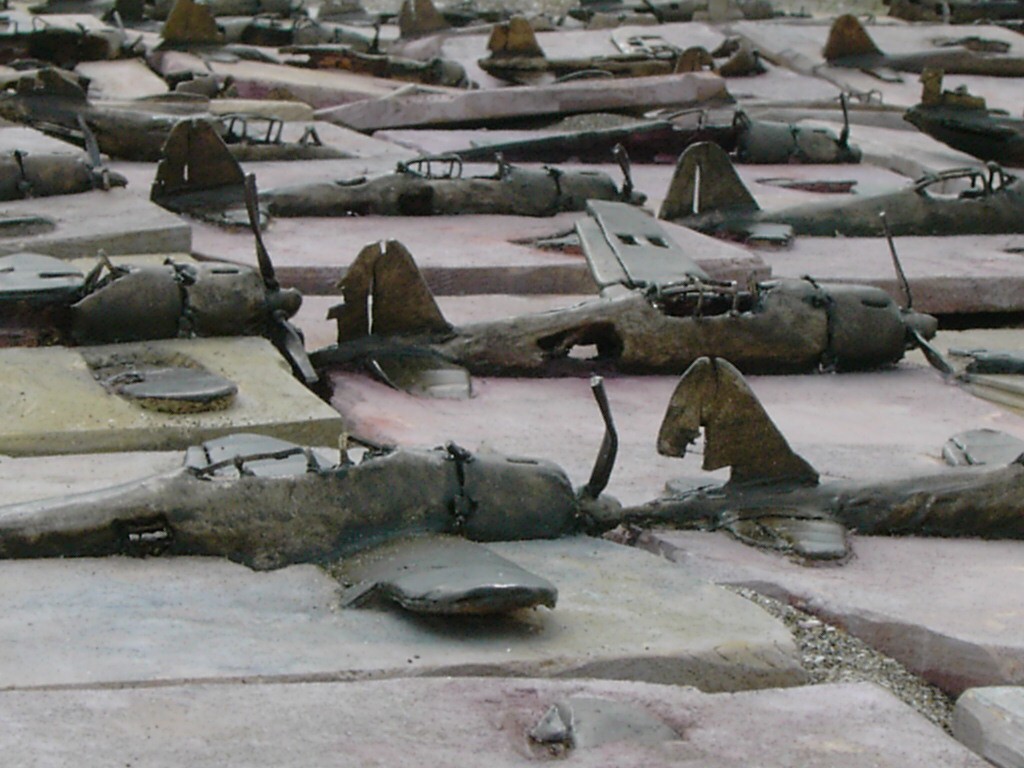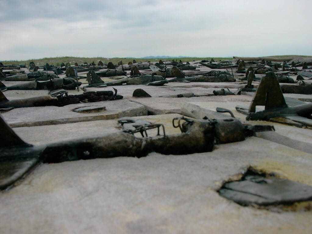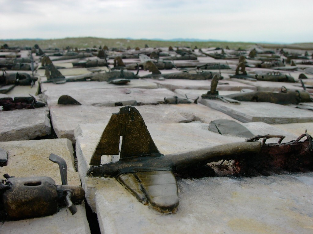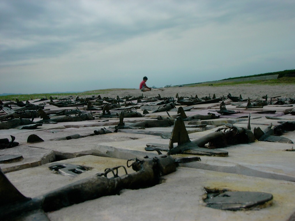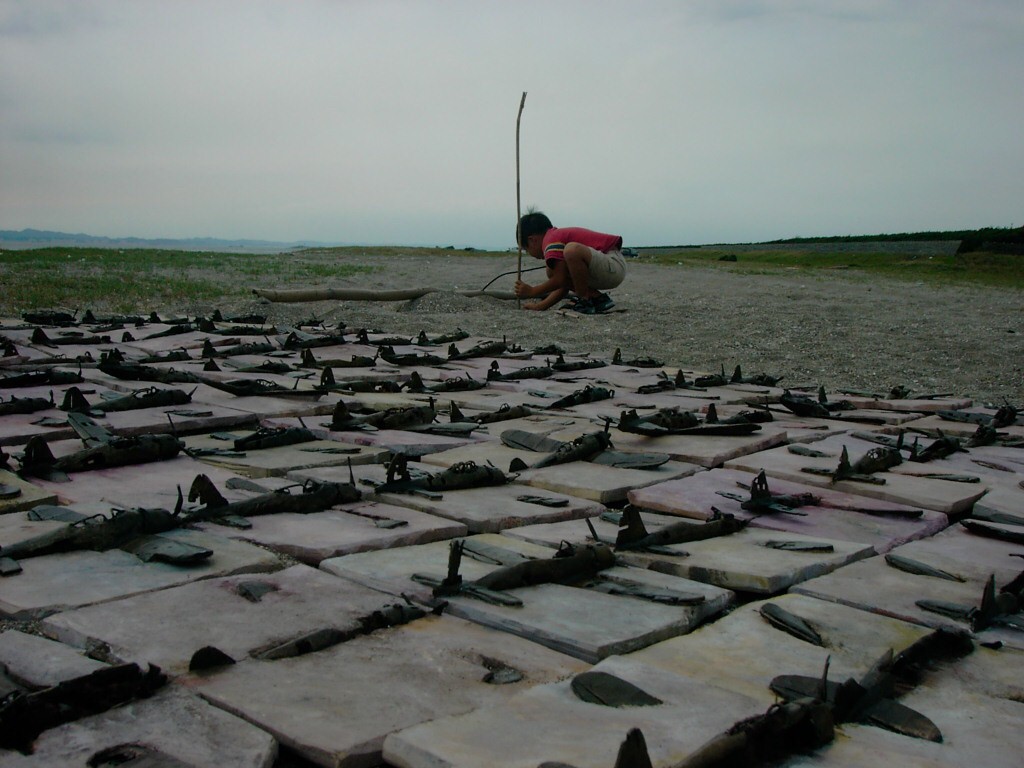 体内に流れる血脈と体外で流れる歴史との間で、悠々と流され、生活している私がいる。時々変化が欲しくなる。良くも悪くもニュースメディアの中で大きな面白い事件を欲求している。少し敏感になって、歴史の流れを考えたとき、その大きな事件の後先には様々な大義名分がつけられ、処理され、また処理されようとしていることに気づく。ある意味を持つ強く美しい言葉や文字は人を信用させ、行動させ、そして人の命までも破壊する力を持つ。「大量破壊兵器保有」というgood reasonによる米英のイラク攻撃、「国際貢献」というgood reasonによる イラクへの自衛隊(Japanese army)派遣、アメリカは「正義と自由と寛容」を大義に掲げ、肥大化し続けている。イラク攻撃は終わったが、バグダッドでは治安が悪化し、自己防衛のために一般市民が銃を持たざるを得なくなった。皮肉にもアメリカにより銃を持つ自由が与えられたのである。 一方、日本国民の歴史の中では、あの神風特攻隊員たちは「悠久の大義に生きる」という言葉で抽象化され、「人間としての連帯観の昇華が、自己犠牲の精神によって勇敢に発揮されたのである」というように括られ、隊員たちも「撃沈」、「轟沈」、「爆沈」、「撃滅」などの勇ましい文字に大義の殻を作り、その中に乗り込んでいった。そう私には思えるのである。不安と恐怖から逃れるために、己を鼓舞し、包んでくれる殻が必要だったように感じるのである。日本軍は絶対に降伏せずという強い意志を背景に、政府は一億総攻撃によって「名誉ある和平」という大義の大きな殻を用意していたのである。連合軍はこの壮絶な体当たり攻撃で恐怖のどん底に陥ったことは事実であり、この結果「これ以上の人間殺戮は避けねばならぬ。速やかに日本に戦争をやめさすべきだ」というgood reasonが固まり、ついに原子爆弾投下にふみきったといわれている。たとえ、他の思惑があったにせよ、トルーマン大統領に決断させた直接の原因はこの日本の若者達の自己犠牲の体当たりだったのである。もしこの特攻攻撃がなかったら連合軍の日本上陸は進められ、今の日本は存在しなかったであろう、ともいわれている。 戦争とは美しい大義名分の基でとんでもないことが行われることである。この作品を制作するにあたって考えたのはそんな大義名分に乗り込んだ少年兵達の抜け殻(=言葉の枯れ葉)をつくることであった。100機の抜け殻をつくった訳は、特攻とは「百死零生」の体当たり攻撃である。という四文字からである。