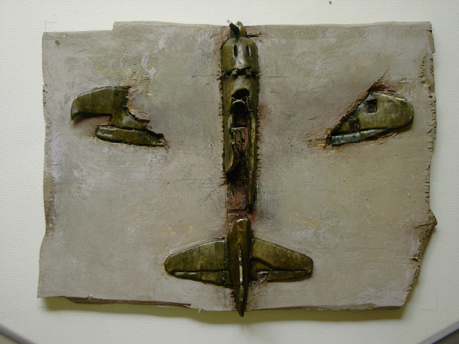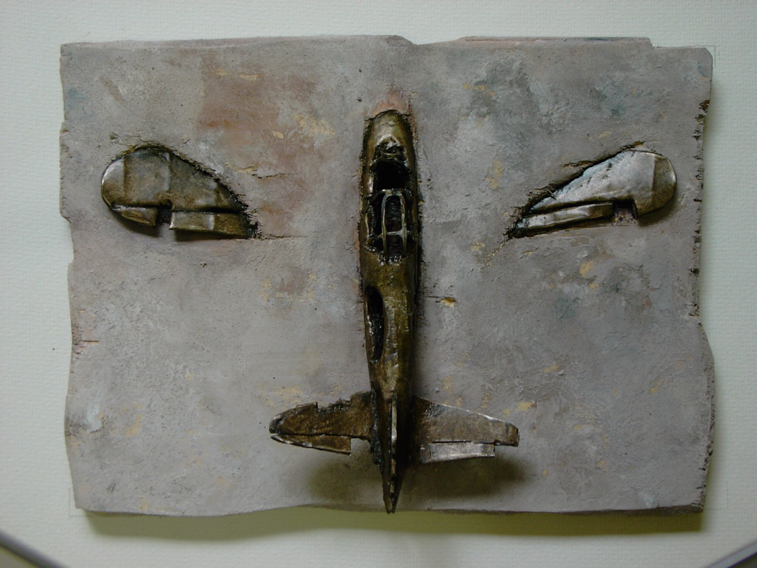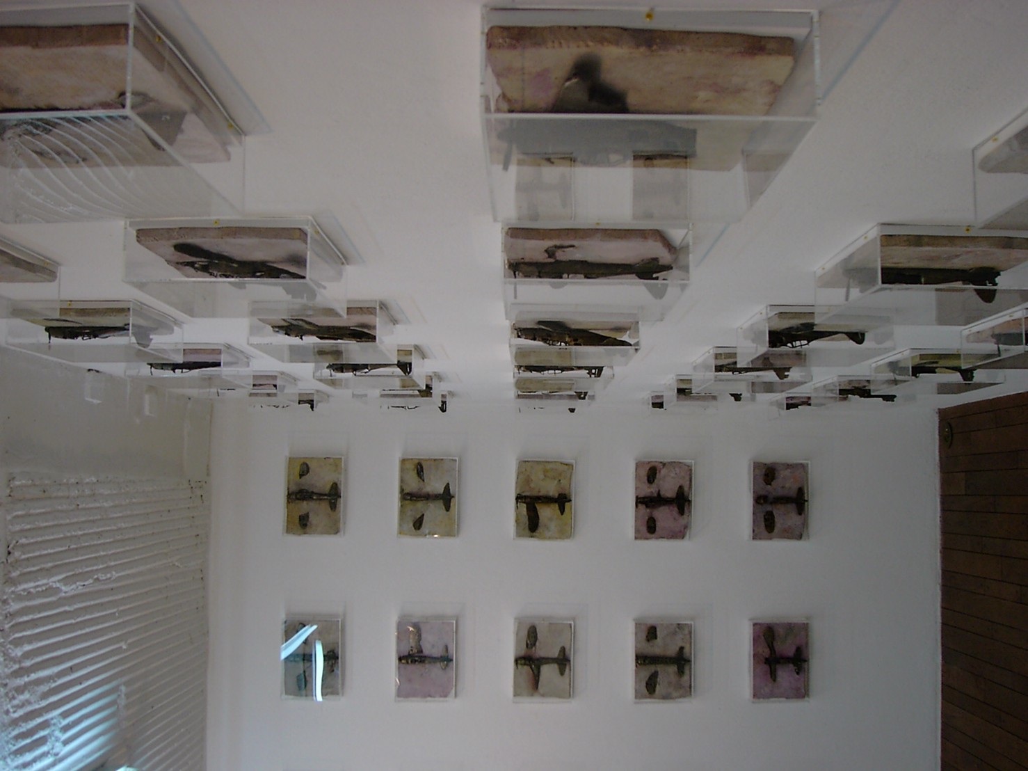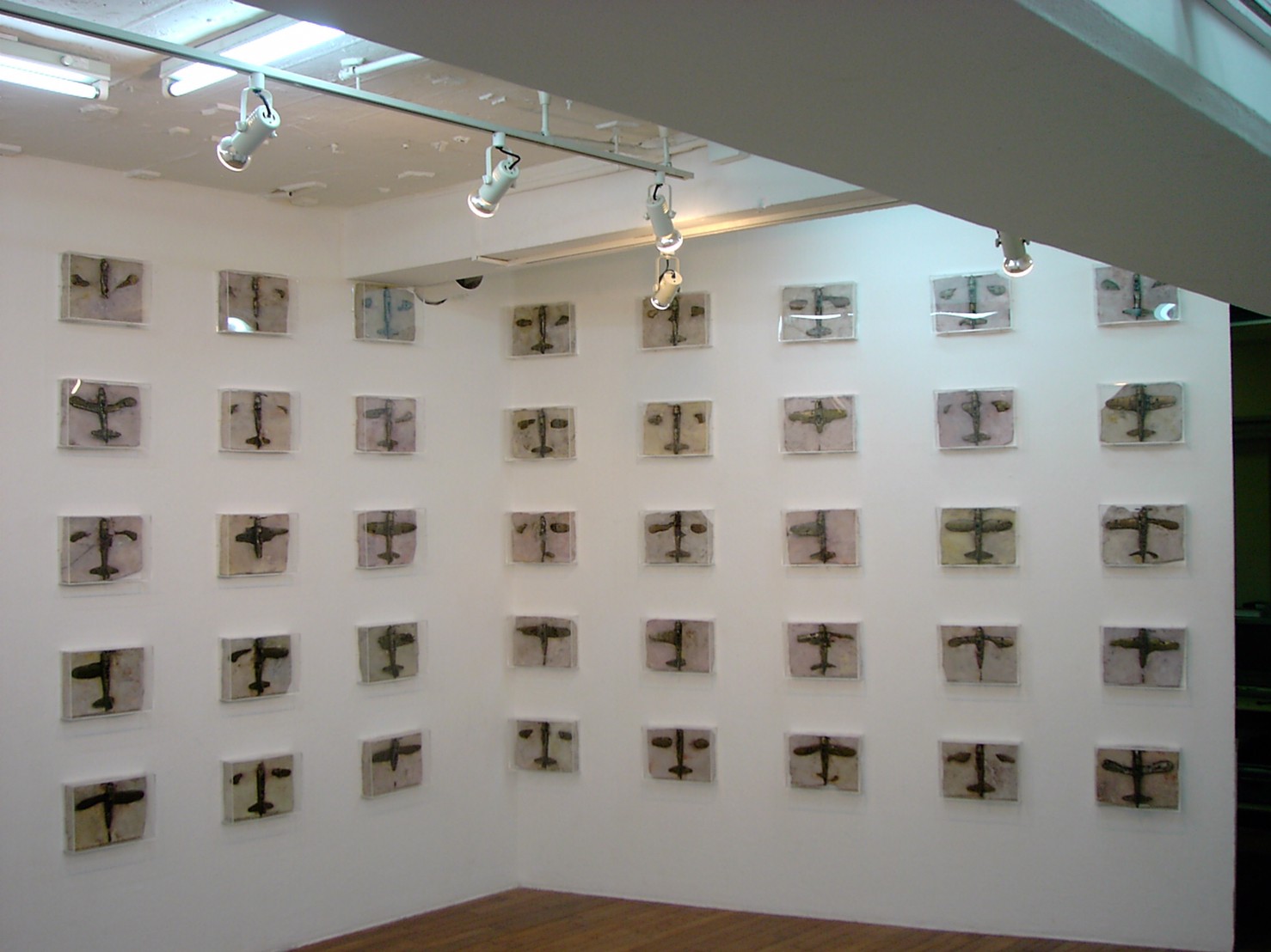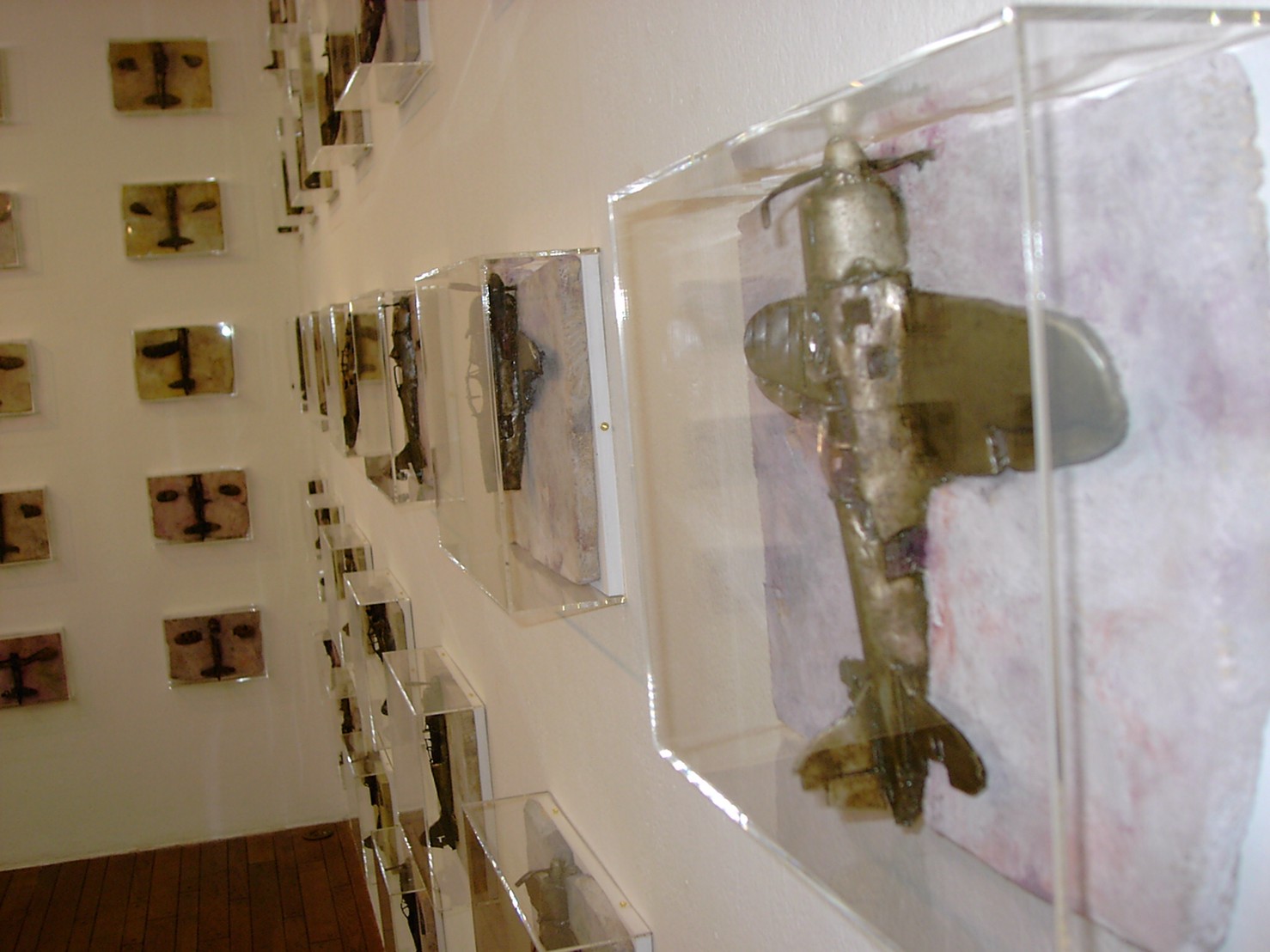 体内に流れる血脈と体外で流れる歴史との間で、悠々と流され、生活している私がいる。時々変化が欲しくなる。良くも悪くもニュースメディアの中で大きな面白い事件を欲求している。少し敏感になって、歴史の流れを考えたとき、その大きな事件の後先には様々な大義名分がつけられ、処理され、また処理されようとしていることに気づく。ある意味を持つ強く美しい言葉や文字は人を信用させ、行動させ、そして人の命までも破壊する力を持つ。「大量破壊兵器保有」というgood reasonによる米英のイラク攻撃、「国際貢献」というgood reasonによる イラクへの自衛隊(Japanese army)派遣、アメリカは「正義と自由と寛容」を大義に掲げ、肥大化し続けている。イラク攻撃は終わったが、バグダッドでは治安が悪化し、自己防衛のために一般市民が銃を持たざるを得なくなった。皮肉にもアメリカにより銃を持つ自由が与えられたのである。 一方、日本国民の歴史の中では、あの神風特攻隊員たちは「悠久の大義に生きる」という言葉で抽象化され、「人間としての連帯観の昇華が、自己犠牲の精神によって勇敢に発揮されたのである」というように括られ、隊員たちも「撃沈」、「轟沈」、「爆沈」、「撃滅」などの勇ましい文字に大義の殻を作り、その中に乗り込んでいった。そう私には思えるのである。不安と恐怖から逃れるために、己を鼓舞し、包んでくれる殻が必要だったように感じるのである。日本軍は絶対に降伏せずという強い意志を背景に、政府は一億総攻撃によって「名誉ある和平」という大義の大きな殻を用意していたのである。連合軍はこの壮絶な体当たり攻撃で恐怖のどん底に陥ったことは事実であり、この結果「これ以上の人間殺戮は避けねばならぬ。速やかに日本に戦争をやめさすべきだ」というgood reasonが固まり、ついに原子爆弾投下にふみきったといわれている。たとえ、他の思惑があったにせよ、トルーマン大統領に決断させた直接の原因はこの日本の若者達の自己犠牲の体当たりだったのである。もしこの特攻攻撃がなかったら連合軍の日本上陸は進められ、今の日本は存在しなかったであろう、ともいわれている。 戦争とは美しい大義名分の基でとんでもないことが行われることである。この作品を制作するにあたって考えたのはそんな大義名分に乗り込んだ少年兵達の抜け殻(=言葉の枯れ葉)をつくることであった。100機の抜け殻をつくった訳は、特攻とは「百死零生」の体当たり攻撃である。という四文字からである。