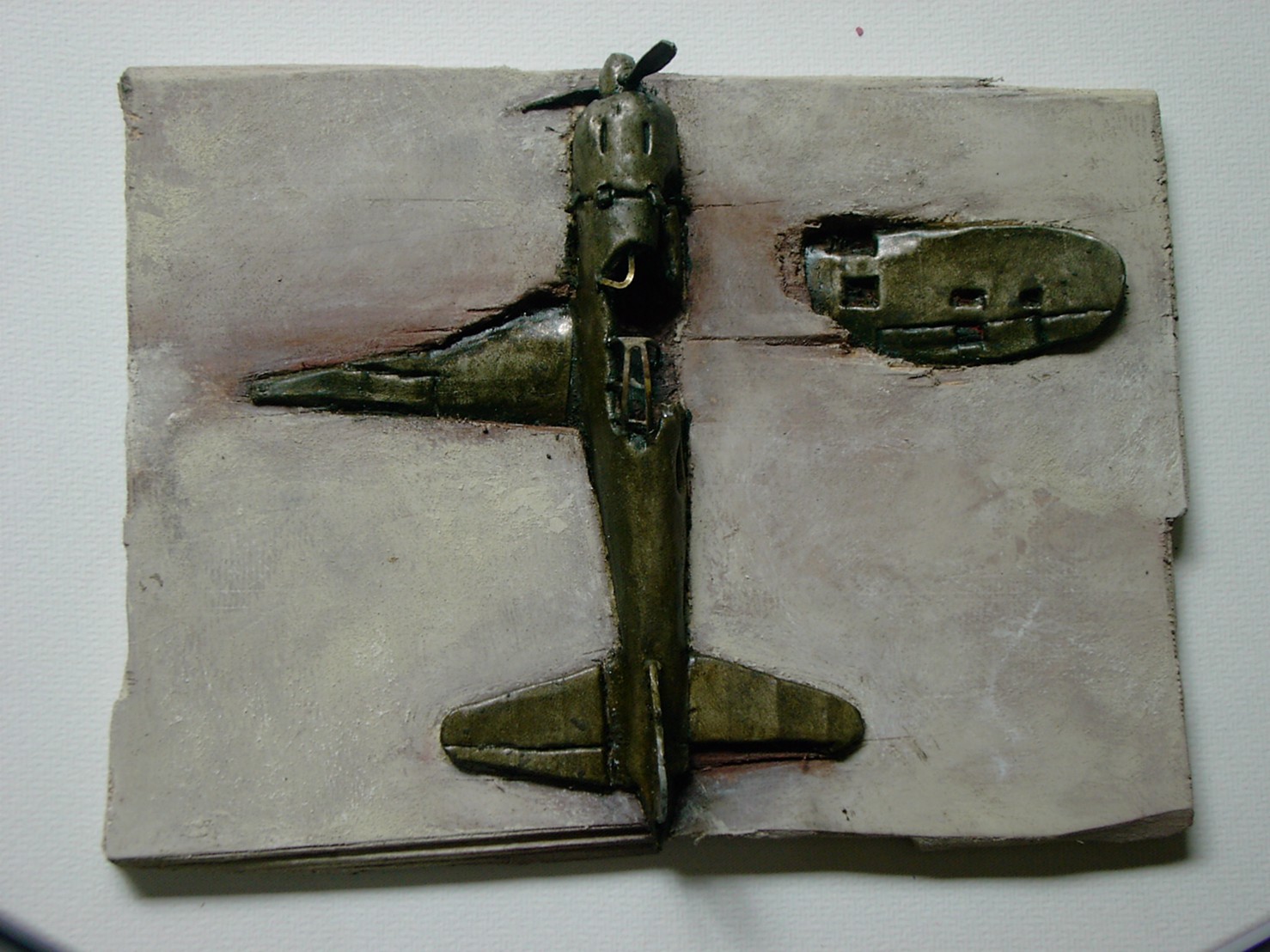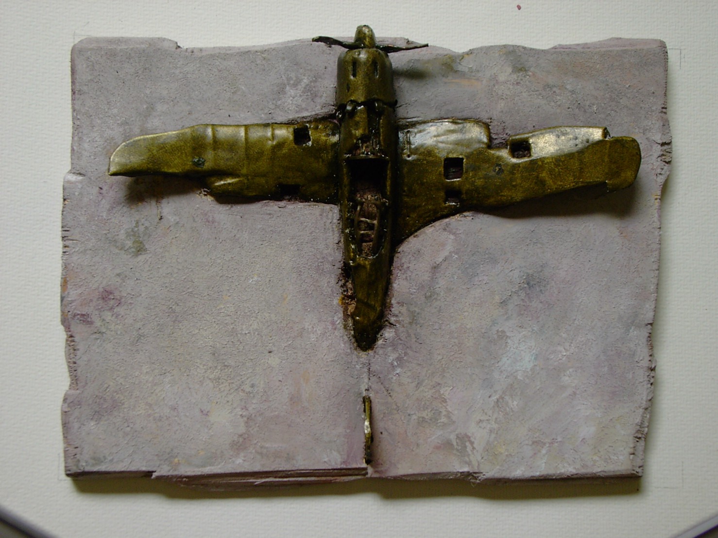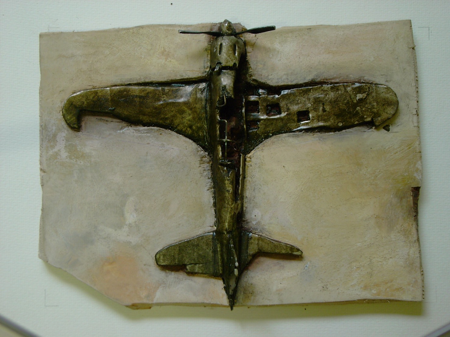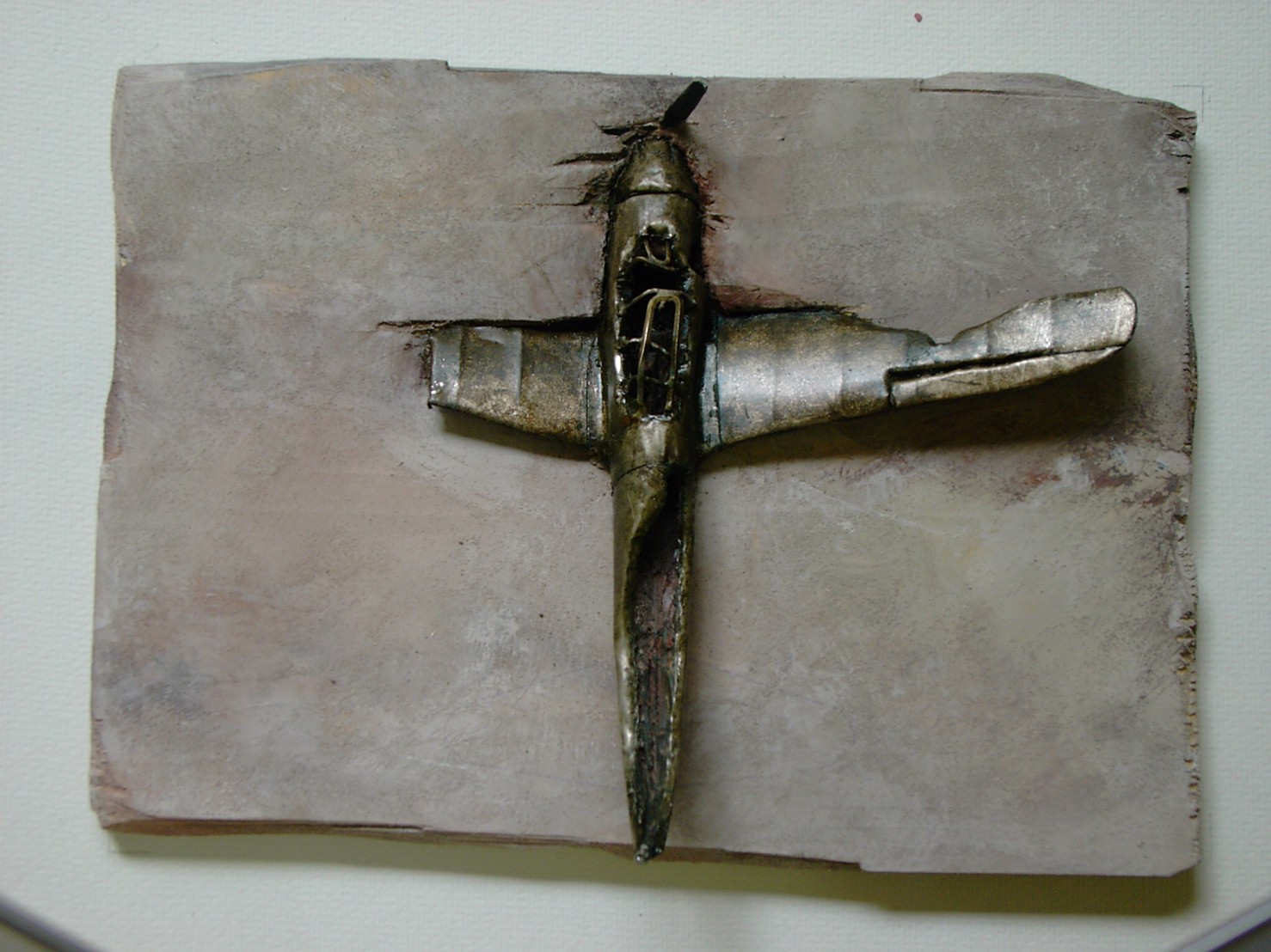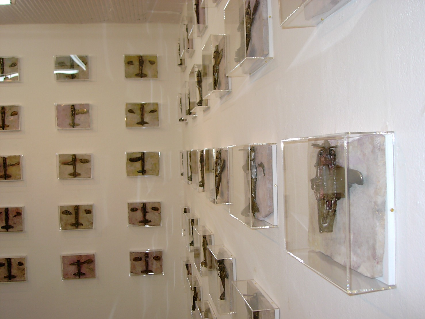 体内に流れる血脈と体外で流れる歴史との間で、悠々と流され、生活している私がいる。時々変化が欲しくなる。良くも悪くもニュースメディアの中で大きな面白い事件を欲求している。少し敏感になって、歴史の流れを考えたとき、その大きな事件の後先には様々な大義名分がつけられ、処理され、また処理されようとしていることに気づく。ある意味を持つ強く美しい言葉や文字は人を信用させ、行動させ、そして人の命までも破壊する力を持つ。「大量破壊兵器保有」というgood reasonによる米英のイラク攻撃、「国際貢献」というgood reasonによる イラクへの自衛隊(Japanese army)派遣、アメリカは「正義と自由と寛容」を大義に掲げ、肥大化し続けている。イラク攻撃は終わったが、バグダッドでは治安が悪化し、自己防衛のために一般市民が銃を持たざるを得なくなった。皮肉にもアメリカにより銃を持つ自由が与えられたのである。 一方、日本国民の歴史の中では、あの神風特攻隊員たちは「悠久の大義に生きる」という言葉で抽象化され、「人間としての連帯観の昇華が、自己犠牲の精神によって勇敢に発揮されたのである」というように括られ、隊員たちも「撃沈」、「轟沈」、「爆沈」、「撃滅」などの勇ましい文字に大義の殻を作り、その中に乗り込んでいった。そう私には思えるのである。不安と恐怖から逃れるために、己を鼓舞し、包んでくれる殻が必要だったように感じるのである。日本軍は絶対に降伏せずという強い意志を背景に、政府は一億総攻撃によって「名誉ある和平」という大義の大きな殻を用意していたのである。連合軍はこの壮絶な体当たり攻撃で恐怖のどん底に陥ったことは事実であり、この結果「これ以上の人間殺戮は避けねばならぬ。速やかに日本に戦争をやめさすべきだ」というgood reasonが固まり、ついに原子爆弾投下にふみきったといわれている。たとえ、他の思惑があったにせよ、トルーマン大統領に決断させた直接の原因はこの日本の若者達の自己犠牲の体当たりだったのである。もしこの特攻攻撃がなかったら連合軍の日本上陸は進められ、今の日本は存在しなかったであろう、ともいわれている。 戦争とは美しい大義名分の基でとんでもないことが行われることである。この作品を制作するにあたって考えたのはそんな大義名分に乗り込んだ少年兵達の抜け殻(=言葉の枯れ葉)をつくることであった。100機の抜け殻をつくった訳は、特攻とは「百死零生」の体当たり攻撃である。という四文字からである。