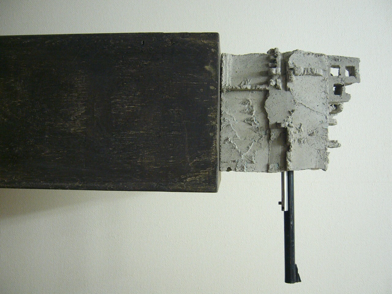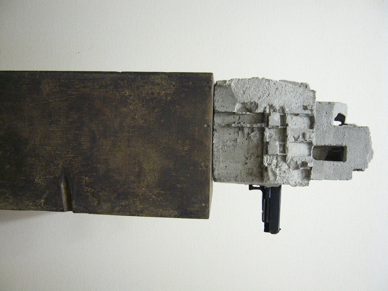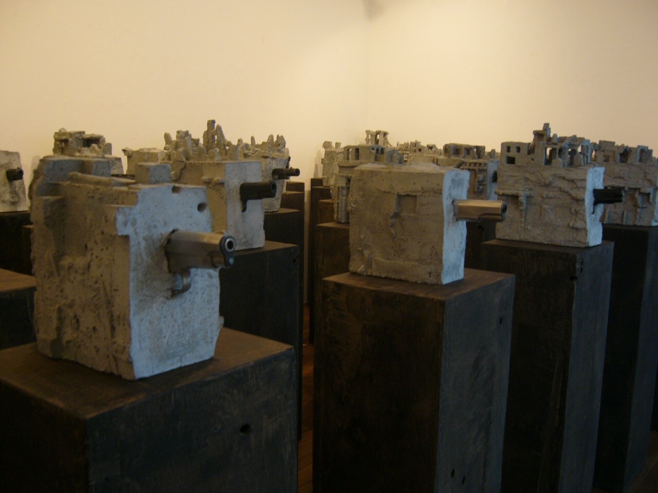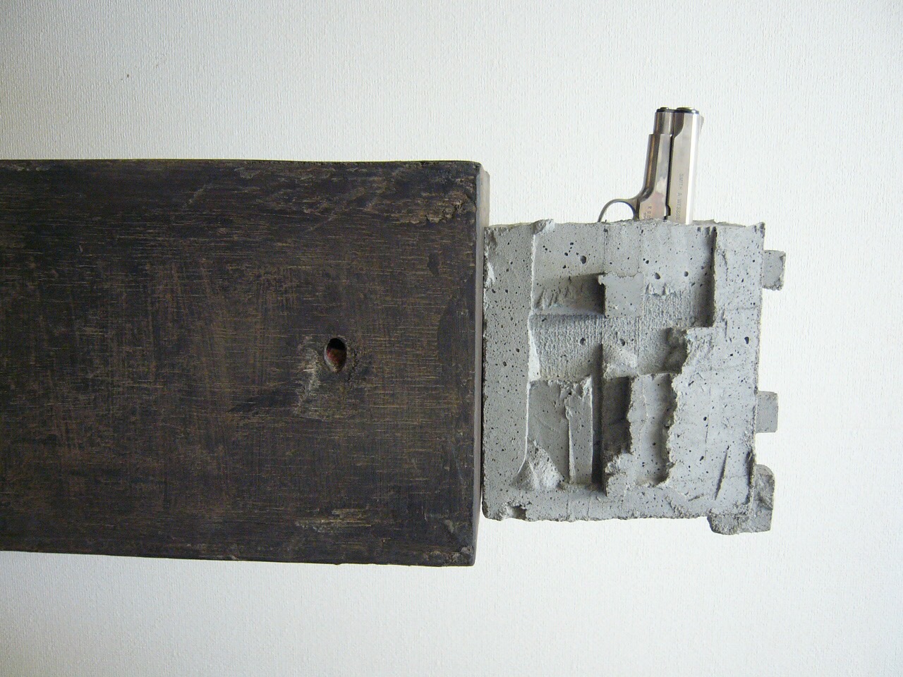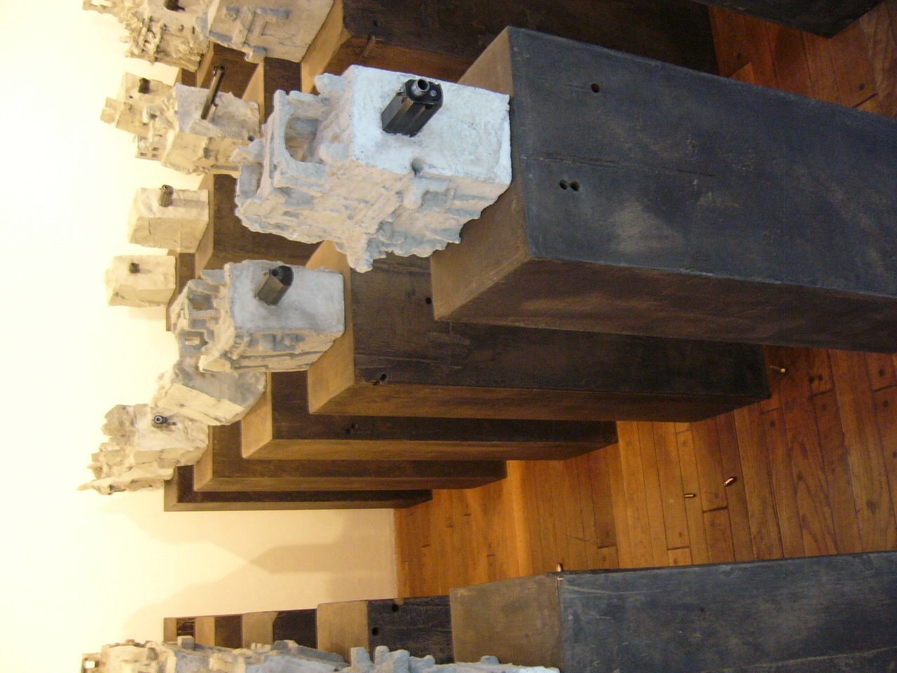 モデルガンショップで中古の銃をしこたま買い込んだ。ゼロ戦を埋めた作品のように、銃を戦場の廃墟のように形づくったモルタルの中に銃口だけ残して埋没させた。それを載せる台は漆で塗られた木の箱である。漆は本来、傷ついた樹木の防衛をする。そのからだを守り傷口をふさぐ。箱に載せられた銃を含んだモルタルの塊、その全体像はなにか戦闘的なロボットのように見えるはずである。その数は、現在私が勤める高等学校の1クラスの人数である。銃口の高さは、生徒が座る顔の高さになっている。それを正面からみると不気味な表情が備わっているように見えると思う。引金はモルタルで固められているので銃の機能は成さないが、銃口を正面から突きつけられては気持ちのいいものではないだろう。その前で、何を感じ、思考するか、それが楽しみである。そして背後に周った時にはどうか? 土台の箱は銃弾の貯金箱になっている。銃弾が貫通した様な穴から未使用の銃弾を入れられるようにした。銃社会アメリカの適切な場所に置いてもらい銃弾貯金箱として使って頂くことを願う。銃弾で一杯になったら作品ごと爆破すれば良い。すぐに思いつくと思うが、タイトルのkyodanは教壇、凶弾、教団がかけられている。
