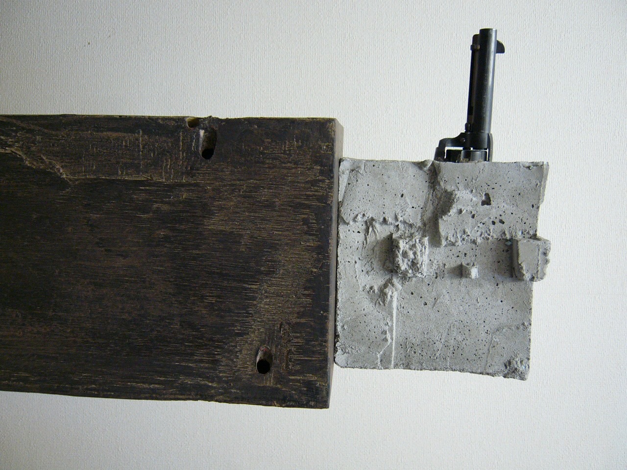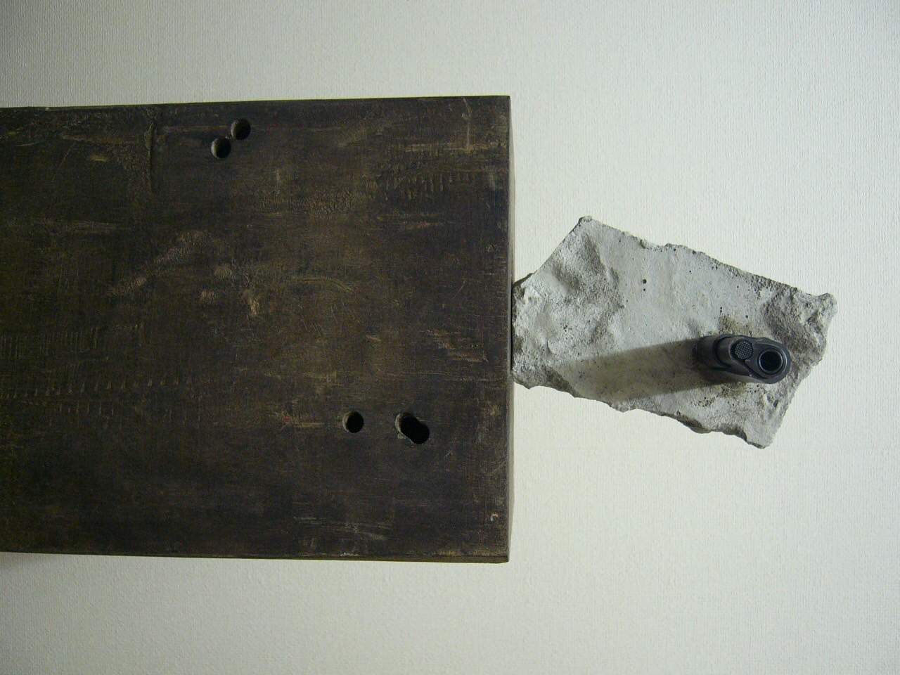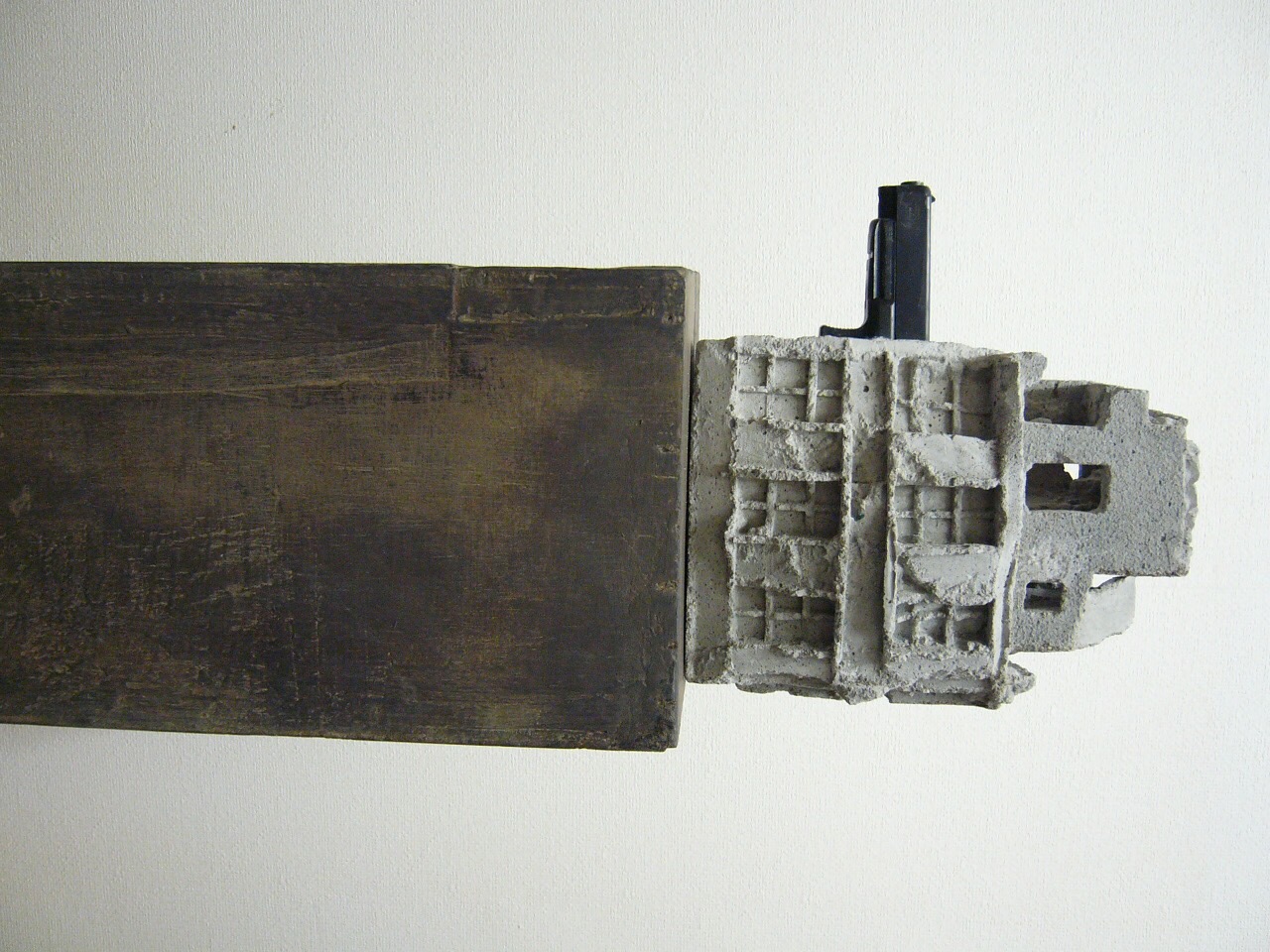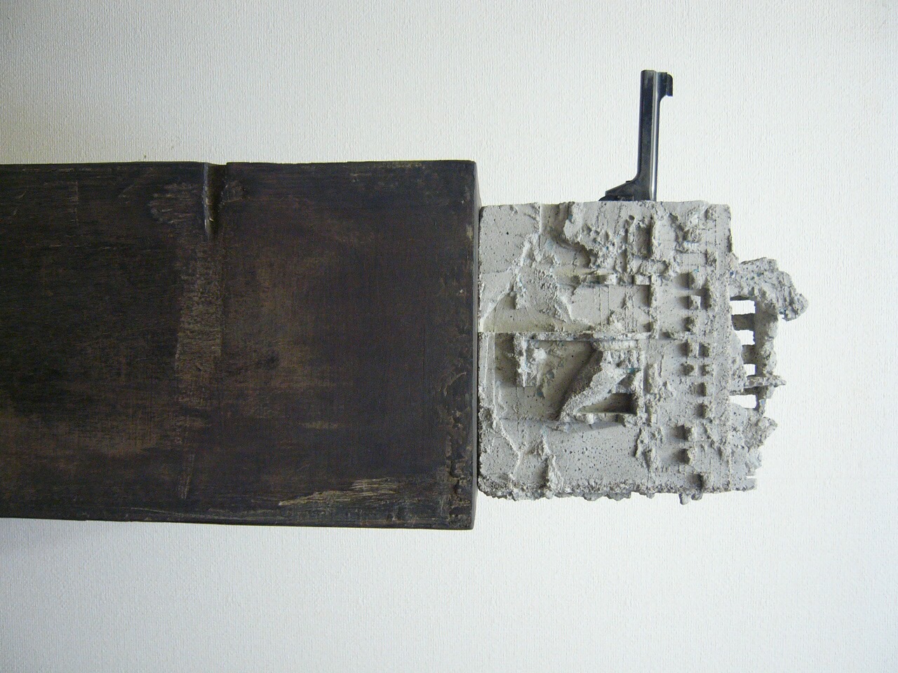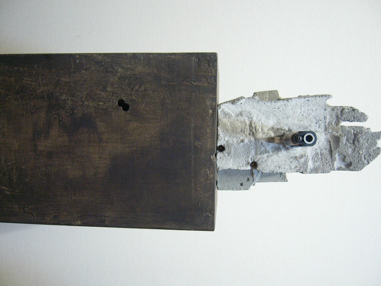 モデルガンショップで中古の銃をしこたま買い込んだ。ゼロ戦を埋めた作品のように、銃を戦場の廃墟のように形づくったモルタルの中に銃口だけ残して埋没させた。それを載せる台は漆で塗られた木の箱である。漆は本来、傷ついた樹木の防衛をする。そのからだを守り傷口をふさぐ。箱に載せられた銃を含んだモルタルの塊、その全体像はなにか戦闘的なロボットのように見えるはずである。その数は、現在私が勤める高等学校の1クラスの人数である。銃口の高さは、生徒が座る顔の高さになっている。それを正面からみると不気味な表情が備わっているように見えると思う。引金はモルタルで固められているので銃の機能は成さないが、銃口を正面から突きつけられては気持ちのいいものではないだろう。その前で、何を感じ、思考するか、それが楽しみである。そして背後に周った時にはどうか? 土台の箱は銃弾の貯金箱になっている。銃弾が貫通した様な穴から未使用の銃弾を入れられるようにした。銃社会アメリカの適切な場所に置いてもらい銃弾貯金箱として使って頂くことを願う。銃弾で一杯になったら作品ごと爆破すれば良い。すぐに思いつくと思うが、タイトルのkyodanは教壇、凶弾、教団がかけられている。