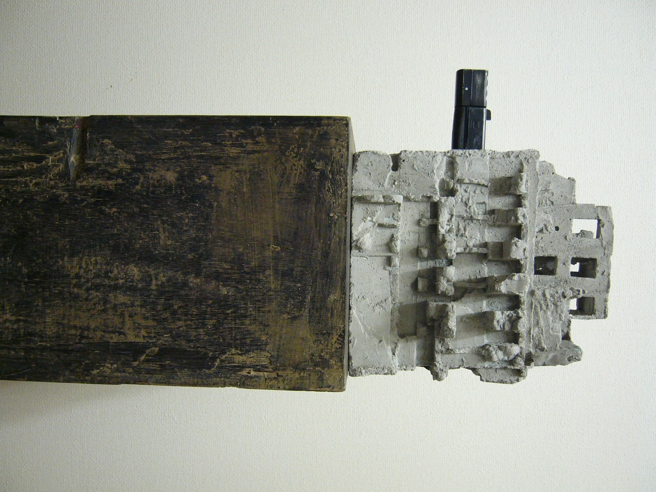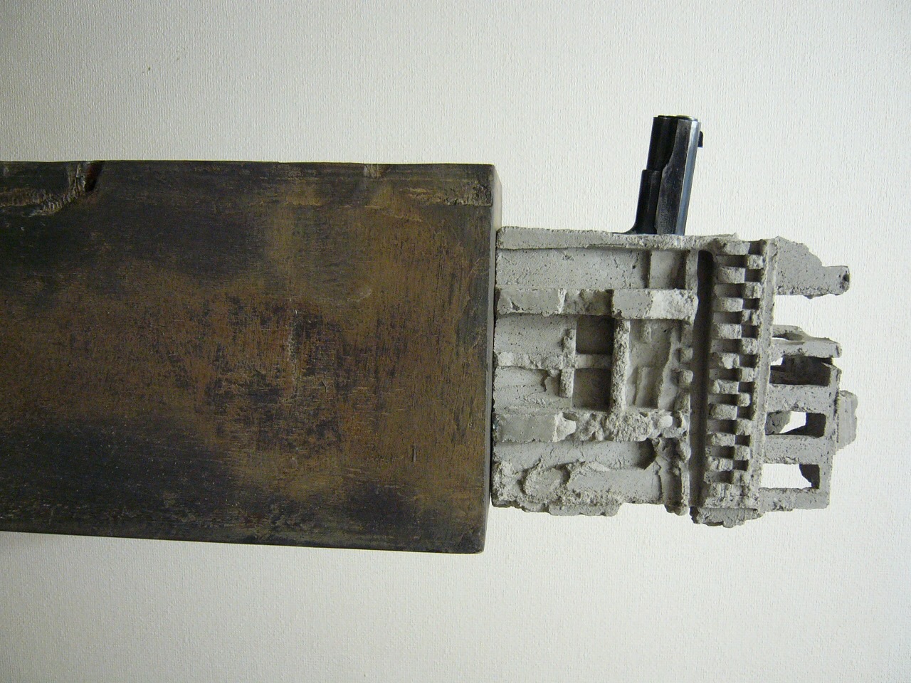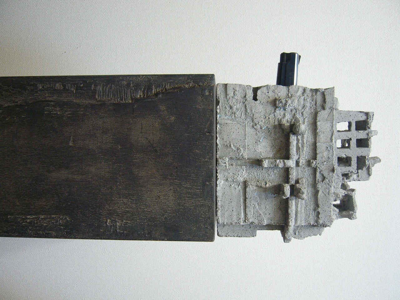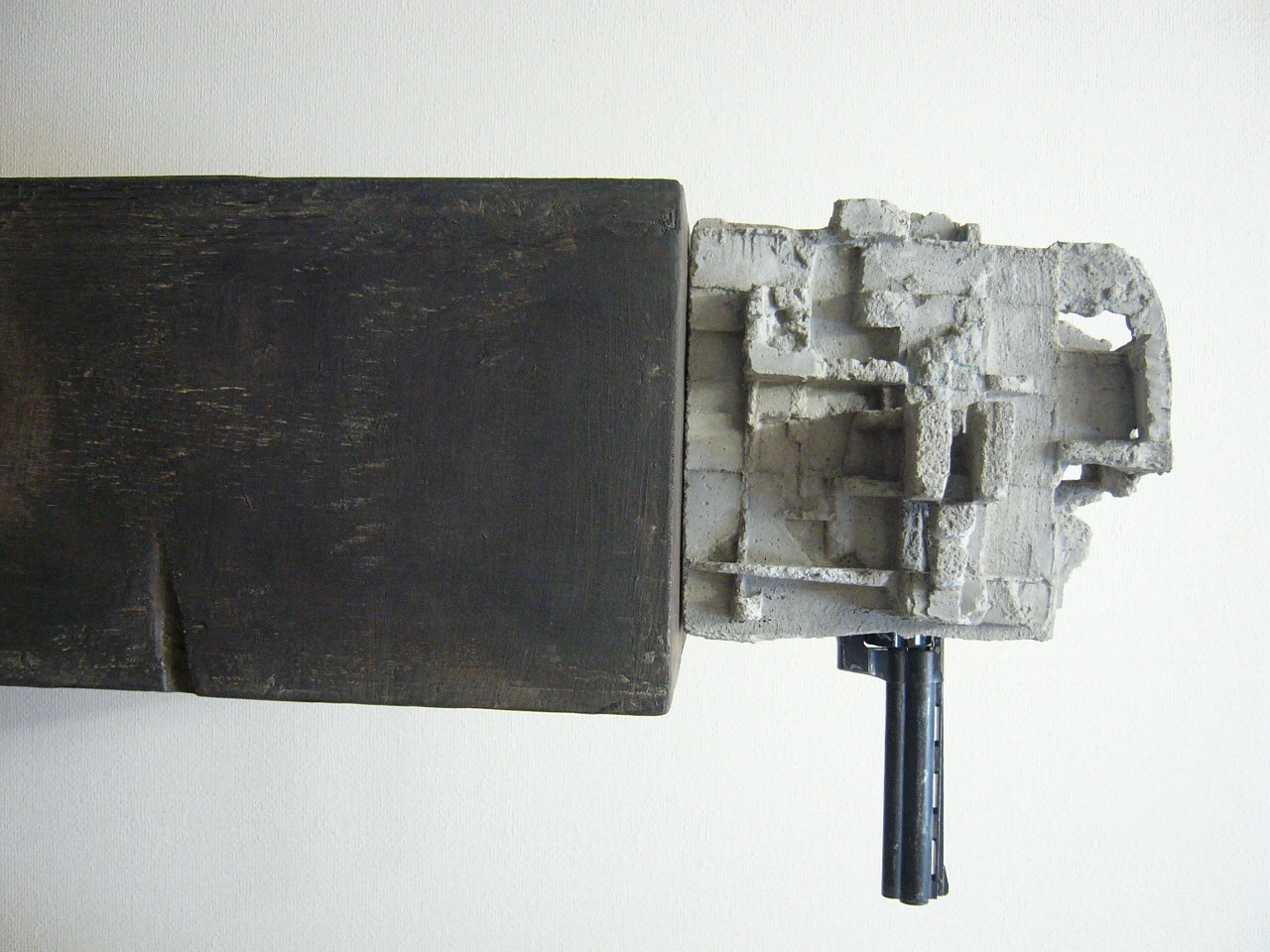 モデルガンショップで中古の銃をしこたま買い込んだ。ゼロ戦を埋めた作品のように、銃を戦場の廃墟のように形づくったモルタルの中に銃口だけ残して埋没させた。それを載せる台は漆で塗られた木の箱である。漆は本来、傷ついた樹木の防衛をする。そのからだを守り傷口をふさぐ。箱に載せられた銃を含んだモルタルの塊、その全体像はなにか戦闘的なロボットのように見えるはずである。その数は、現在私が勤める高等学校の1クラスの人数である。銃口の高さは、生徒が座る顔の高さになっている。それを正面からみると不気味な表情が備わっているように見えると思う。引金はモルタルで固められているので銃の機能は成さないが、銃口を正面から突きつけられては気持ちのいいものではないだろう。その前で、何を感じ、思考するか、それが楽しみである。そして背後に周った時にはどうか? 土台の箱は銃弾の貯金箱になっている。銃弾が貫通した様な穴から未使用の銃弾を入れられるようにした。銃社会アメリカの適切な場所に置いてもらい銃弾貯金箱として使って頂くことを願う。銃弾で一杯になったら作品ごと爆破すれば良い。すぐに思いつくと思うが、タイトルのkyodanは教壇、凶弾、教団がかけられている。