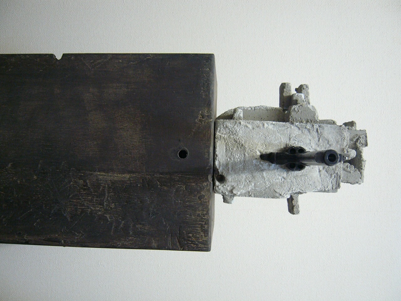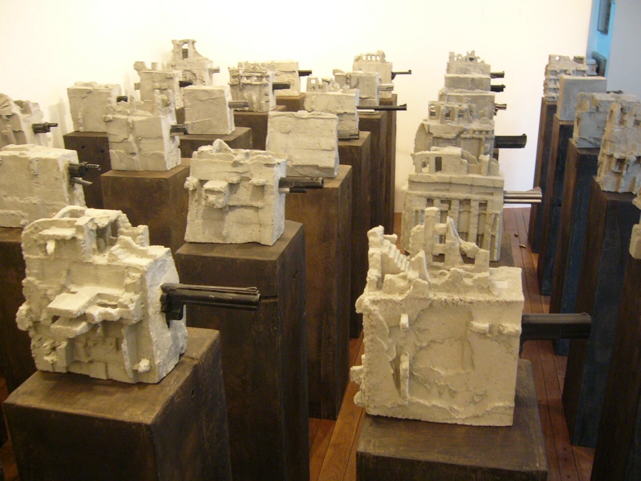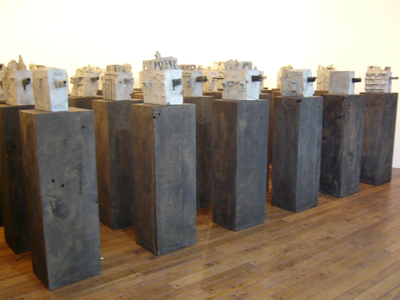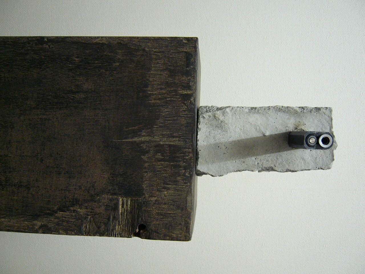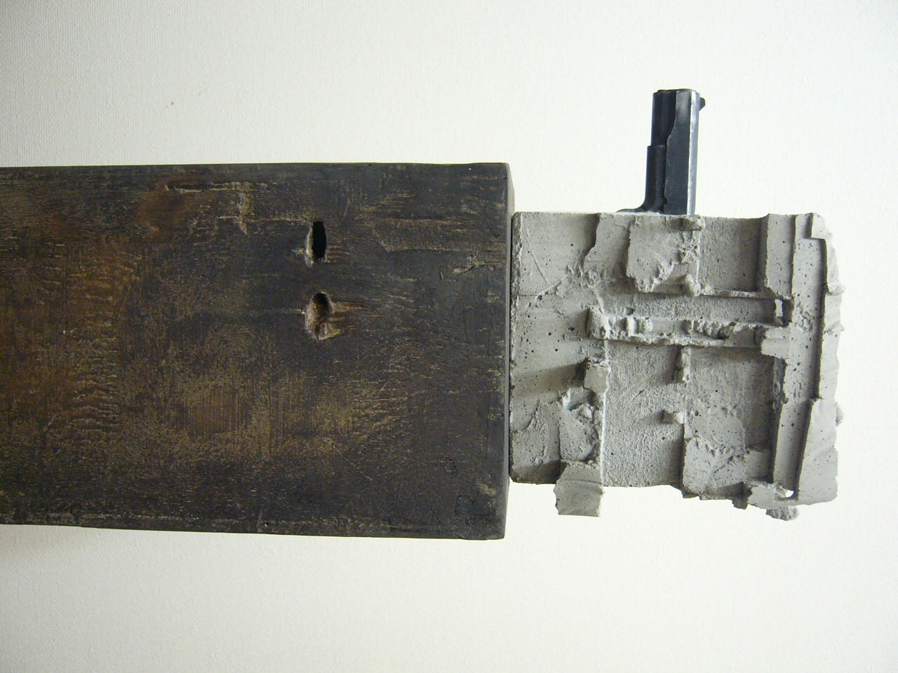 モデルガンショップで中古の銃をしこたま買い込んだ。ゼロ戦を埋めた作品のように、銃を戦場の廃墟のように形づくったモルタルの中に銃口だけ残して埋没させた。それを載せる台は漆で塗られた木の箱である。漆は本来、傷ついた樹木の防衛をする。そのからだを守り傷口をふさぐ。箱に載せられた銃を含んだモルタルの塊、その全体像はなにか戦闘的なロボットのように見えるはずである。その数は、現在私が勤める高等学校の1クラスの人数である。銃口の高さは、生徒が座る顔の高さになっている。それを正面からみると不気味な表情が備わっているように見えると思う。引金はモルタルで固められているので銃の機能は成さないが、銃口を正面から突きつけられては気持ちのいいものではないだろう。その前で、何を感じ、思考するか、それが楽しみである。そして背後に周った時にはどうか? 土台の箱は銃弾の貯金箱になっている。銃弾が貫通した様な穴から未使用の銃弾を入れられるようにした。銃社会アメリカの適切な場所に置いてもらい銃弾貯金箱として使って頂くことを願う。銃弾で一杯になったら作品ごと爆破すれば良い。すぐに思いつくと思うが、タイトルのkyodanは教壇、凶弾、教団がかけられている。
