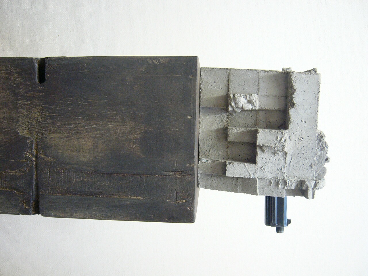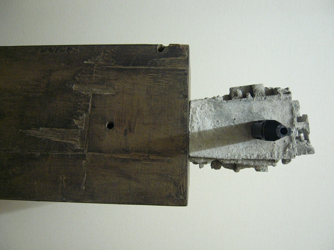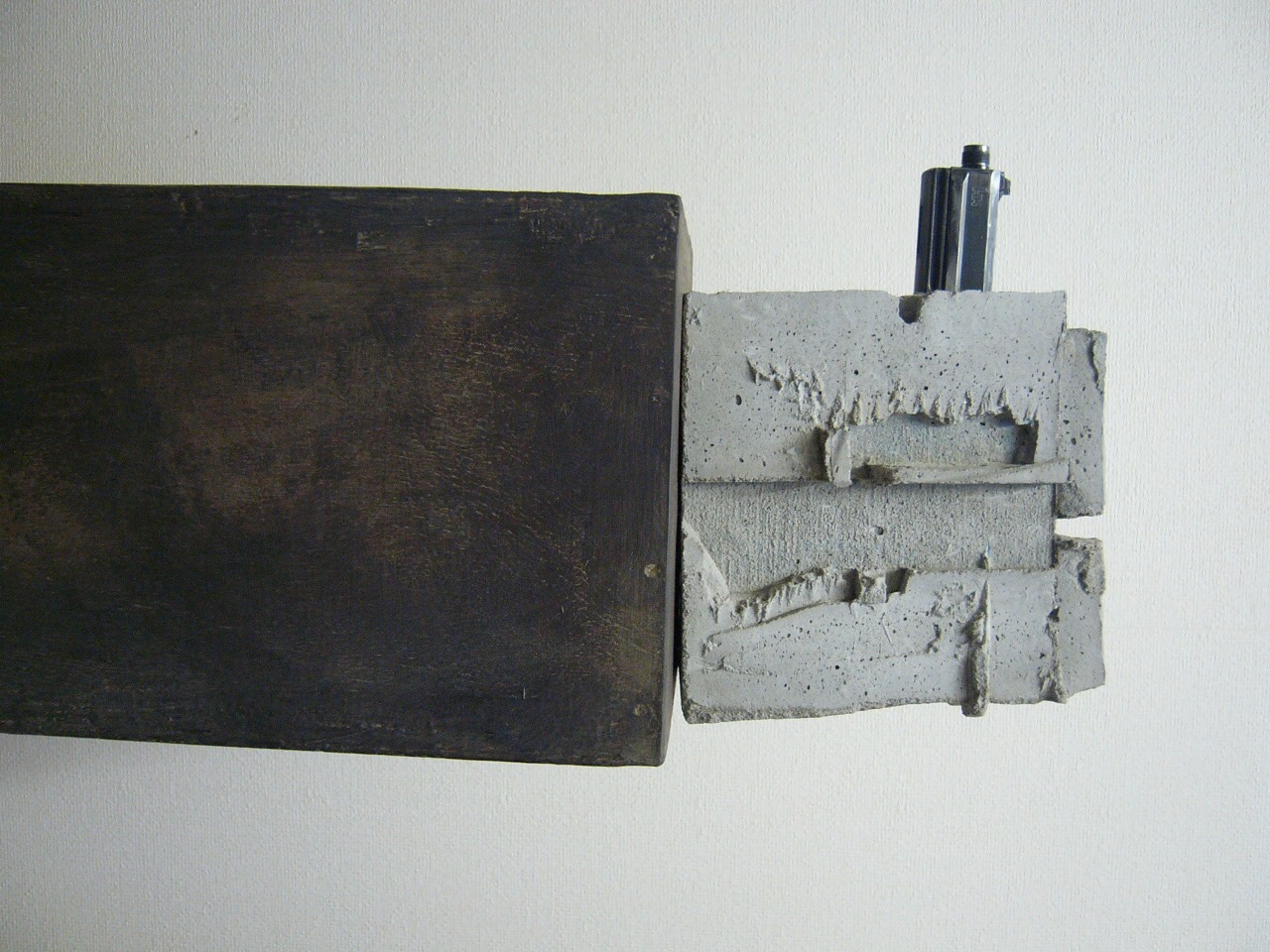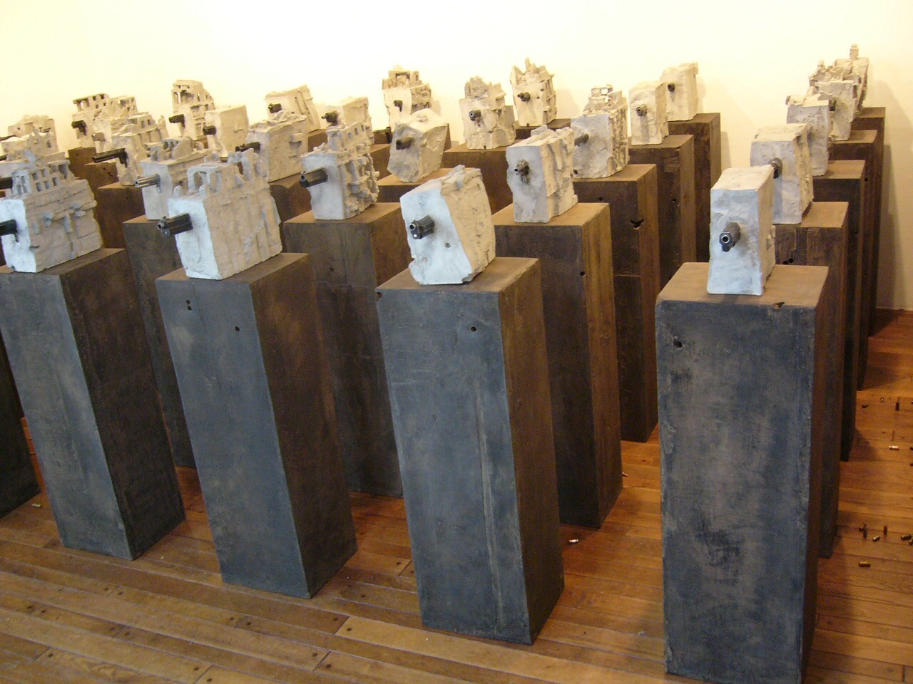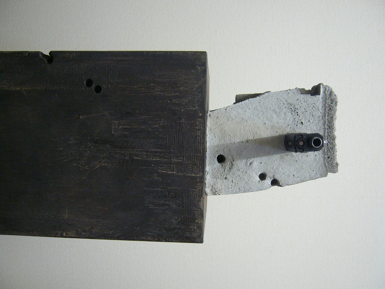 モデルガンショップで中古の銃をしこたま買い込んだ。ゼロ戦を埋めた作品のように、銃を戦場の廃墟のように形づくったモルタルの中に銃口だけ残して埋没させた。それを載せる台は漆で塗られた木の箱である。漆は本来、傷ついた樹木の防衛をする。そのからだを守り傷口をふさぐ。箱に載せられた銃を含んだモルタルの塊、その全体像はなにか戦闘的なロボットのように見えるはずである。その数は、現在私が勤める高等学校の1クラスの人数である。銃口の高さは、生徒が座る顔の高さになっている。それを正面からみると不気味な表情が備わっているように見えると思う。引金はモルタルで固められているので銃の機能は成さないが、銃口を正面から突きつけられては気持ちのいいものではないだろう。その前で、何を感じ、思考するか、それが楽しみである。そして背後に周った時にはどうか? 土台の箱は銃弾の貯金箱になっている。銃弾が貫通した様な穴から未使用の銃弾を入れられるようにした。銃社会アメリカの適切な場所に置いてもらい銃弾貯金箱として使って頂くことを願う。銃弾で一杯になったら作品ごと爆破すれば良い。すぐに思いつくと思うが、タイトルのkyodanは教壇、凶弾、教団がかけられている。
