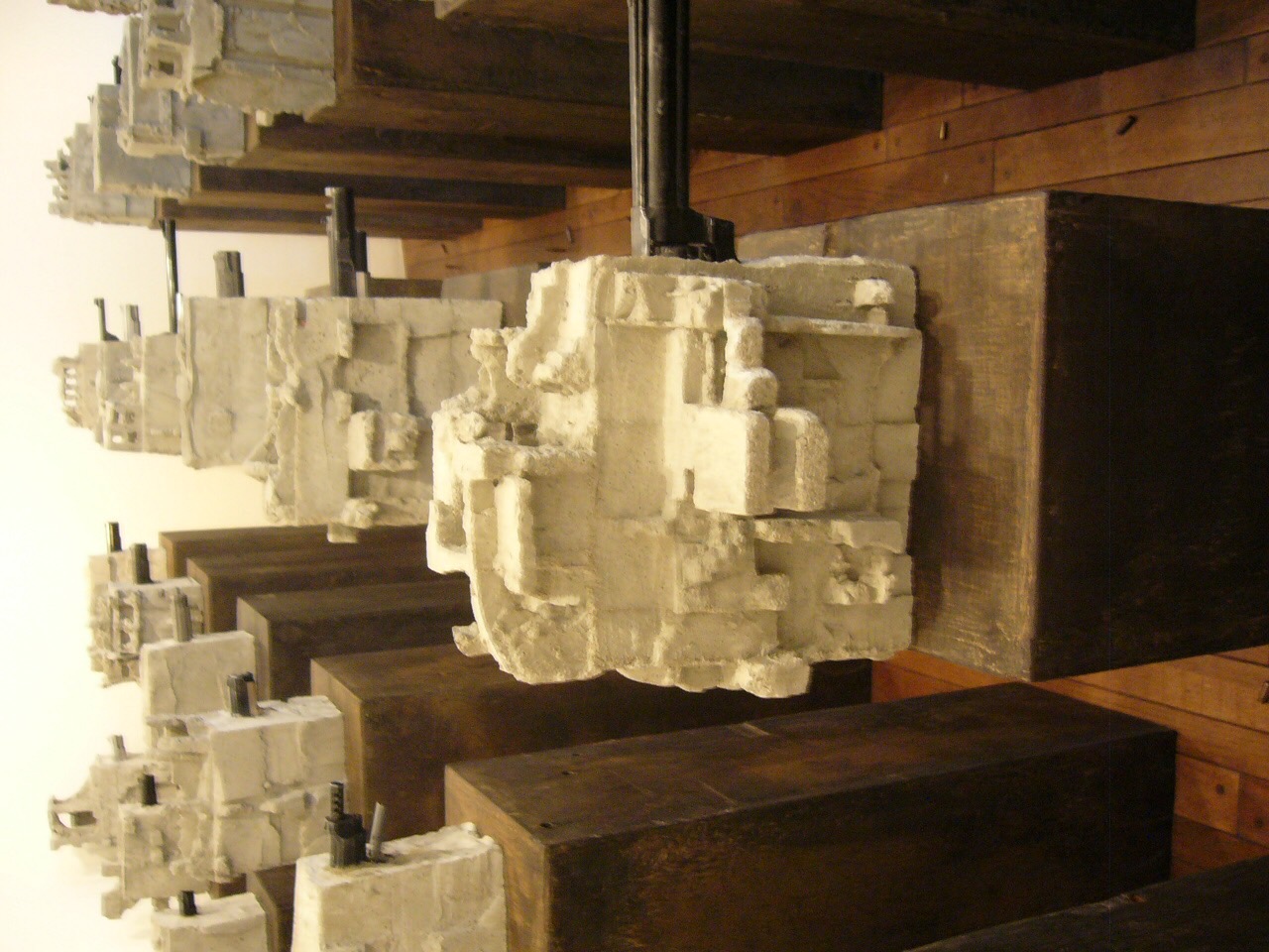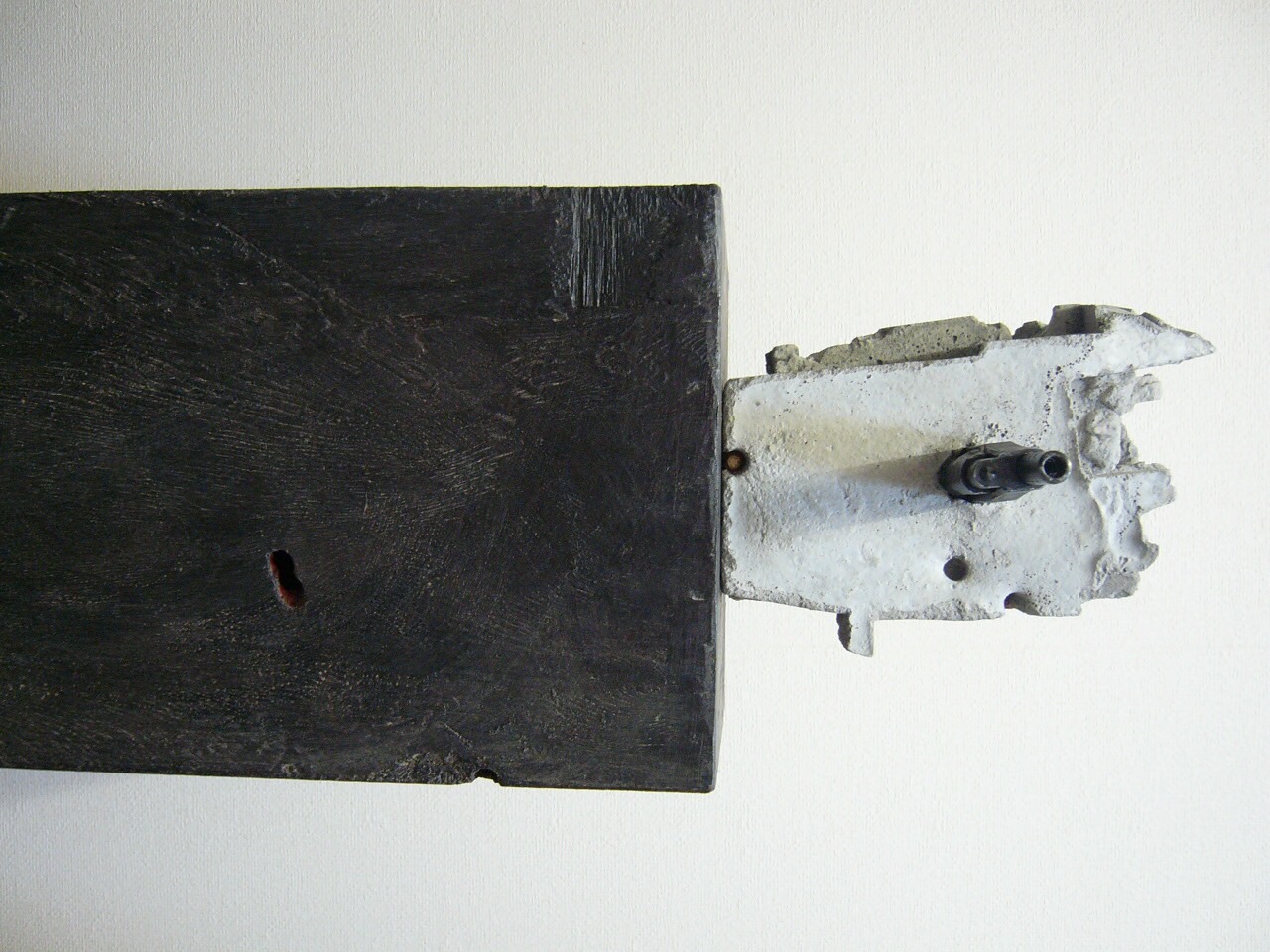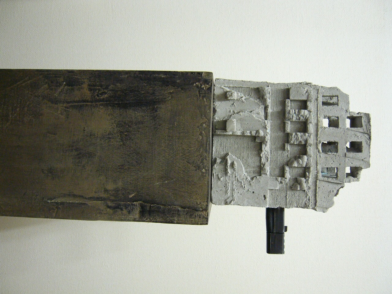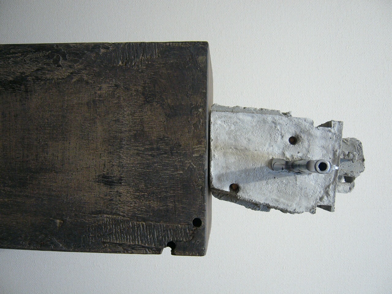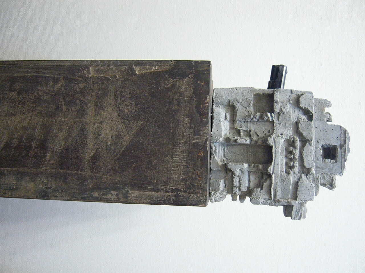 モデルガンショップで中古の銃をしこたま買い込んだ。ゼロ戦を埋めた作品のように、銃を戦場の廃墟のように形づくったモルタルの中に銃口だけ残して埋没させた。それを載せる台は漆で塗られた木の箱である。漆は本来、傷ついた樹木の防衛をする。そのからだを守り傷口をふさぐ。箱に載せられた銃を含んだモルタルの塊、その全体像はなにか戦闘的なロボットのように見えるはずである。その数は、現在私が勤める高等学校の1クラスの人数である。銃口の高さは、生徒が座る顔の高さになっている。それを正面からみると不気味な表情が備わっているように見えると思う。引金はモルタルで固められているので銃の機能は成さないが、銃口を正面から突きつけられては気持ちのいいものではないだろう。その前で、何を感じ、思考するか、それが楽しみである。そして背後に周った時にはどうか? 土台の箱は銃弾の貯金箱になっている。銃弾が貫通した様な穴から未使用の銃弾を入れられるようにした。銃社会アメリカの適切な場所に置いてもらい銃弾貯金箱として使って頂くことを願う。銃弾で一杯になったら作品ごと爆破すれば良い。すぐに思いつくと思うが、タイトルのkyodanは教壇、凶弾、教団がかけられている。