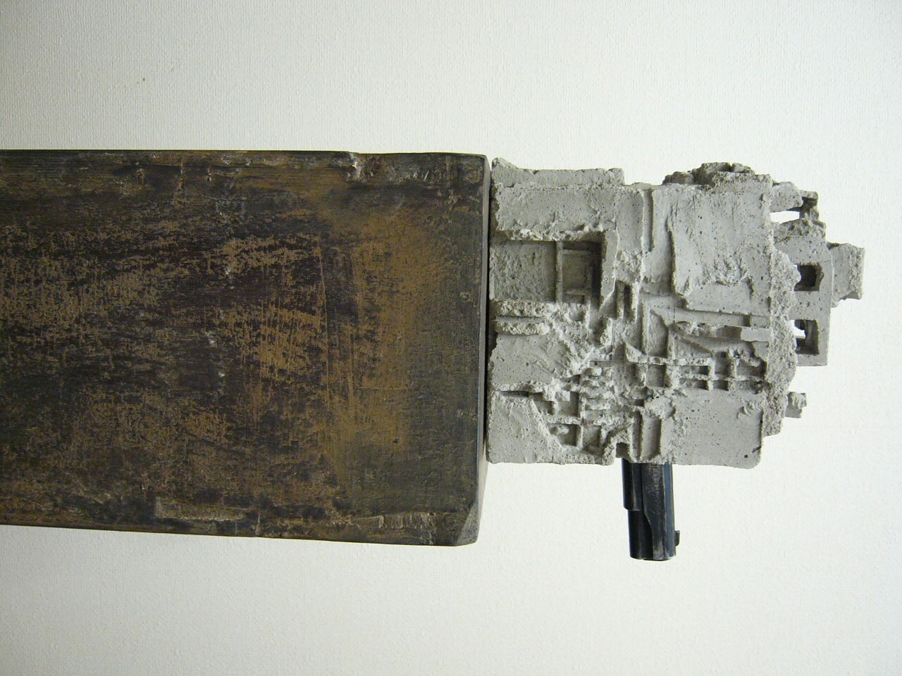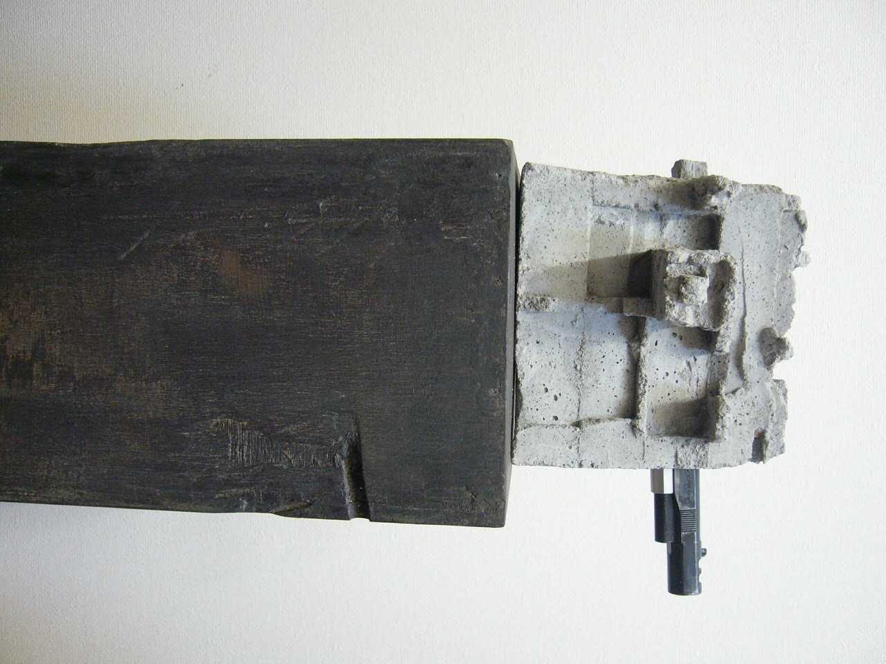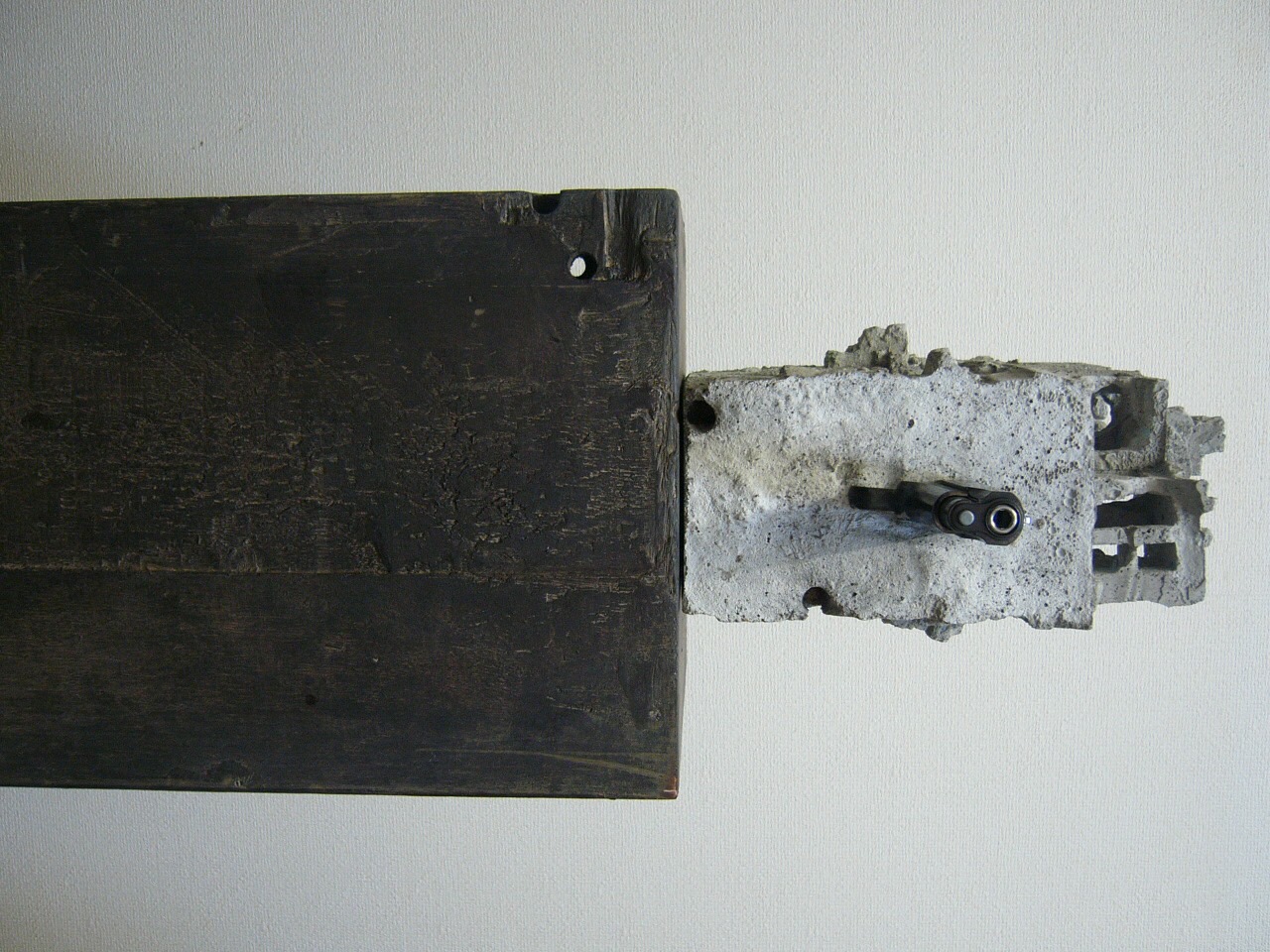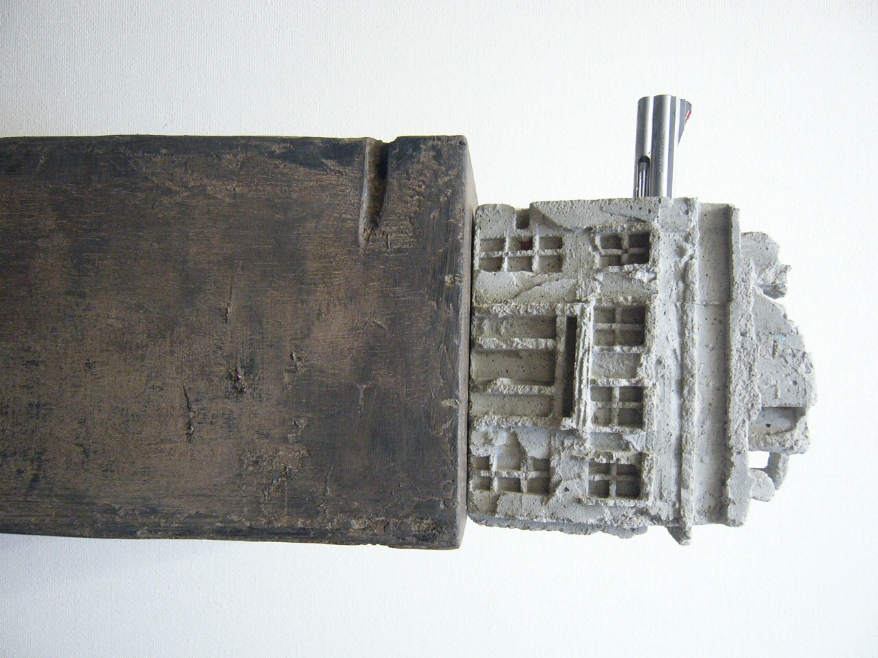 モデルガンショップで中古の銃をしこたま買い込んだ。ゼロ戦を埋めた作品のように、銃を戦場の廃墟のように形づくったモルタルの中に銃口だけ残して埋没させた。それを載せる台は漆で塗られた木の箱である。漆は本来、傷ついた樹木の防衛をする。そのからだを守り傷口をふさぐ。箱に載せられた銃を含んだモルタルの塊、その全体像はなにか戦闘的なロボットのように見えるはずである。その数は、現在私が勤める高等学校の1クラスの人数である。銃口の高さは、生徒が座る顔の高さになっている。それを正面からみると不気味な表情が備わっているように見えると思う。引金はモルタルで固められているので銃の機能は成さないが、銃口を正面から突きつけられては気持ちのいいものではないだろう。その前で、何を感じ、思考するか、それが楽しみである。そして背後に周った時にはどうか? 土台の箱は銃弾の貯金箱になっている。銃弾が貫通した様な穴から未使用の銃弾を入れられるようにした。銃社会アメリカの適切な場所に置いてもらい銃弾貯金箱として使って頂くことを願う。銃弾で一杯になったら作品ごと爆破すれば良い。すぐに思いつくと思うが、タイトルのkyodanは教壇、凶弾、教団がかけられている。