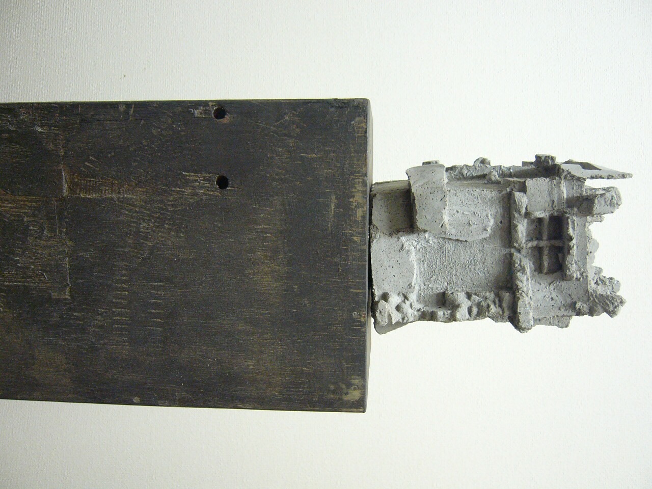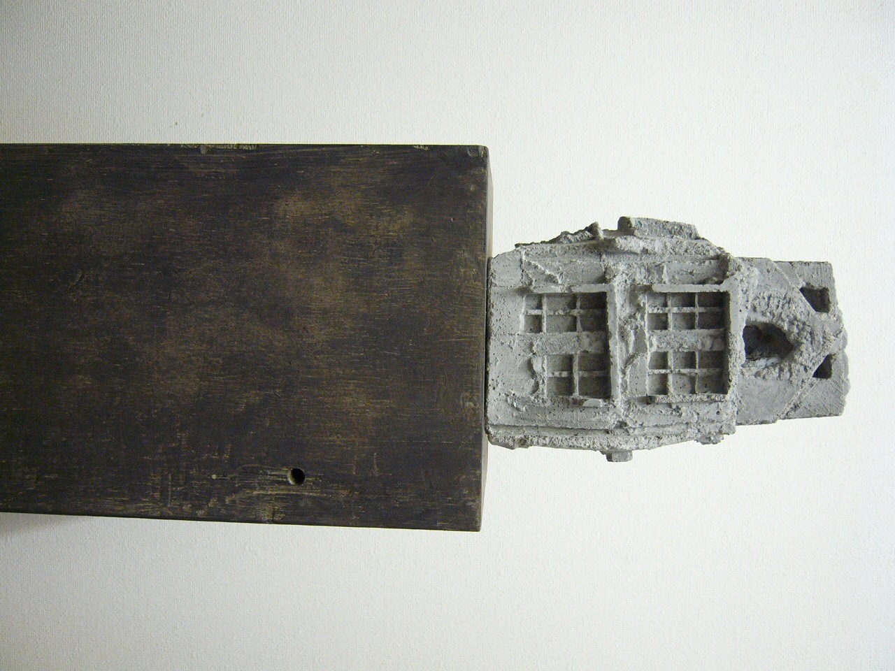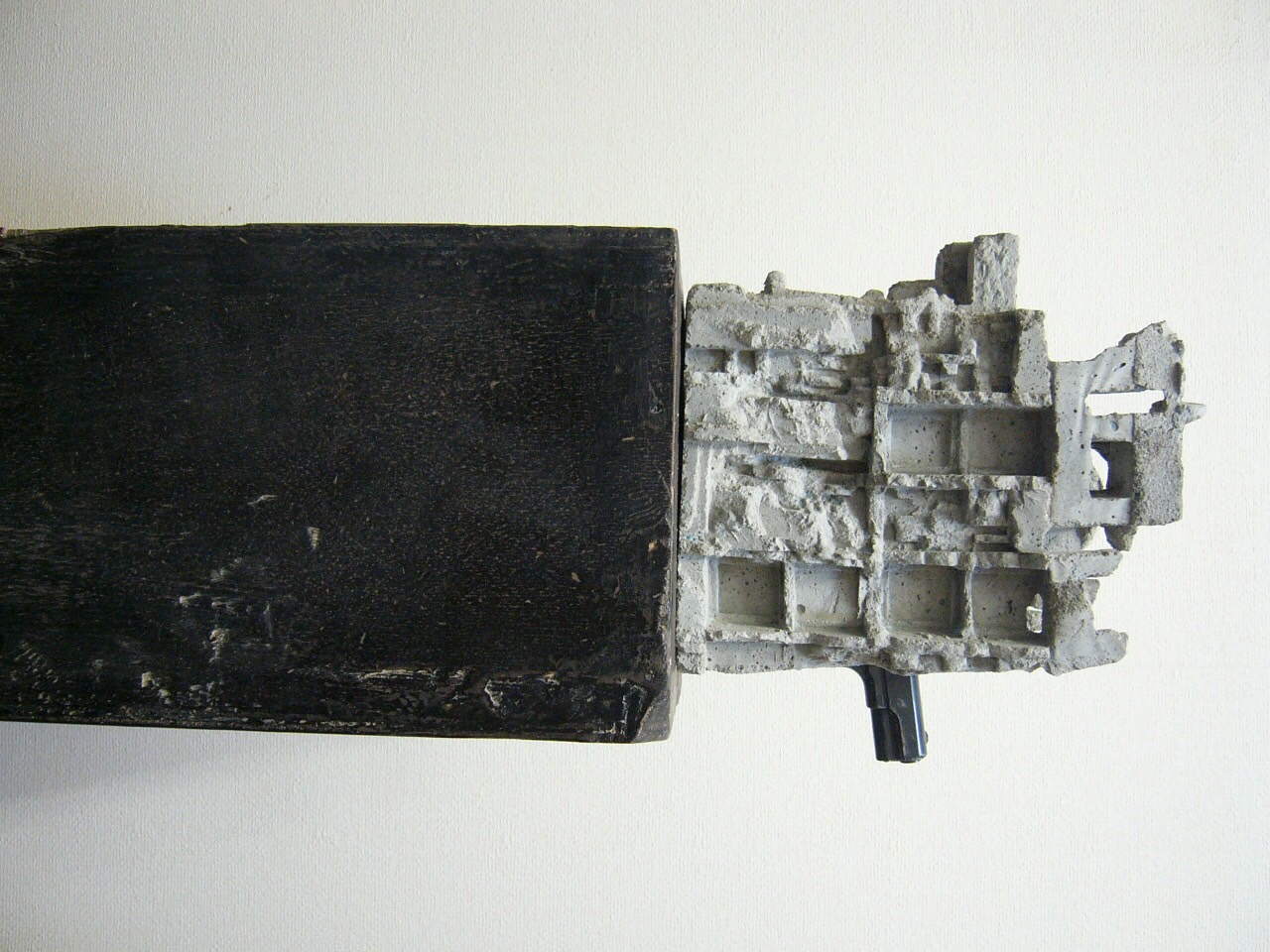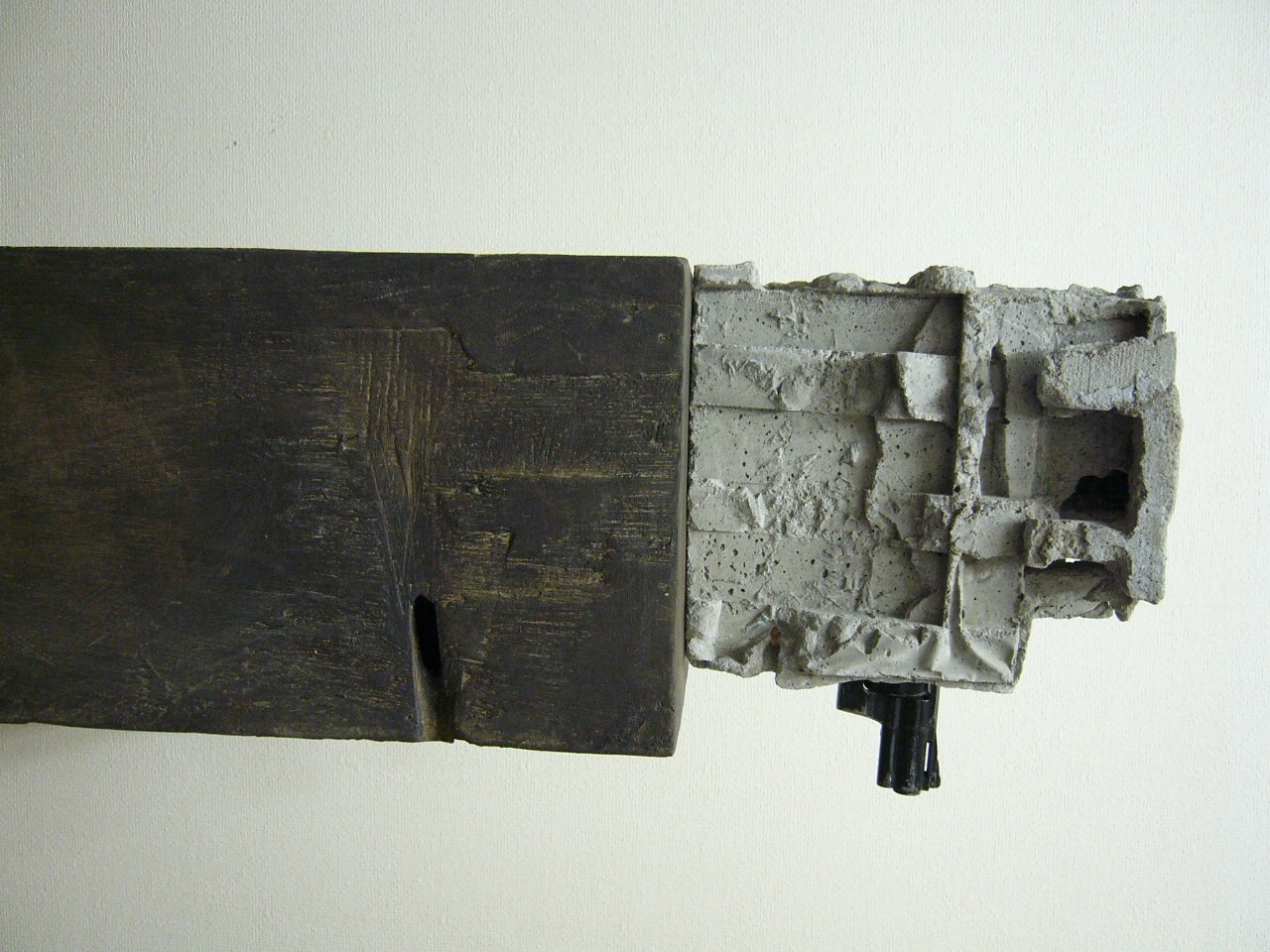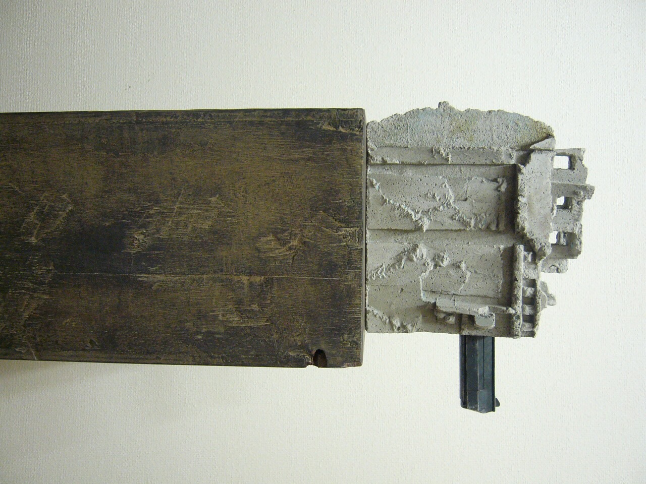 モデルガンショップで中古の銃をしこたま買い込んだ。ゼロ戦を埋めた作品のように、銃を戦場の廃墟のように形づくったモルタルの中に銃口だけ残して埋没させた。それを載せる台は漆で塗られた木の箱である。漆は本来、傷ついた樹木の防衛をする。そのからだを守り傷口をふさぐ。箱に載せられた銃を含んだモルタルの塊、その全体像はなにか戦闘的なロボットのように見えるはずである。その数は、現在私が勤める高等学校の1クラスの人数である。銃口の高さは、生徒が座る顔の高さになっている。それを正面からみると不気味な表情が備わっているように見えると思う。引金はモルタルで固められているので銃の機能は成さないが、銃口を正面から突きつけられては気持ちのいいものではないだろう。その前で、何を感じ、思考するか、それが楽しみである。そして背後に周った時にはどうか? 土台の箱は銃弾の貯金箱になっている。銃弾が貫通した様な穴から未使用の銃弾を入れられるようにした。銃社会アメリカの適切な場所に置いてもらい銃弾貯金箱として使って頂くことを願う。銃弾で一杯になったら作品ごと爆破すれば良い。すぐに思いつくと思うが、タイトルのkyodanは教壇、凶弾、教団がかけられている。