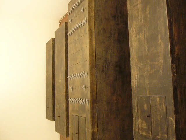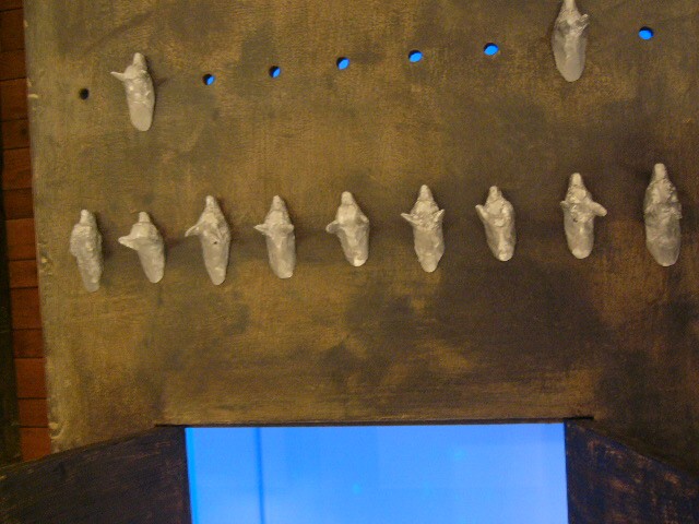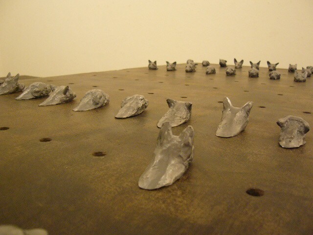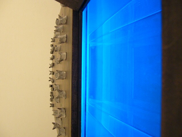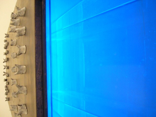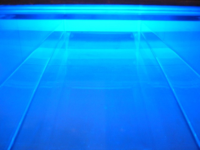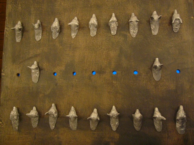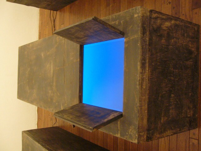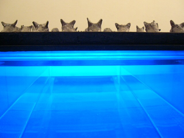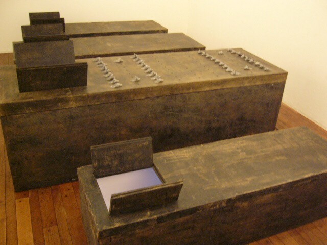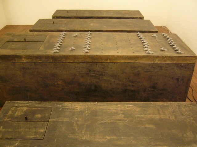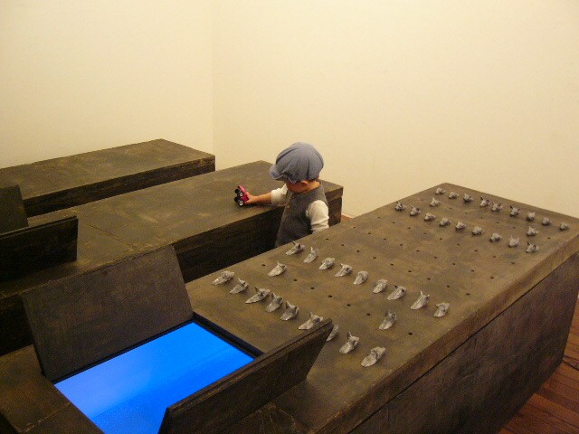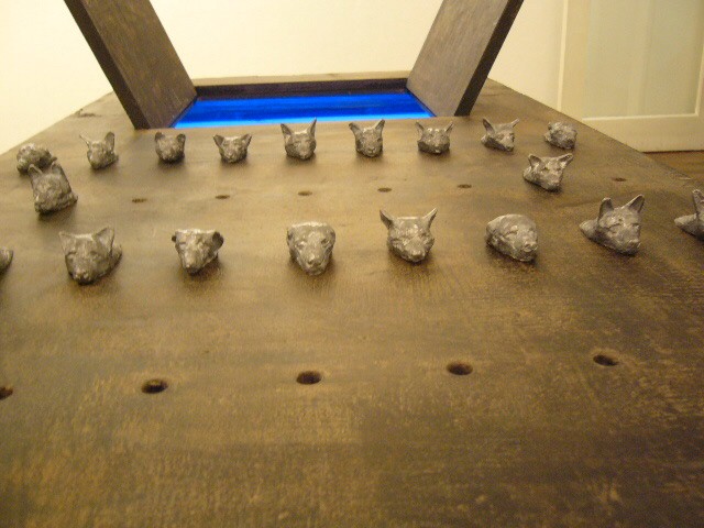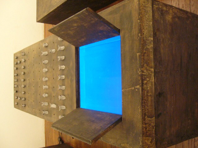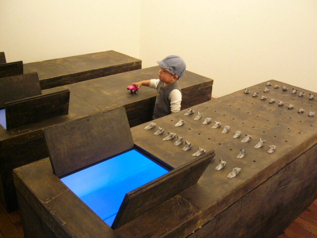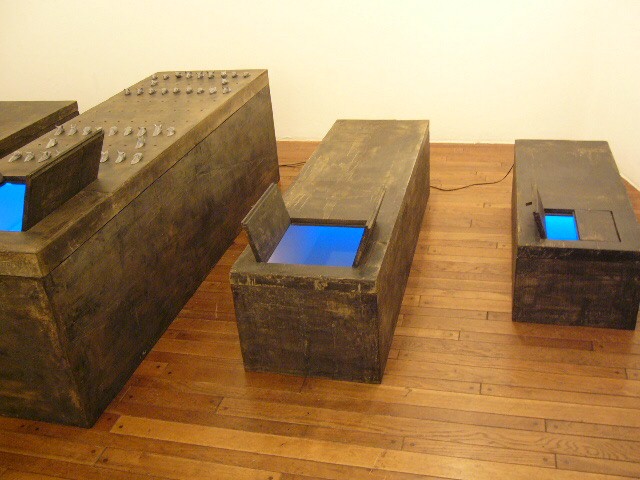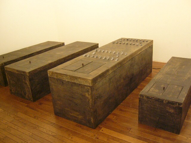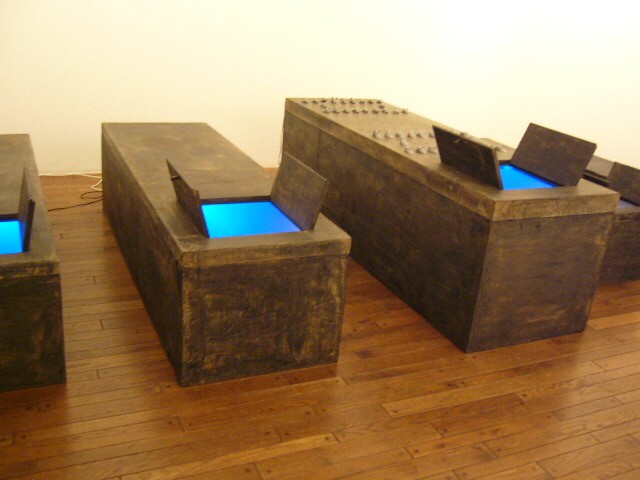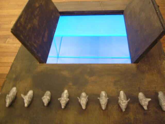 表現のテーマとなるものは、表と裏、内と外、例えば埋められたものと実在なもの、隠されたものと現れたもの、というように、社会の光と影、真実と偽り、夢と現実のようなところの面白さです。人は大切なものや宝物、また逆に汚いものや醜いものを隠します。私もそうですが、ほとんどの人が何か隠し事を溜め込んで生活しているように思います。表の顔や表情ではワカラナイ隠されたものがあるのではないでしょうか。それは当然私にもアリます。私は常に隠し事をしながらそれが表に出ないように少し演技をしながら生活をしています。表面にかぶったものと内にある本物みたいなもの、それを私なりの手法(あるものを隠す・埋める・覆うなどで表現しようと思っています。 今回表現しようと思っているのは、棺の内と外の世界ですが、私にとって、人を隠し葬るというところで、必然的に取り上げられる題材でした。更には、昨年、知人の葬儀に参列した折に感じたことですが、葬儀場の1階には人影の無い祭壇と棺、2階では楽しそうな宴会、あの世への旅立ちのセレモニーとしてまた在りし日の個人を偲んで思い出話に盛り上がるのはわかりますが、あまりにも棺の中にいる故人がなおざりであったことに違和感を感じました。また、遺族から「顔を見てあげてください」と言われましたが、面識のない個人の顔を拝見するにあたって、自分の中で勇気が必要になったことがさみしくなり、拝見するのを遠慮せていただいたことを思いだします。「棺はあの世とこの世を結ぶ乗り物」であるという解釈が成り立つようで。「仏教の教えでは、棺は必要ない。それでも存在するのは情が入り込むから。愛するものを失う悲しみを乗り越えるためにも棺は要るらしい」命は目には見えません。亡骸を棺に入れることで、残されたものは永遠の別れを受け入れ納得するらしいのです。それだけに棺に込める情や温もりが大切になります。金八先生風に解釈すると情けという字は、心が青いと書きます。そこで情けいっぱいの棺の内を青い光と水で満たしてみました。 棺の上には必死で泳ぐ犬のゲーム(将棋)があります。私の母が、海軍通信兵として東シナ海で戦死した兄の墓前で、「犬死にやわさ‥‥」と聞いたことも、なぜ犬かという理由です。このゲームを始めるには、犬の顔を一匹ずつ覚える必要があります。犬は泳いでいる時、本当に真剣な表情をします。片足を掴んでいたずらをしようものなら本当に溺れます。犬は泳ぎに必死なのです。たくさんの犬に一匹ずつ鎖をつけて泳がせてみます。色々な方向に皆が泳ぎ出した時、鎖が絡まってきっと溺れて犬死にの出来上がりです。これは兵士にも当てはまるように思います。 今回の表現をするにあたり、あのスマトラ沖地震の大津波やハリケーンでの死者と戦争での死者、天災と人災の差はあるにせよ、人の悲しみは変わりません。そしてどちらも悲惨な戦場の情景を醸し出しています。私にとってこれはあくまでも表の表現の世界で、しかも視覚的な世界でしかありません。では、その内にある見えないものは何でしょうか?私たちは表を見て裏を想像し、現実を見て夢を見るのではないでしょうか。