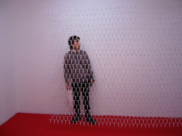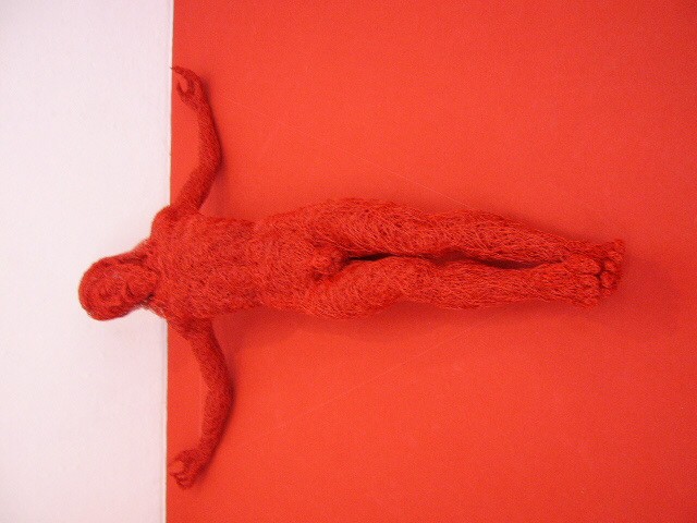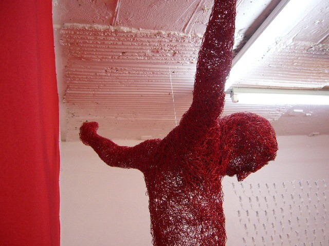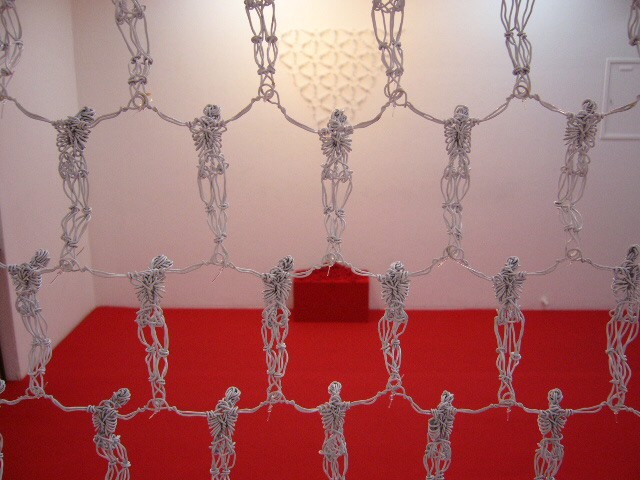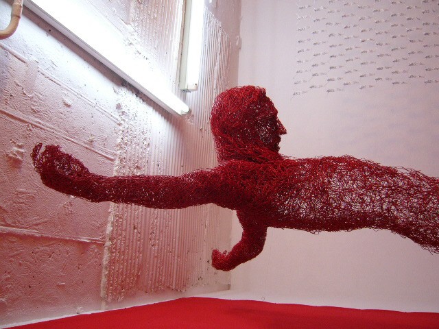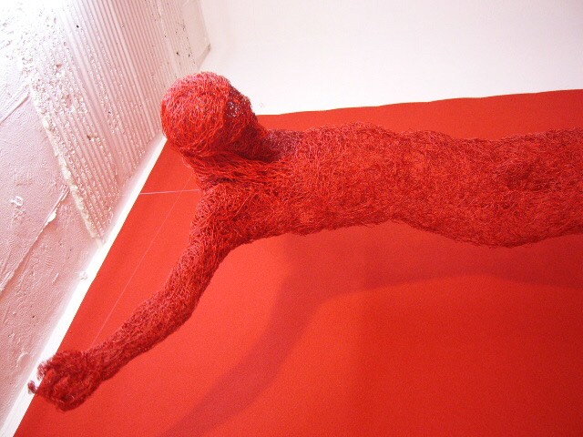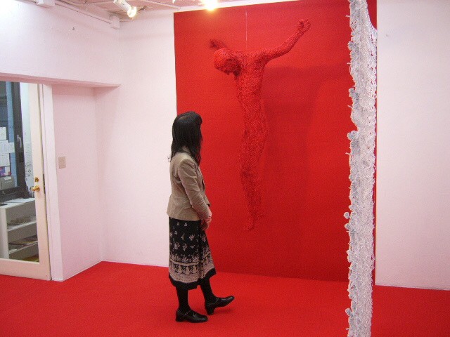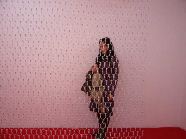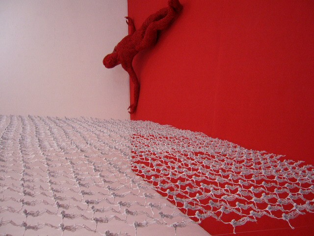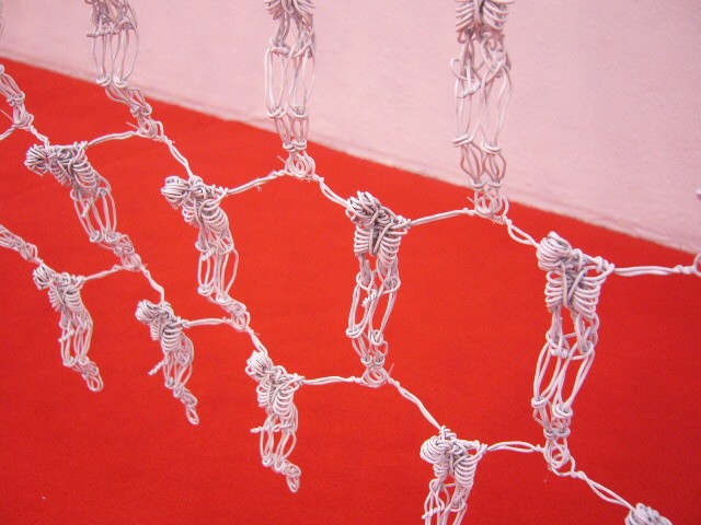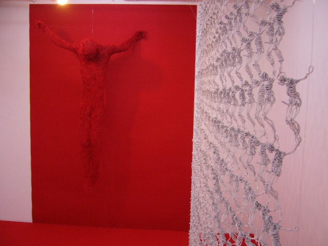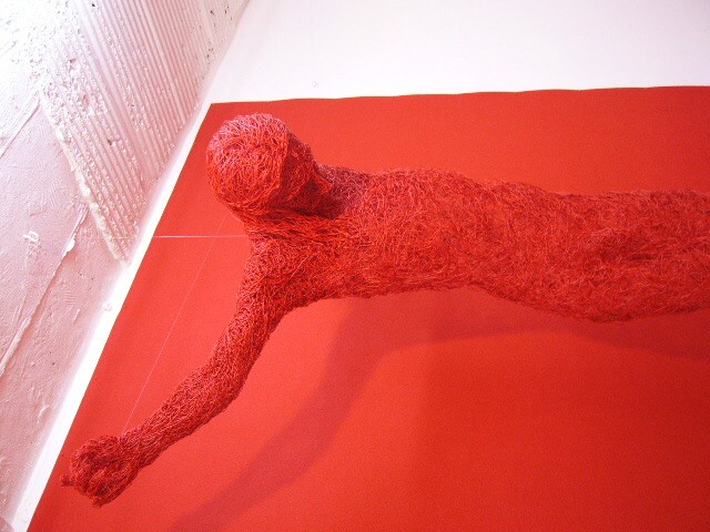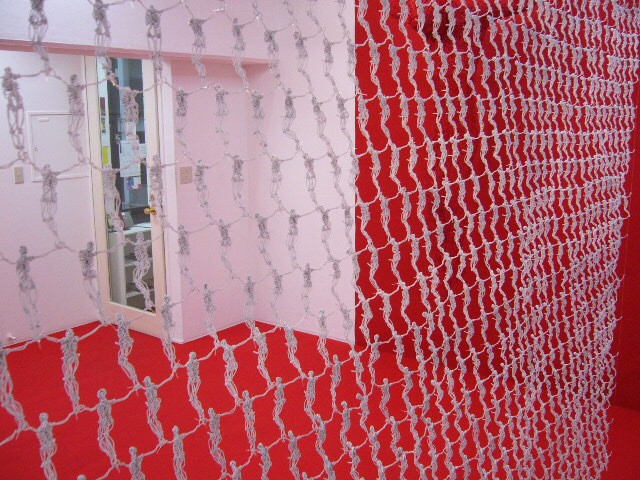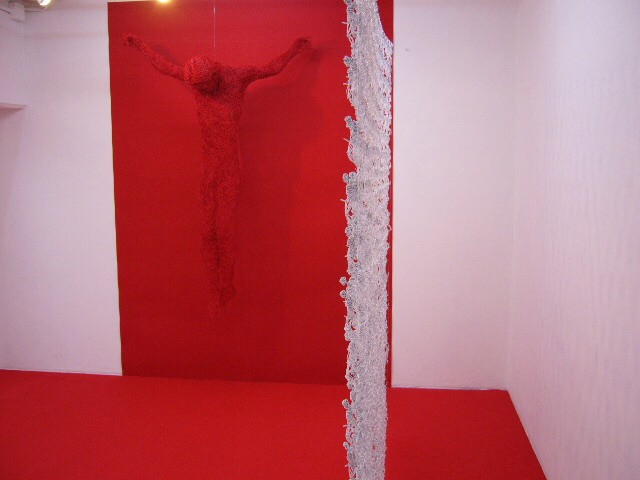 使う素材は細く長いアルミの針金、2006年、アフガン、イラク戦争真っただ中。8月までに亡くなった米兵およそ700人、イラク人に至っては推測さえできない数である。推測さえできぬ数字を求めても仕方ないので、死亡した米兵の数を700体のイエスとしてつくり、それを連鎖させ、フェンスを作ろうと思った。それから、あと2体はイエスの身長は約180cmと言われているので、それに合わせてつくった。イエスのフェンスは画廊の壁に合わせて白く、2体のイエスは床1面と壁の1部分に張り付けた赤いカーペットに合わせて赤くそれぞれ塗装を施した。ねらいは空間に隠すことであった。等身大のイエスは、人体展の中で、血管だけで出来た人の手を見たとき、その繊細な美しさはまさに、神が創ったものだと驚いたのがきっかけで、ヨシ、血管で神をつくろうと思った。フェンスのイエス1体1体はイエスの身長と同じ長さの針金でつくってある。頭からつくり始め最後はペニスを少し切って終わる。時間は、1体完成させるのに約30分かかるので、単純には30分×700である。700体の英霊に向かい合った時間とも言える。 この年の9月下旬のNHK報道番組で戦死した米兵の数があの9・11テロで亡くなった人の数2974(とされている)を上回ってしまったというアメリカの発表があり、私は数の目標を見失ってしまった。個展までの間に日々死者が増えて行くようにただただ作り続けた。