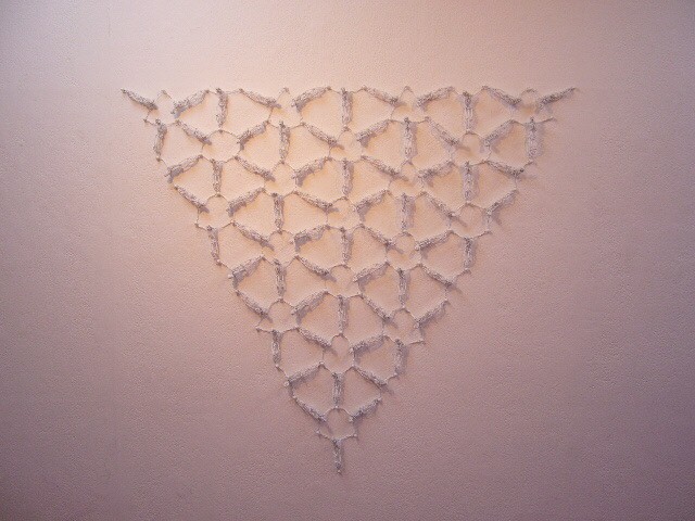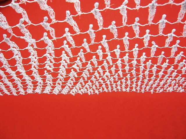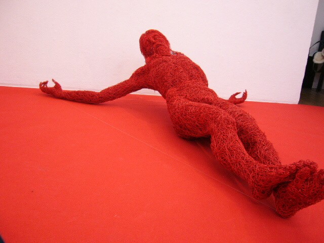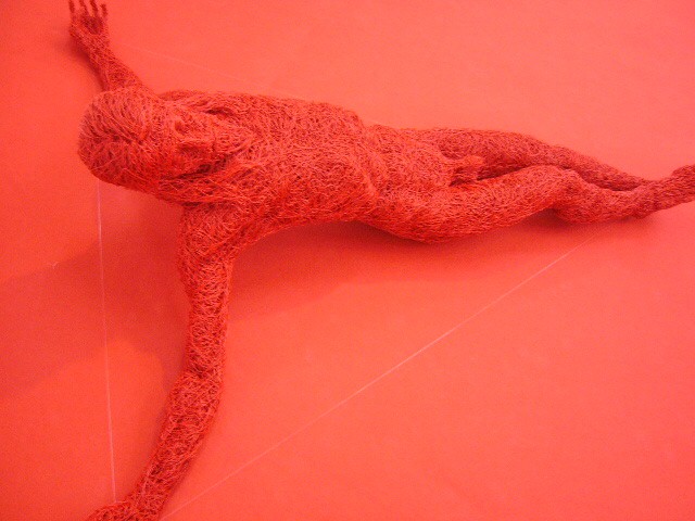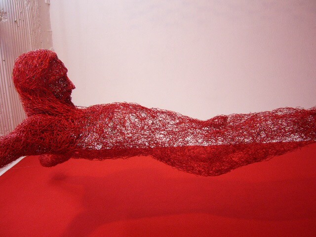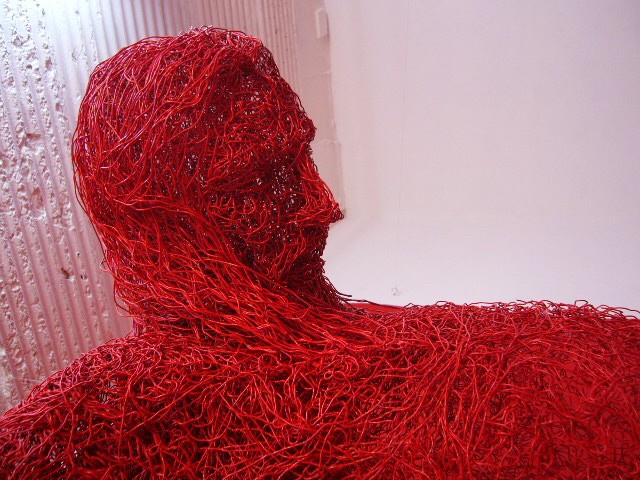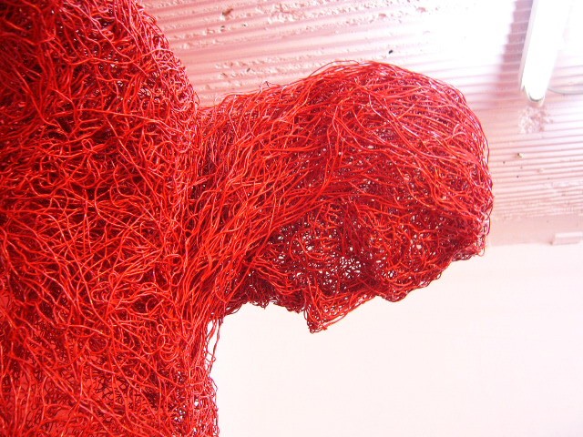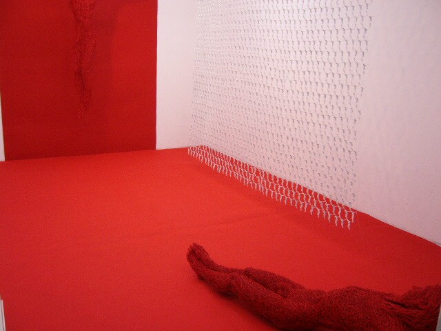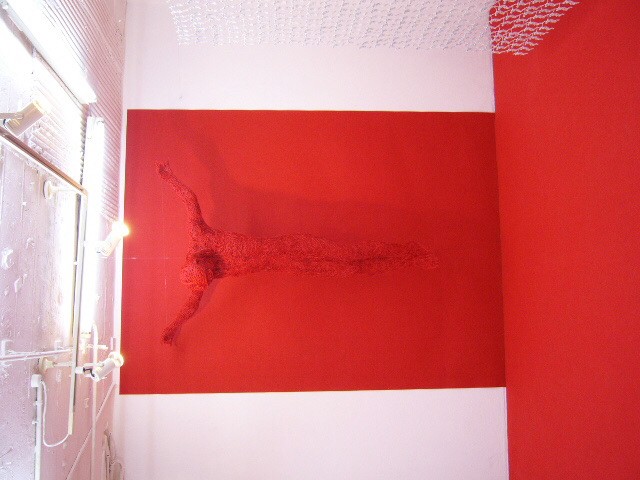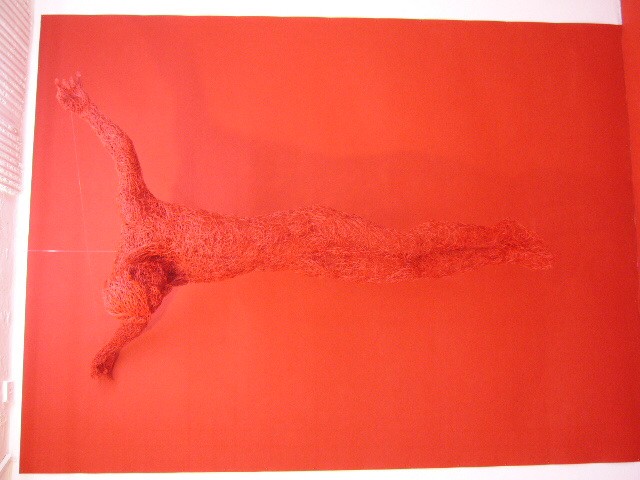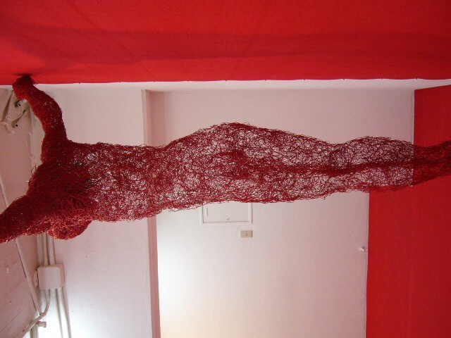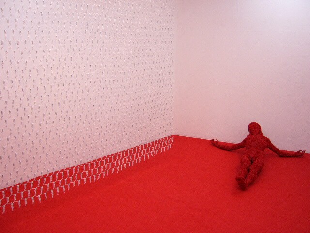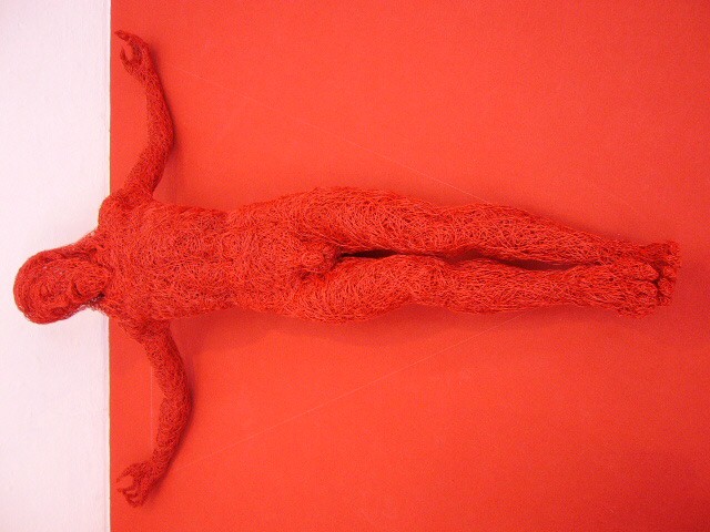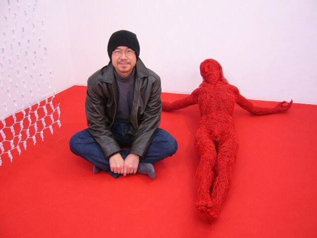 使う素材は細く長いアルミの針金、2006年、アフガン、イラク戦争真っただ中。8月までに亡くなった米兵およそ700人、イラク人に至っては推測さえできない数である。推測さえできぬ数字を求めても仕方ないので、死亡した米兵の数を700体のイエスとしてつくり、それを連鎖させ、フェンスを作ろうと思った。それから、あと2体はイエスの身長は約180cmと言われているので、それに合わせてつくった。イエスのフェンスは画廊の壁に合わせて白く、2体のイエスは床1面と壁の1部分に張り付けた赤いカーペットに合わせて赤くそれぞれ塗装を施した。ねらいは空間に隠すことであった。等身大のイエスは、人体展の中で、血管だけで出来た人の手を見たとき、その繊細な美しさはまさに、神が創ったものだと驚いたのがきっかけで、ヨシ、血管で神をつくろうと思った。フェンスのイエス1体1体はイエスの身長と同じ長さの針金でつくってある。頭からつくり始め最後はペニスを少し切って終わる。時間は、1体完成させるのに約30分かかるので、単純には30分×700である。700体の英霊に向かい合った時間とも言える。 この年の9月下旬のNHK報道番組で戦死した米兵の数があの9・11テロで亡くなった人の数2974(とされている)を上回ってしまったというアメリカの発表があり、私は数の目標を見失ってしまった。個展までの間に日々死者が増えて行くようにただただ作り続けた。
