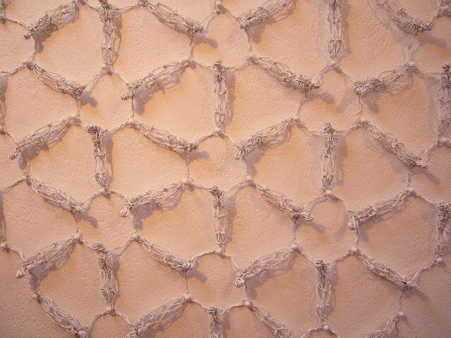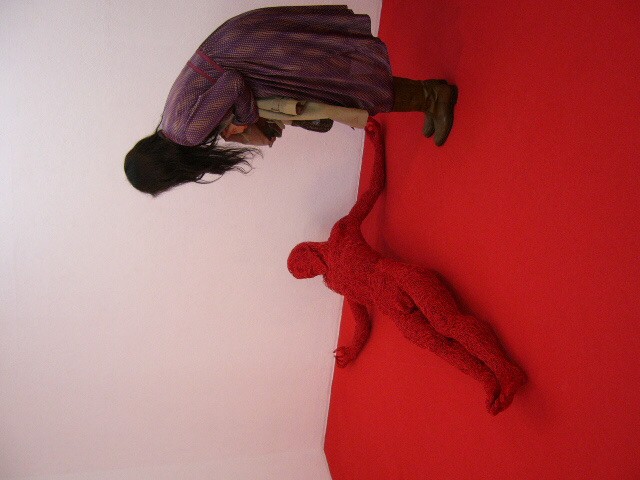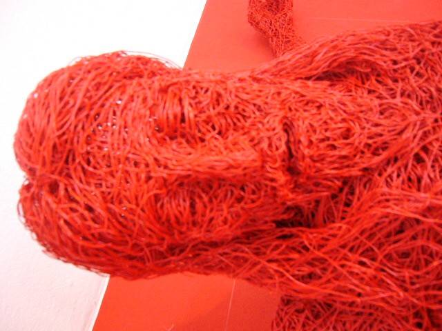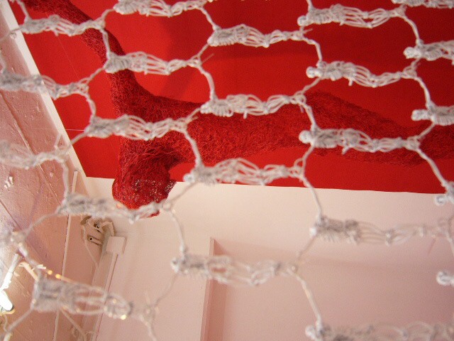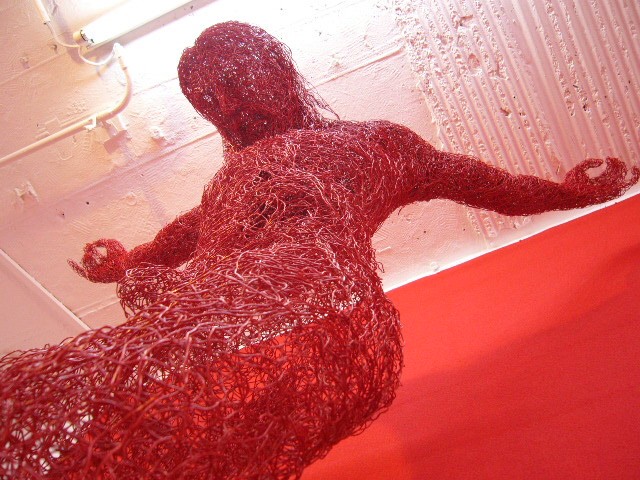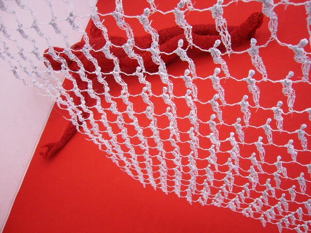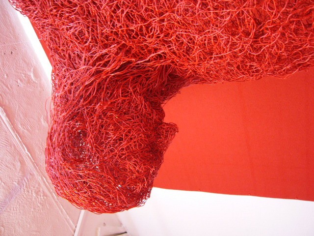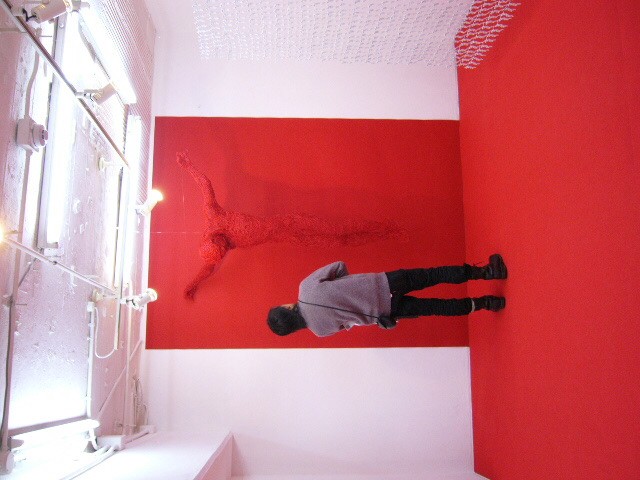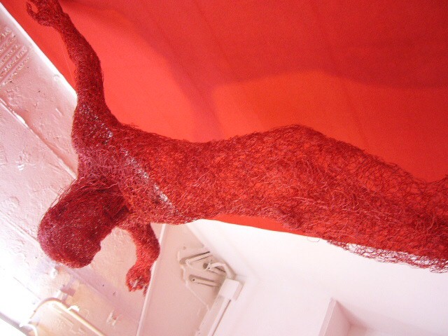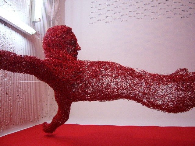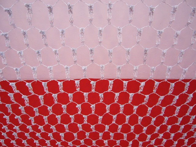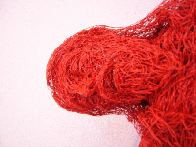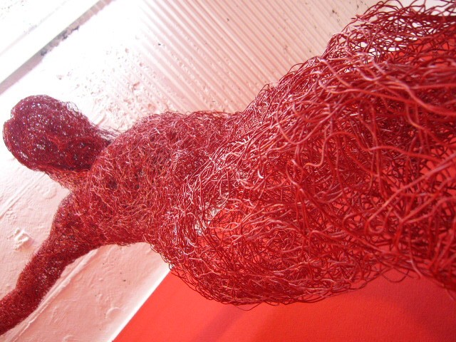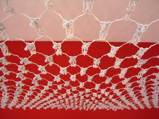 使う素材は細く長いアルミの針金、2006年、アフガン、イラク戦争真っただ中。8月までに亡くなった米兵およそ700人、イラク人に至っては推測さえできない数である。推測さえできぬ数字を求めても仕方ないので、死亡した米兵の数を700体のイエスとしてつくり、それを連鎖させ、フェンスを作ろうと思った。それから、あと2体はイエスの身長は約180cmと言われているので、それに合わせてつくった。イエスのフェンスは画廊の壁に合わせて白く、2体のイエスは床1面と壁の1部分に張り付けた赤いカーペットに合わせて赤くそれぞれ塗装を施した。ねらいは空間に隠すことであった。等身大のイエスは、人体展の中で、血管だけで出来た人の手を見たとき、その繊細な美しさはまさに、神が創ったものだと驚いたのがきっかけで、ヨシ、血管で神をつくろうと思った。フェンスのイエス1体1体はイエスの身長と同じ長さの針金でつくってある。頭からつくり始め最後はペニスを少し切って終わる。時間は、1体完成させるのに約30分かかるので、単純には30分×700である。700体の英霊に向かい合った時間とも言える。 この年の9月下旬のNHK報道番組で戦死した米兵の数があの9・11テロで亡くなった人の数2974(とされている)を上回ってしまったというアメリカの発表があり、私は数の目標を見失ってしまった。個展までの間に日々死者が増えて行くようにただただ作り続けた。