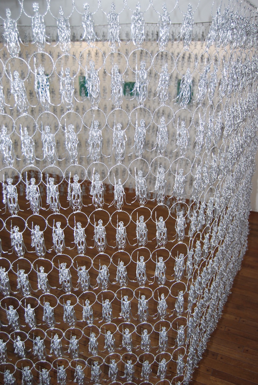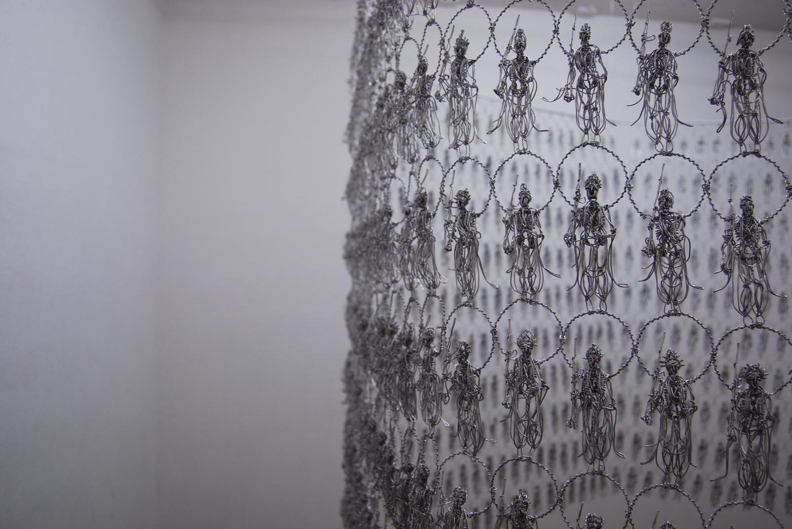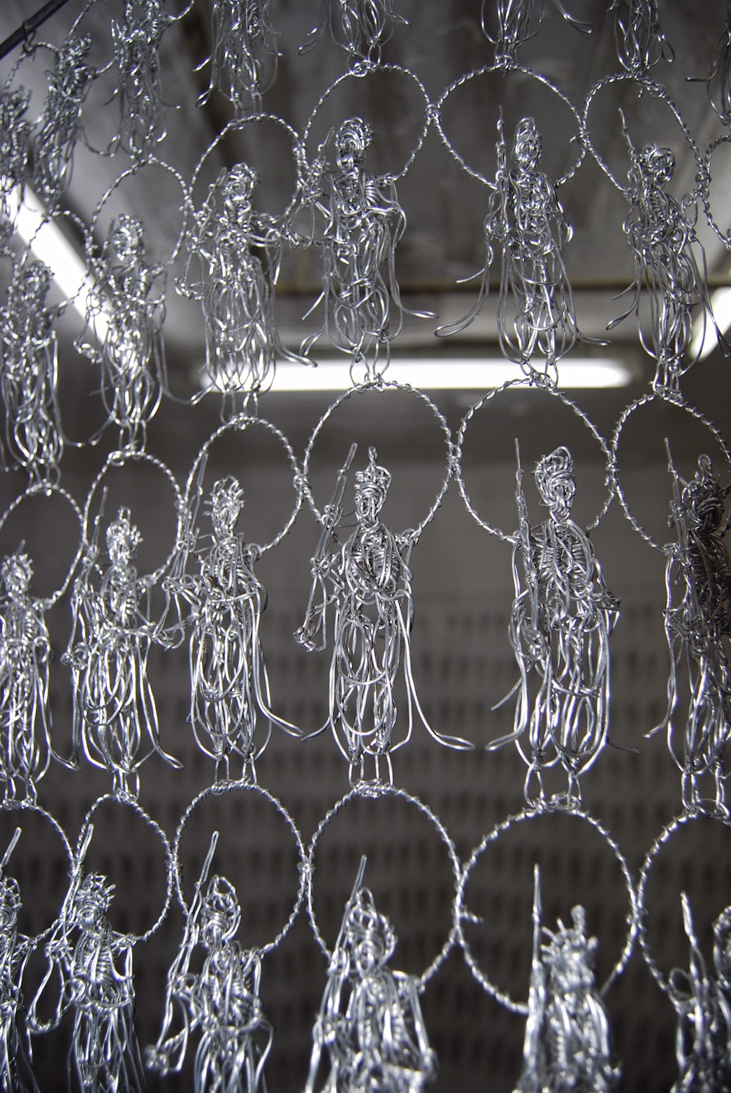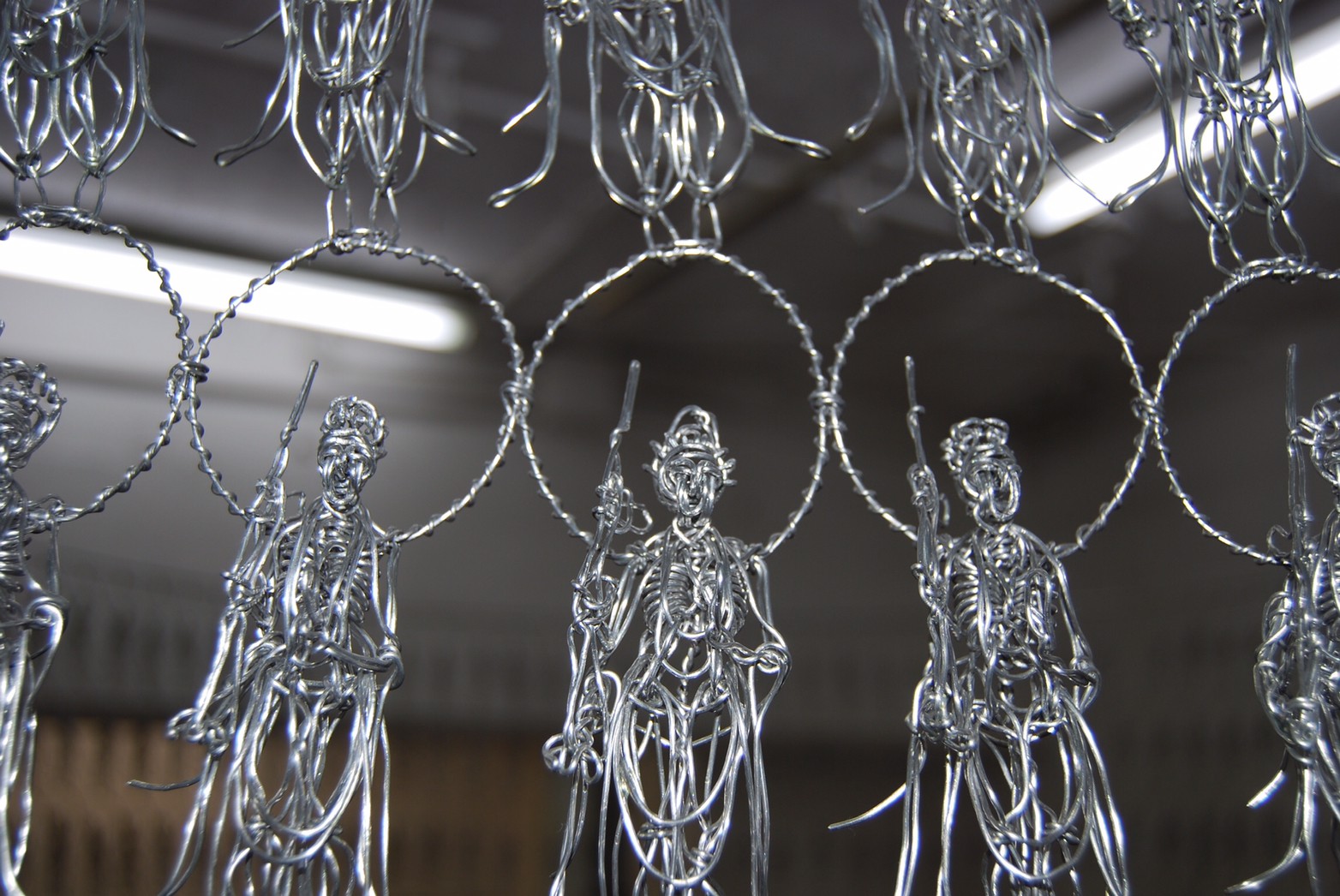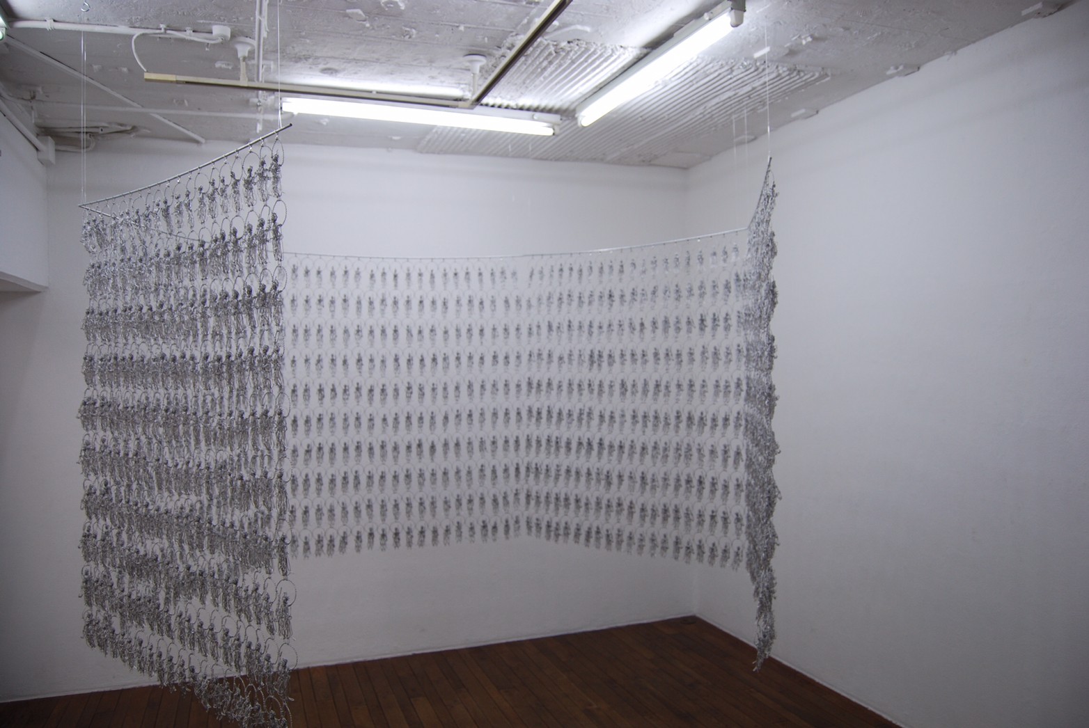 神の次は仏である。前作との繋がりであるのはたやすく想像できると思う。しかし発想の動機は小学生の修学旅行で行って以来、度々訪れた三十三間堂の千体仏を眼前にした時の感動と心の静寂感からである。ただ単純に、三十三間、横に広がる千体仏に囲まれてみたいと思った。仏の内にいる感覚を体験してみたかった。でも、つくる仏は戦隊仏、線体仏である。これも、昨年の「IESUS 」と同様、頭からつくるが、終わりは機関銃の銃口を少し切ることで終わる。1体1体同じものは無い。今回は塗装は行っていないアルミの地肌のままだ。空間に隠そうとはしなかった。自分がそれに囲まれ少しは隠れたかったのかもしれない。1体に使う針金の長さは3、3m。1体つくりあげる時間は1時間弱。つくる手順に法則は無いが、ほどいて行けばわかる。銃を携えた仏千体に囲まれた感覚は、さて如何ほどか?