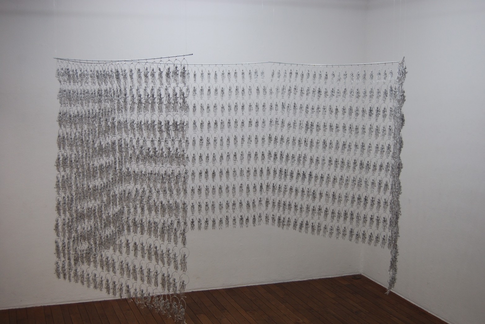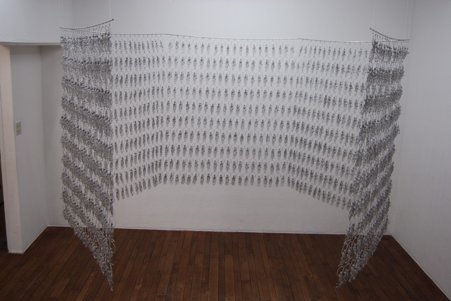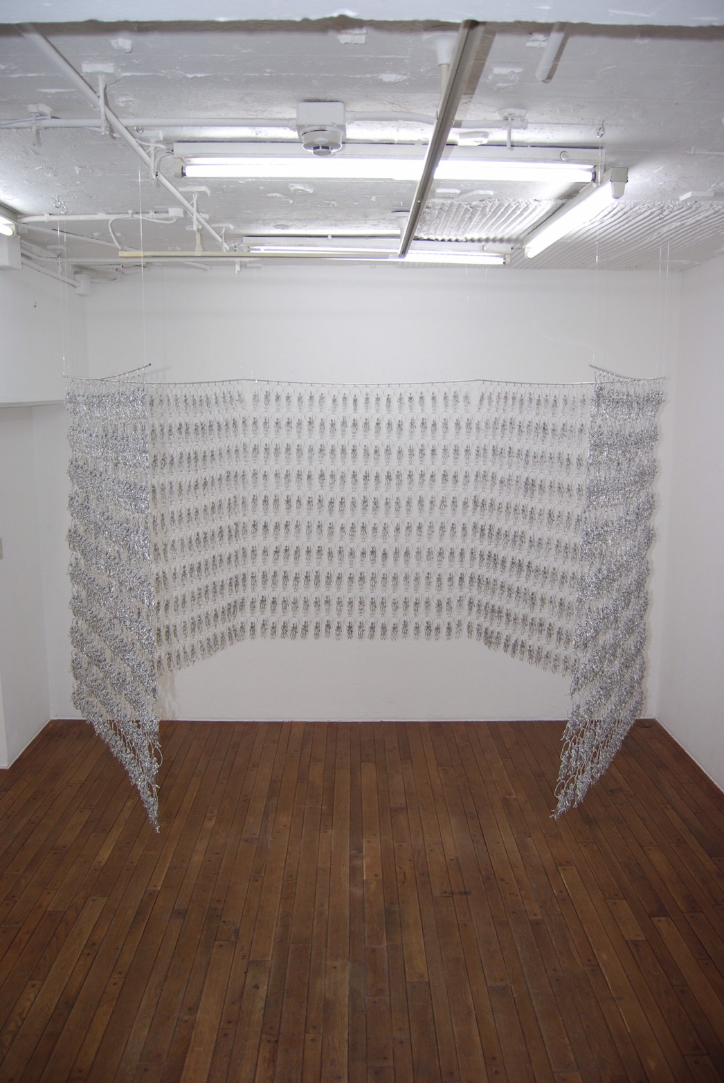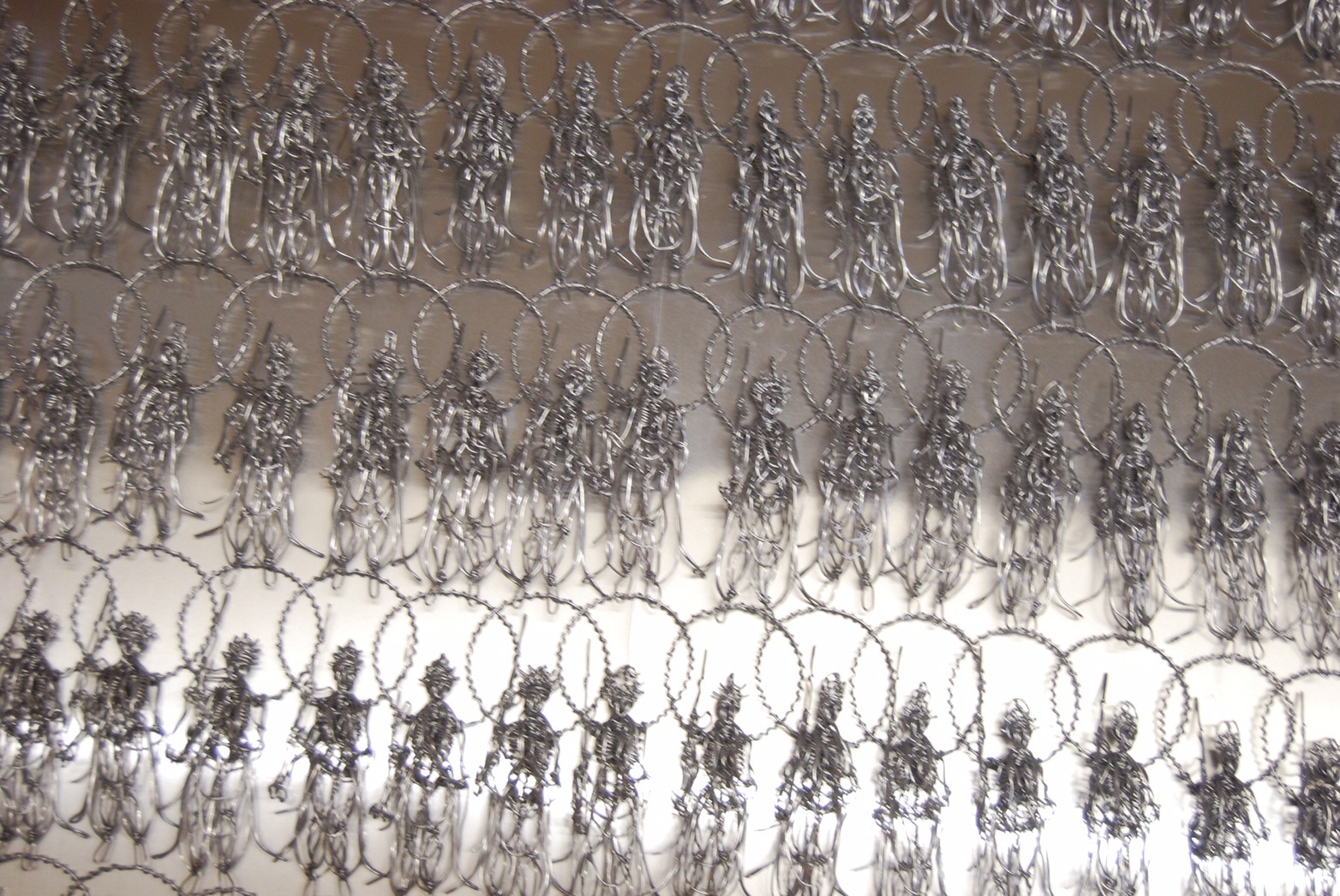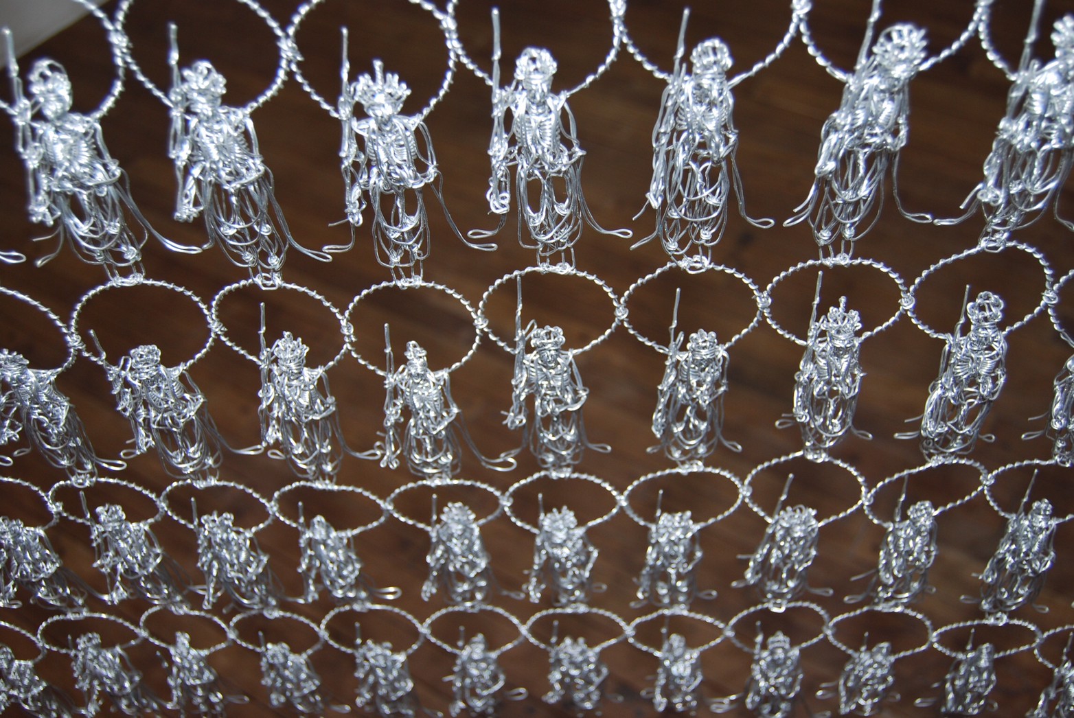 神の次は仏である。前作との繋がりであるのはたやすく想像できると思う。しかし発想の動機は小学生の修学旅行で行って以来、度々訪れた三十三間堂の千体仏を眼前にした時の感動と心の静寂感からである。ただ単純に、三十三間、横に広がる千体仏に囲まれてみたいと思った。仏の内にいる感覚を体験してみたかった。でも、つくる仏は戦隊仏、線体仏である。これも、昨年の「IESUS 」と同様、頭からつくるが、終わりは機関銃の銃口を少し切ることで終わる。1体1体同じものは無い。今回は塗装は行っていないアルミの地肌のままだ。空間に隠そうとはしなかった。自分がそれに囲まれ少しは隠れたかったのかもしれない。1体に使う針金の長さは3、3m。1体つくりあげる時間は1時間弱。つくる手順に法則は無いが、ほどいて行けばわかる。銃を携えた仏千体に囲まれた感覚は、さて如何ほどか?