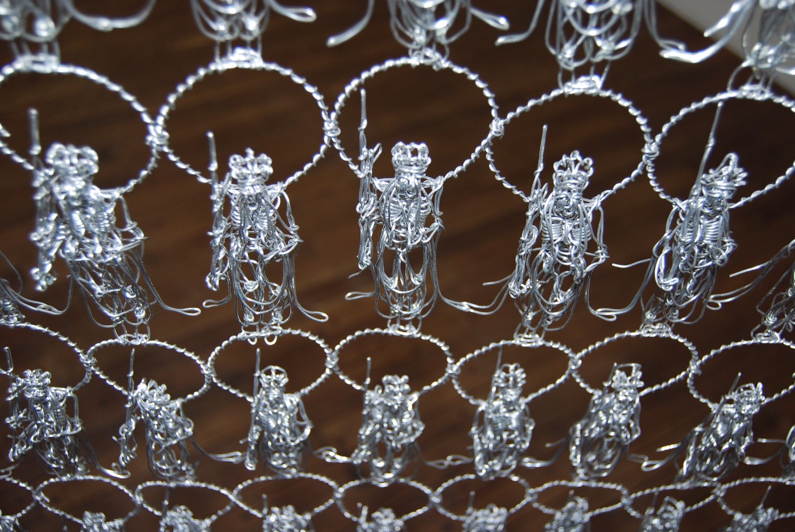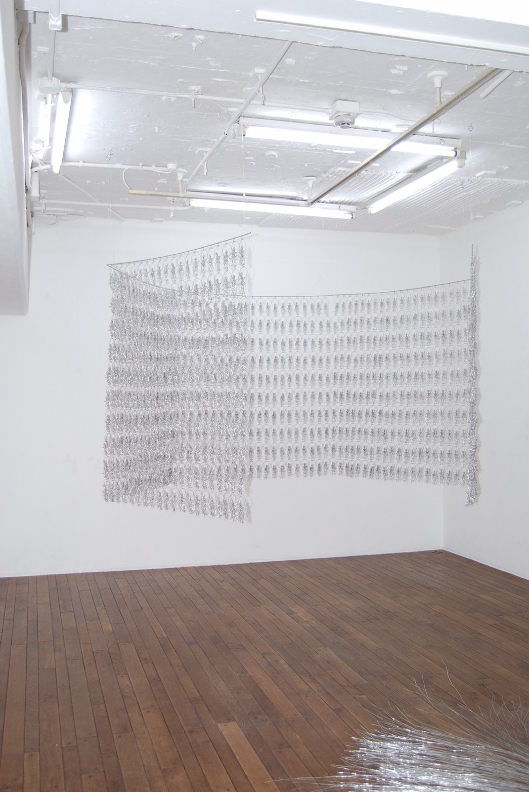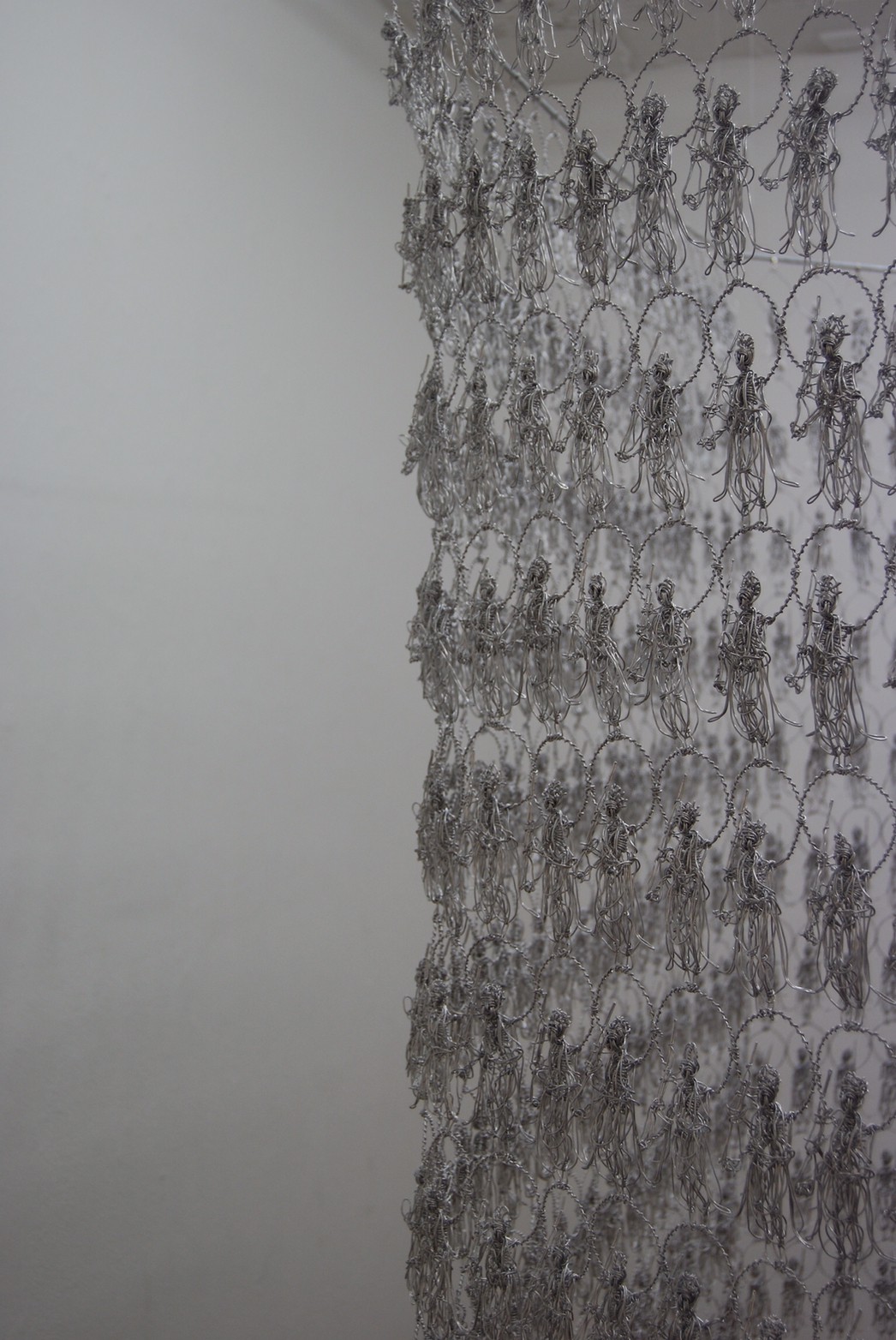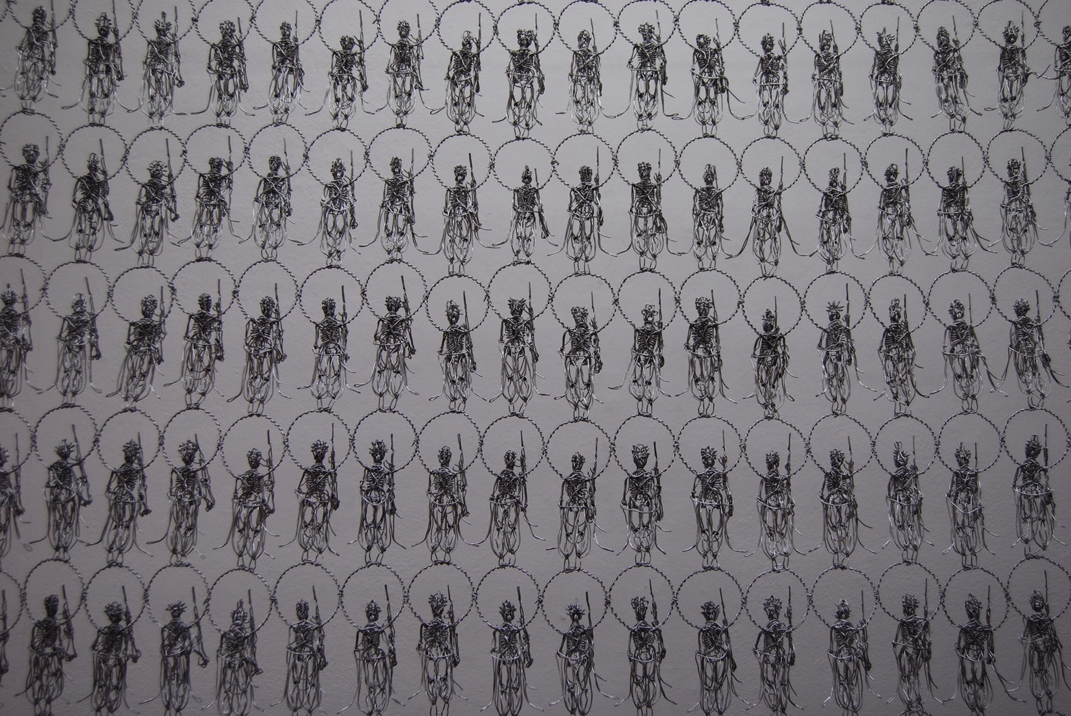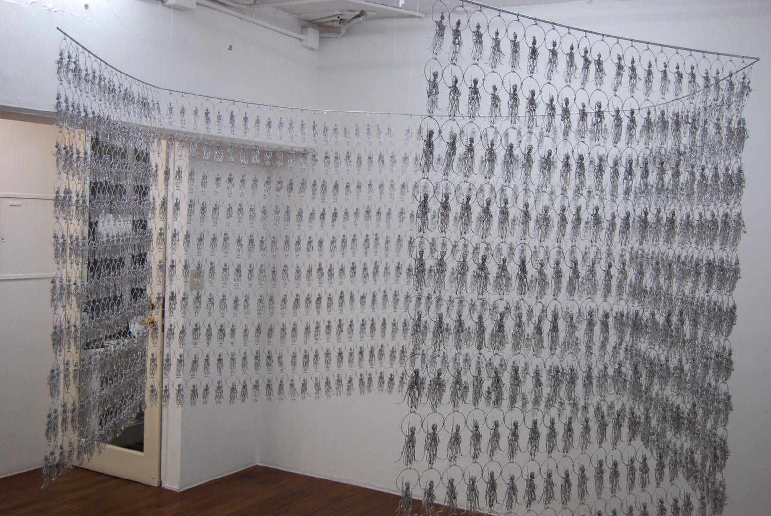 神の次は仏である。前作との繋がりであるのはたやすく想像できると思う。しかし発想の動機は小学生の修学旅行で行って以来、度々訪れた三十三間堂の千体仏を眼前にした時の感動と心の静寂感からである。ただ単純に、三十三間、横に広がる千体仏に囲まれてみたいと思った。仏の内にいる感覚を体験してみたかった。でも、つくる仏は戦隊仏、線体仏である。これも、昨年の「IESUS 」と同様、頭からつくるが、終わりは機関銃の銃口を少し切ることで終わる。1体1体同じものは無い。今回は塗装は行っていないアルミの地肌のままだ。空間に隠そうとはしなかった。自分がそれに囲まれ少しは隠れたかったのかもしれない。1体に使う針金の長さは3、3m。1体つくりあげる時間は1時間弱。つくる手順に法則は無いが、ほどいて行けばわかる。銃を携えた仏千体に囲まれた感覚は、さて如何ほどか?