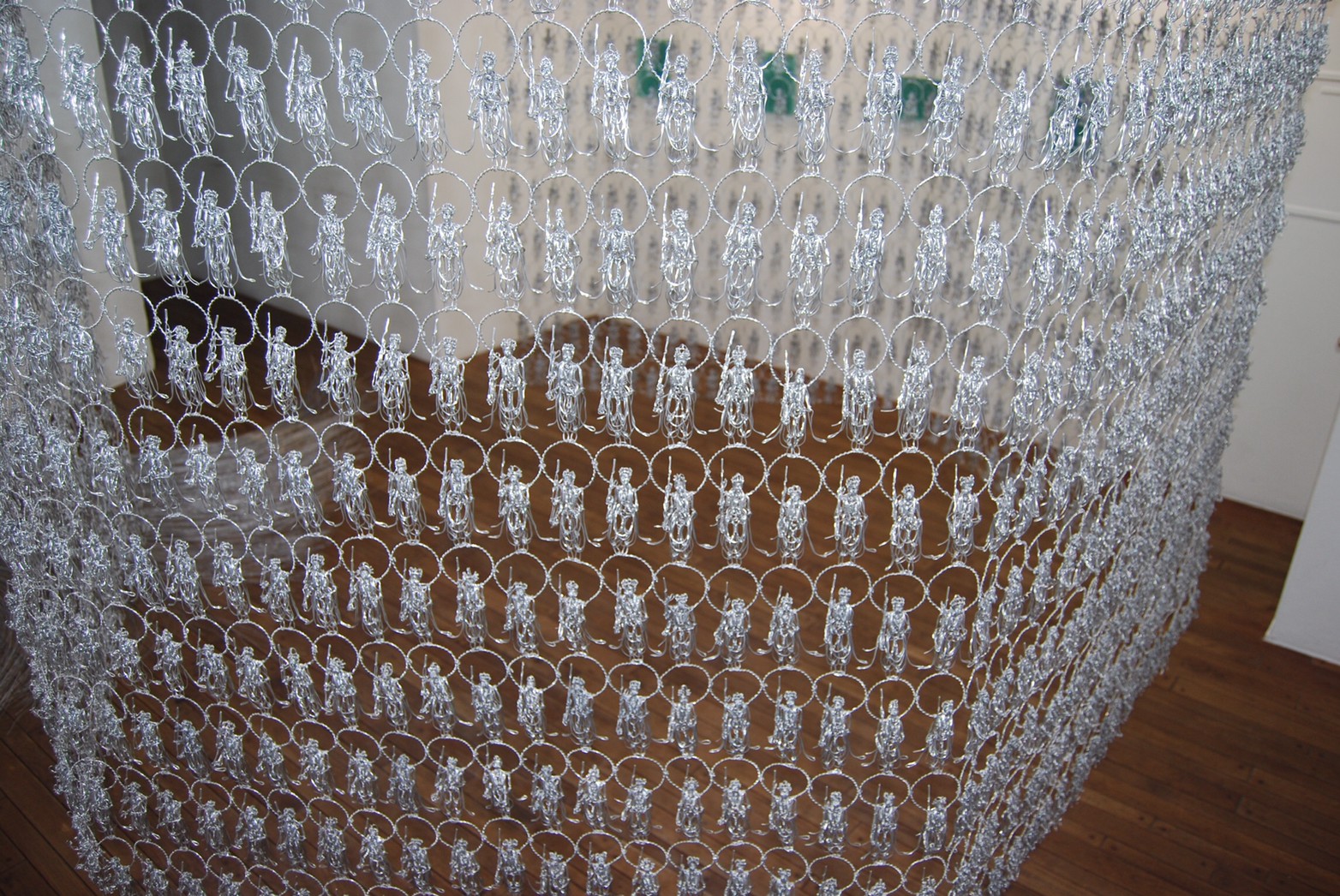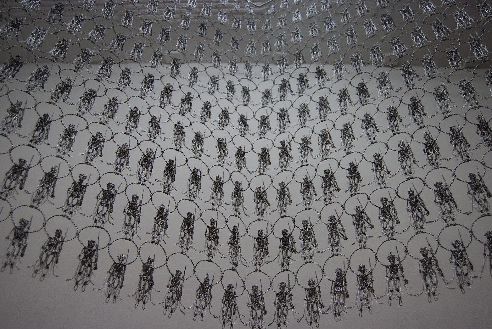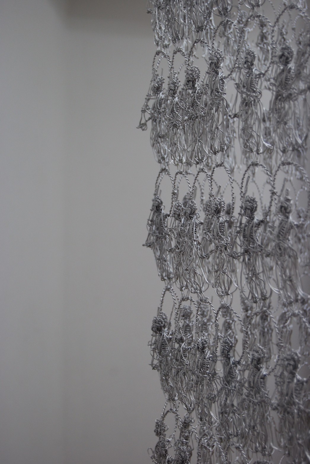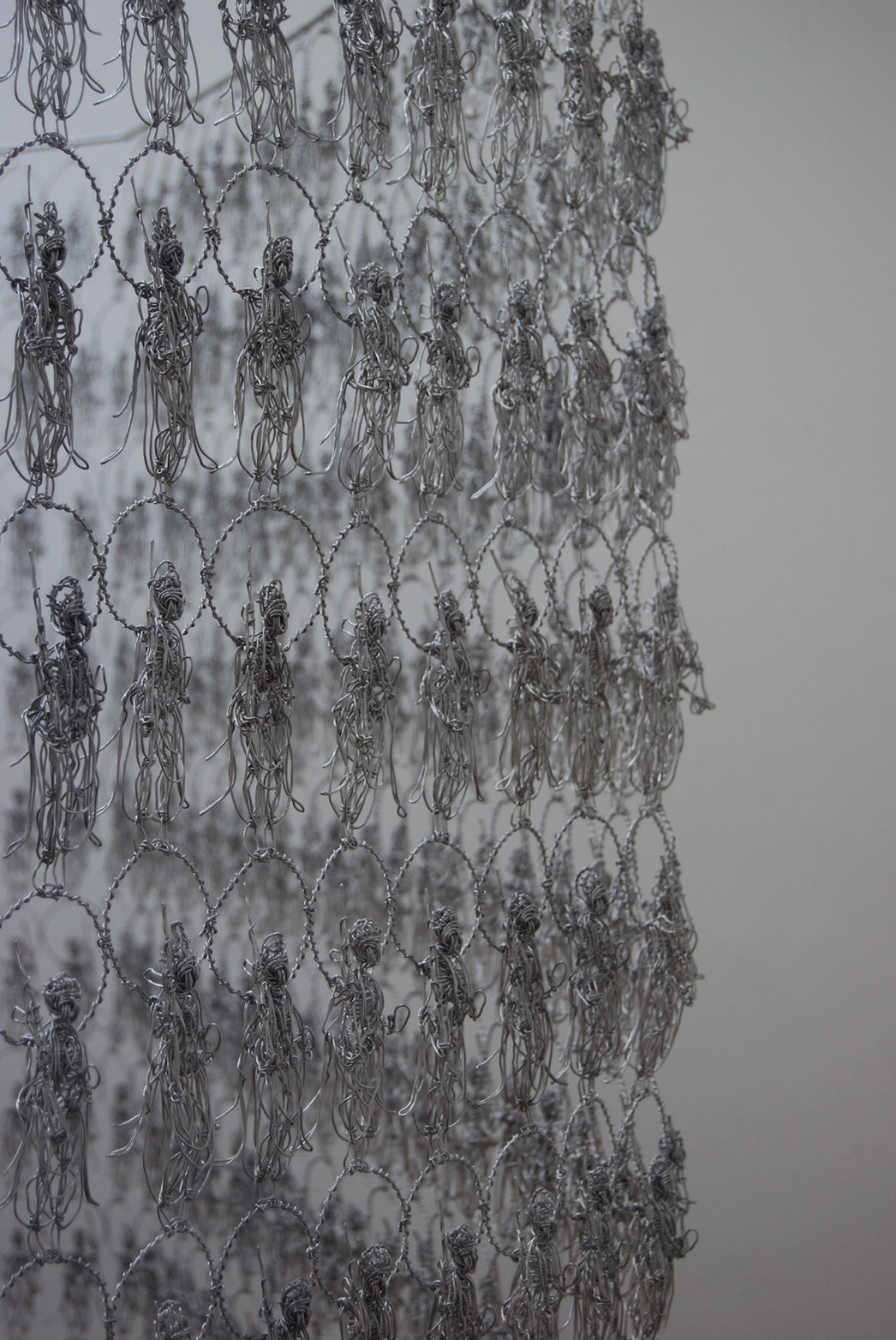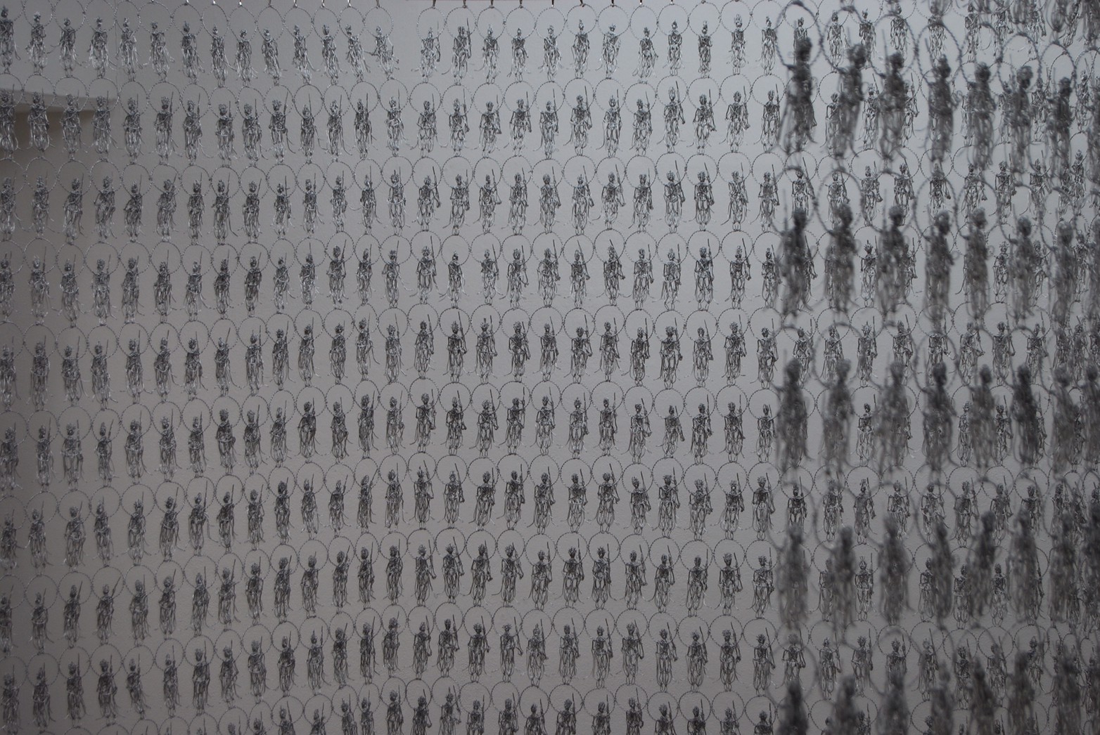 神の次は仏である。前作との繋がりであるのはたやすく想像できると思う。しかし発想の動機は小学生の修学旅行で行って以来、度々訪れた三十三間堂の千体仏を眼前にした時の感動と心の静寂感からである。ただ単純に、三十三間、横に広がる千体仏に囲まれてみたいと思った。仏の内にいる感覚を体験してみたかった。でも、つくる仏は戦隊仏、線体仏である。これも、昨年の「IESUS 」と同様、頭からつくるが、終わりは機関銃の銃口を少し切ることで終わる。1体1体同じものは無い。今回は塗装は行っていないアルミの地肌のままだ。空間に隠そうとはしなかった。自分がそれに囲まれ少しは隠れたかったのかもしれない。1体に使う針金の長さは3、3m。1体つくりあげる時間は1時間弱。つくる手順に法則は無いが、ほどいて行けばわかる。銃を携えた仏千体に囲まれた感覚は、さて如何ほどか?