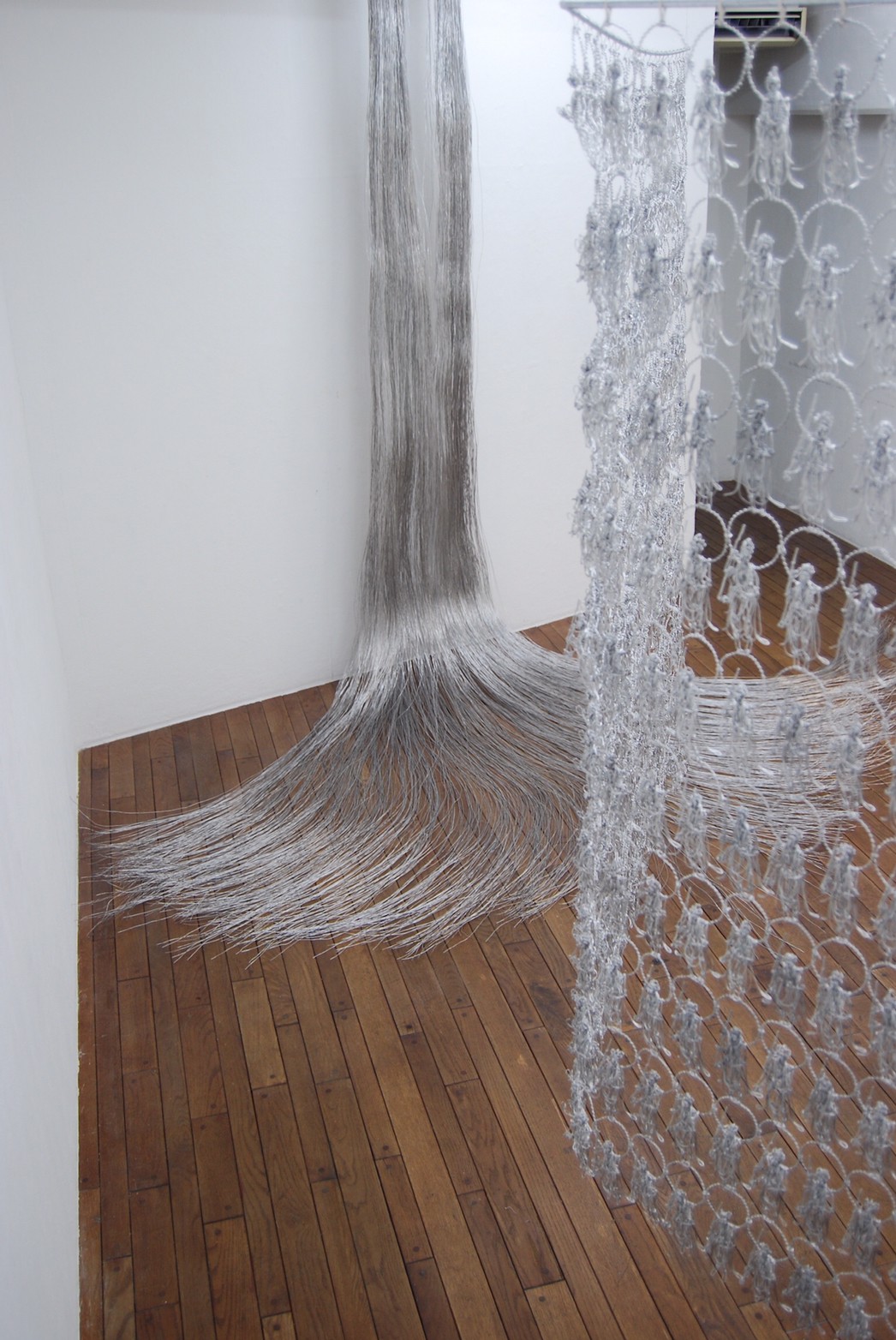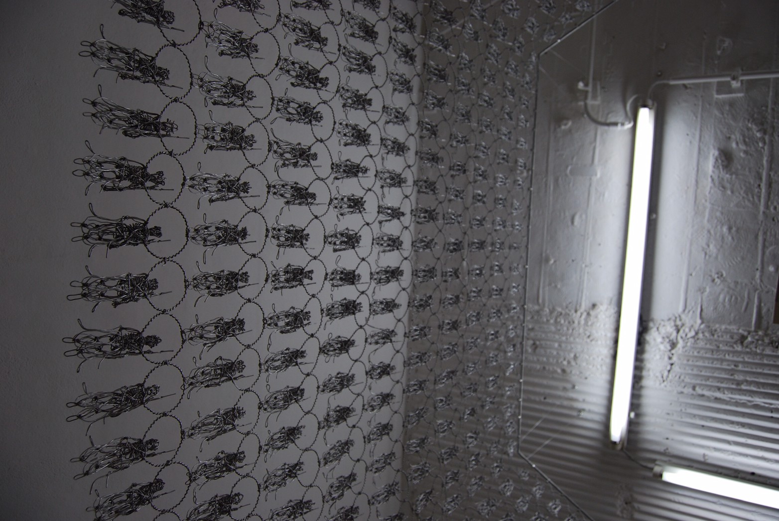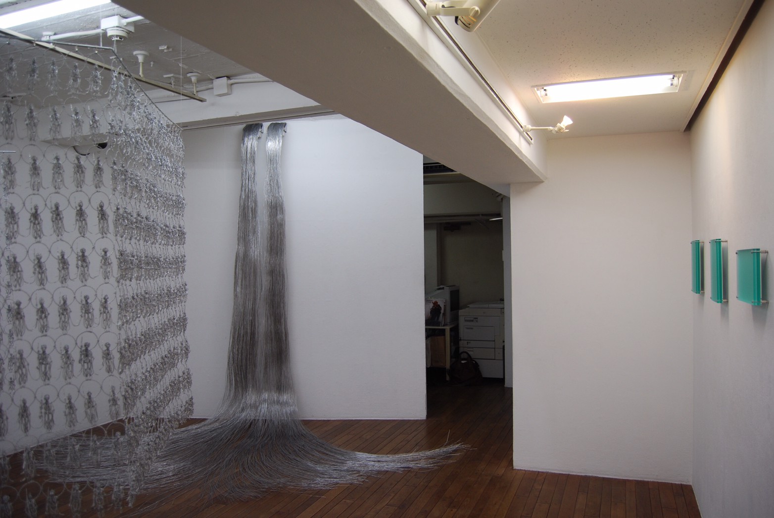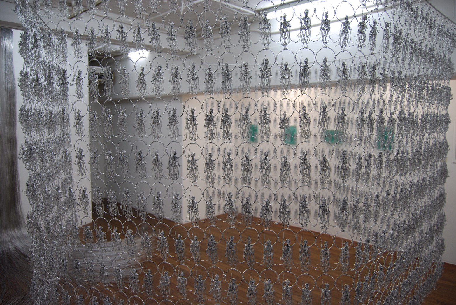 神の次は仏である。前作との繋がりであるのはたやすく想像できると思う。しかし発想の動機は小学生の修学旅行で行って以来、度々訪れた三十三間堂の千体仏を眼前にした時の感動と心の静寂感からである。ただ単純に、三十三間、横に広がる千体仏に囲まれてみたいと思った。仏の内にいる感覚を体験してみたかった。でも、つくる仏は戦隊仏、線体仏である。これも、昨年の「IESUS 」と同様、頭からつくるが、終わりは機関銃の銃口を少し切ることで終わる。1体1体同じものは無い。今回は塗装は行っていないアルミの地肌のままだ。空間に隠そうとはしなかった。自分がそれに囲まれ少しは隠れたかったのかもしれない。1体に使う針金の長さは3、3m。1体つくりあげる時間は1時間弱。つくる手順に法則は無いが、ほどいて行けばわかる。銃を携えた仏千体に囲まれた感覚は、さて如何ほどか?