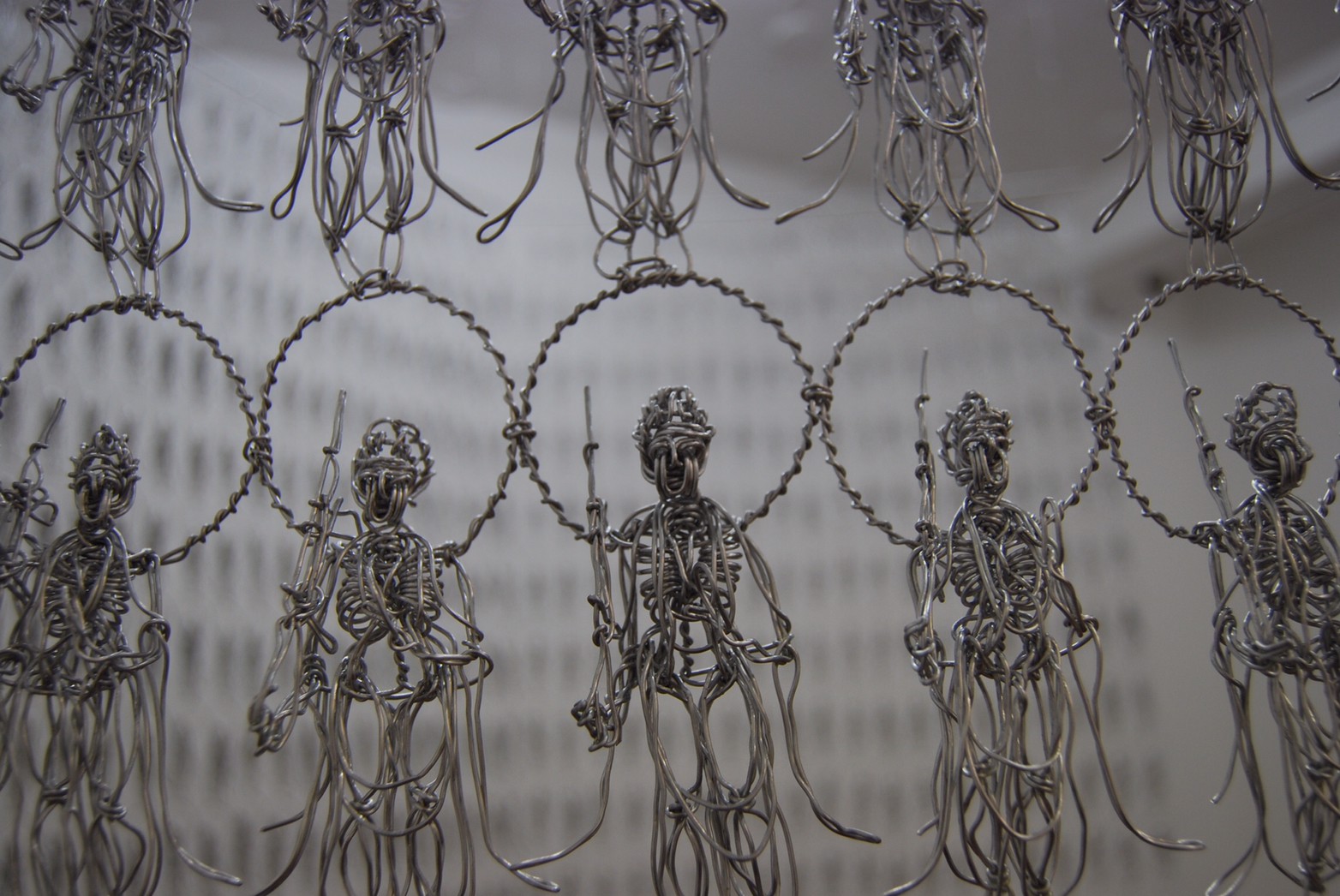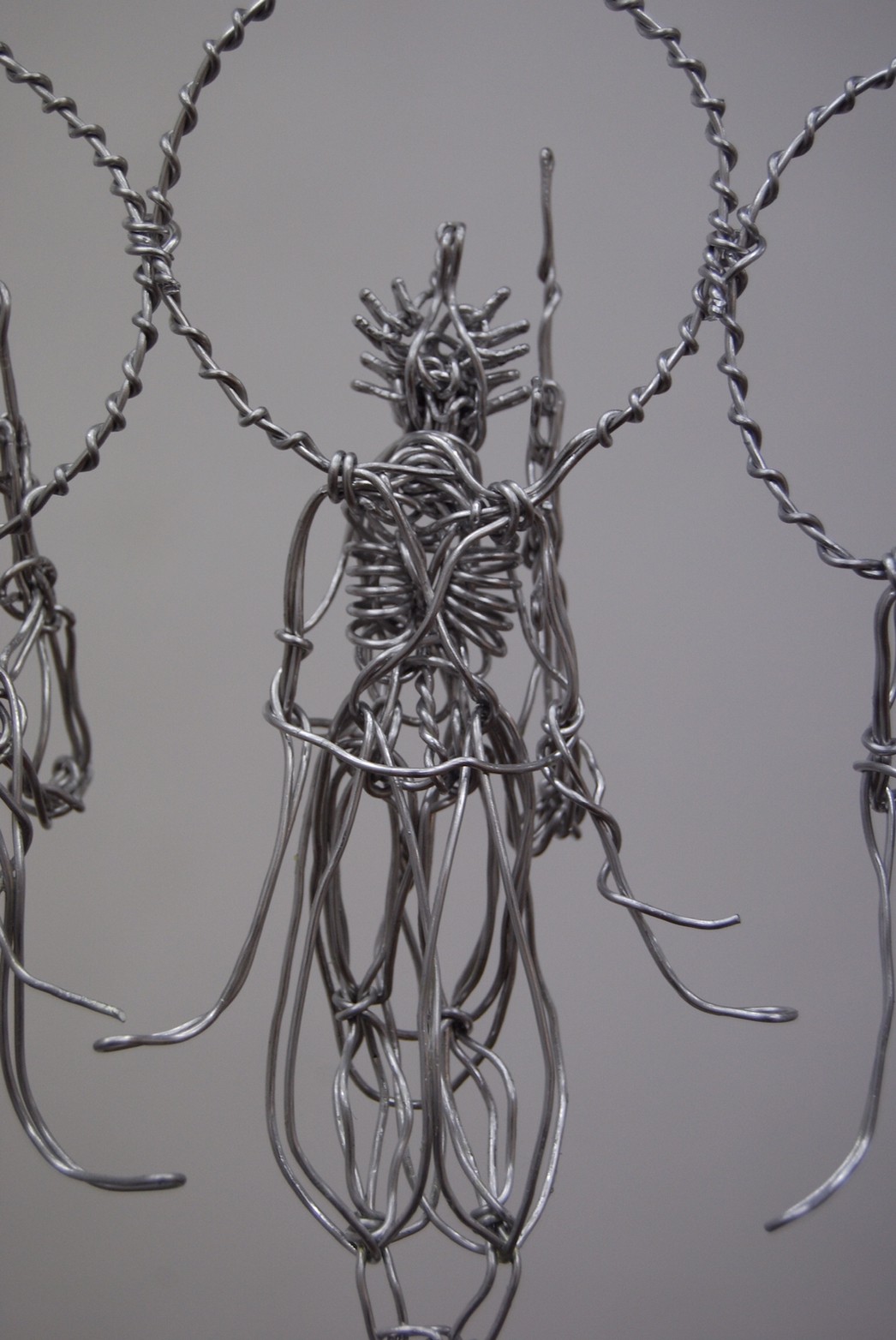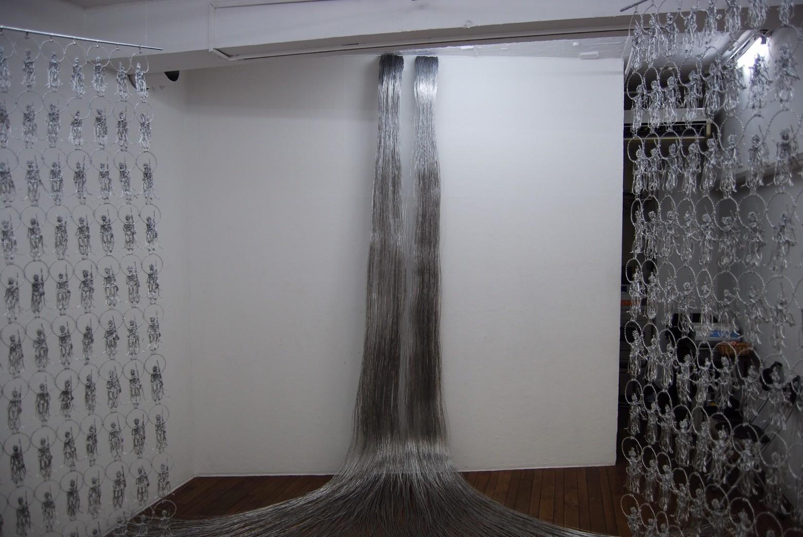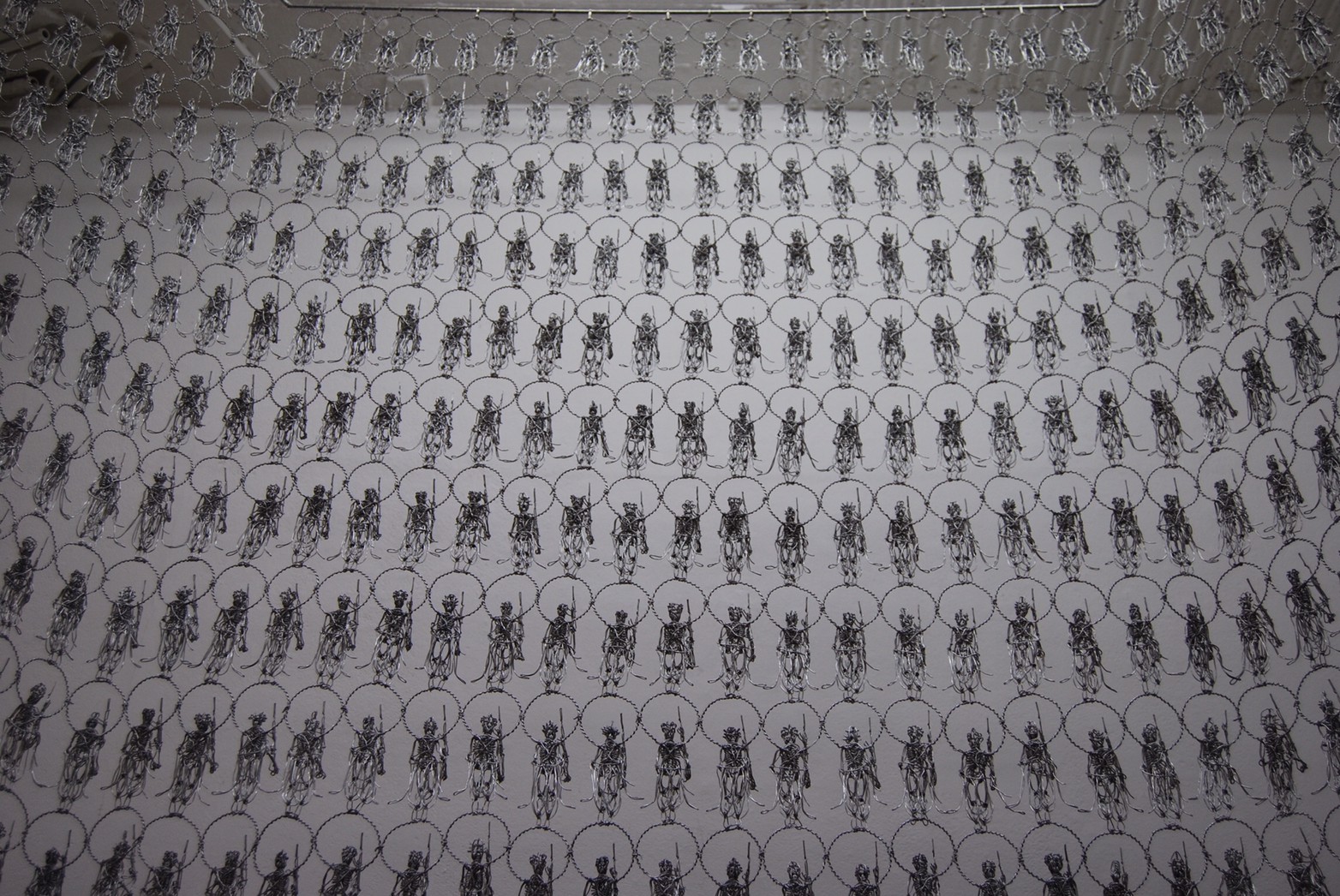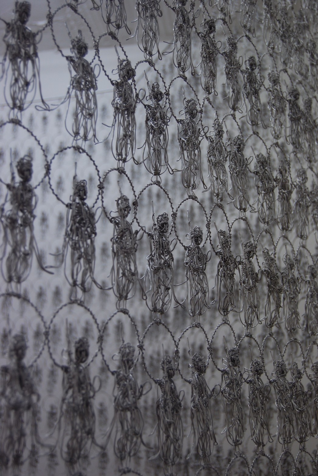 神の次は仏である。前作との繋がりであるのはたやすく想像できると思う。しかし発想の動機は小学生の修学旅行で行って以来、度々訪れた三十三間堂の千体仏を眼前にした時の感動と心の静寂感からである。ただ単純に、三十三間、横に広がる千体仏に囲まれてみたいと思った。仏の内にいる感覚を体験してみたかった。でも、つくる仏は戦隊仏、線体仏である。これも、昨年の「IESUS 」と同様、頭からつくるが、終わりは機関銃の銃口を少し切ることで終わる。1体1体同じものは無い。今回は塗装は行っていないアルミの地肌のままだ。空間に隠そうとはしなかった。自分がそれに囲まれ少しは隠れたかったのかもしれない。1体に使う針金の長さは3、3m。1体つくりあげる時間は1時間弱。つくる手順に法則は無いが、ほどいて行けばわかる。銃を携えた仏千体に囲まれた感覚は、さて如何ほどか?