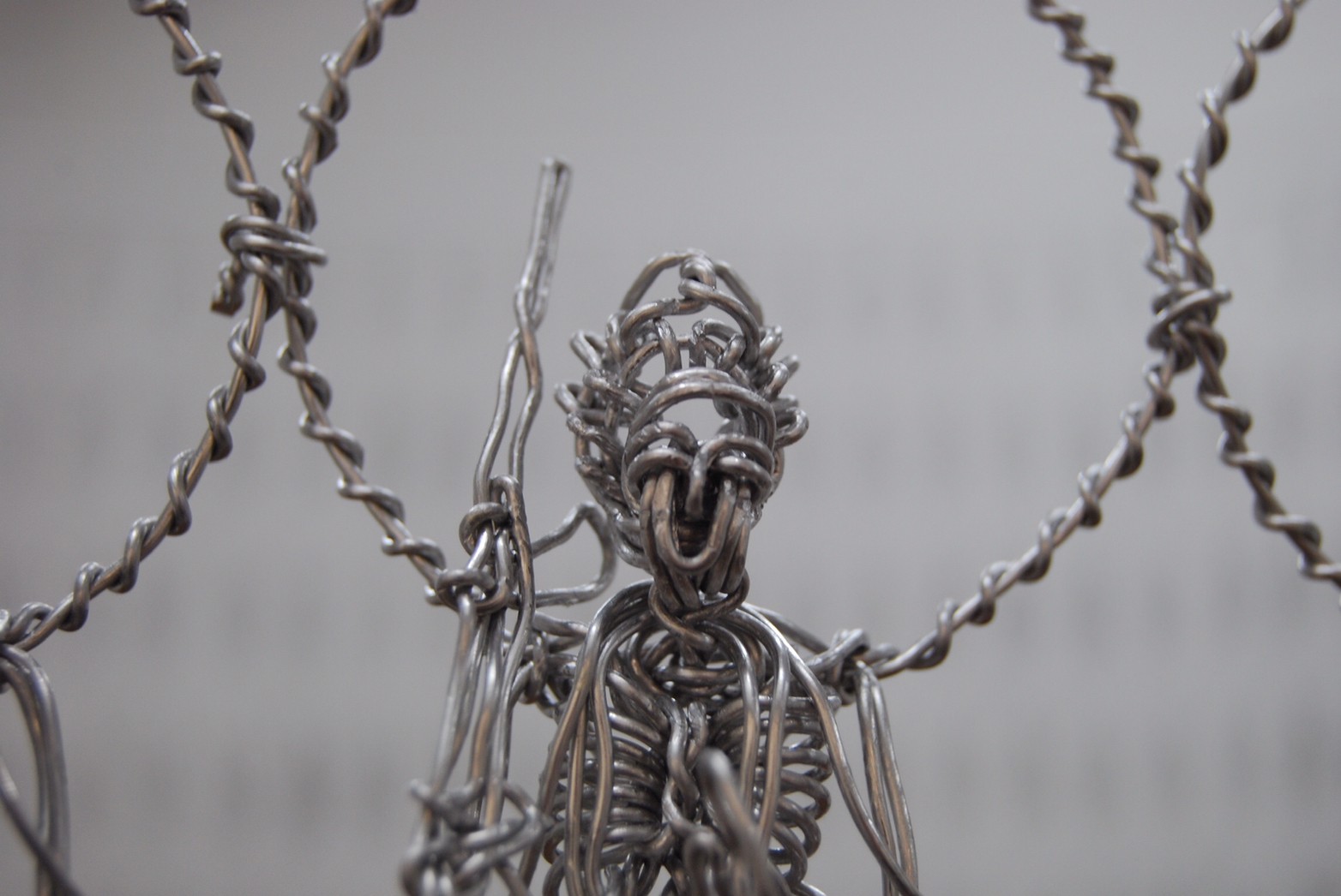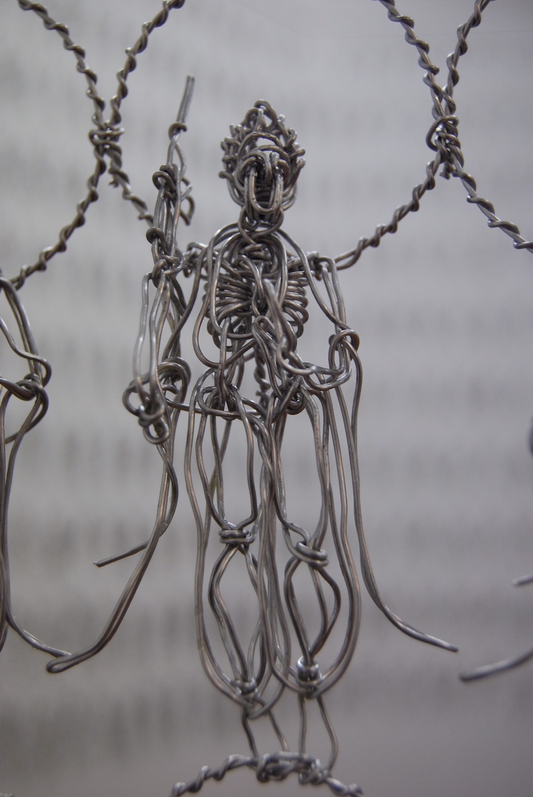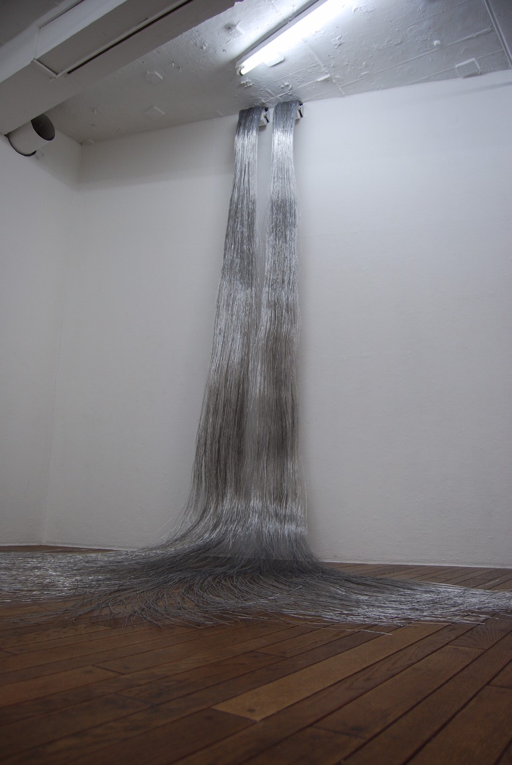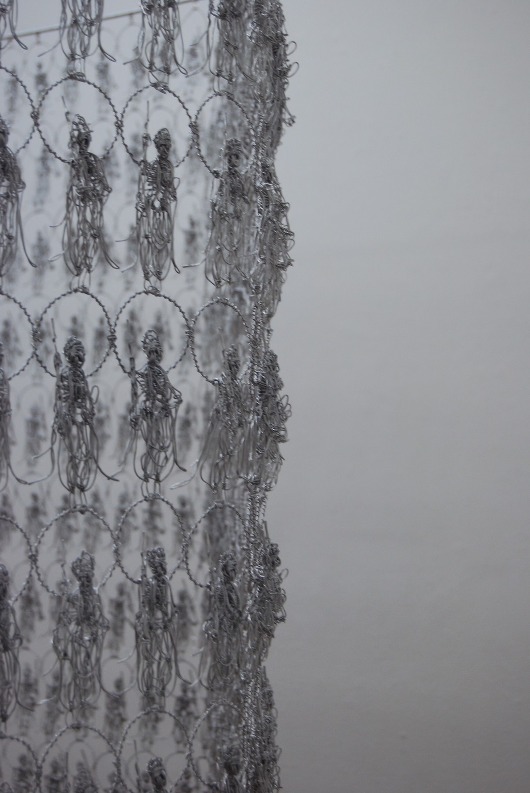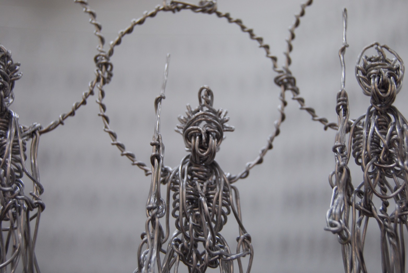 神の次は仏である。前作との繋がりであるのはたやすく想像できると思う。しかし発想の動機は小学生の修学旅行で行って以来、度々訪れた三十三間堂の千体仏を眼前にした時の感動と心の静寂感からである。ただ単純に、三十三間、横に広がる千体仏に囲まれてみたいと思った。仏の内にいる感覚を体験してみたかった。でも、つくる仏は戦隊仏、線体仏である。これも、昨年の「IESUS 」と同様、頭からつくるが、終わりは機関銃の銃口を少し切ることで終わる。1体1体同じものは無い。今回は塗装は行っていないアルミの地肌のままだ。空間に隠そうとはしなかった。自分がそれに囲まれ少しは隠れたかったのかもしれない。1体に使う針金の長さは3、3m。1体つくりあげる時間は1時間弱。つくる手順に法則は無いが、ほどいて行けばわかる。銃を携えた仏千体に囲まれた感覚は、さて如何ほどか?
