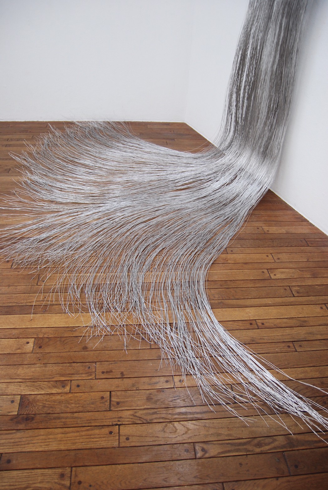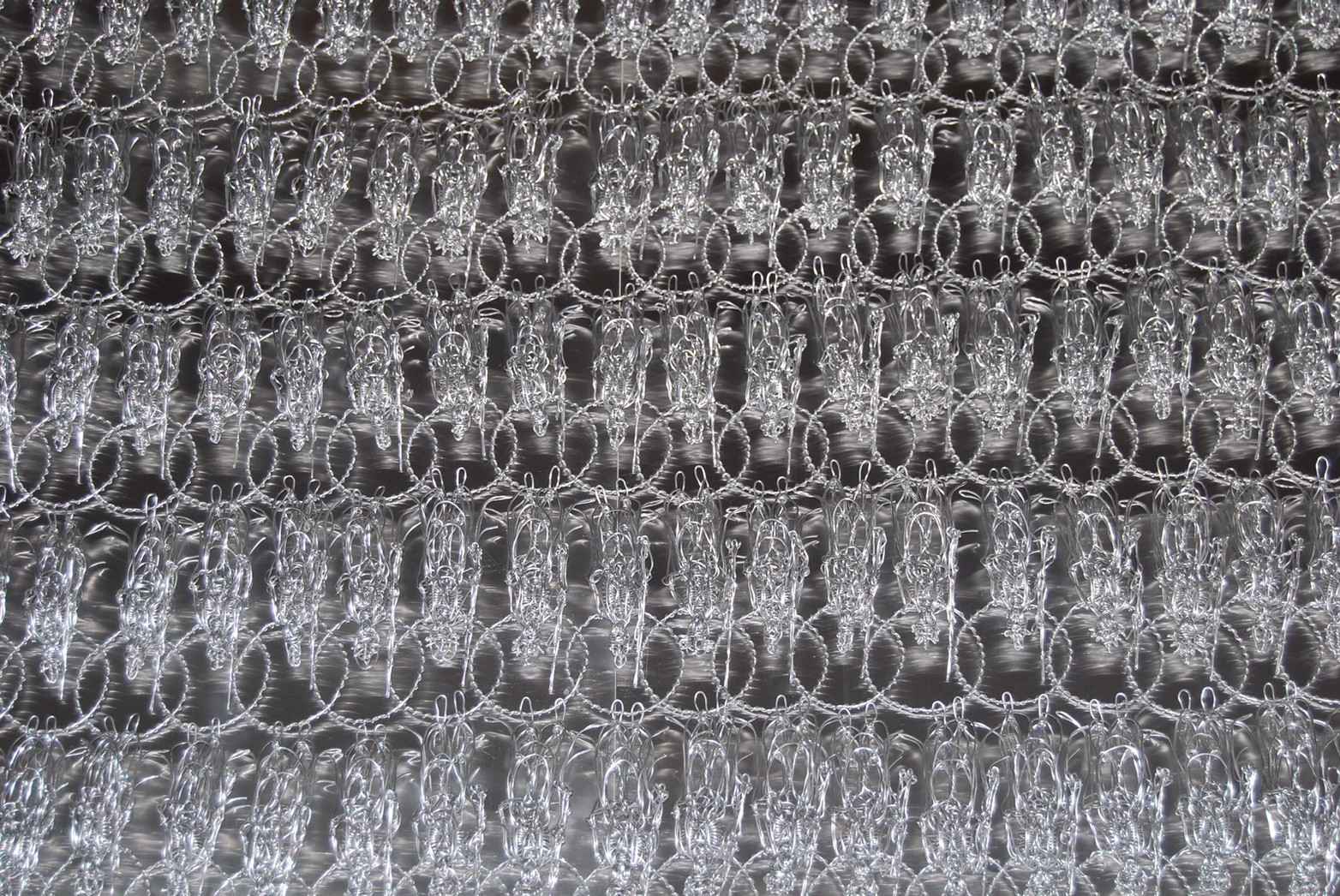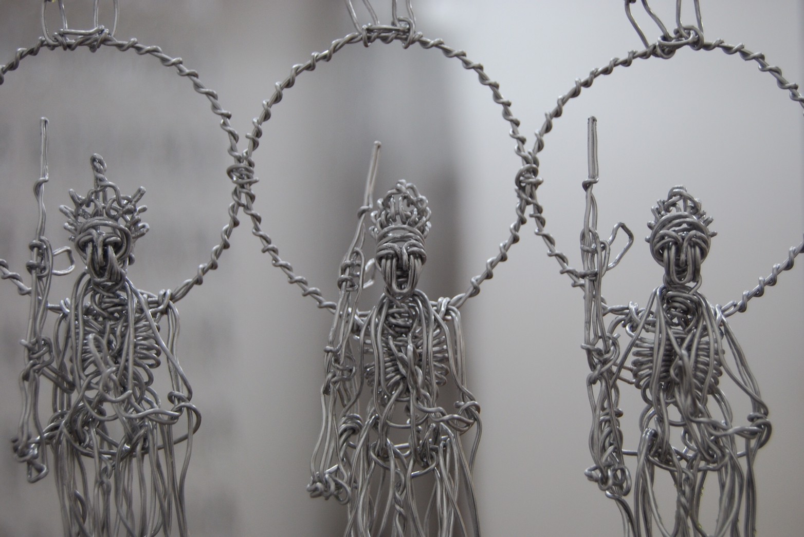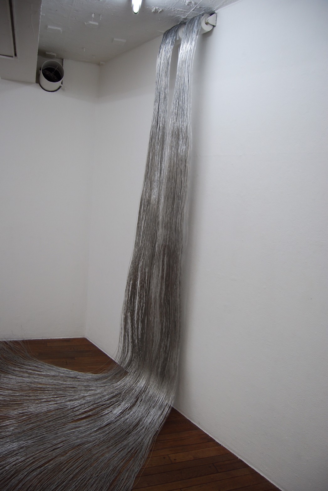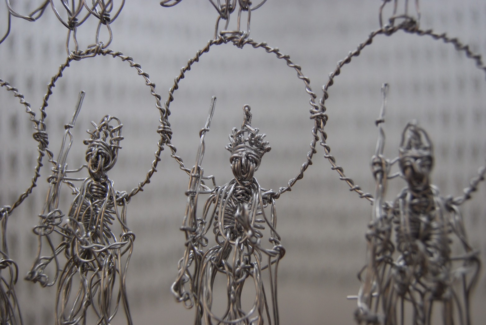 神の次は仏である。前作との繋がりであるのはたやすく想像できると思う。しかし発想の動機は小学生の修学旅行で行って以来、度々訪れた三十三間堂の千体仏を眼前にした時の感動と心の静寂感からである。ただ単純に、三十三間、横に広がる千体仏に囲まれてみたいと思った。仏の内にいる感覚を体験してみたかった。でも、つくる仏は戦隊仏、線体仏である。これも、昨年の「IESUS 」と同様、頭からつくるが、終わりは機関銃の銃口を少し切ることで終わる。1体1体同じものは無い。今回は塗装は行っていないアルミの地肌のままだ。空間に隠そうとはしなかった。自分がそれに囲まれ少しは隠れたかったのかもしれない。1体に使う針金の長さは3、3m。1体つくりあげる時間は1時間弱。つくる手順に法則は無いが、ほどいて行けばわかる。銃を携えた仏千体に囲まれた感覚は、さて如何ほどか?