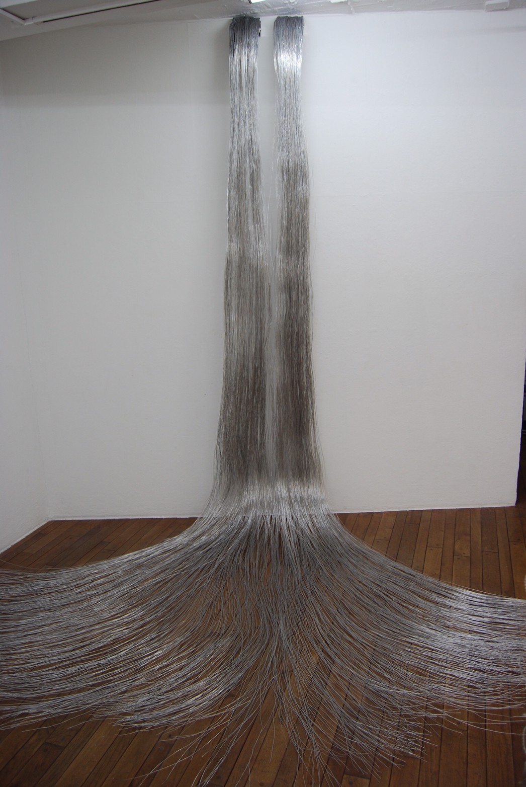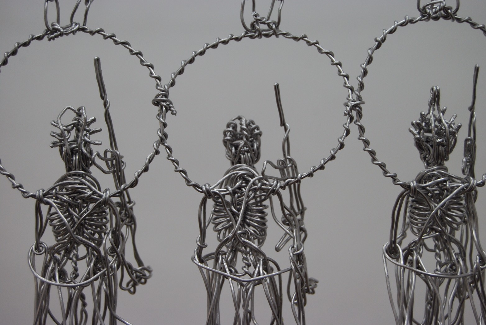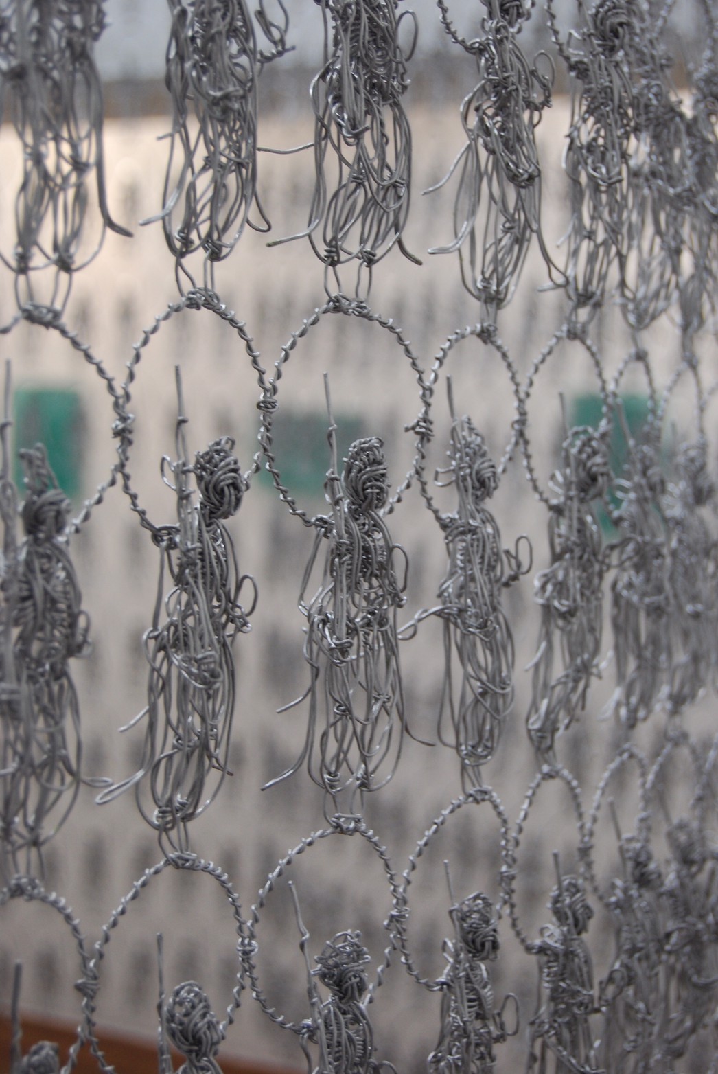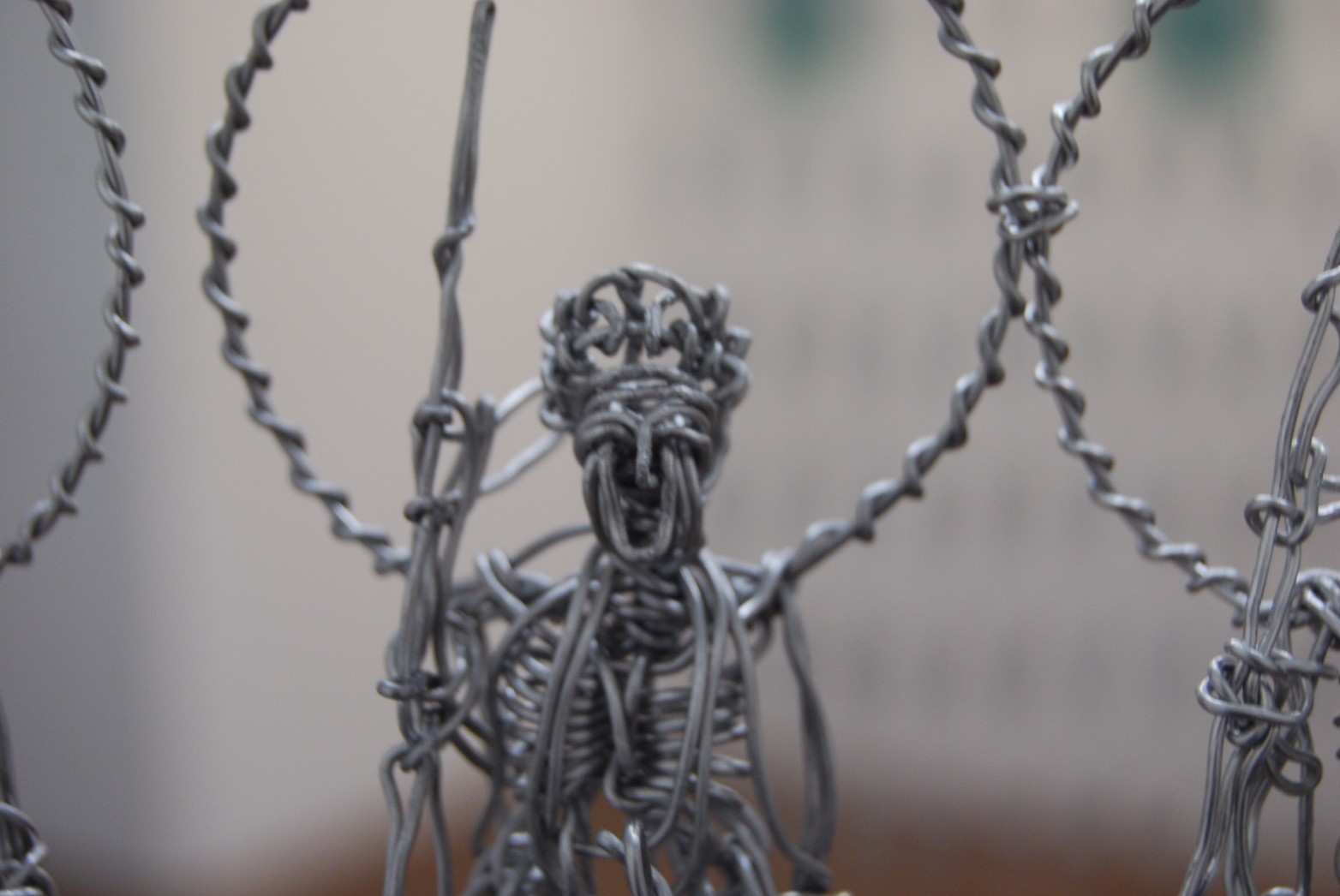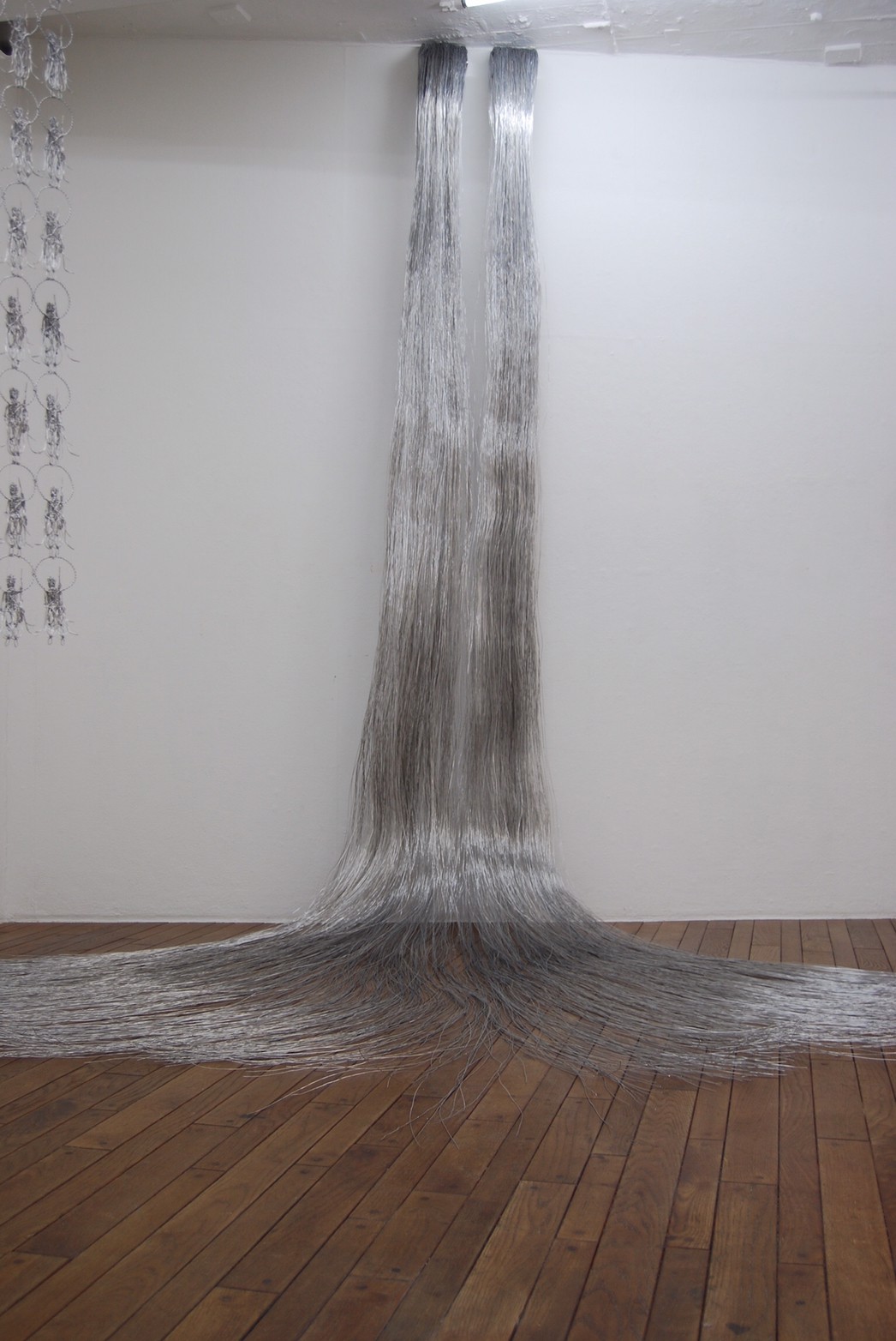 神の次は仏である。前作との繋がりであるのはたやすく想像できると思う。しかし発想の動機は小学生の修学旅行で行って以来、度々訪れた三十三間堂の千体仏を眼前にした時の感動と心の静寂感からである。ただ単純に、三十三間、横に広がる千体仏に囲まれてみたいと思った。仏の内にいる感覚を体験してみたかった。でも、つくる仏は戦隊仏、線体仏である。これも、昨年の「IESUS 」と同様、頭からつくるが、終わりは機関銃の銃口を少し切ることで終わる。1体1体同じものは無い。今回は塗装は行っていないアルミの地肌のままだ。空間に隠そうとはしなかった。自分がそれに囲まれ少しは隠れたかったのかもしれない。1体に使う針金の長さは3、3m。1体つくりあげる時間は1時間弱。つくる手順に法則は無いが、ほどいて行けばわかる。銃を携えた仏千体に囲まれた感覚は、さて如何ほどか?