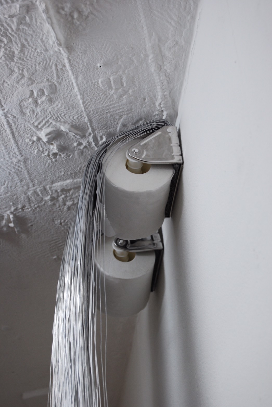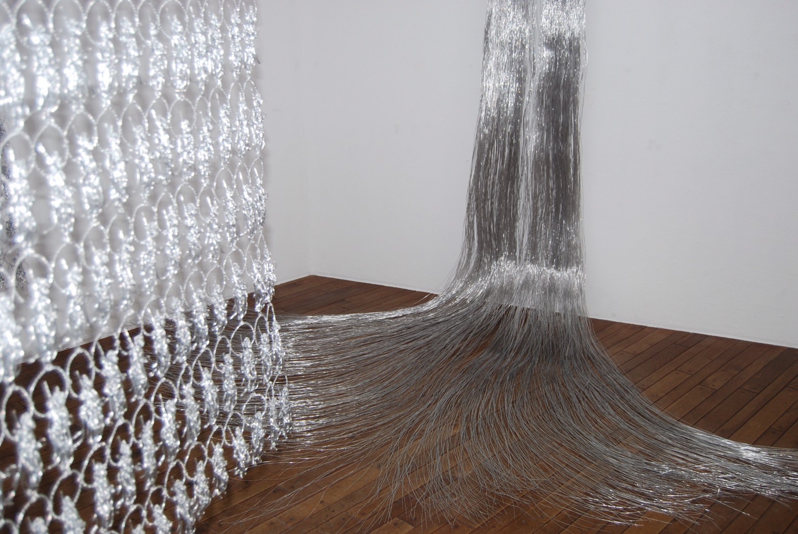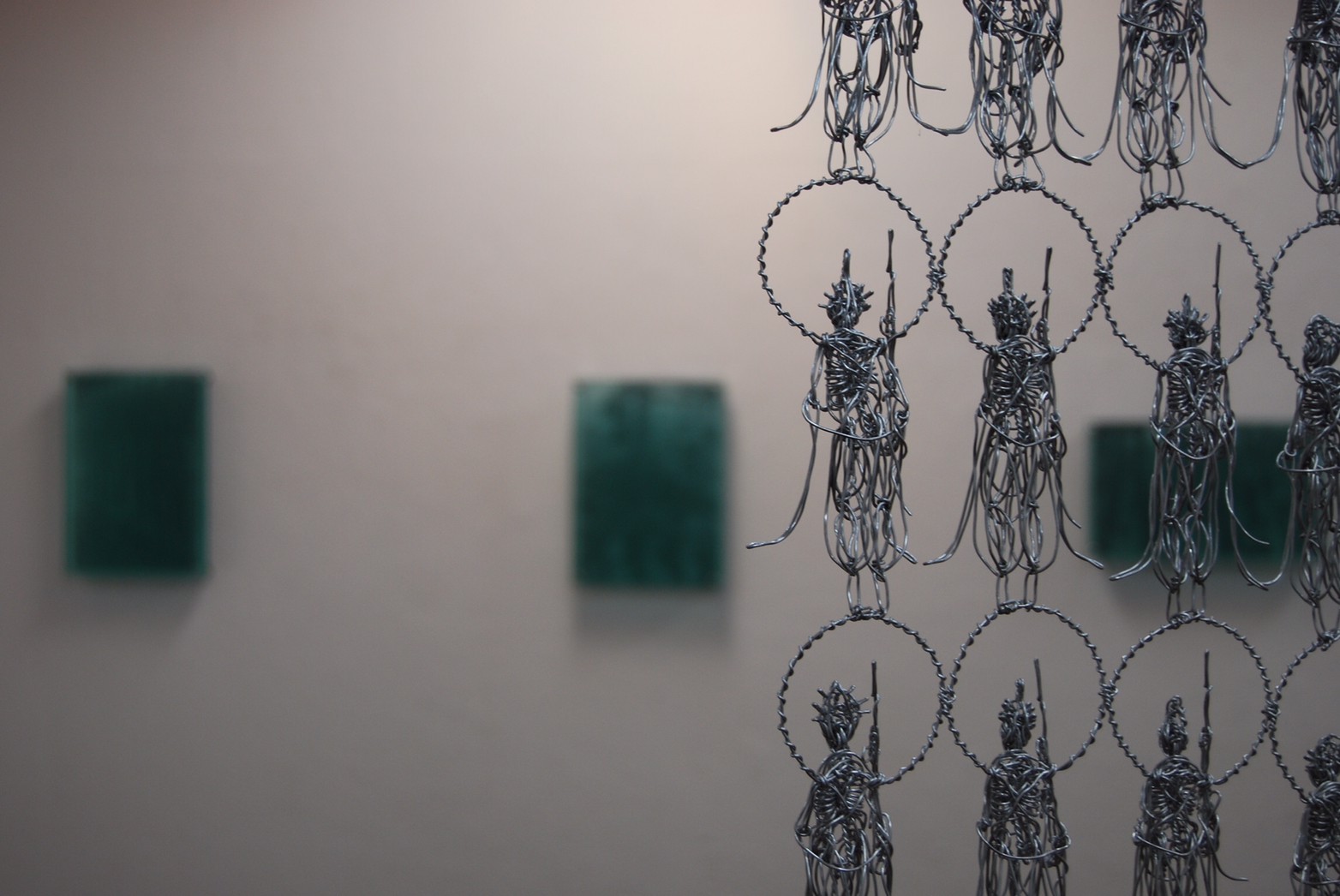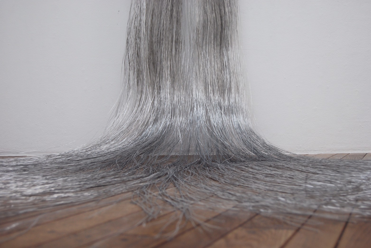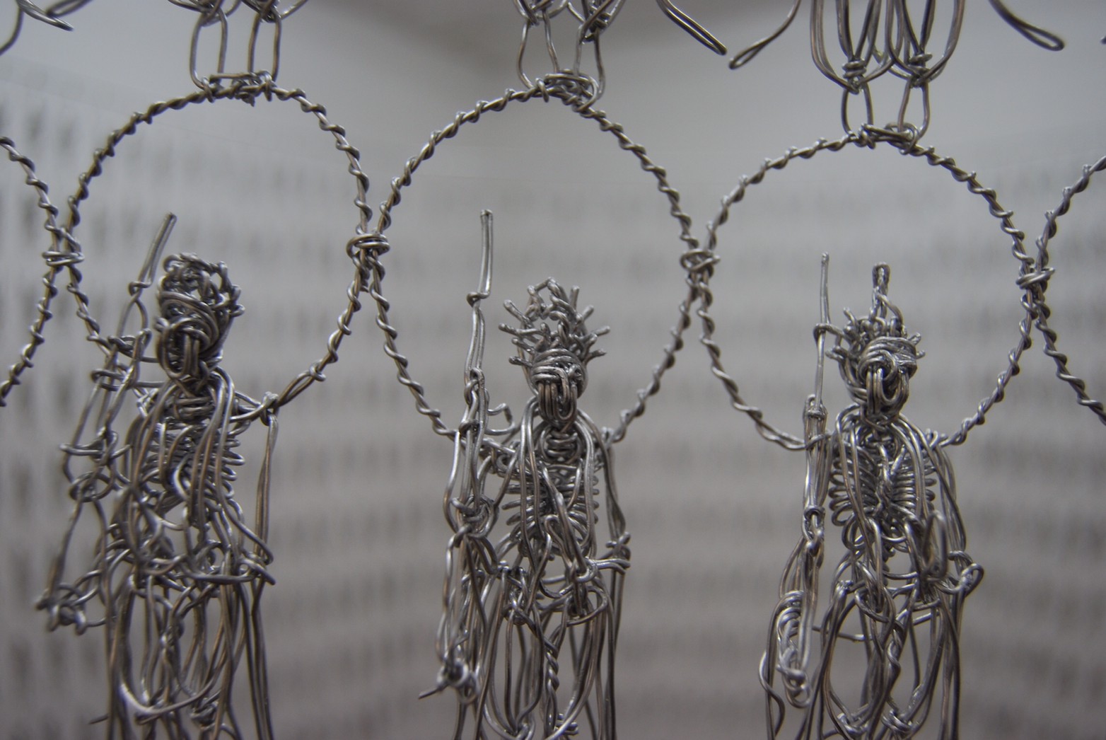 神の次は仏である。前作との繋がりであるのはたやすく想像できると思う。しかし発想の動機は小学生の修学旅行で行って以来、度々訪れた三十三間堂の千体仏を眼前にした時の感動と心の静寂感からである。ただ単純に、三十三間、横に広がる千体仏に囲まれてみたいと思った。仏の内にいる感覚を体験してみたかった。でも、つくる仏は戦隊仏、線体仏である。これも、昨年の「IESUS 」と同様、頭からつくるが、終わりは機関銃の銃口を少し切ることで終わる。1体1体同じものは無い。今回は塗装は行っていないアルミの地肌のままだ。空間に隠そうとはしなかった。自分がそれに囲まれ少しは隠れたかったのかもしれない。1体に使う針金の長さは3、3m。1体つくりあげる時間は1時間弱。つくる手順に法則は無いが、ほどいて行けばわかる。銃を携えた仏千体に囲まれた感覚は、さて如何ほどか?