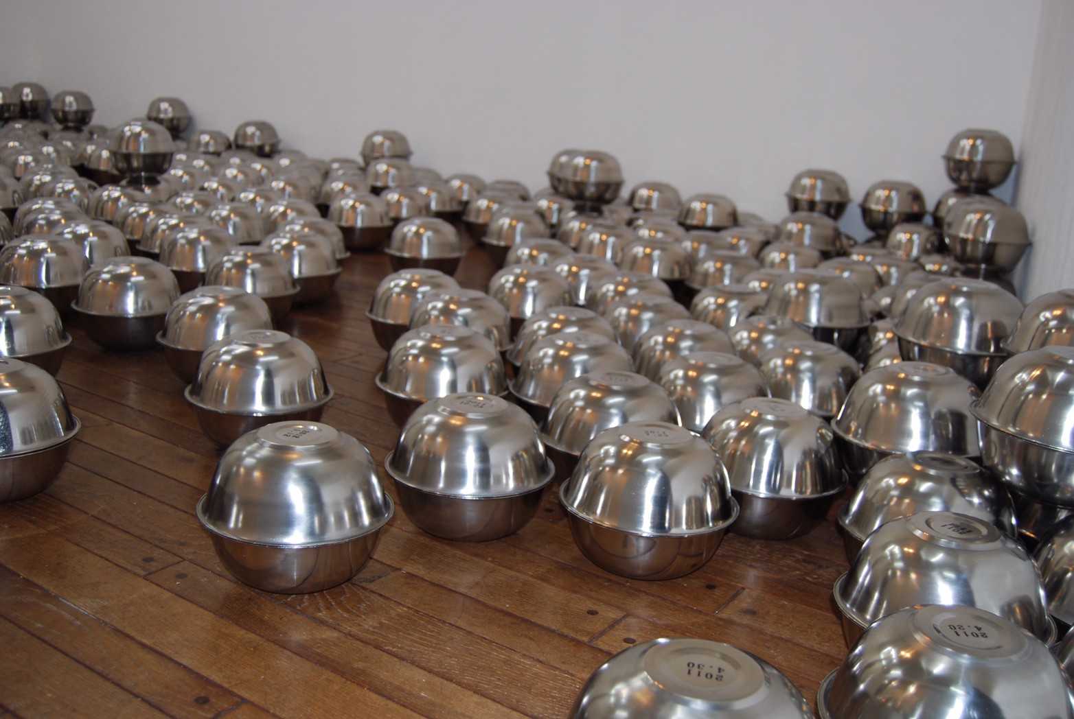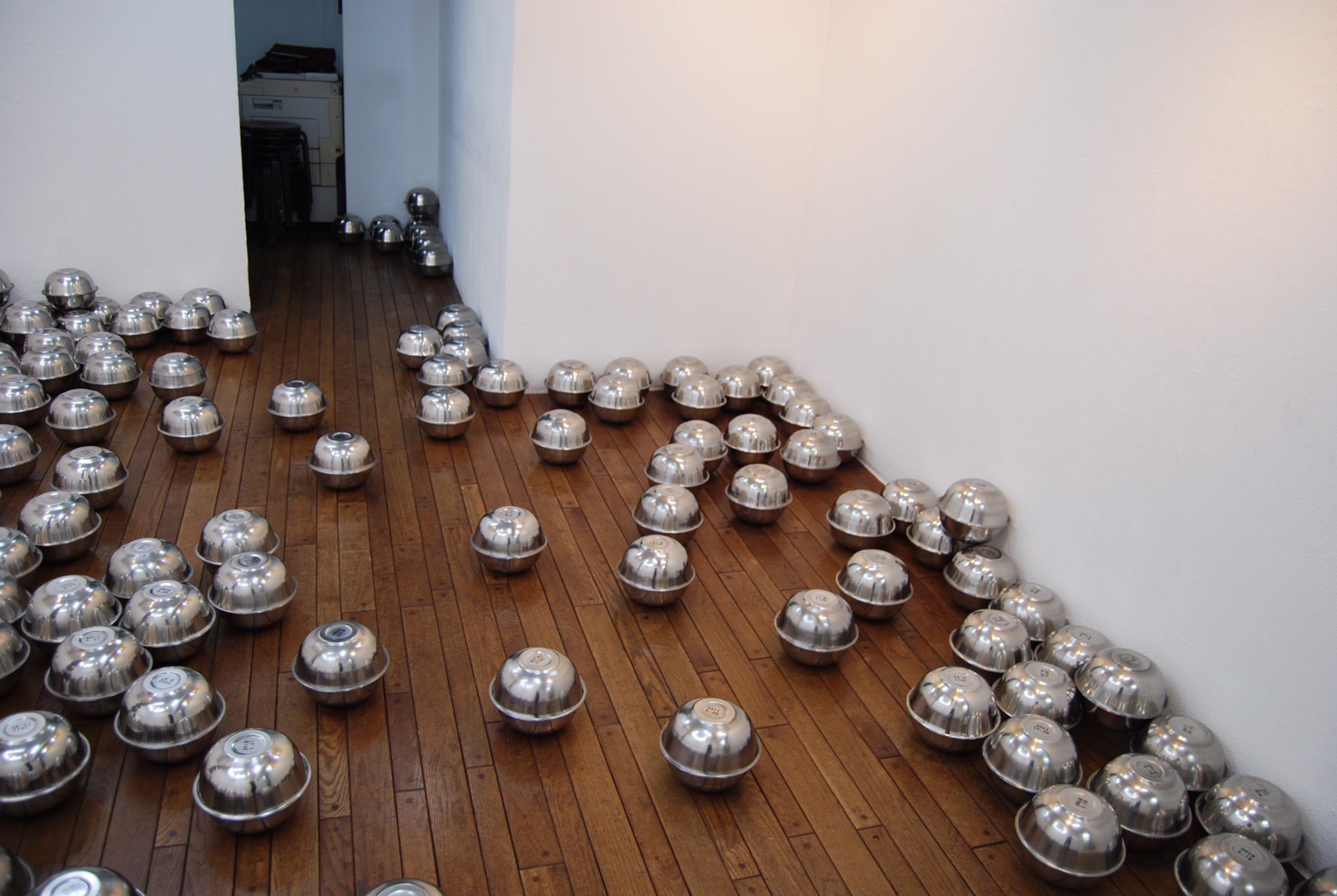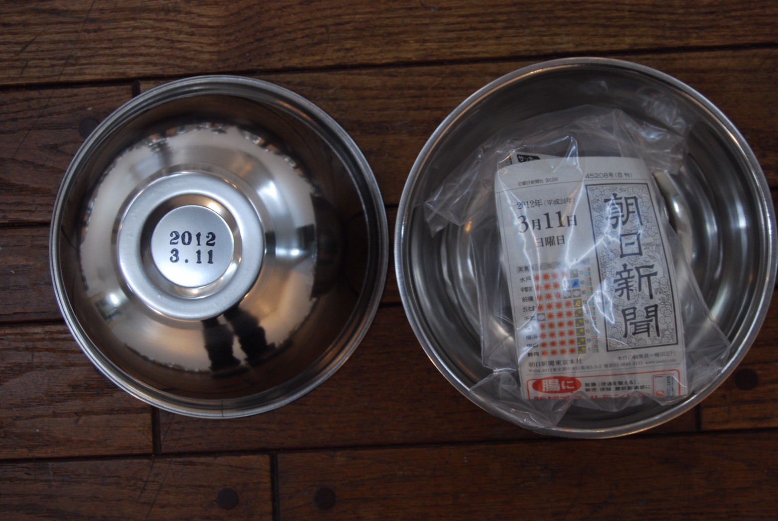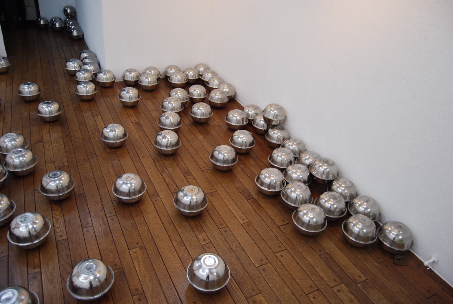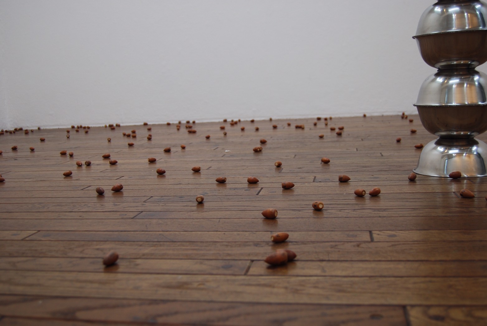 この作品制作は東日本大震災から約2週間後の2011・3・24から始めました。外気を2012・3・11まで、新聞の切り抜きと共に毎日、ボールの中に収集するというもので、いわば外気のタイムカプセルです。外気収集の場所は福島県(南相馬市)を含む、私が生活した場所です。 作品配置は、ギャラリー中央の高い所から床の上に、353個の日付が記されたどんぐりをばら撒き、同じ日付のAIRボールと交換する方法あ-で行いました。 アクションにもとづいたインスタレーションを通して堅固で厳格な形態の解体とシリアル(集合を構成する元、個々)な構造の崩壊を目指しました。