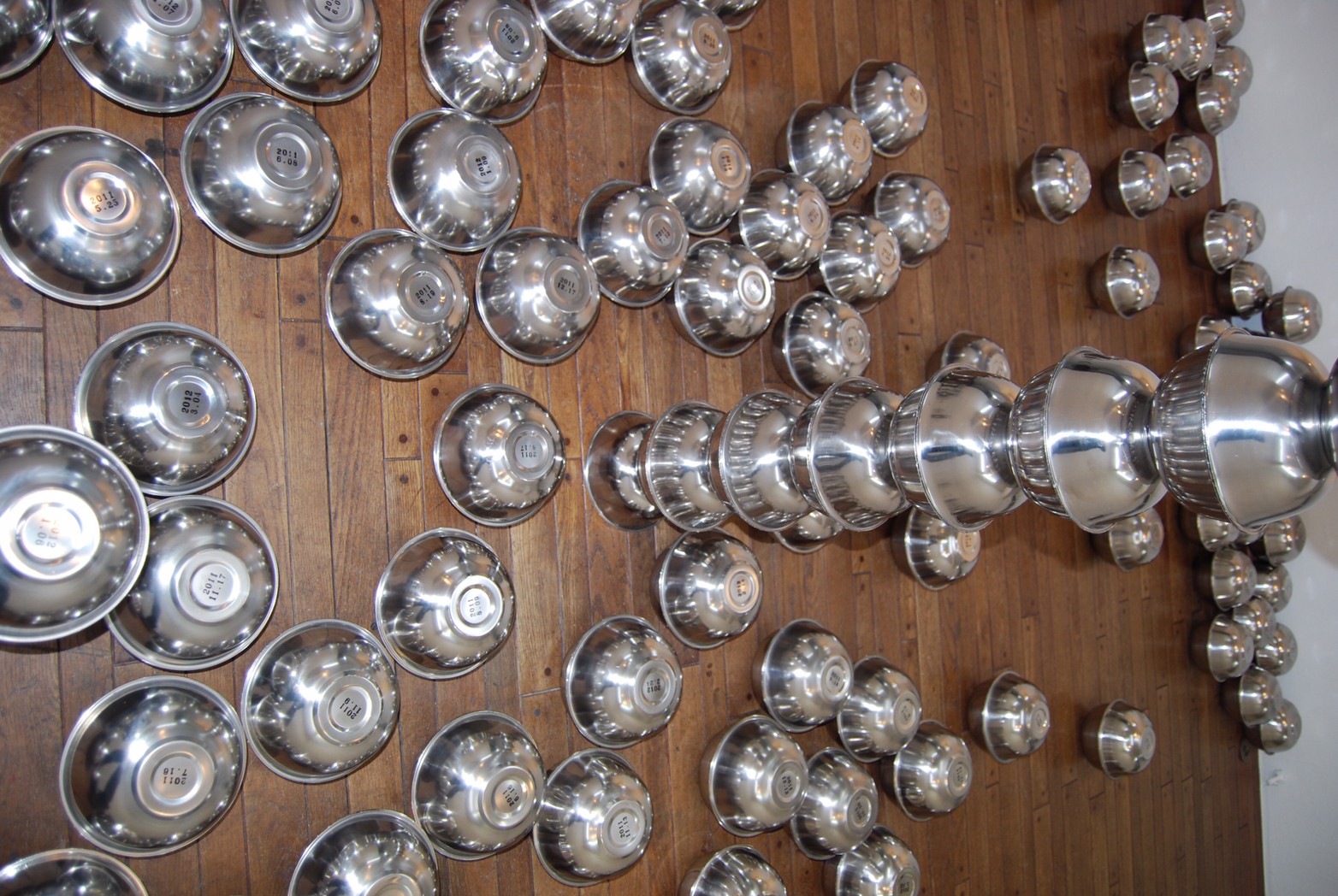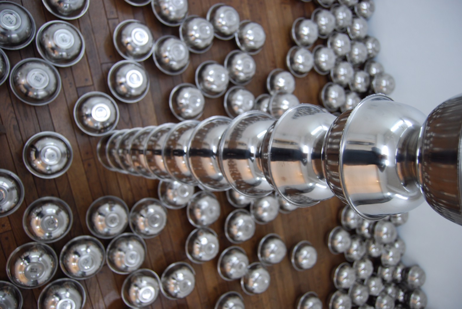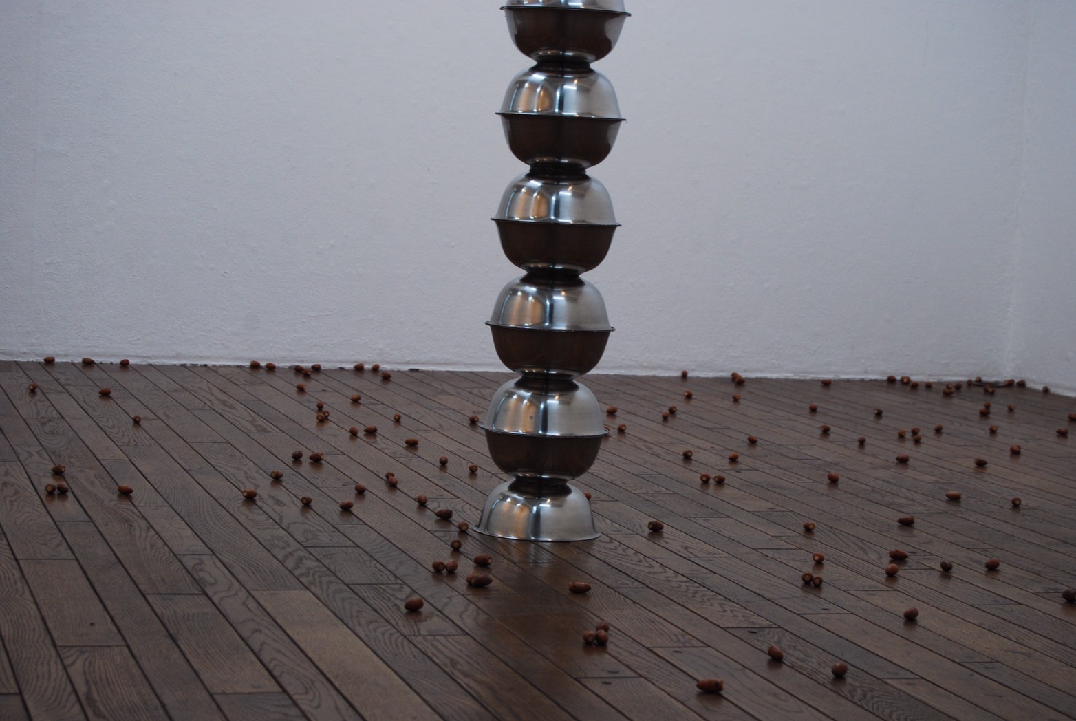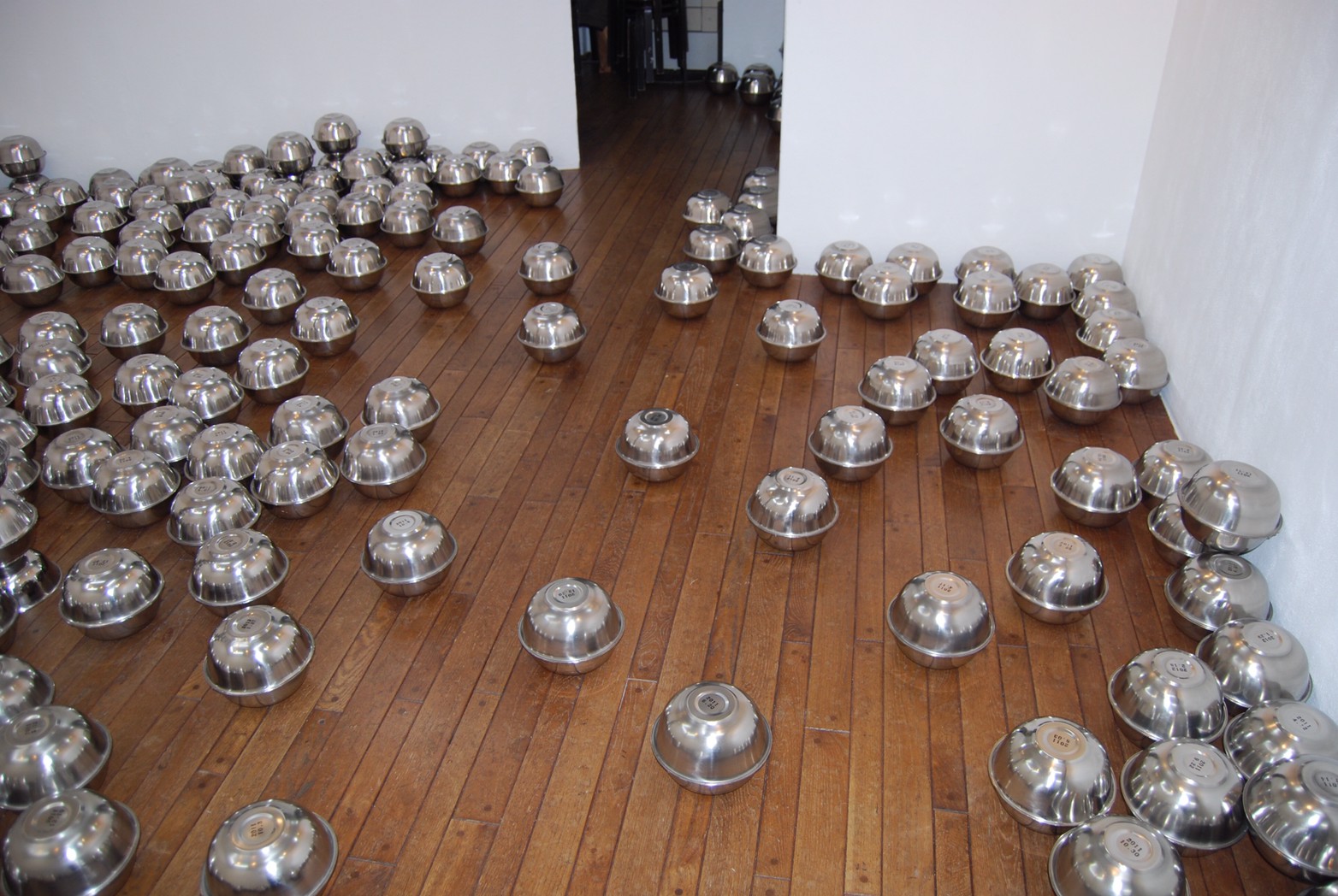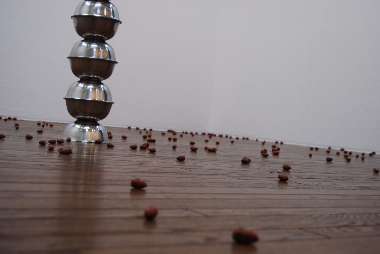 この作品制作は東日本大震災から約2週間後の2011・3・24から始めました。外気を2012・3・11まで、新聞の切り抜きと共に毎日、ボールの中に収集するというもので、いわば外気のタイムカプセルです。外気収集の場所は福島県(南相馬市)を含む、私が生活した場所です。 作品配置は、ギャラリー中央の高い所から床の上に、353個の日付が記されたどんぐりをばら撒き、同じ日付のAIRボールと交換する方法あ-で行いました。 アクションにもとづいたインスタレーションを通して堅固で厳格な形態の解体とシリアル(集合を構成する元、個々)な構造の崩壊を目指しました。