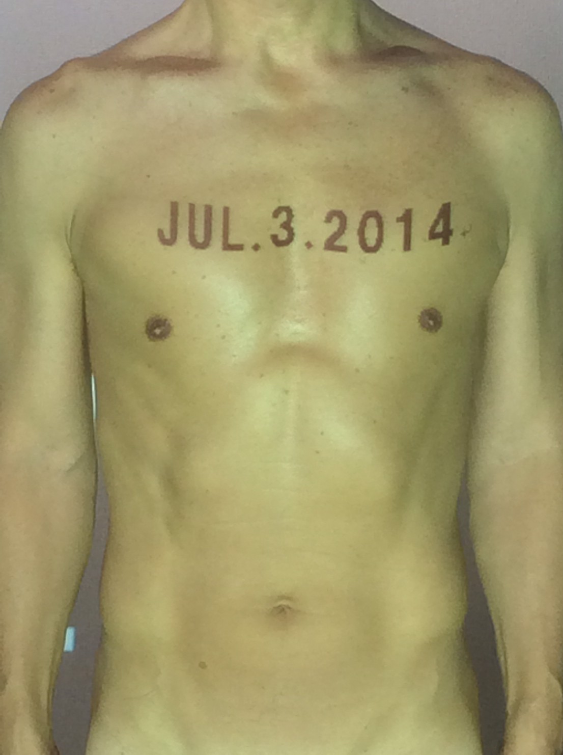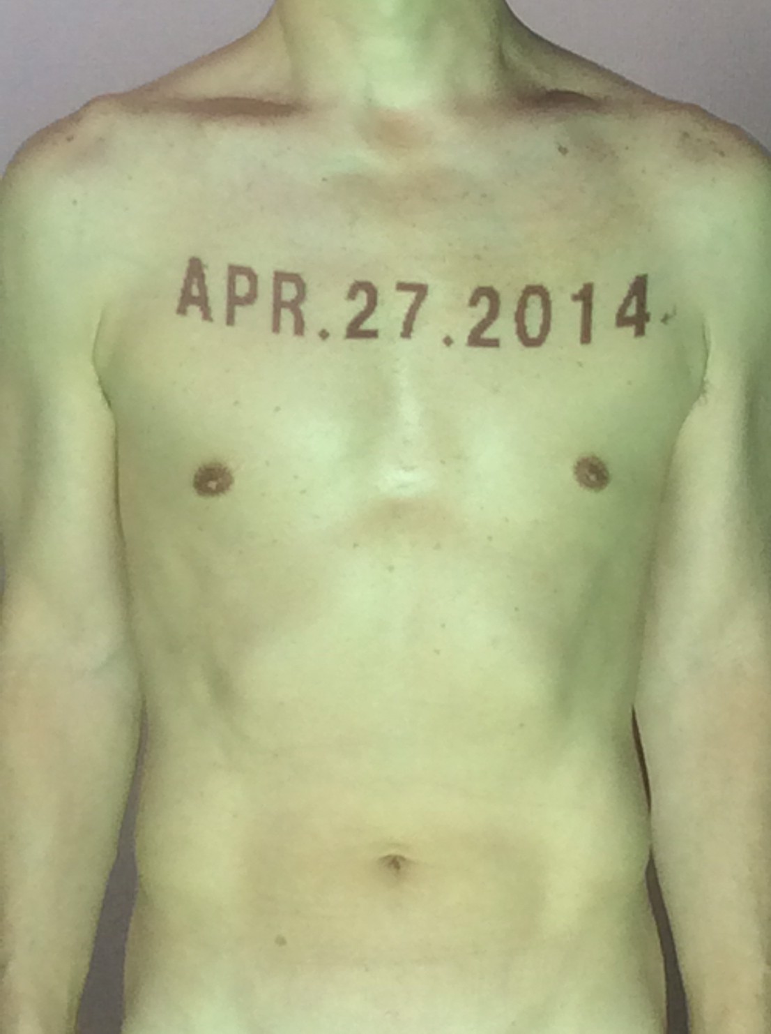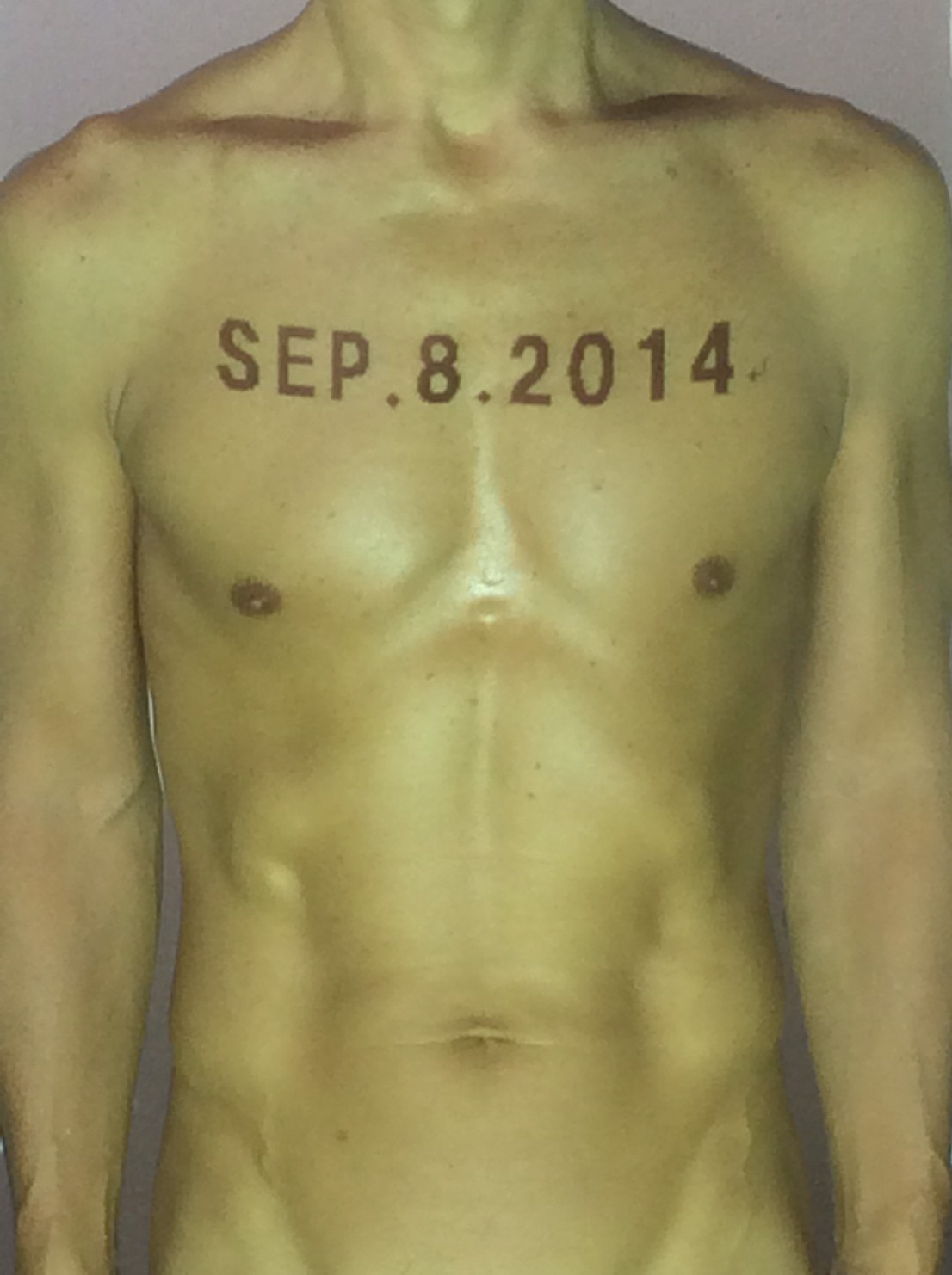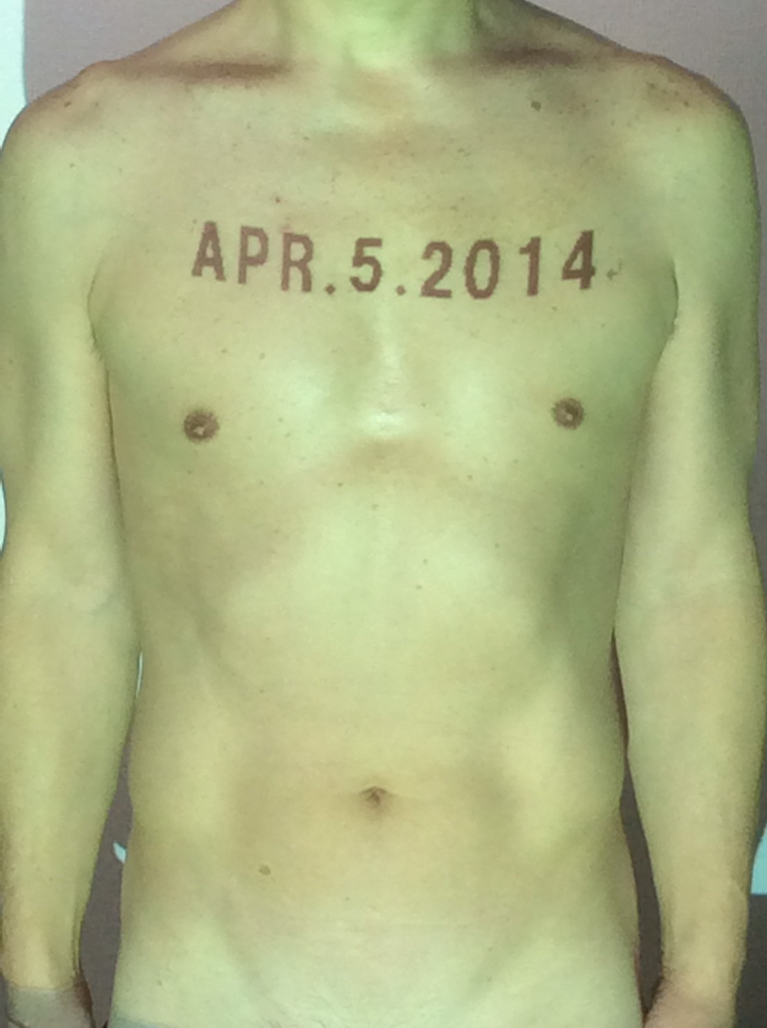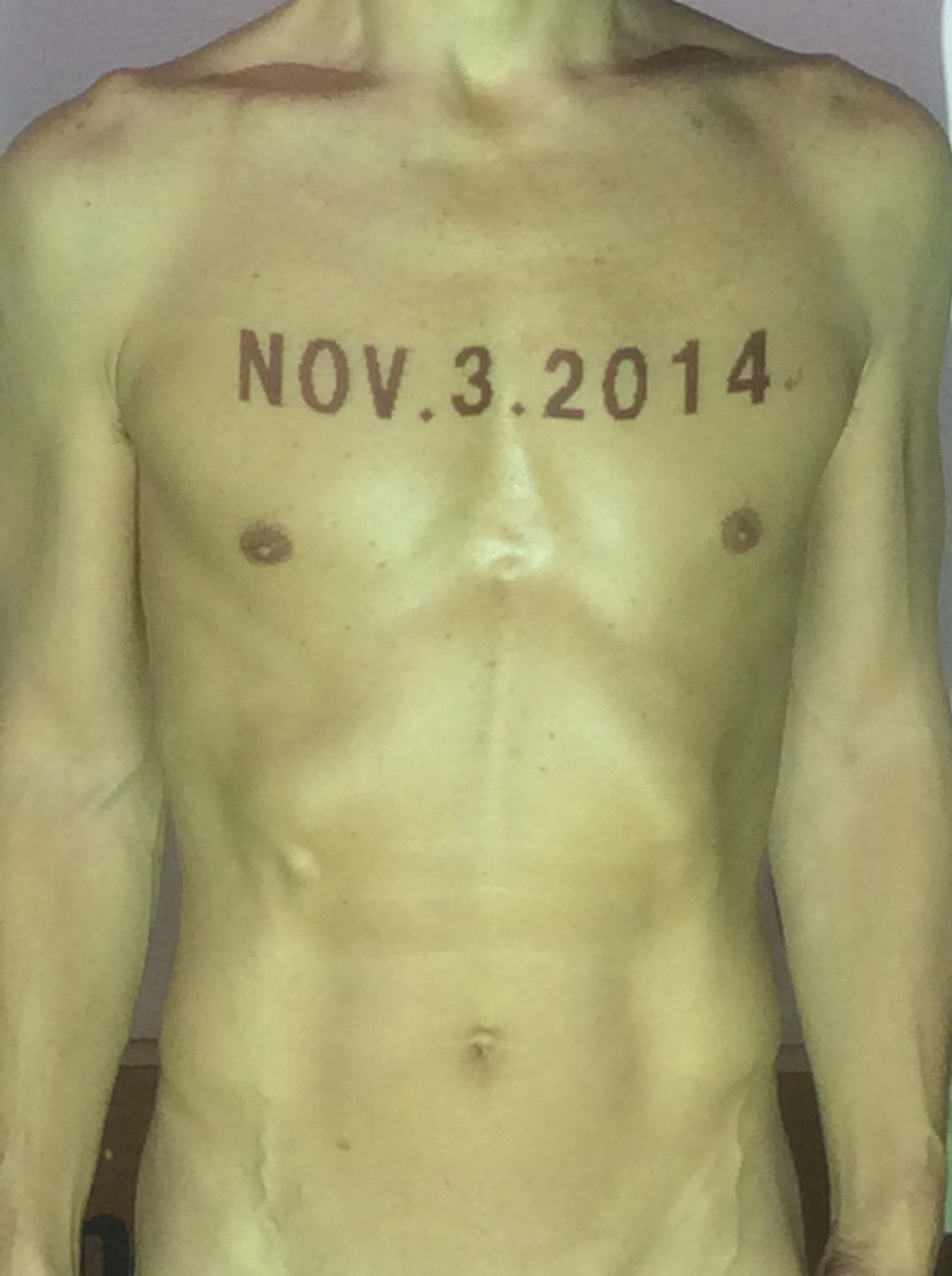 伊勢神宮に式年遷宮という20年に一度の儀式がある。常に神の宿る体(社)を若く保つのが目的だが、その町の活性化と儀式や建築技術の継承なども図られている。このことを私自身の体に移し替えて表現している。1年を通して鍛えた身体の変化はYoutubeにアップした。作家の身体 表現する身体 リニューアルボディー 表現する新しい身体(The new body to express) 身体と絵画 The body and pictures 時間的連続性の入れ替え. 身体は時間The body is time 時間に逆らう身体The body opposing time 身体は時間に逆らうThe body opposes time.過ぎ去る身体The body passing away