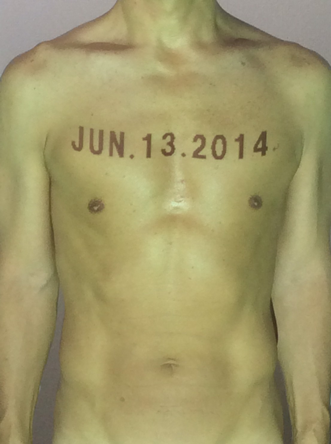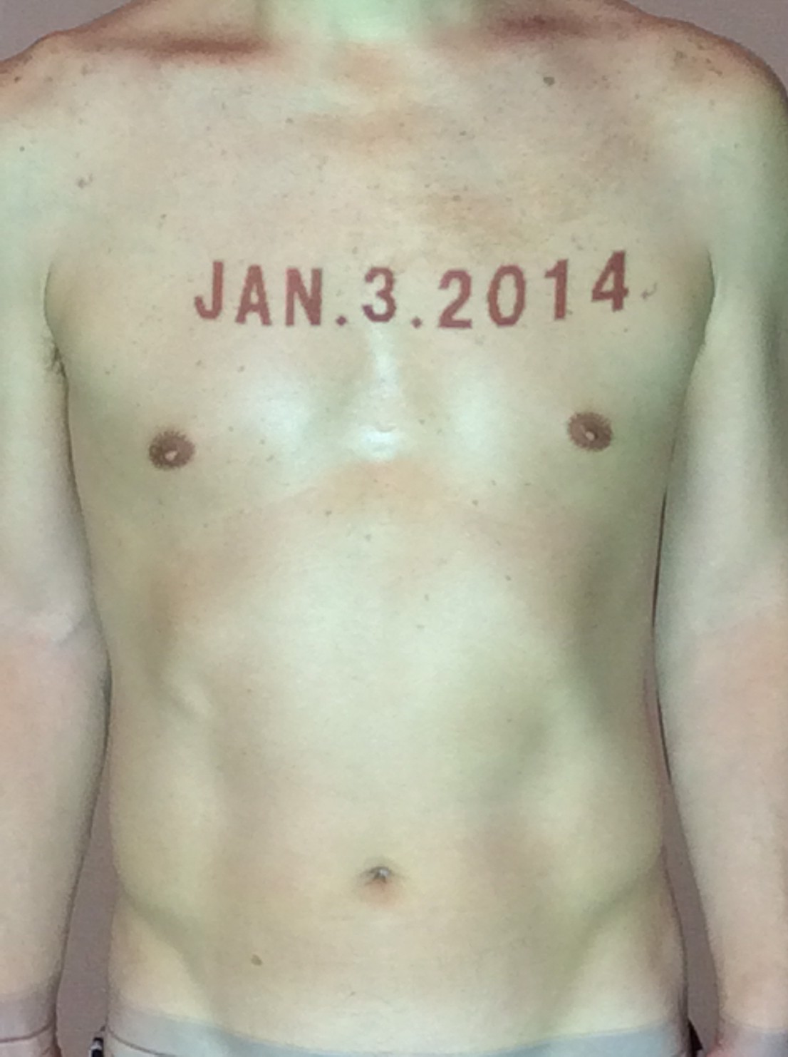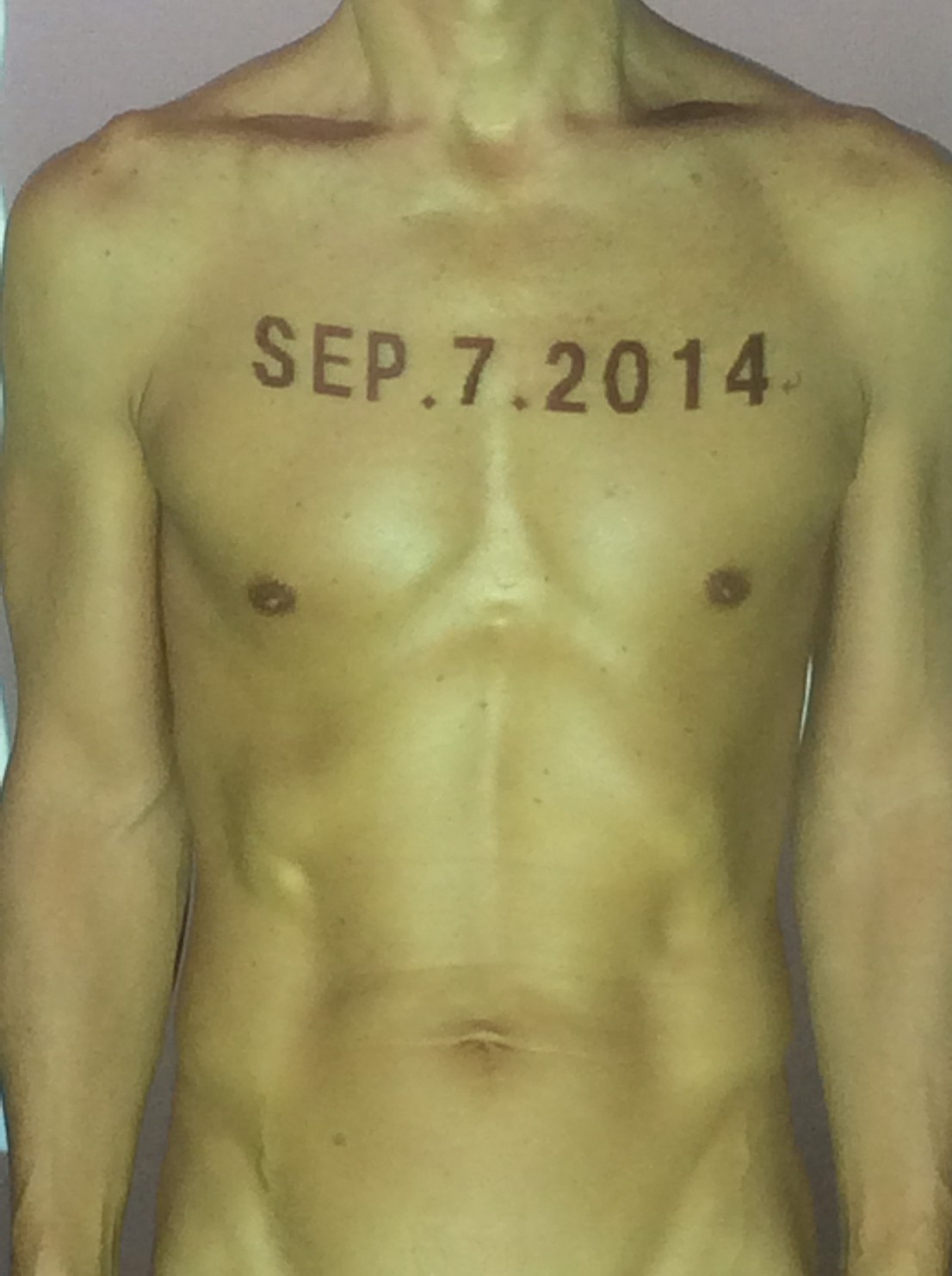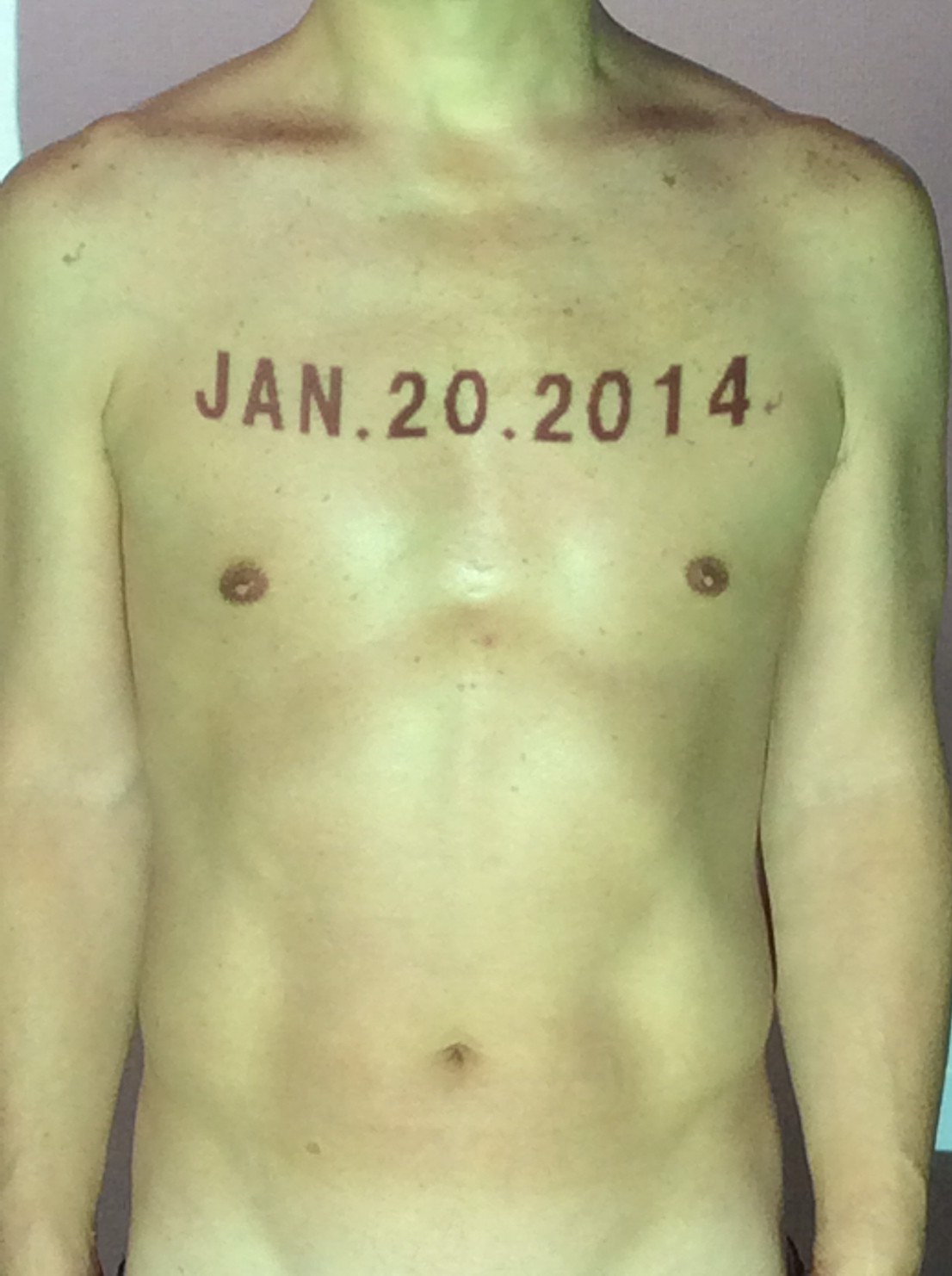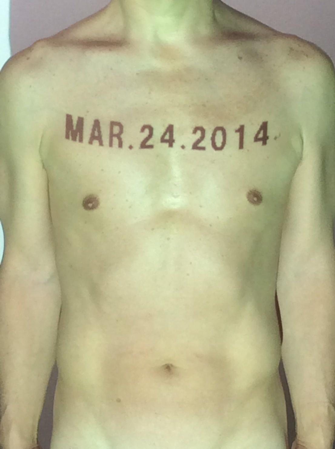 伊勢神宮に式年遷宮という20年に一度の儀式がある。常に神の宿る体(社)を若く保つのが目的だが、その町の活性化と儀式や建築技術の継承なども図られている。このことを私自身の体に移し替えて表現している。1年を通して鍛えた身体の変化はYoutubeにアップした。作家の身体 表現する身体 リニューアルボディー 表現する新しい身体(The new body to express) 身体と絵画 The body and pictures 時間的連続性の入れ替え. 身体は時間The body is time 時間に逆らう身体The body opposing time 身体は時間に逆らうThe body opposes time.過ぎ去る身体The body passing away