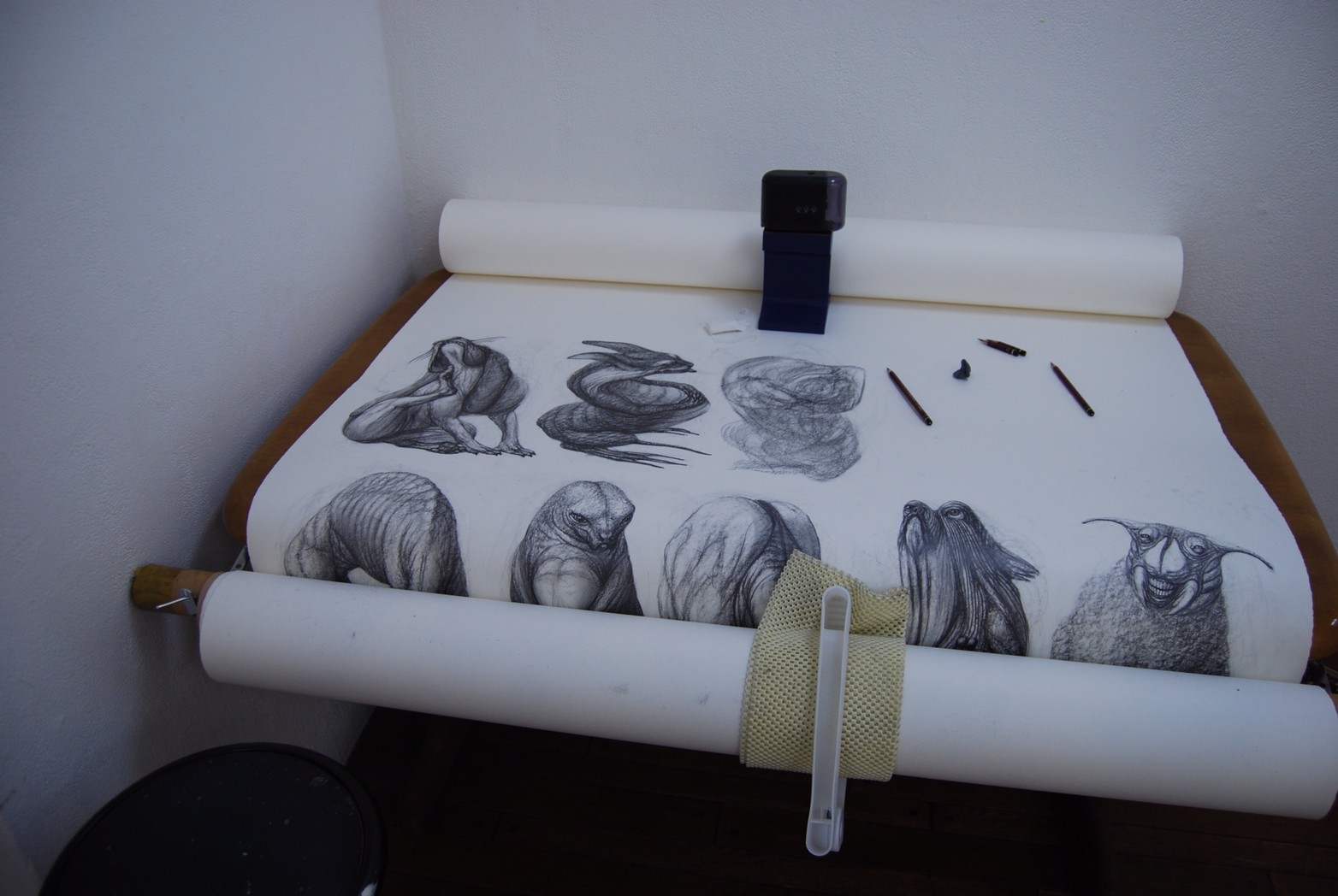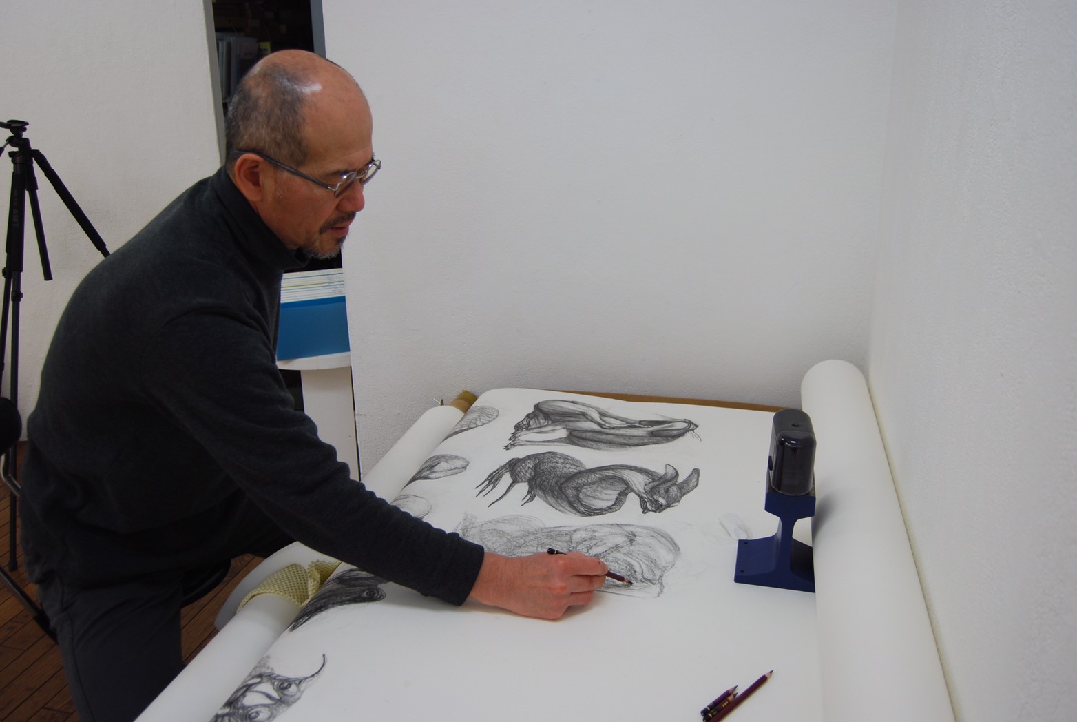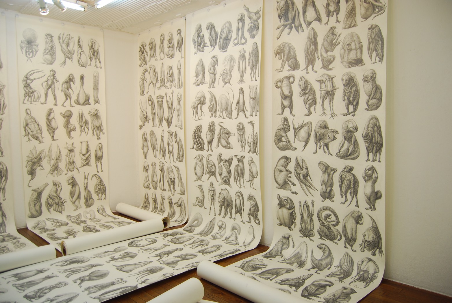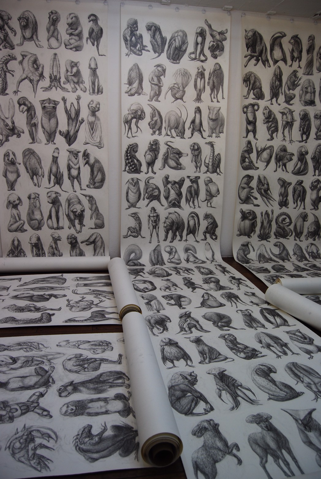 私の作品づくりは主に1年間の、1オリジンを基に始まっていきます。時間を基軸に連続性、継続性をコンセプトにした作品形態をとることがほとんどです。その中で今回は、昨年ギャラリー現で発表した作品の継続版です。ギャラリーでライブ制作を行っていたものを展覧会終了後に自宅アトリエでYouTubeにアップしながら完成させた作品です。 普段はインスタレーションなどを行うことが多いのですが、一度シンプルに紙と鉛筆だけで、子供の頃に味わった純粋に絵を描くことの楽しみ、喜びをもう一度味わってみたいと思いました。 2014年は鳥獣戯画の展覧会などもあり、世の中が漫画ブームで盛り上がっている中。あ!自分なりの超獣戯画を描いてみようと考え、120㎝×10mのロール紙を7本,、10Bの鉛筆と練り消しゴムをかなりたくさん買い込み、2015年1月1日から描き始めました。毎日、根を詰めて描くと、きっと辛くなると思い、気の向くまま漫然と描くことにしました。 自分の中から生まれ出る見たこともない生き物を見てみたいという思いで、得体の知れないものに生きる体を得させようと試みたものです。 約800体(全てオリジナル)のクリーチャーの7本目の一部ですが、どうぞお楽しみください。