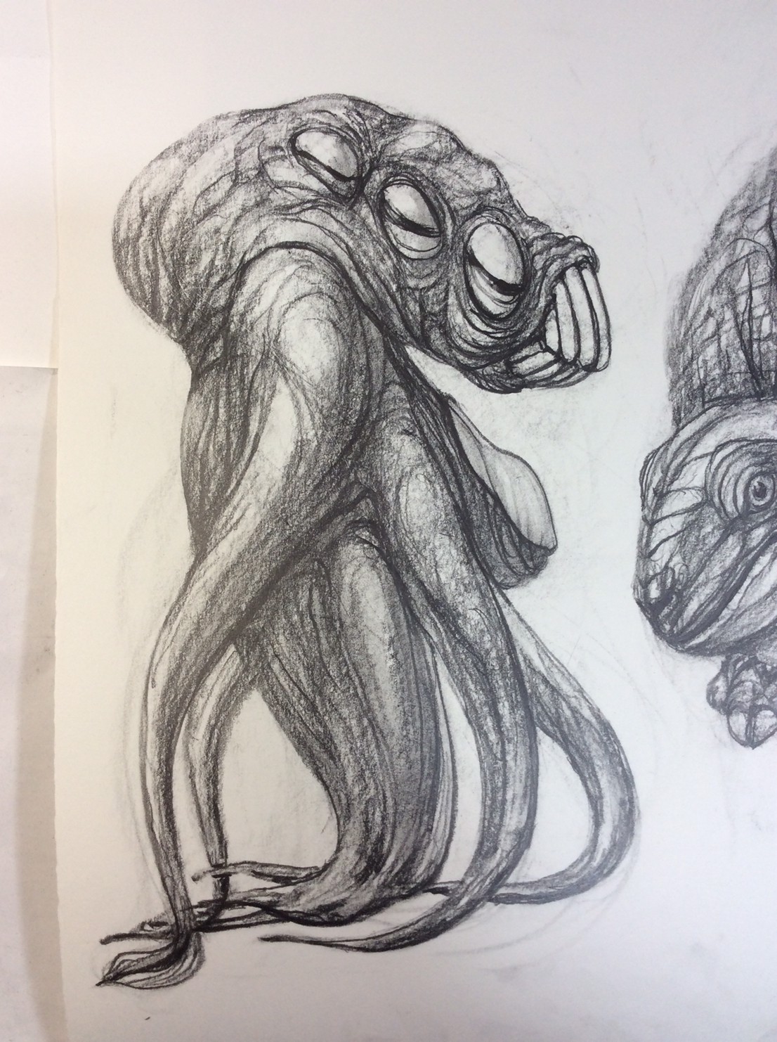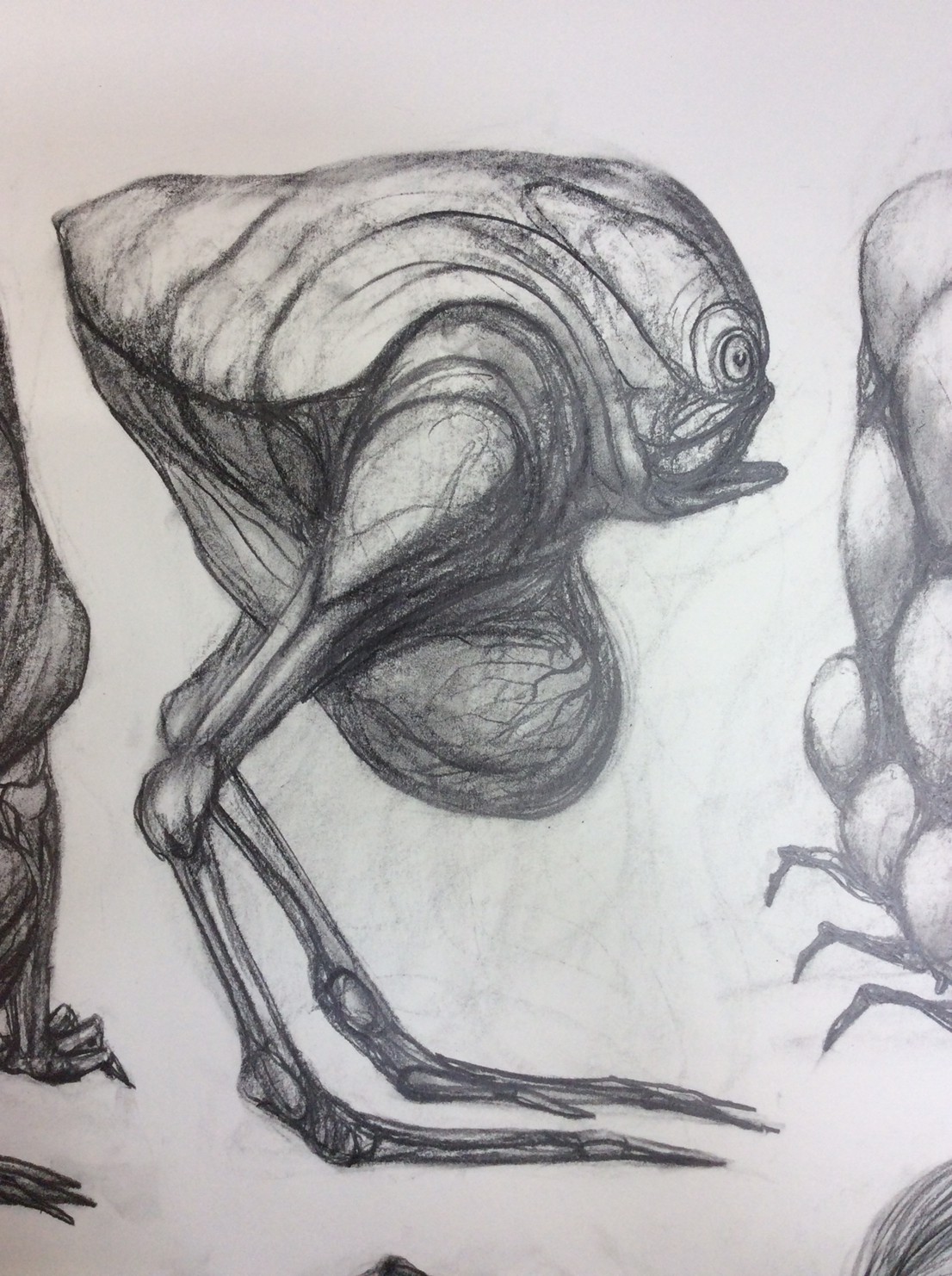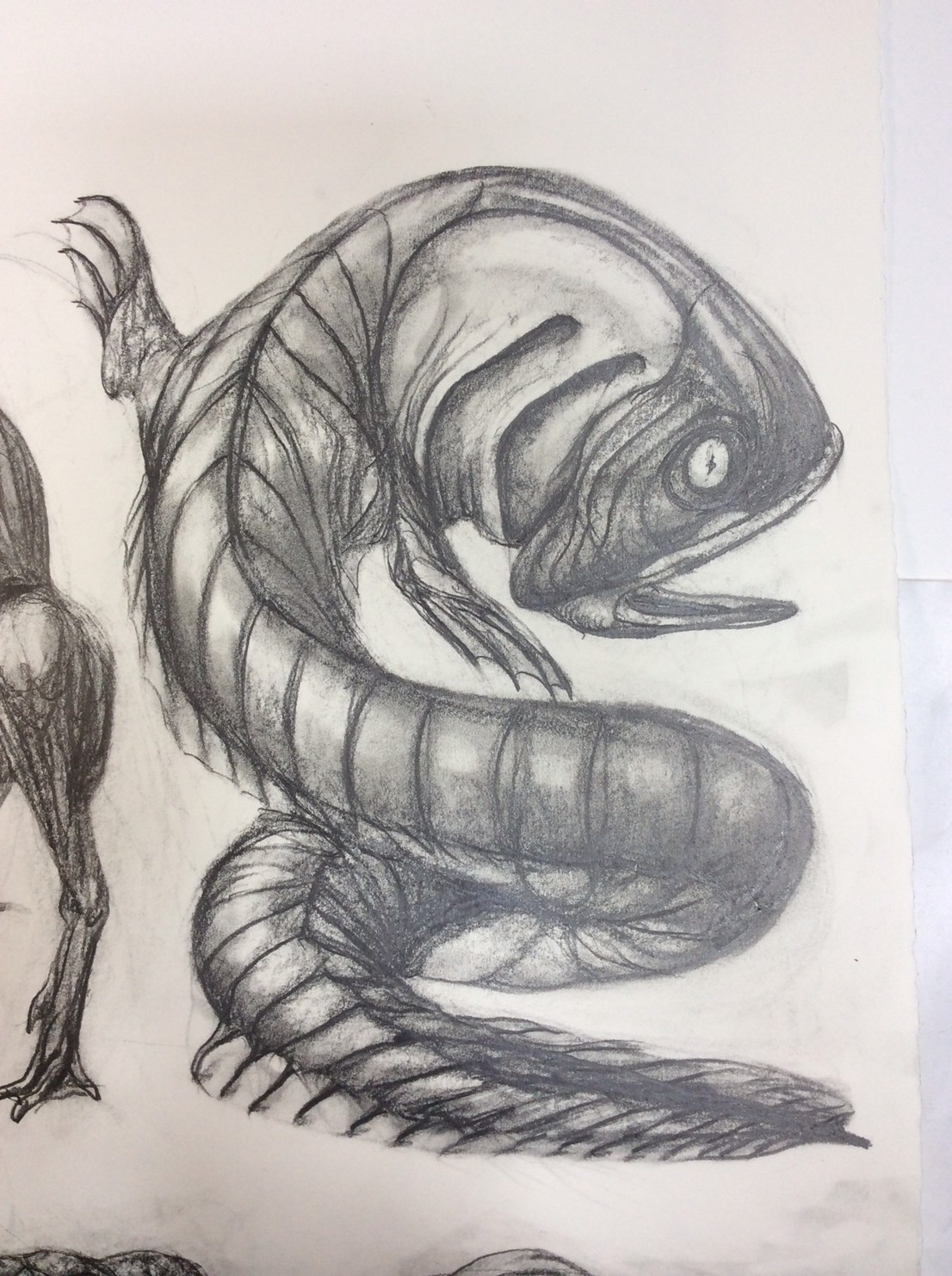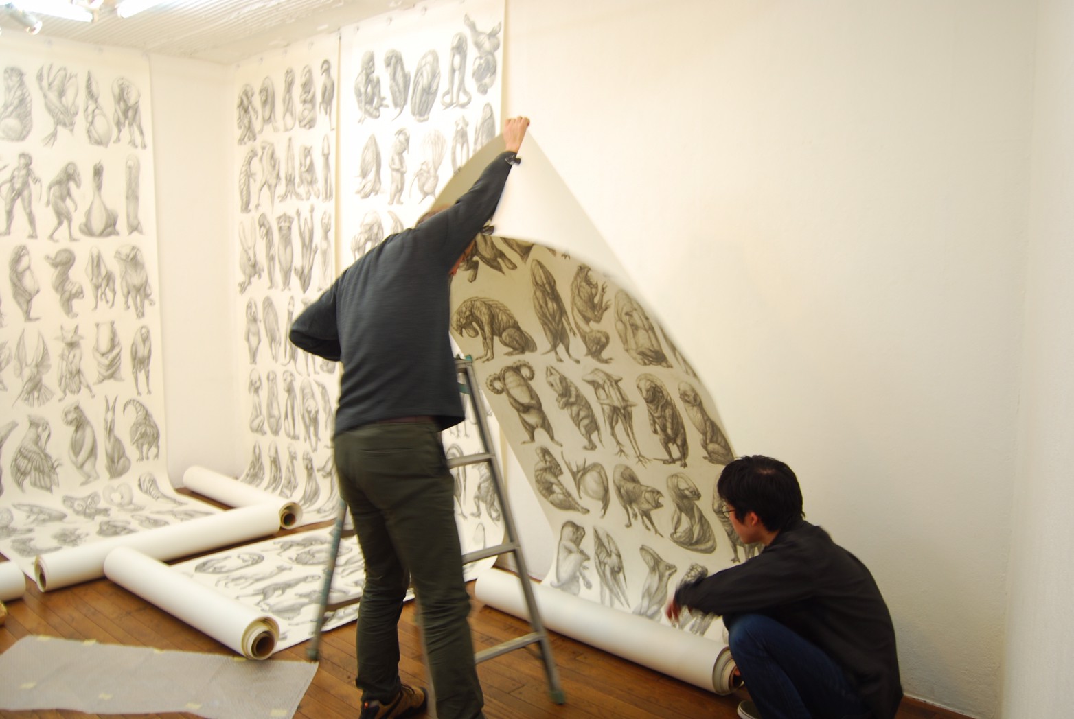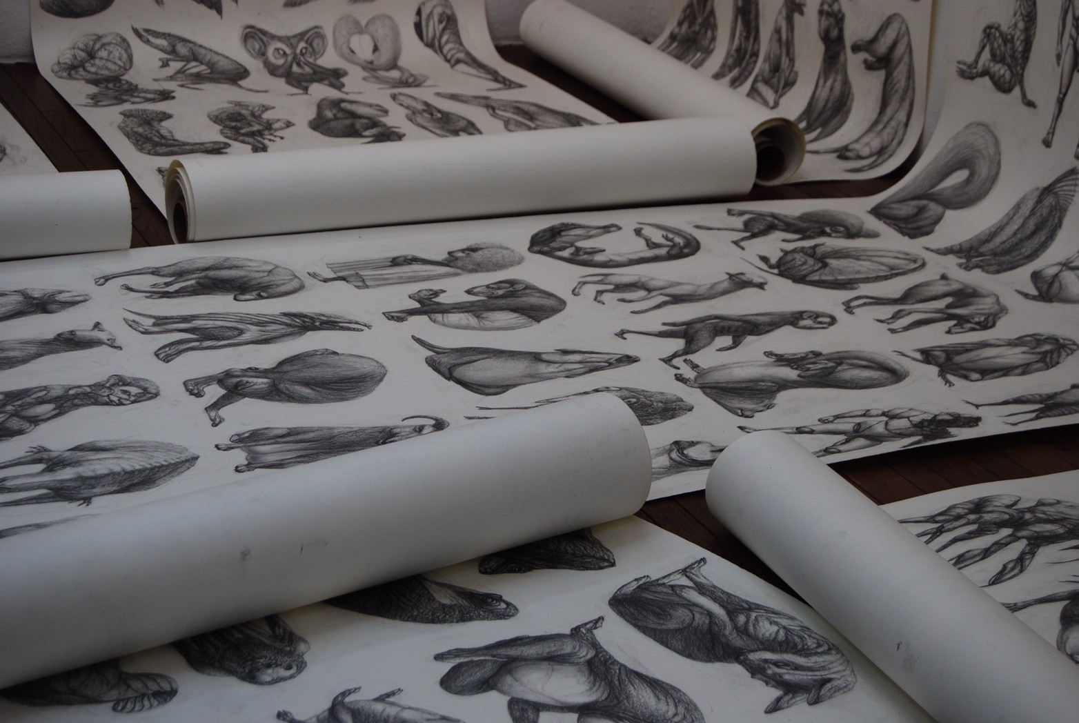 私の作品づくりは主に1年間の、1オリジンを基に始まっていきます。時間を基軸に連続性、継続性をコンセプトにした作品形態をとることがほとんどです。その中で今回は、昨年ギャラリー現で発表した作品の継続版です。ギャラリーでライブ制作を行っていたものを展覧会終了後に自宅アトリエでYouTubeにアップしながら完成させた作品です。 普段はインスタレーションなどを行うことが多いのですが、一度シンプルに紙と鉛筆だけで、子供の頃に味わった純粋に絵を描くことの楽しみ、喜びをもう一度味わってみたいと思いました。 2014年は鳥獣戯画の展覧会などもあり、世の中が漫画ブームで盛り上がっている中。あ!自分なりの超獣戯画を描いてみようと考え、120㎝×10mのロール紙を7本,、10Bの鉛筆と練り消しゴムをかなりたくさん買い込み、2015年1月1日から描き始めました。毎日、根を詰めて描くと、きっと辛くなると思い、気の向くまま漫然と描くことにしました。 自分の中から生まれ出る見たこともない生き物を見てみたいという思いで、得体の知れないものに生きる体を得させようと試みたものです。 約800体(全てオリジナル)のクリーチャーの7本目の一部ですが、どうぞお楽しみください。