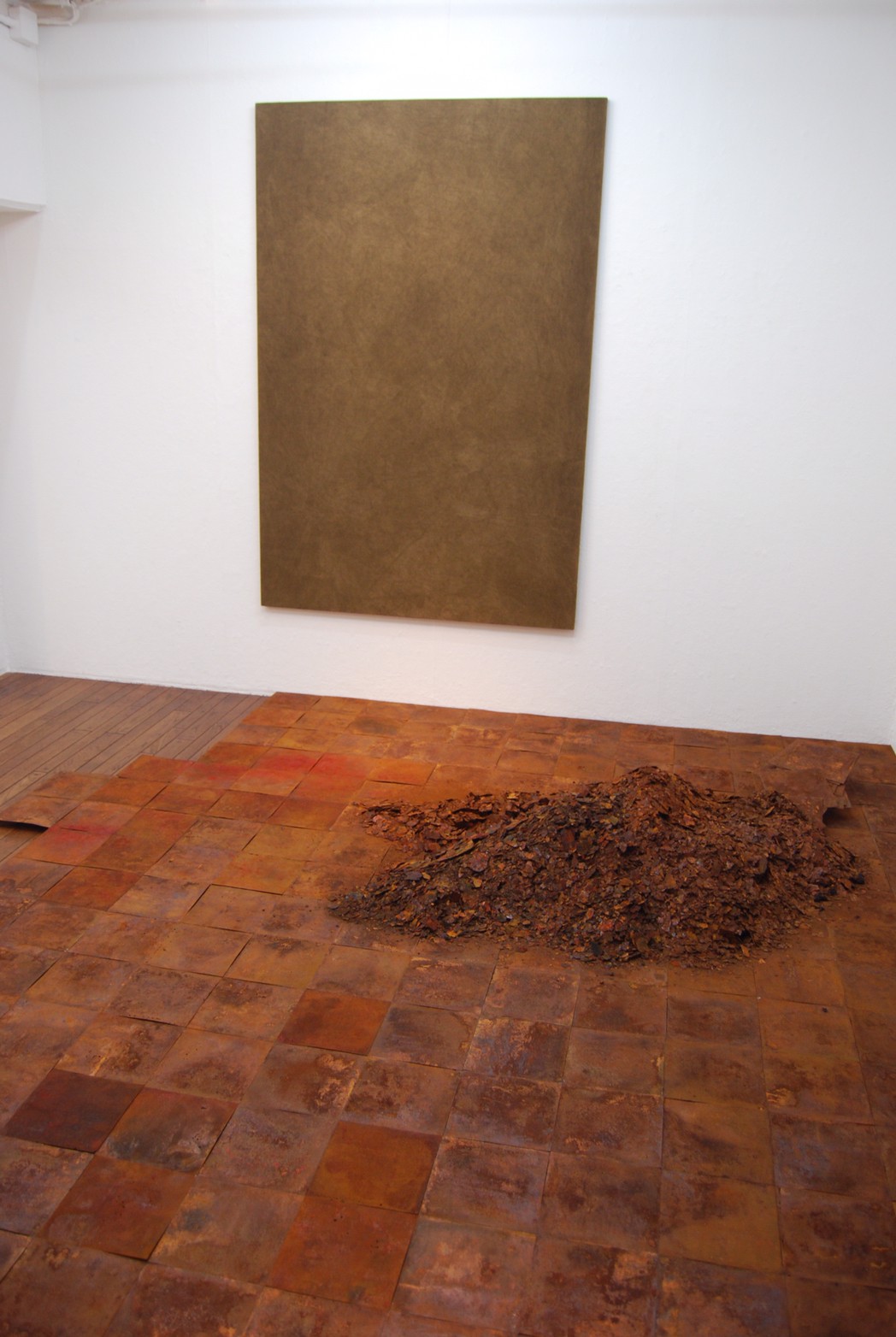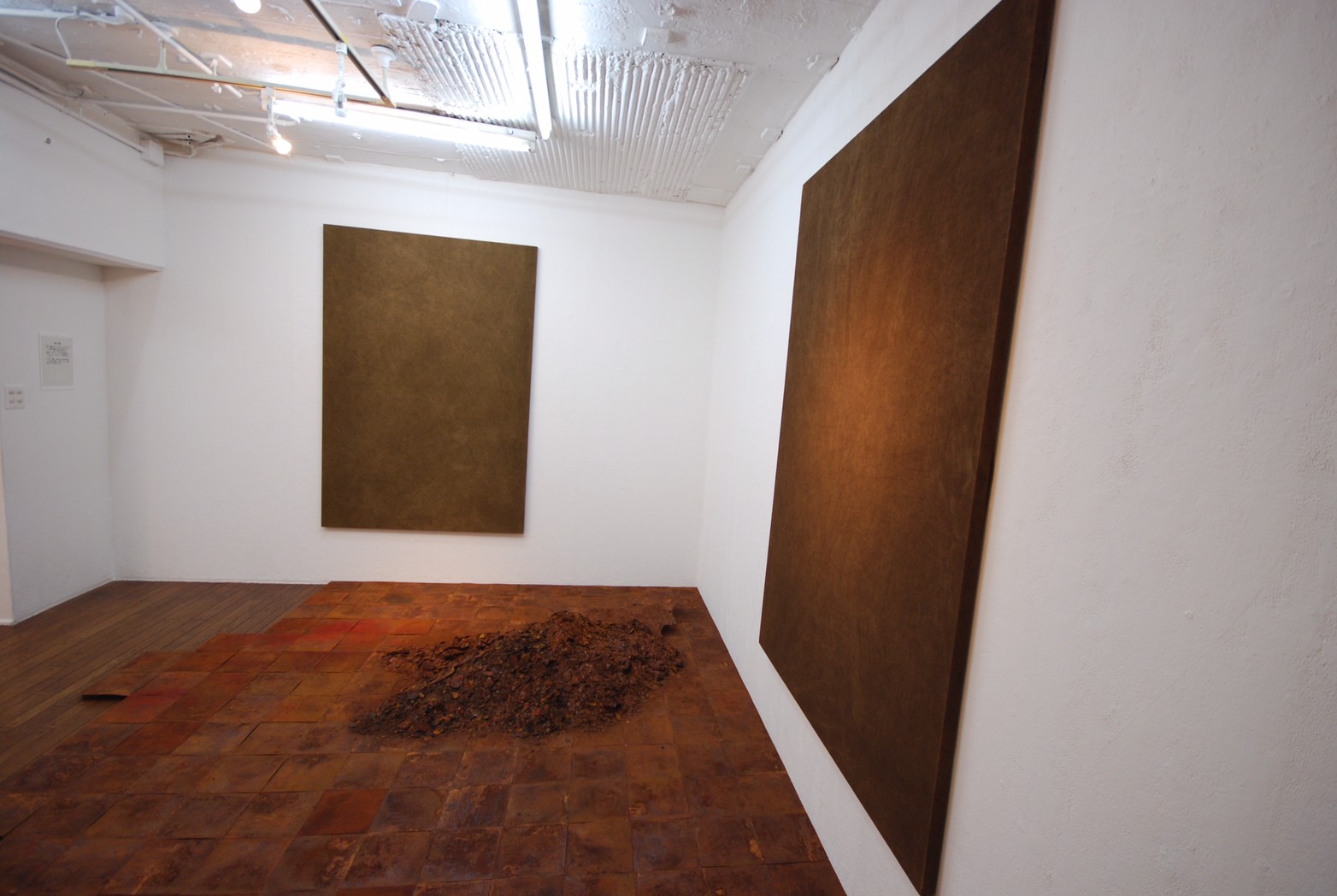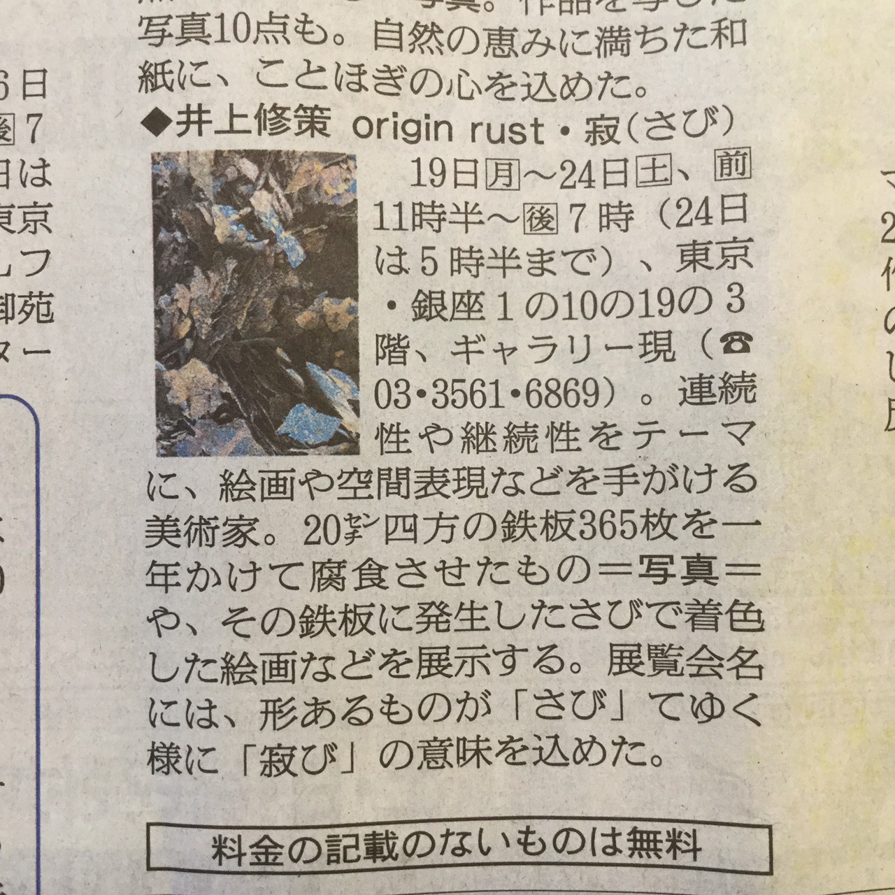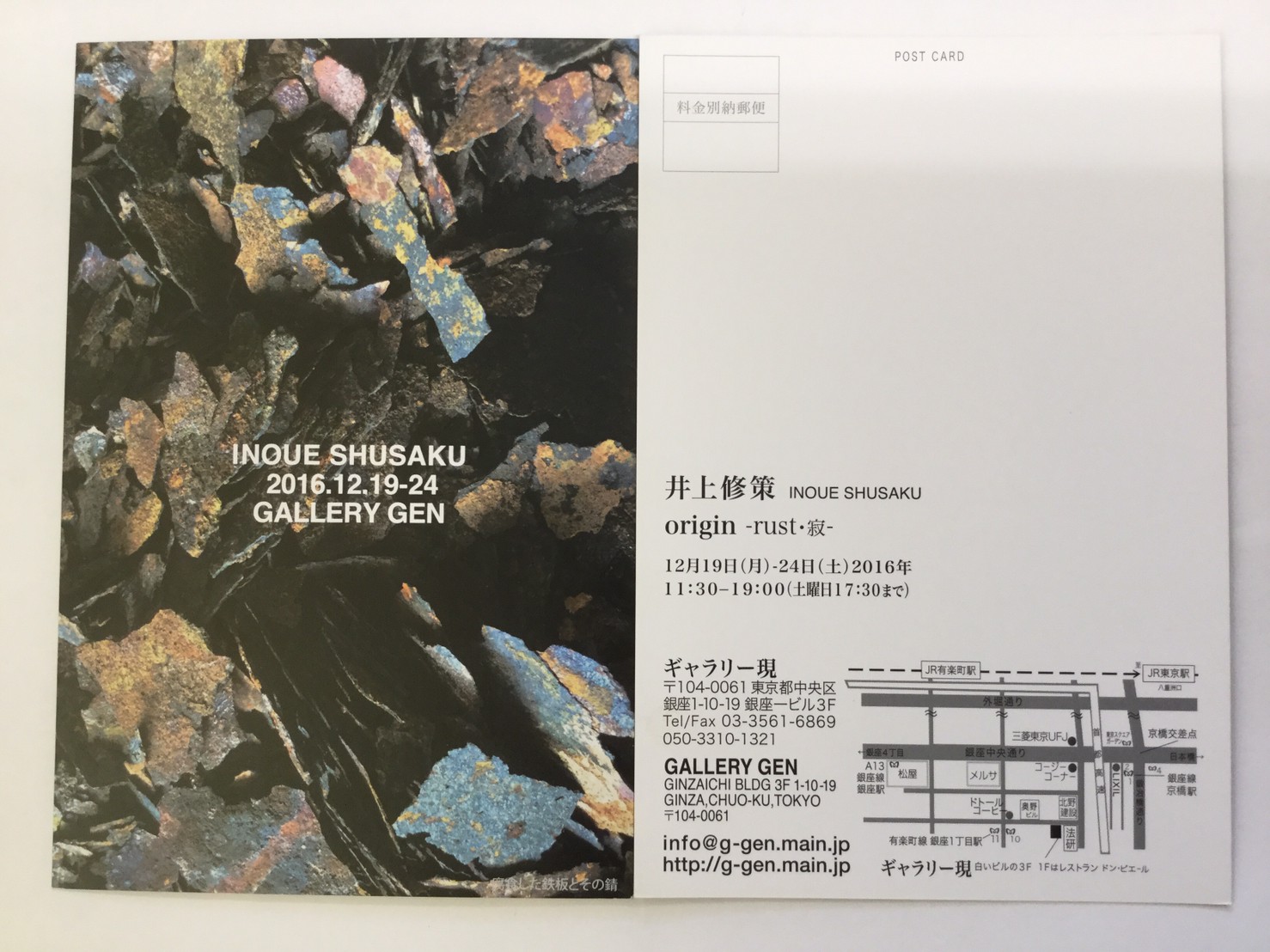 高炉で現鉱石にエネルギーを与えると、炭素は現鉱石を現に還元する。こうして「現」が産み出される。放置しておくと、やがて現は酸化してエネルギーを失って、酸化現に復って行く。つまり、錆は、還元された現が酸化して安定な状態へとかえろうとする過程に生じる結果である。大島紬、泥染は鉄分の反応、鉄を錆びさせてできたサビはかなり強い染料。製鉄された綺麗な鉄から泥をつくる作業。その泥を使い作品をつくる。Gallery現、閉廊を偲んで。