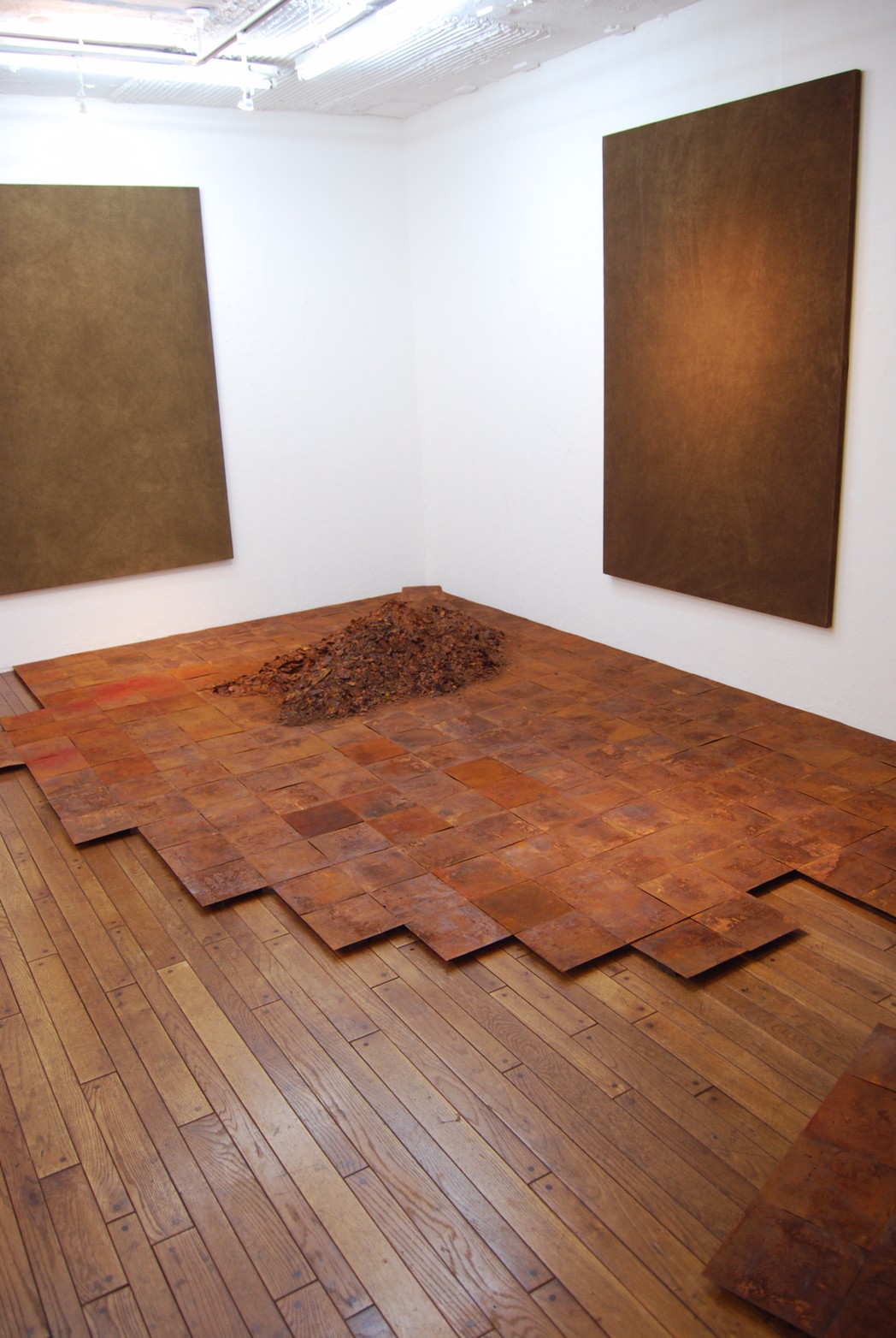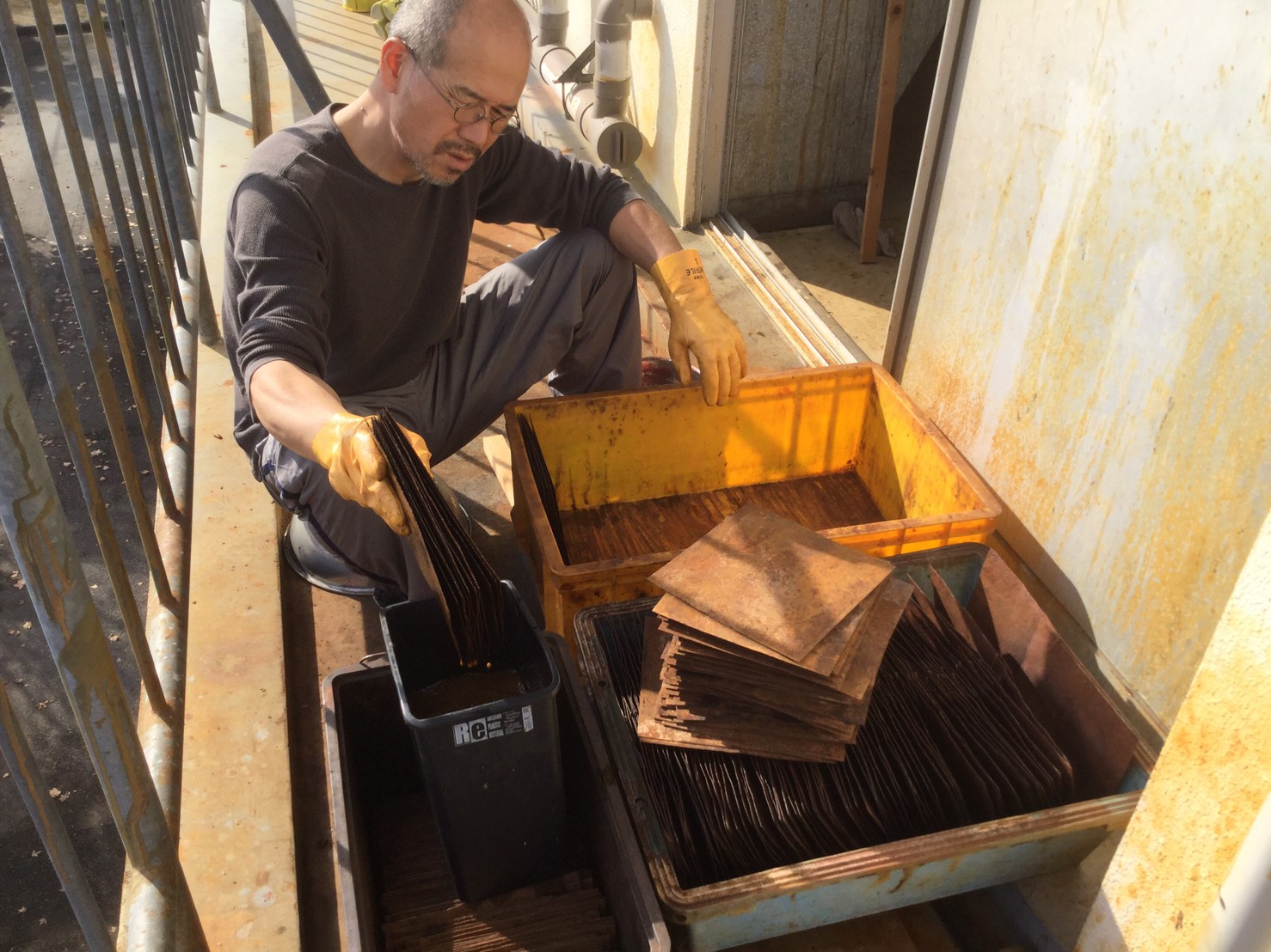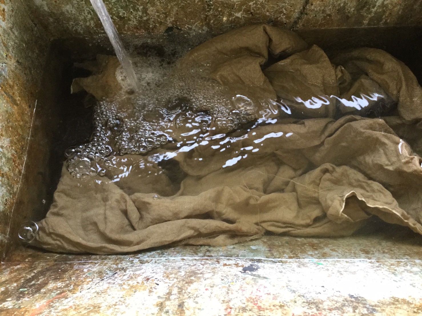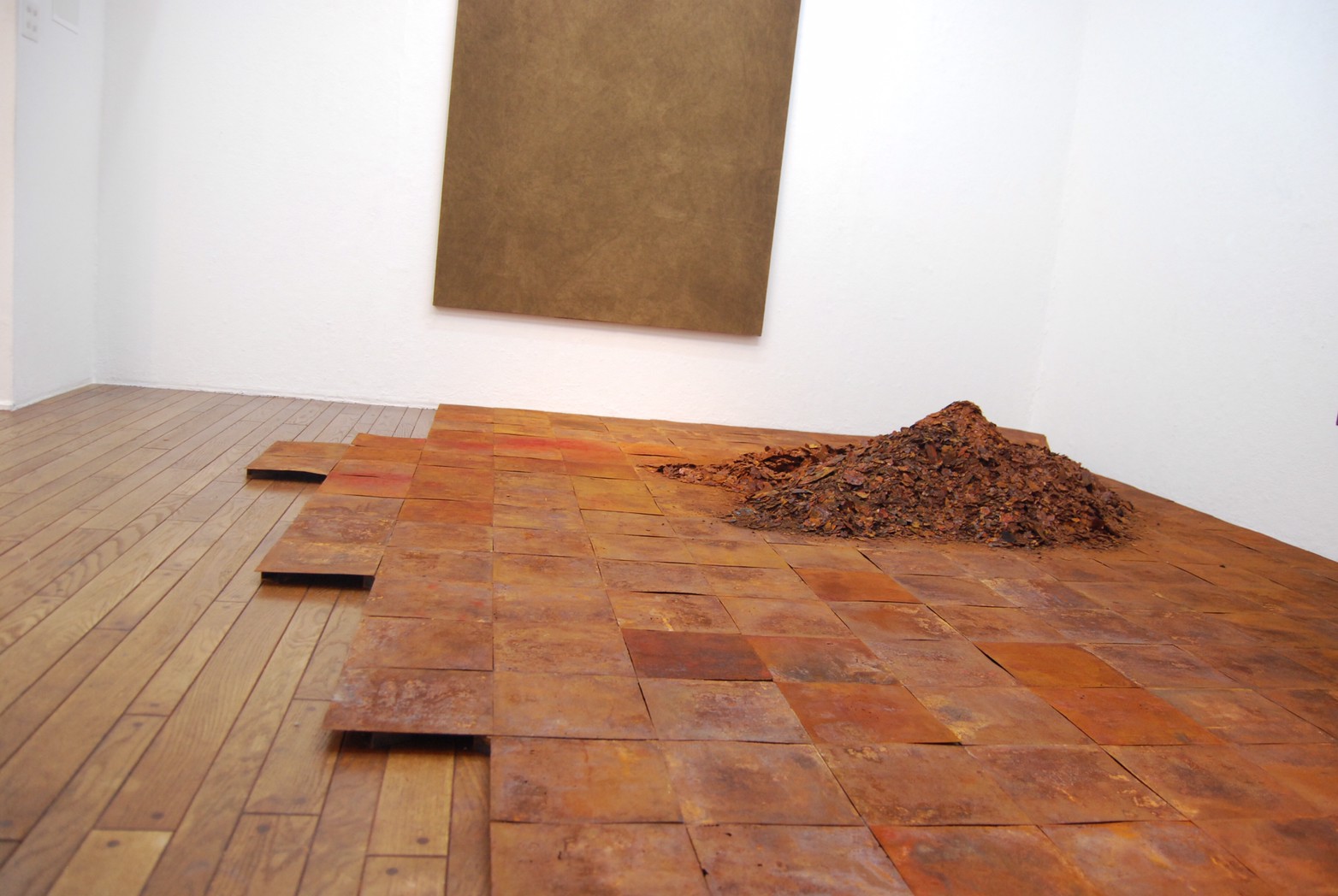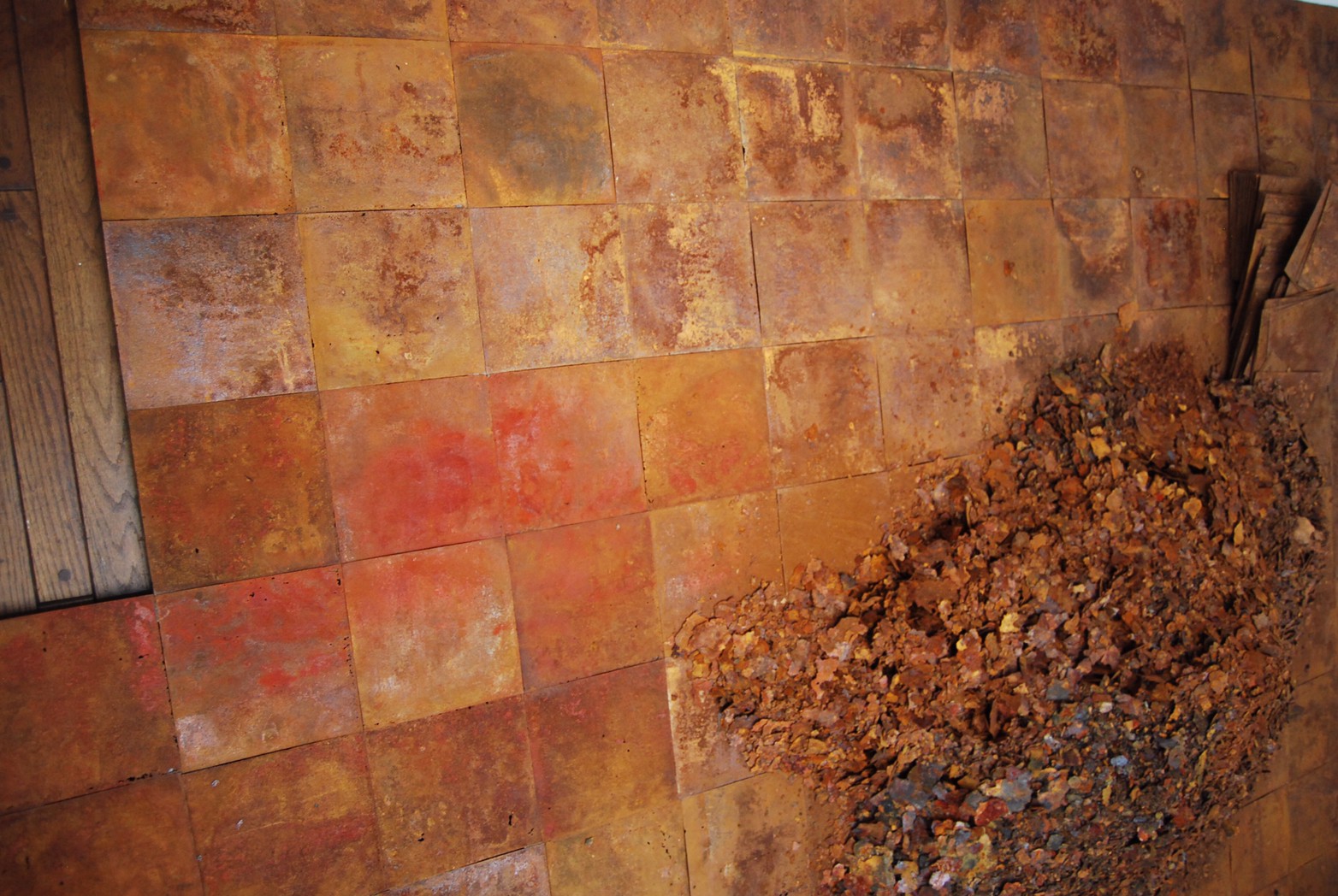 高炉で現鉱石にエネルギーを与えると、炭素は現鉱石を現に還元する。こうして「現」が産み出される。放置しておくと、やがて現は酸化してエネルギーを失って、酸化現に復って行く。つまり、錆は、還元された現が酸化して安定な状態へとかえろうとする過程に生じる結果である。大島紬、泥染は鉄分の反応、鉄を錆びさせてできたサビはかなり強い染料。製鉄された綺麗な鉄から泥をつくる作業。その泥を使い作品をつくる。Gallery現、閉廊を偲んで。