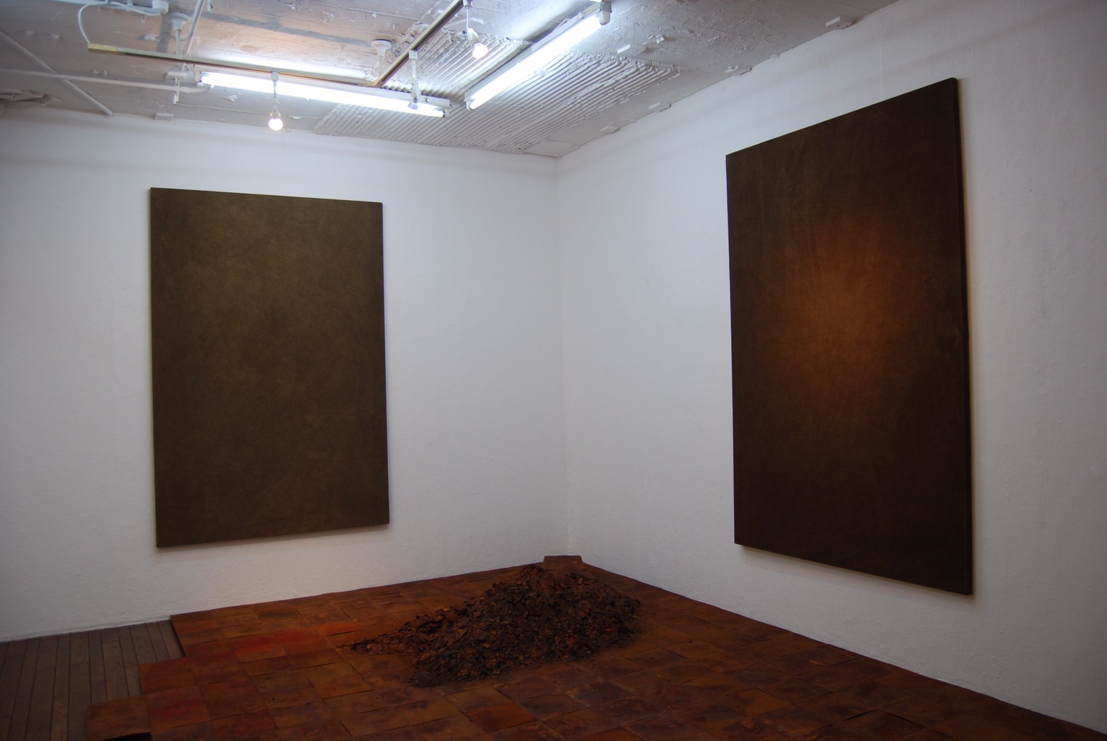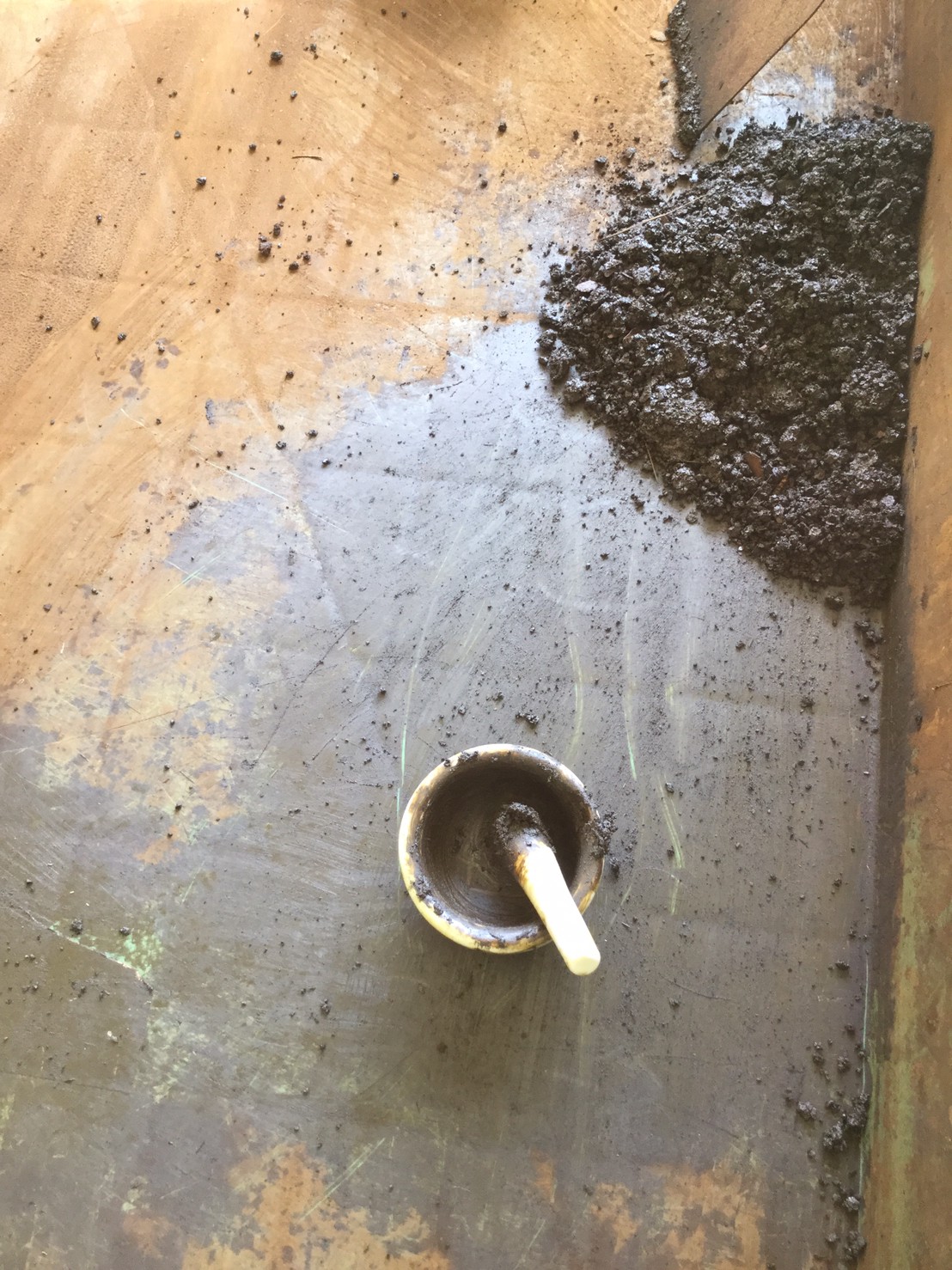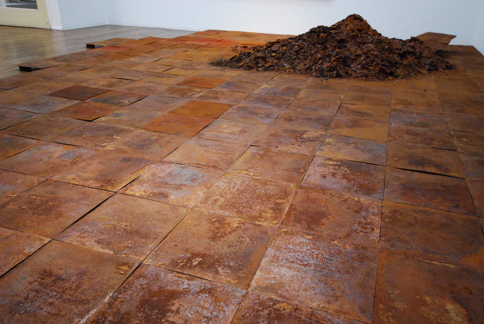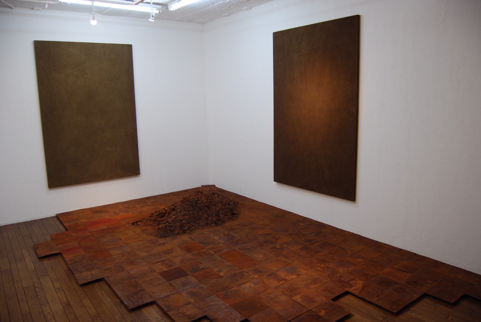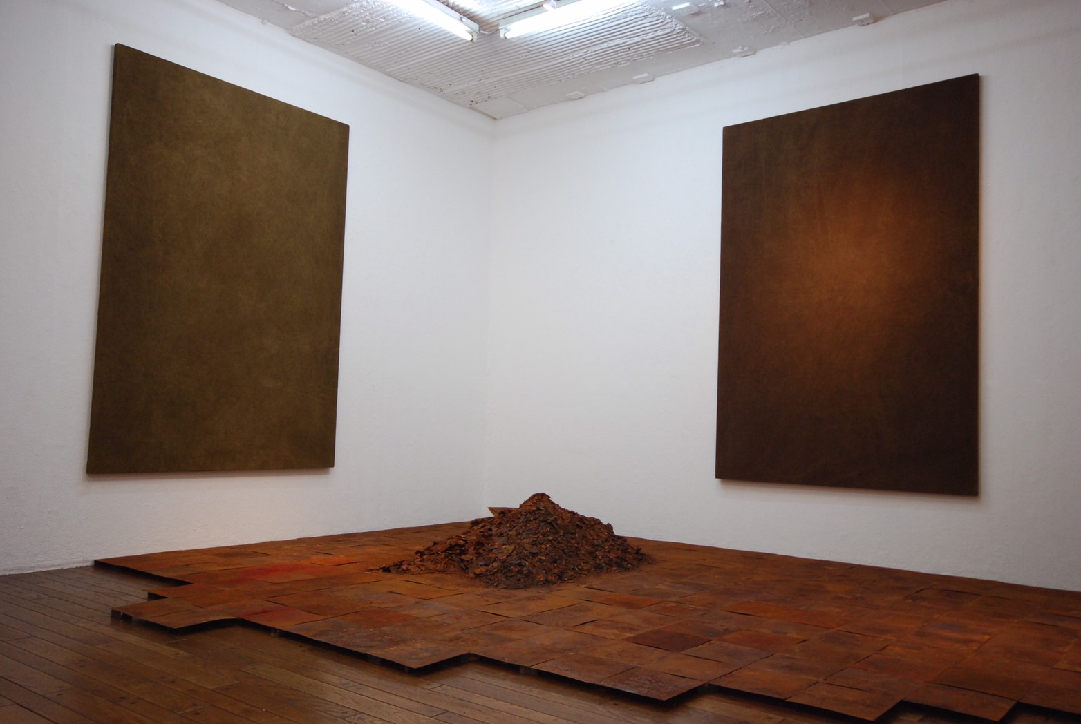 高炉で現鉱石にエネルギーを与えると、炭素は現鉱石を現に還元する。こうして「現」が産み出される。放置しておくと、やがて現は酸化してエネルギーを失って、酸化現に復って行く。つまり、錆は、還元された現が酸化して安定な状態へとかえろうとする過程に生じる結果である。大島紬、泥染は鉄分の反応、鉄を錆びさせてできたサビはかなり強い染料。製鉄された綺麗な鉄から泥をつくる作業。その泥を使い作品をつくる。Gallery現、閉廊を偲んで。