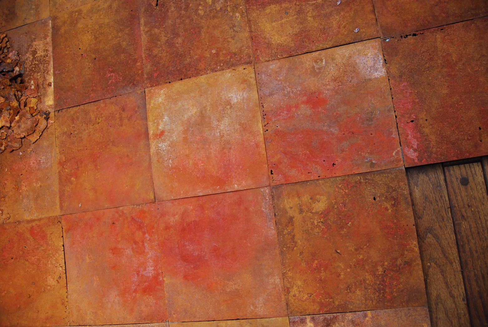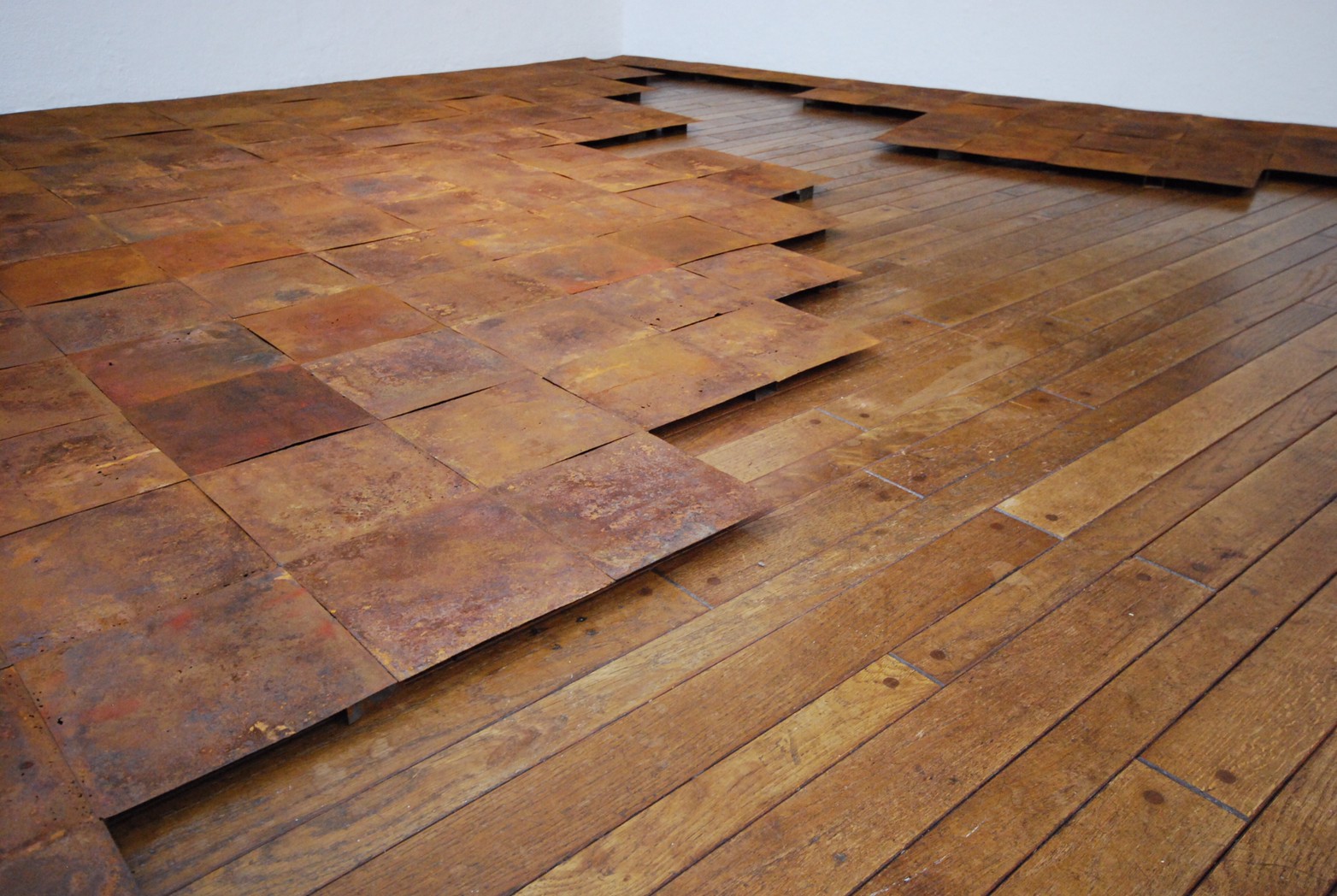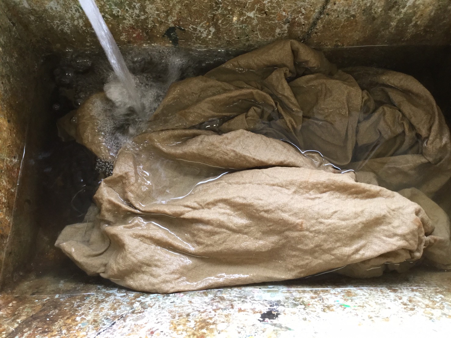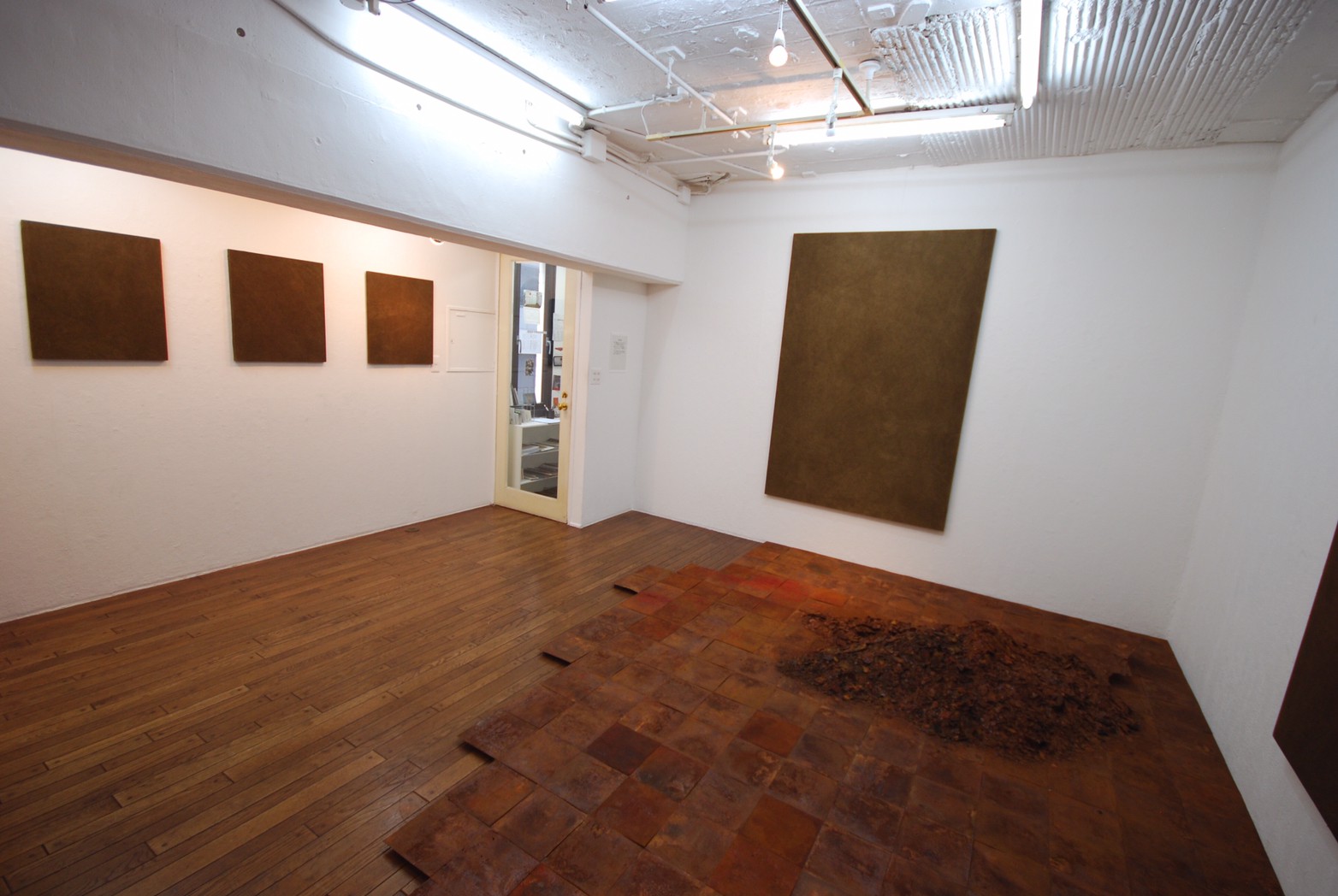 高炉で現鉱石にエネルギーを与えると、炭素は現鉱石を現に還元する。こうして「現」が産み出される。放置しておくと、やがて現は酸化してエネルギーを失って、酸化現に復って行く。つまり、錆は、還元された現が酸化して安定な状態へとかえろうとする過程に生じる結果である。大島紬、泥染は鉄分の反応、鉄を錆びさせてできたサビはかなり強い染料。製鉄された綺麗な鉄から泥をつくる作業。その泥を使い作品をつくる。Gallery現、閉廊を偲んで。