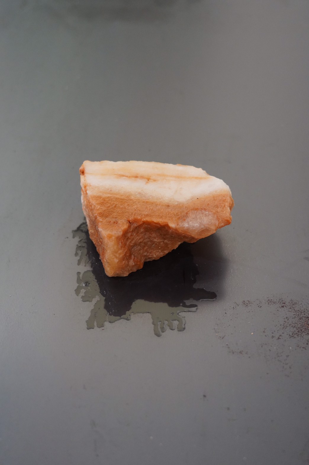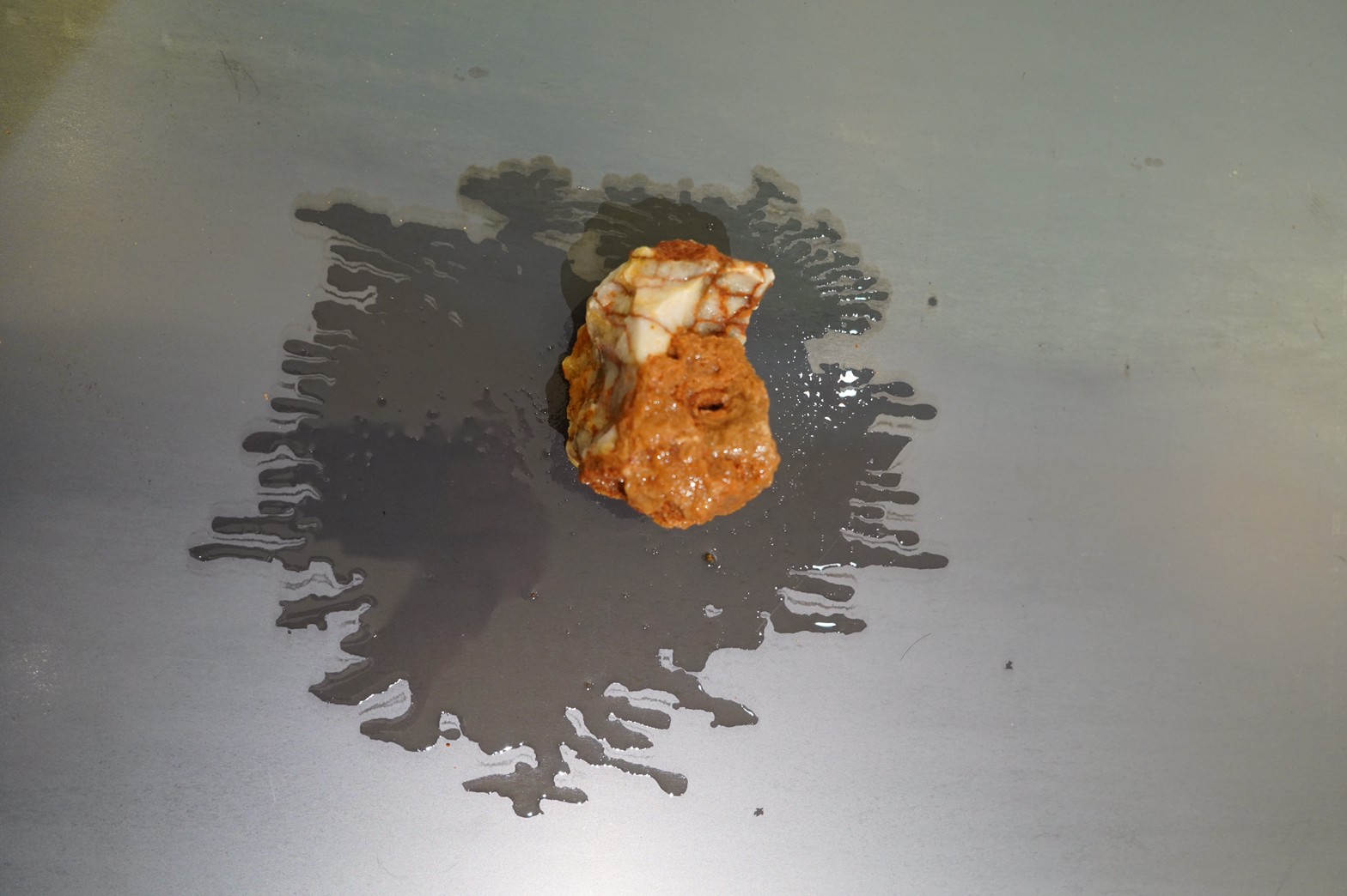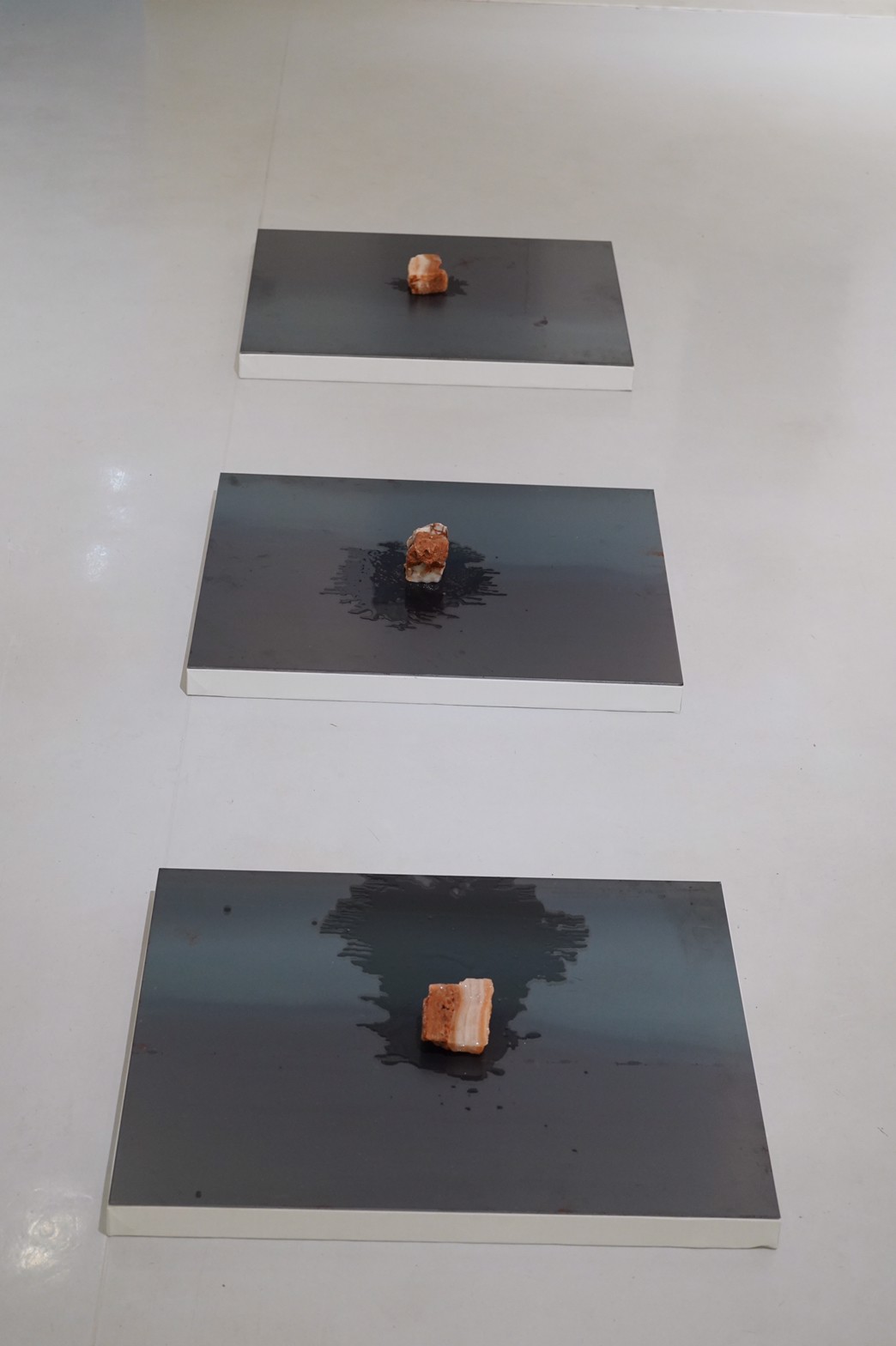 横の鉄板上の肉のような物は、秋芳洞の鍾乳石であり、鉄板も石も自然物と人工物の違いはあれ、元々は絵具の顔料として多く使われる鉱物である。その上にペインティングオイルをかけ、油絵として示した。