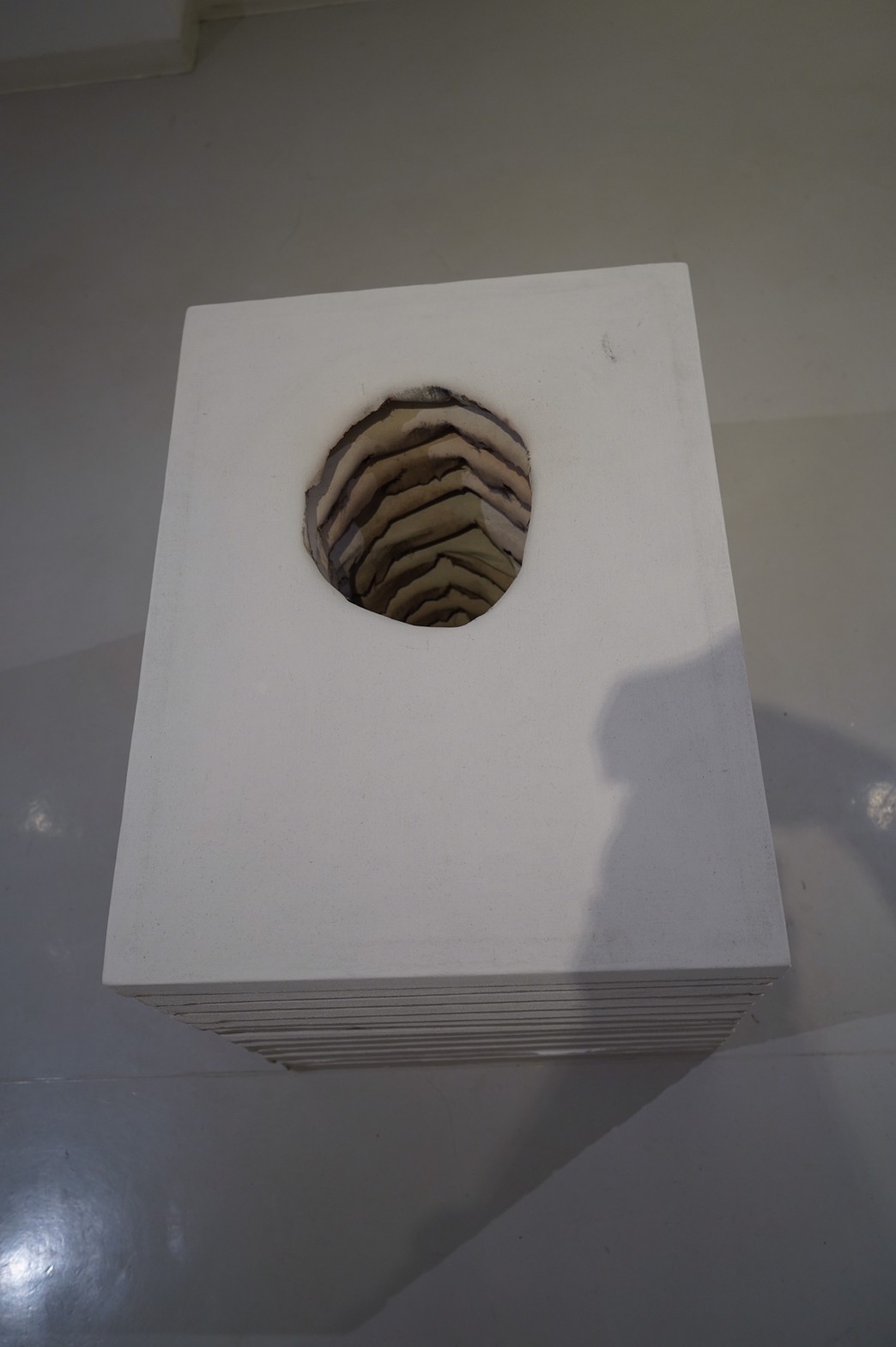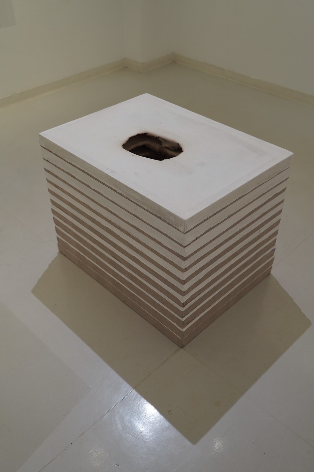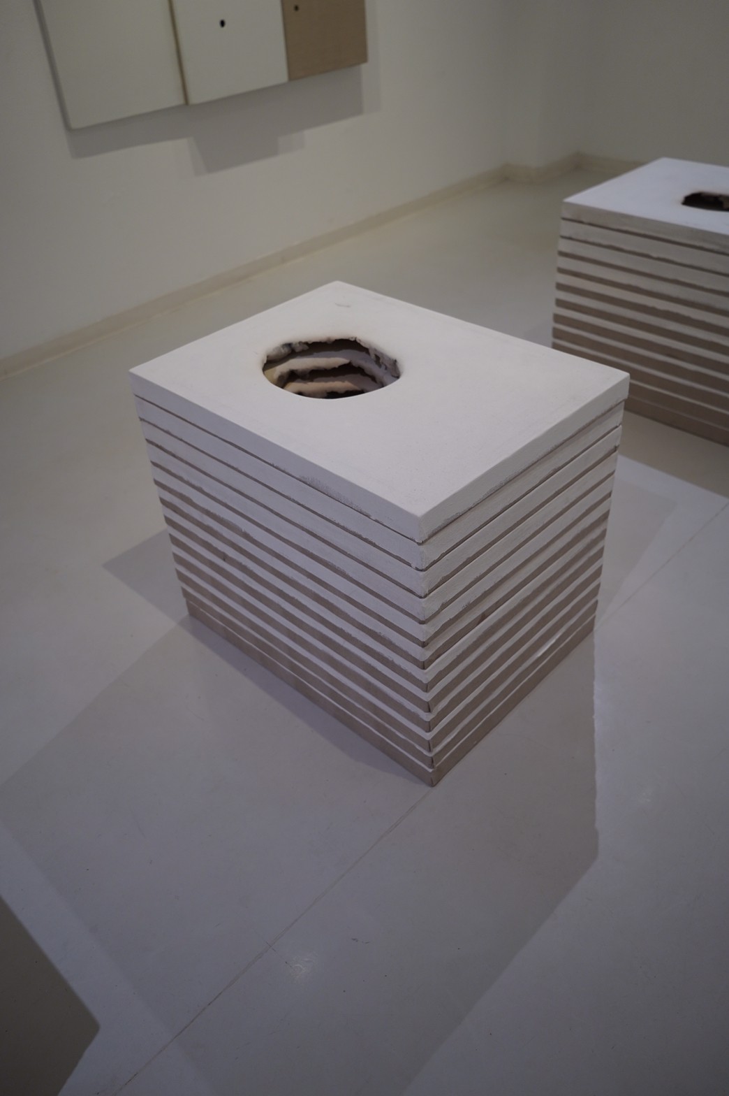 重ねられたキャンバスの中央には、上から高熱で焼かれた石が置かれゆっくりと煙を上げながら下に向かって沈んでいく。時間の方向と経過をキャンバスに閉じ込めようと実験である。