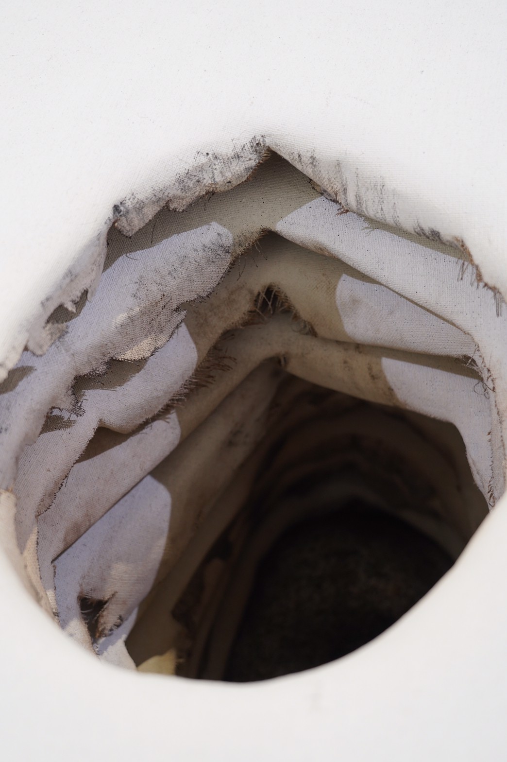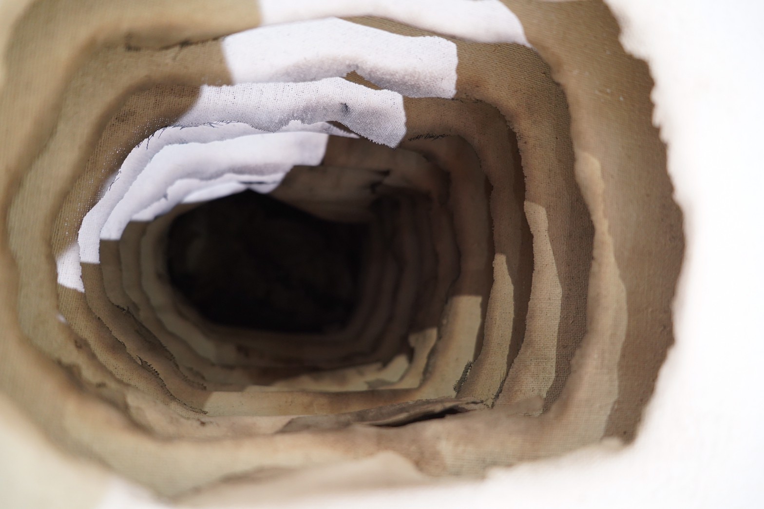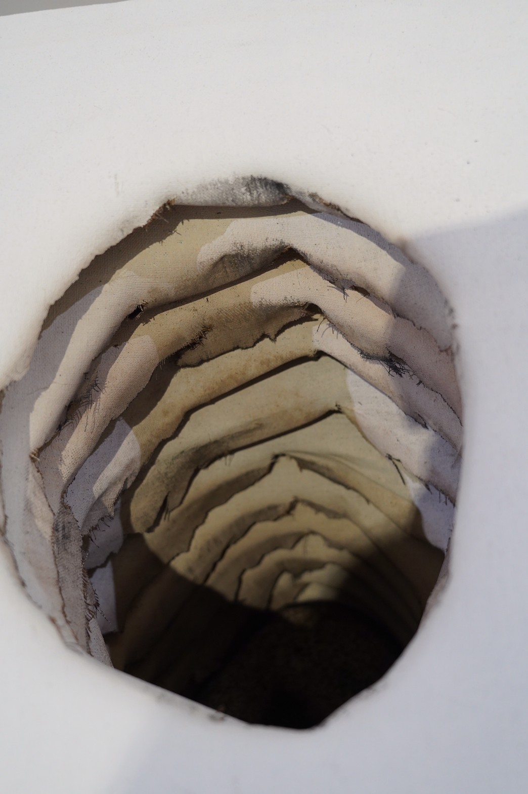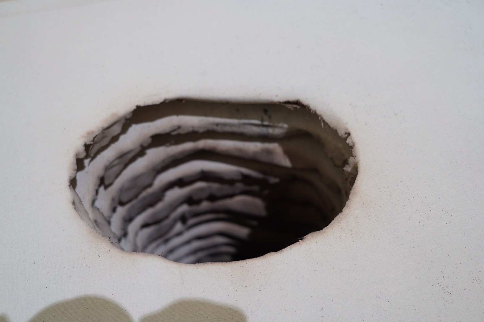 重ねられたキャンバスの中央には、上から高熱で焼かれた石が置かれゆっくりと煙を上げながら下に向かって沈んでいく。時間の方向と経過をキャンバスに閉じ込めようと実験である。