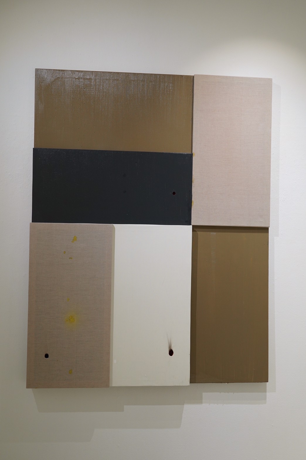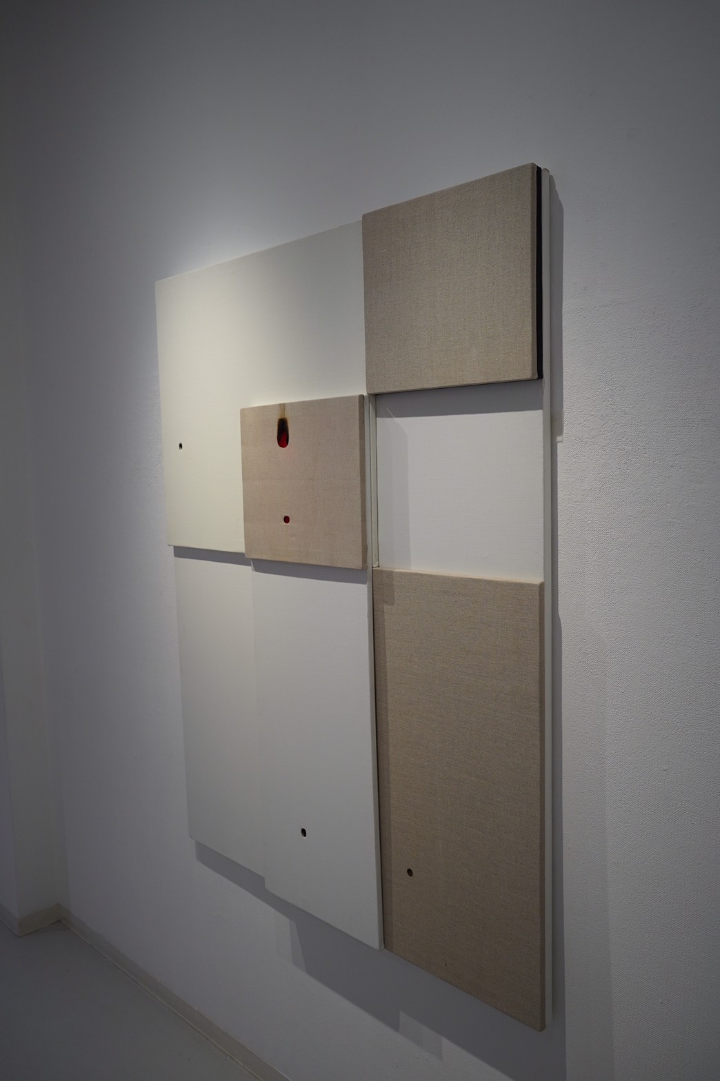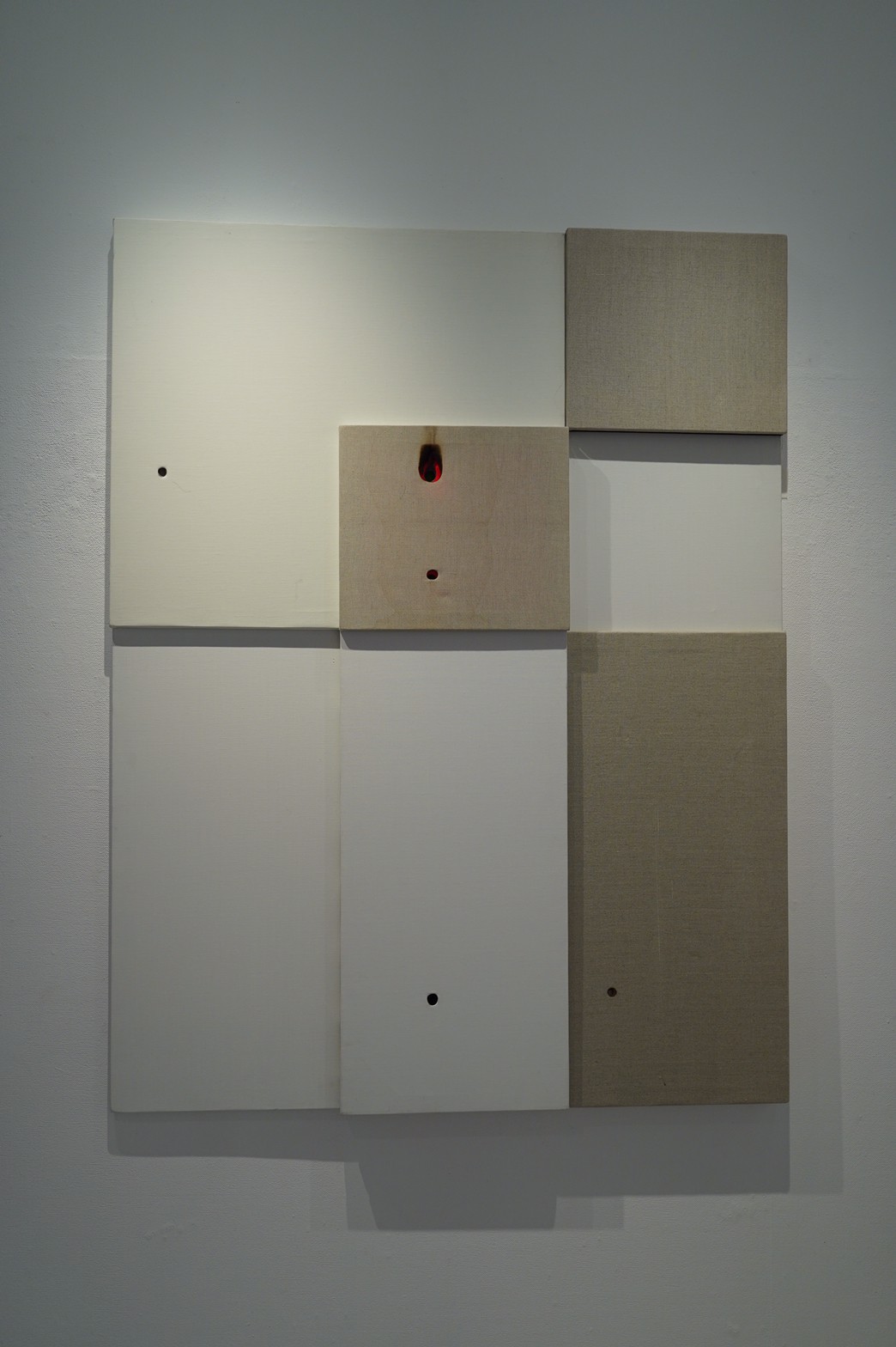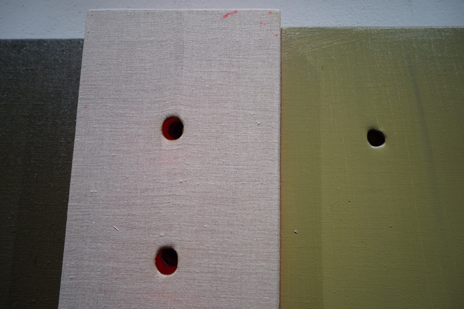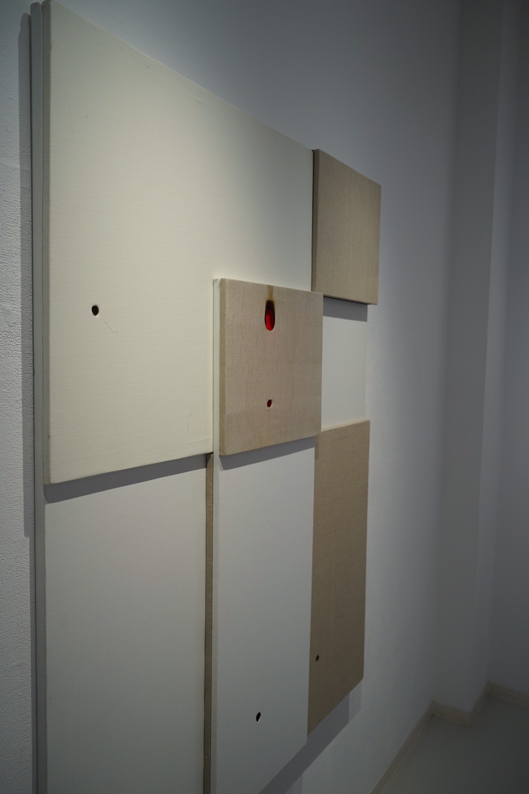 壁に飾られた80号のキャンバスは、大小の矩形のキャンバスが層をなし一つのキャンバスとして構成されている。その中のいくつかのキャンバスに はハンダゴテで直径2センチ前後の穴が奥に向かって開けられている。穴の中を覗くとカラフルな彩色が施され、焼けた跡を残す穴もある。