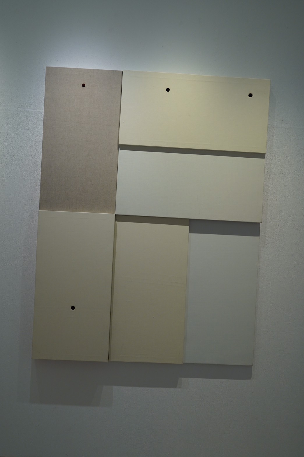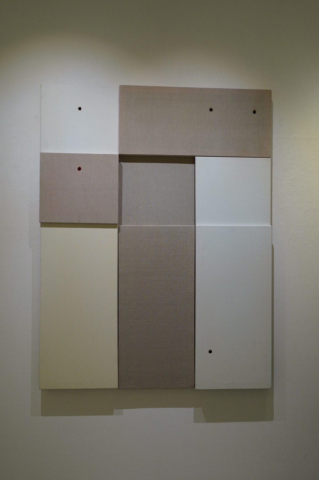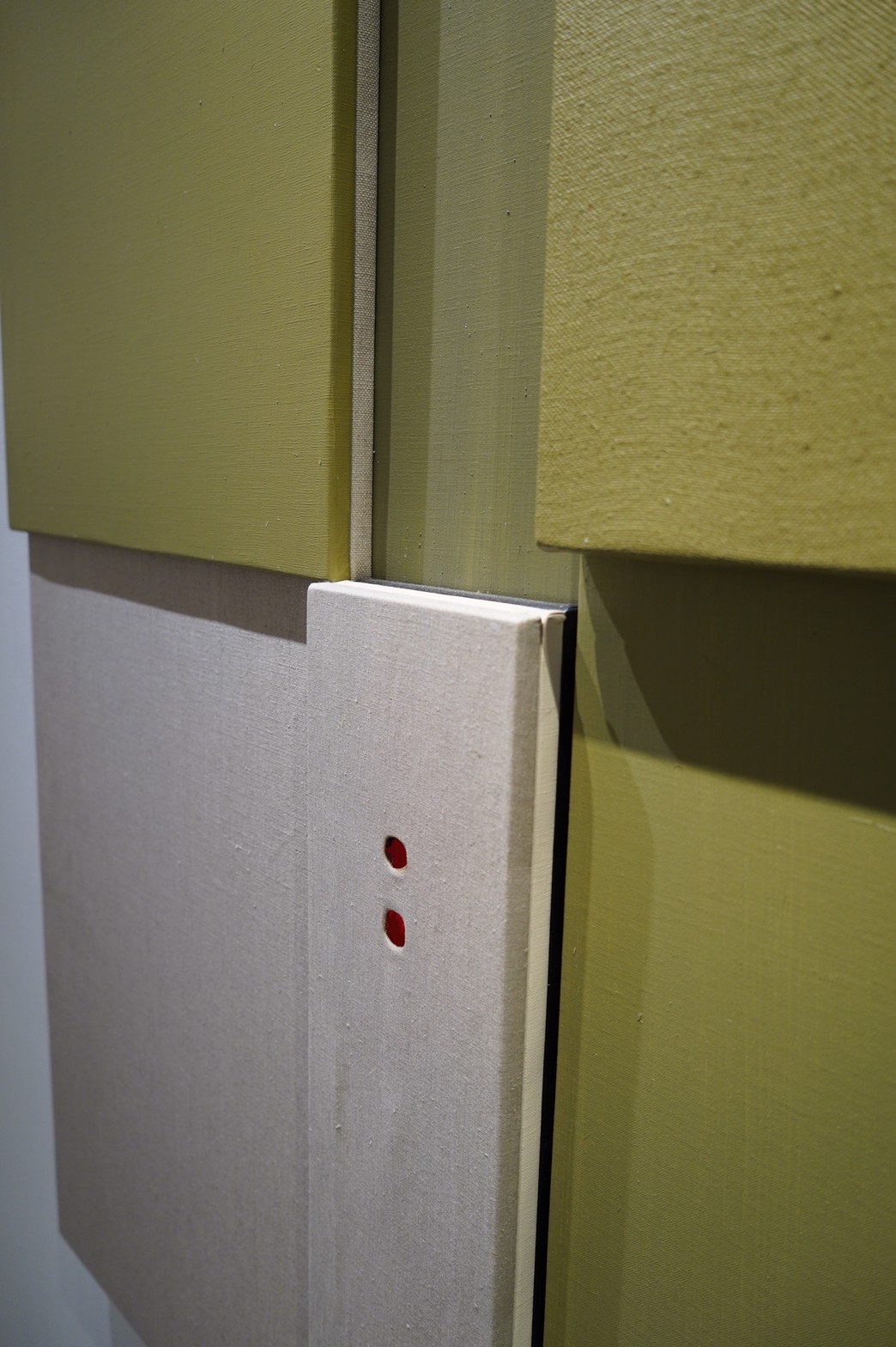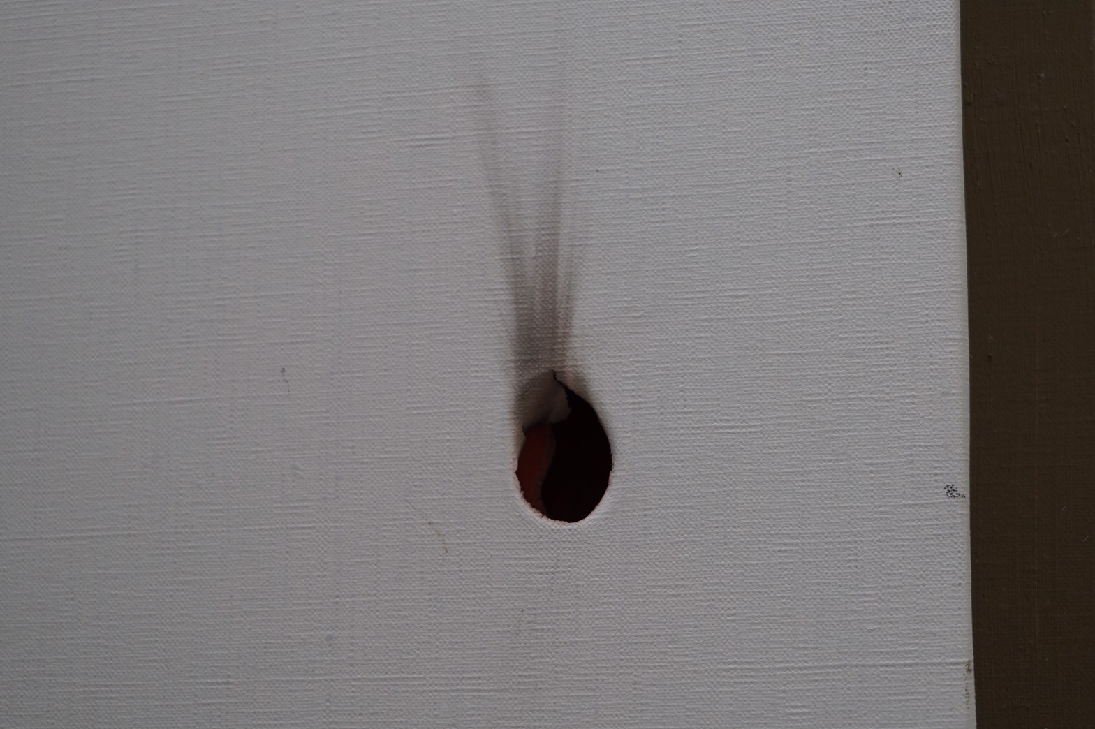壁に飾られた80号のキャンバスは、大小の矩形のキャンバスが層をなし一つのキャンバスとして構成されている。その中のいくつかのキャンバスに はハンダゴテで直径2センチ前後の穴が奥に向かって開けられている。穴の中を覗くとカラフルな彩色が施され、焼けた跡を残す穴もある。