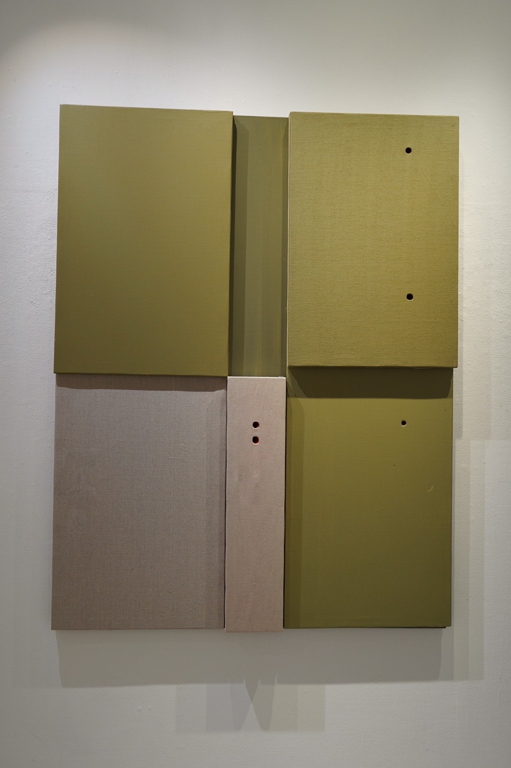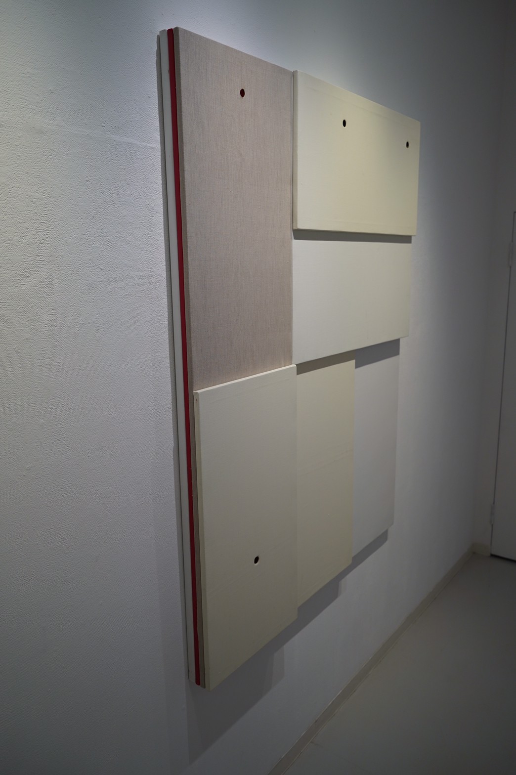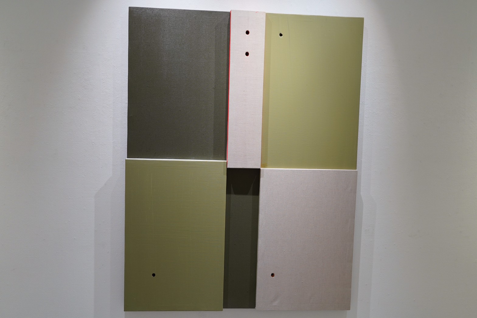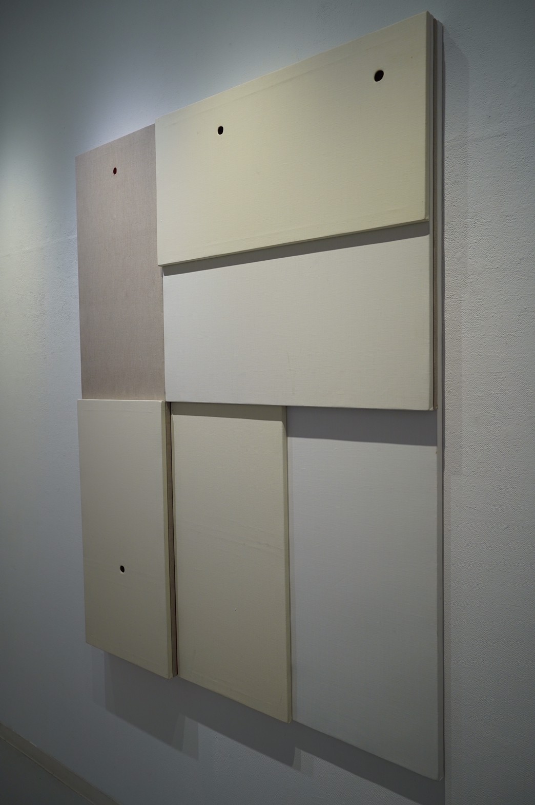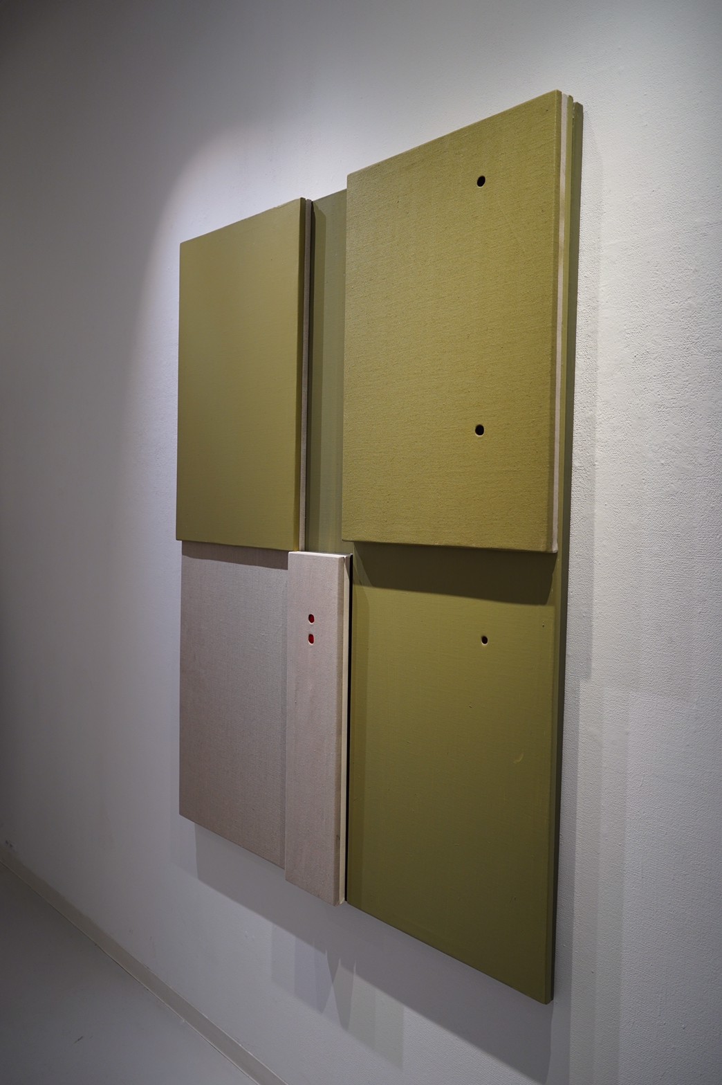 壁に飾られた80号のキャンバスは、大小の矩形のキャンバスが層をなし一つのキャンバスとして構成されている。その中のいくつかのキャンバスに はハンダゴテで直径2センチ前後の穴が奥に向かって開けられている。穴の中を覗くとカラフルな彩色が施され、焼けた跡を残す穴もある。