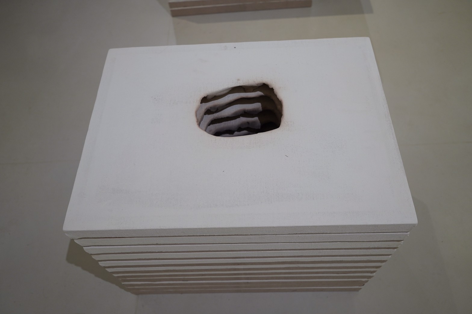 このキャンバスの層は、地層や年輪のような層を成す時間層としての役割である。熱を加えて開けた穴はマグマの通る道、その周囲には鮮やかな鉱物が生成する。