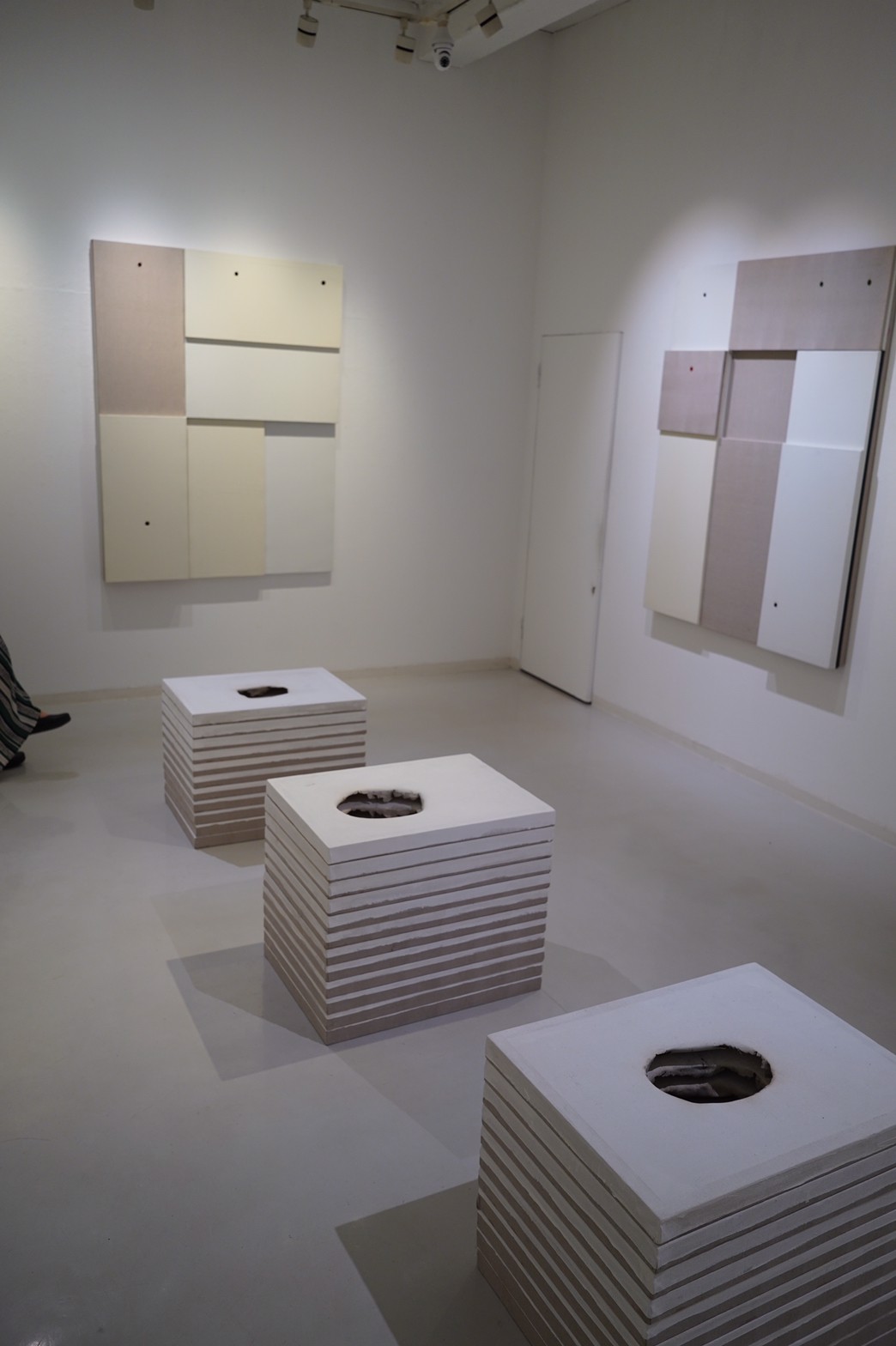 床の作品は60㎝✖️45㎝のキャンバスが11枚重ねられたものが2つ、12枚重ねられたものが1つ。