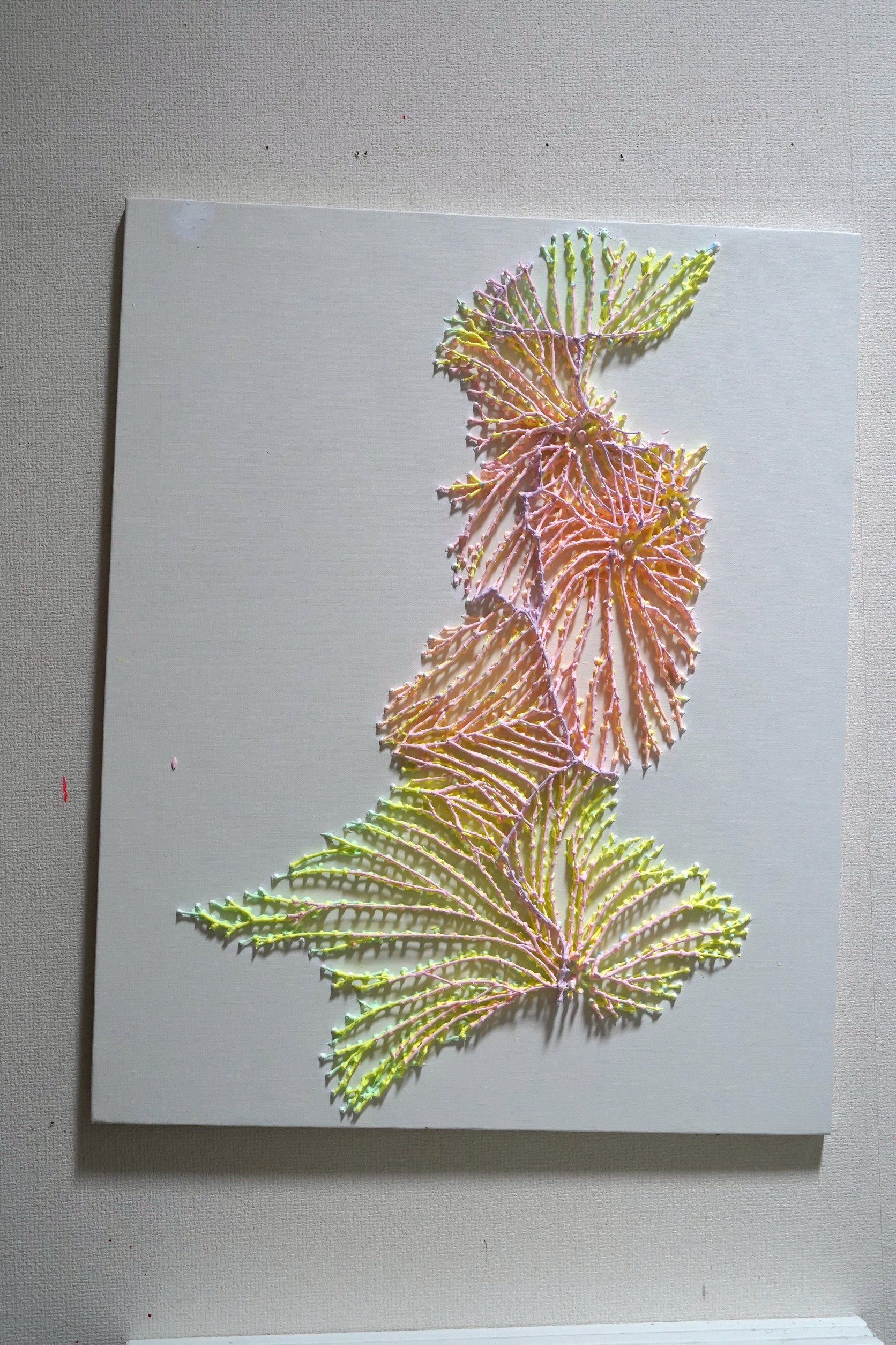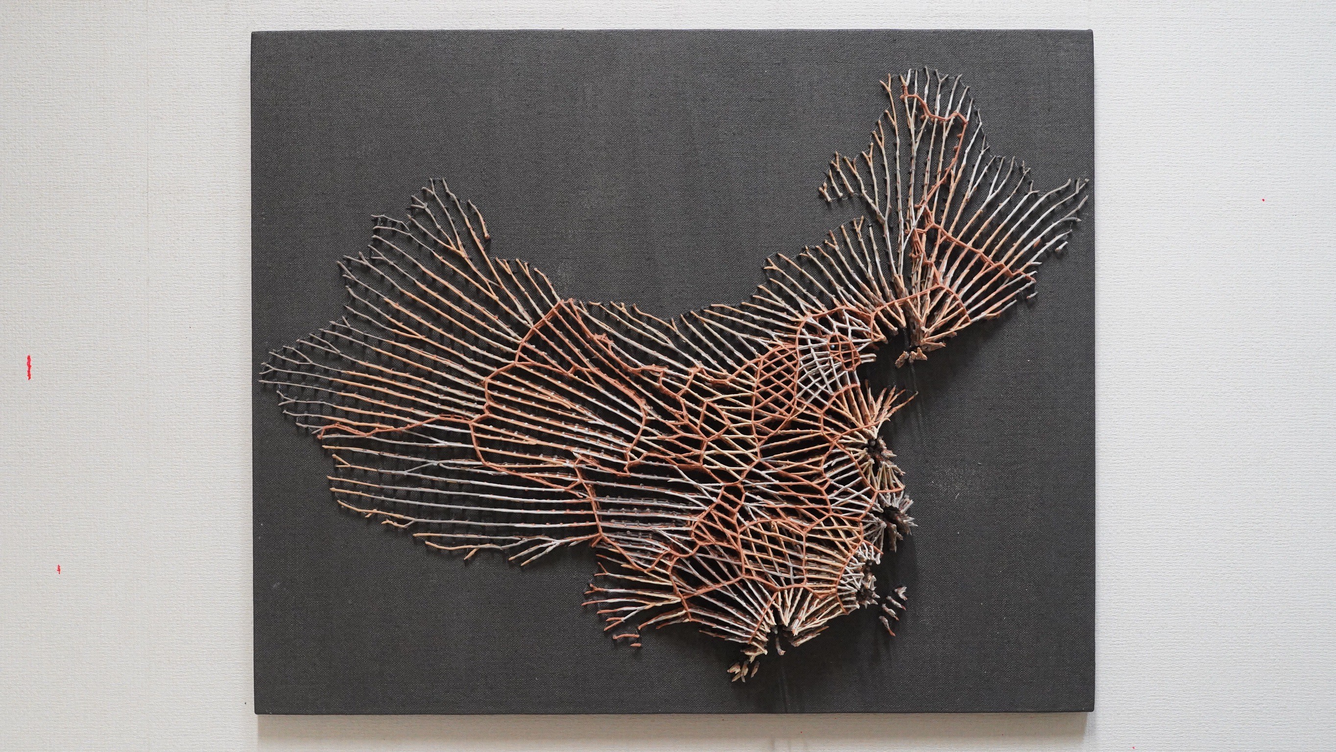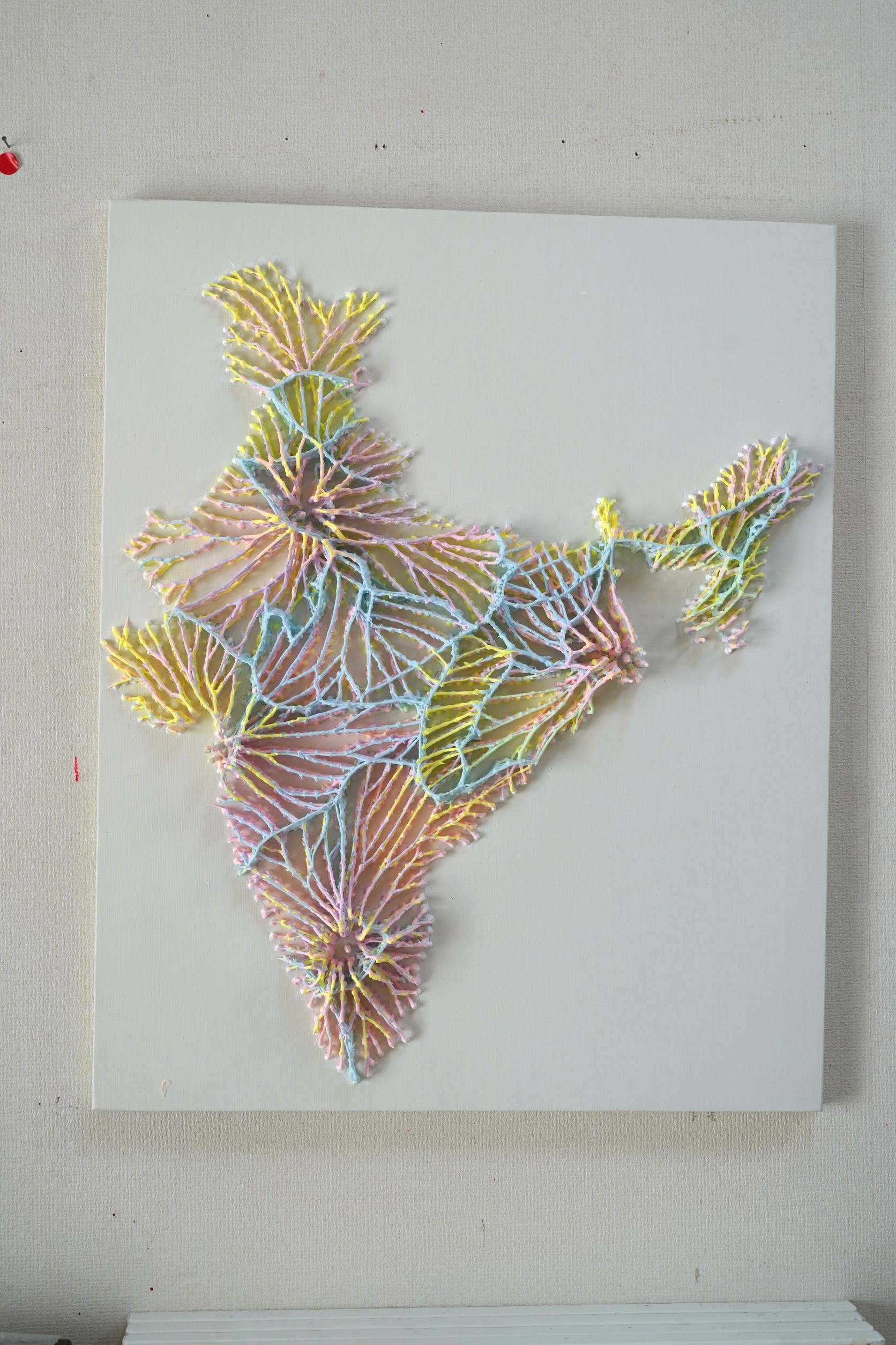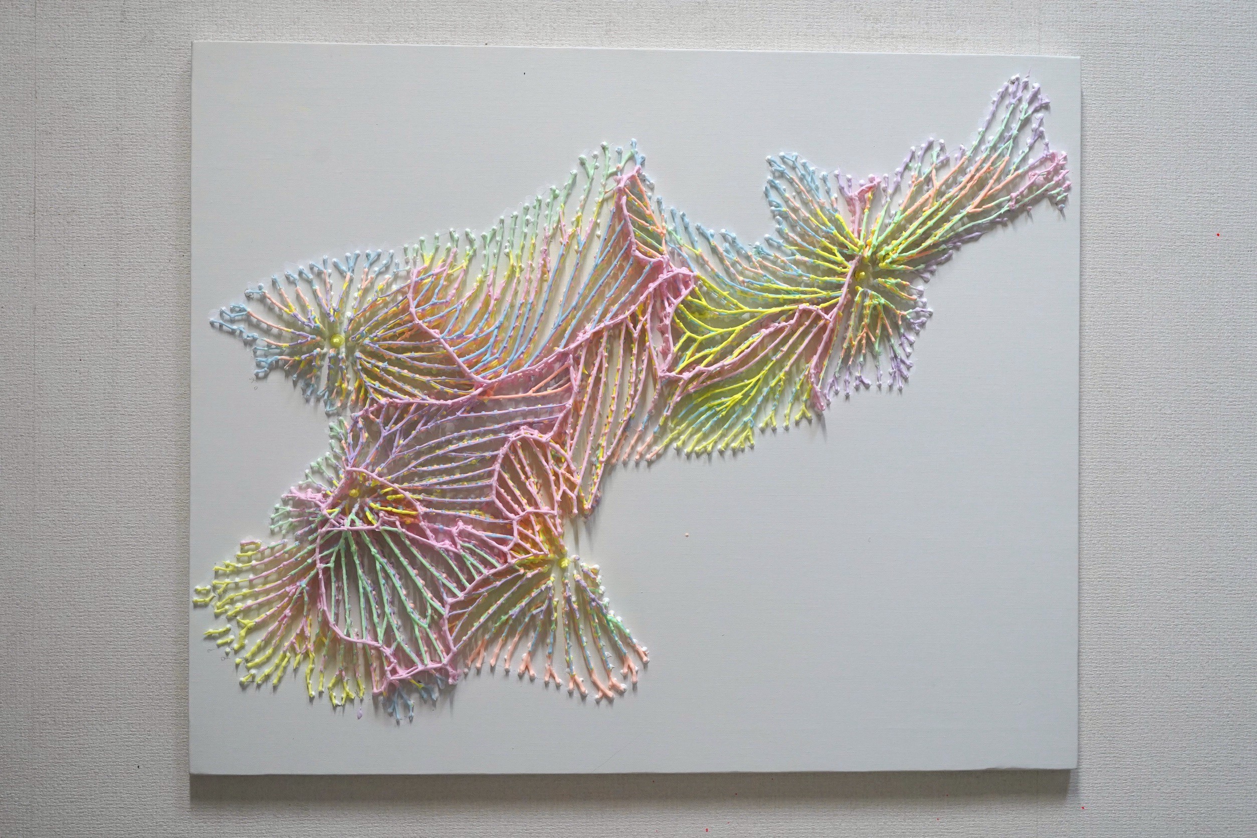 絵具による3Dの点・線・層で再構築した表現である。政治的・宗教的・民族的な「輪郭=国境/酷境」を、