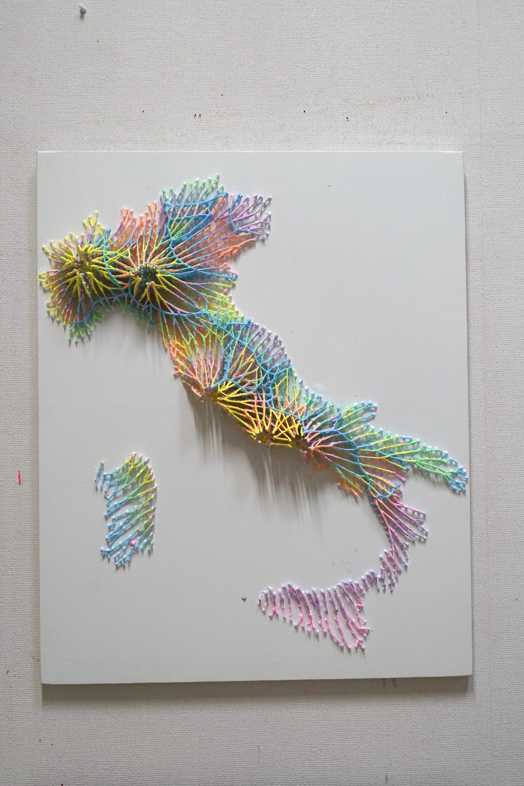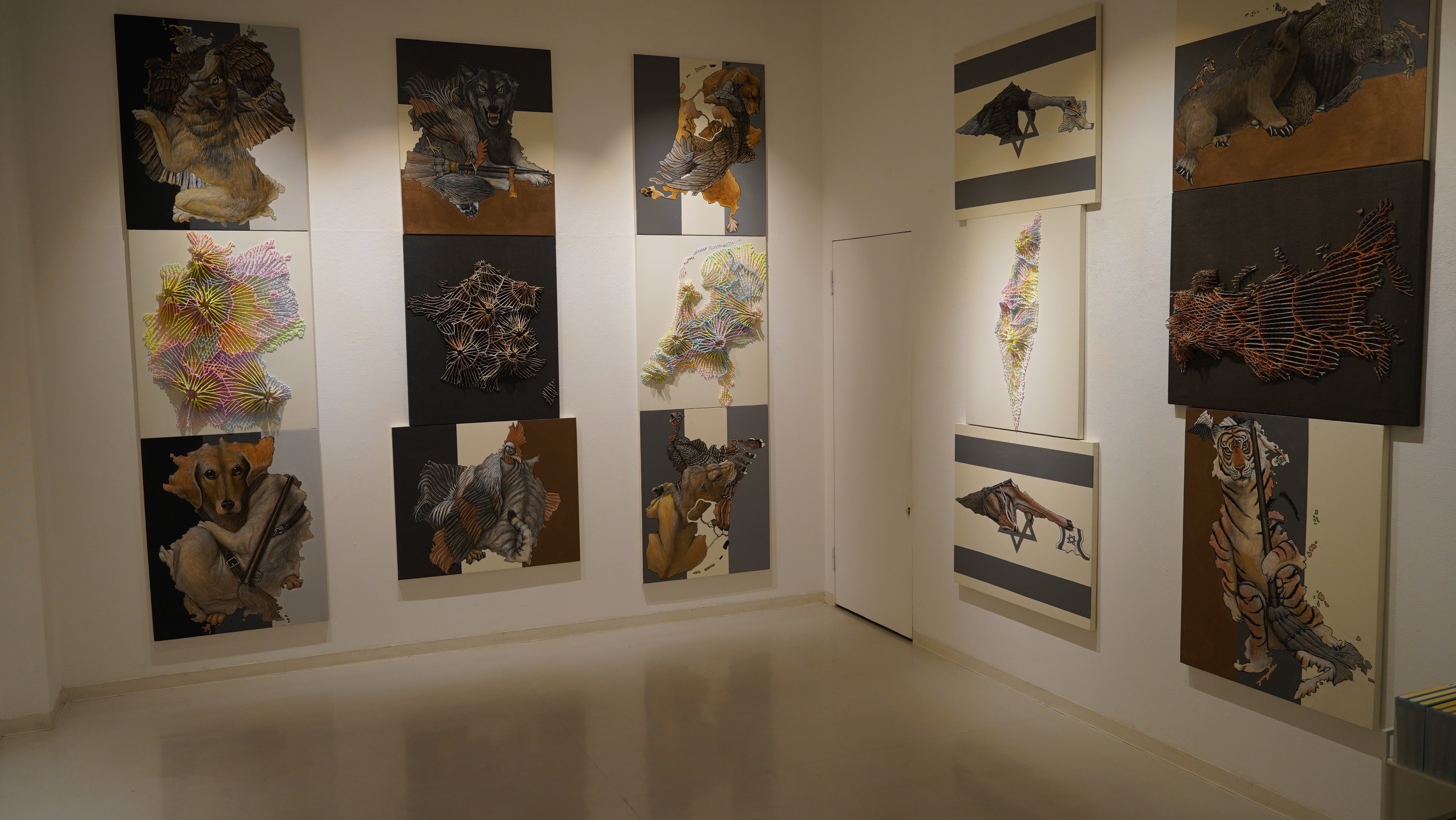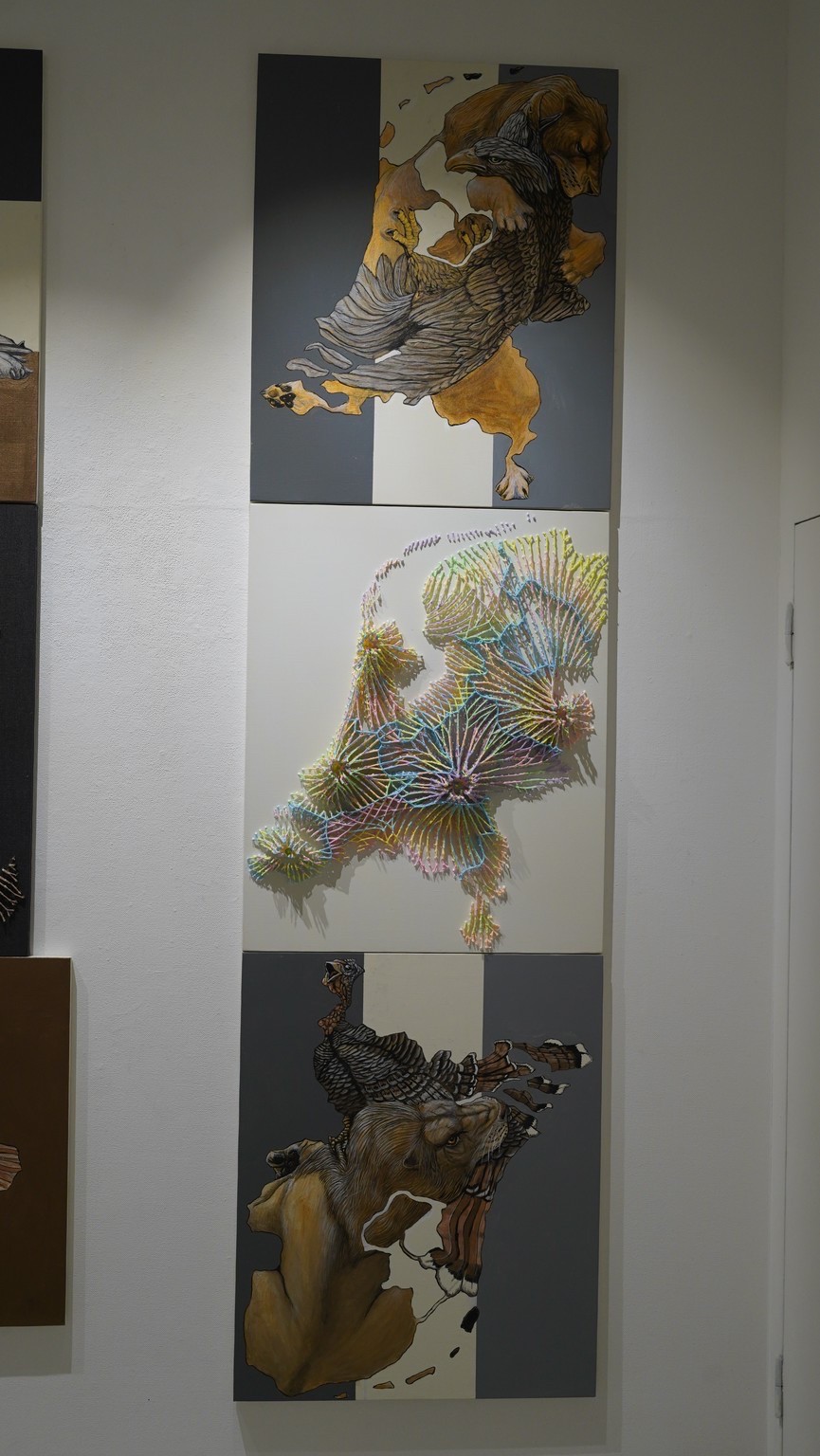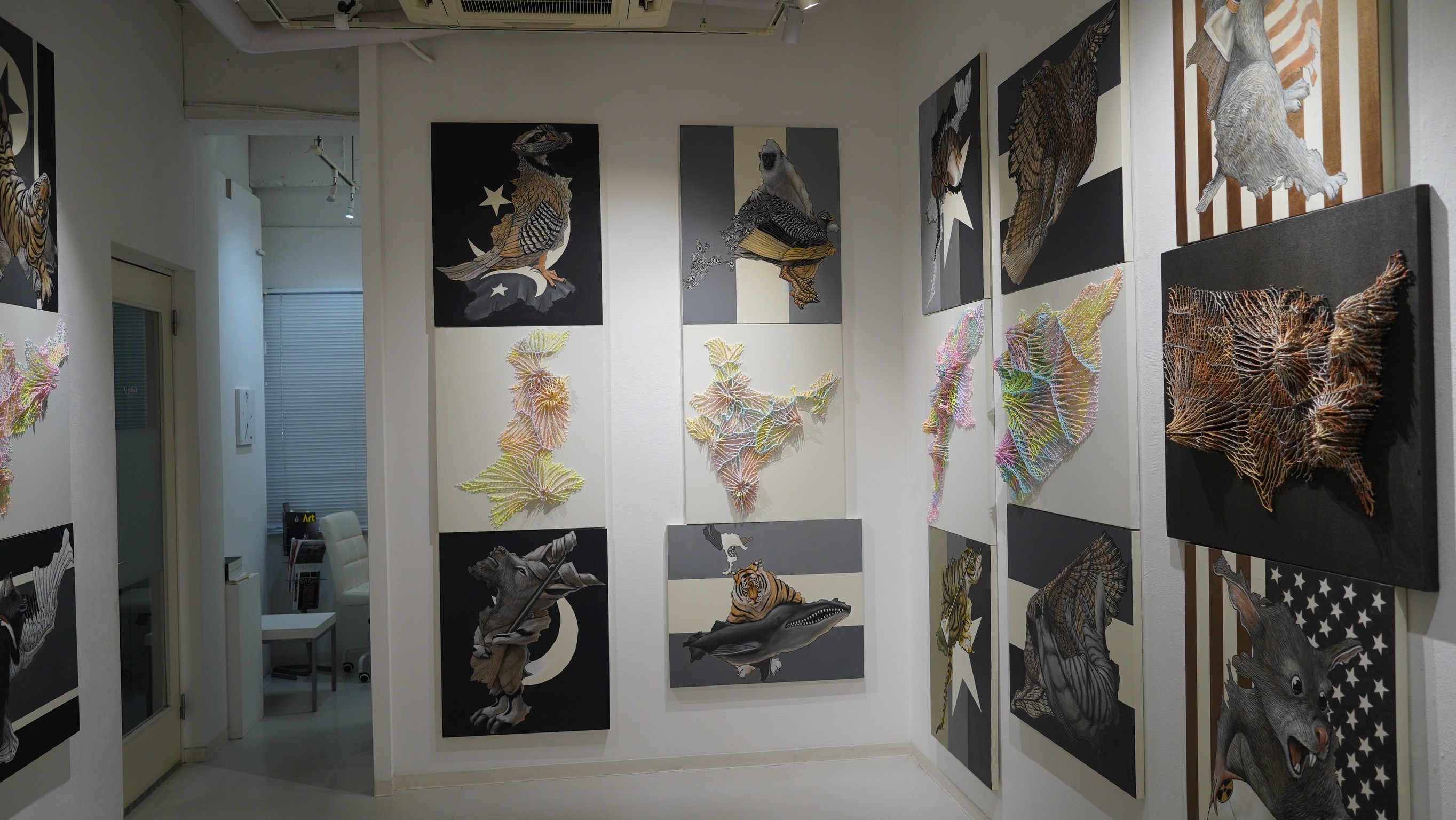 絵具による3Dの点・線・層で再構築した表現である。政治的・宗教的・民族的な「輪郭=国境/酷境」を、